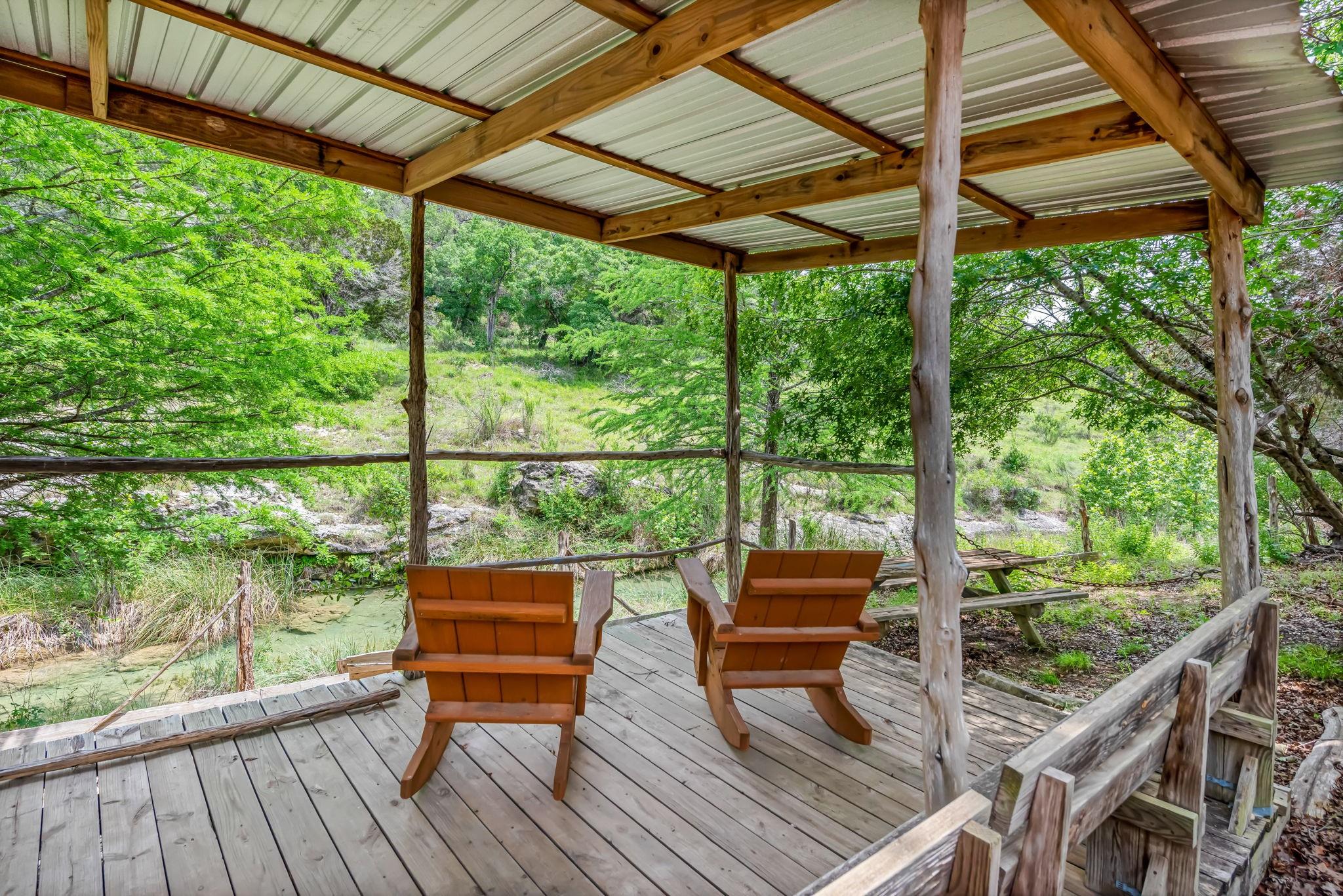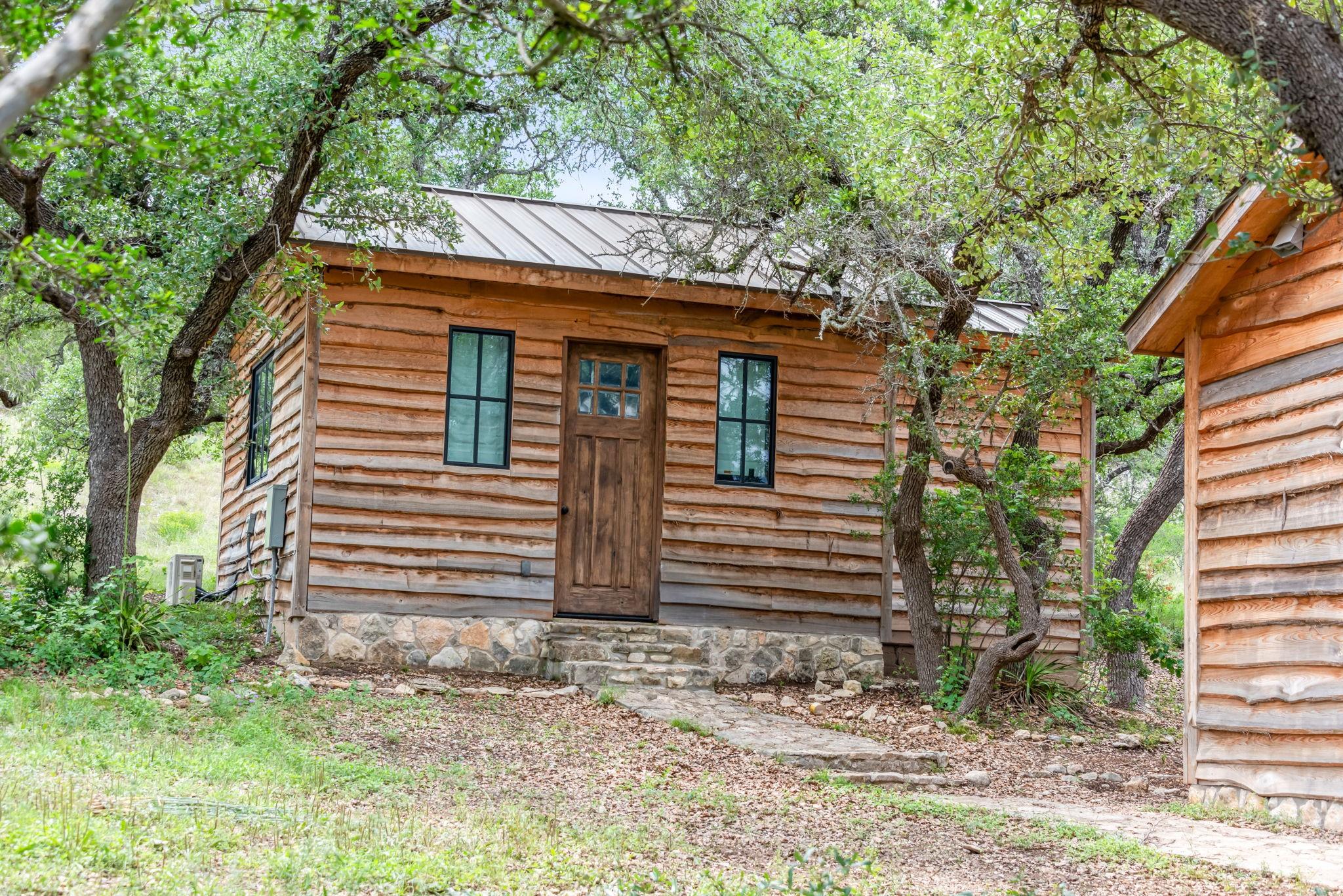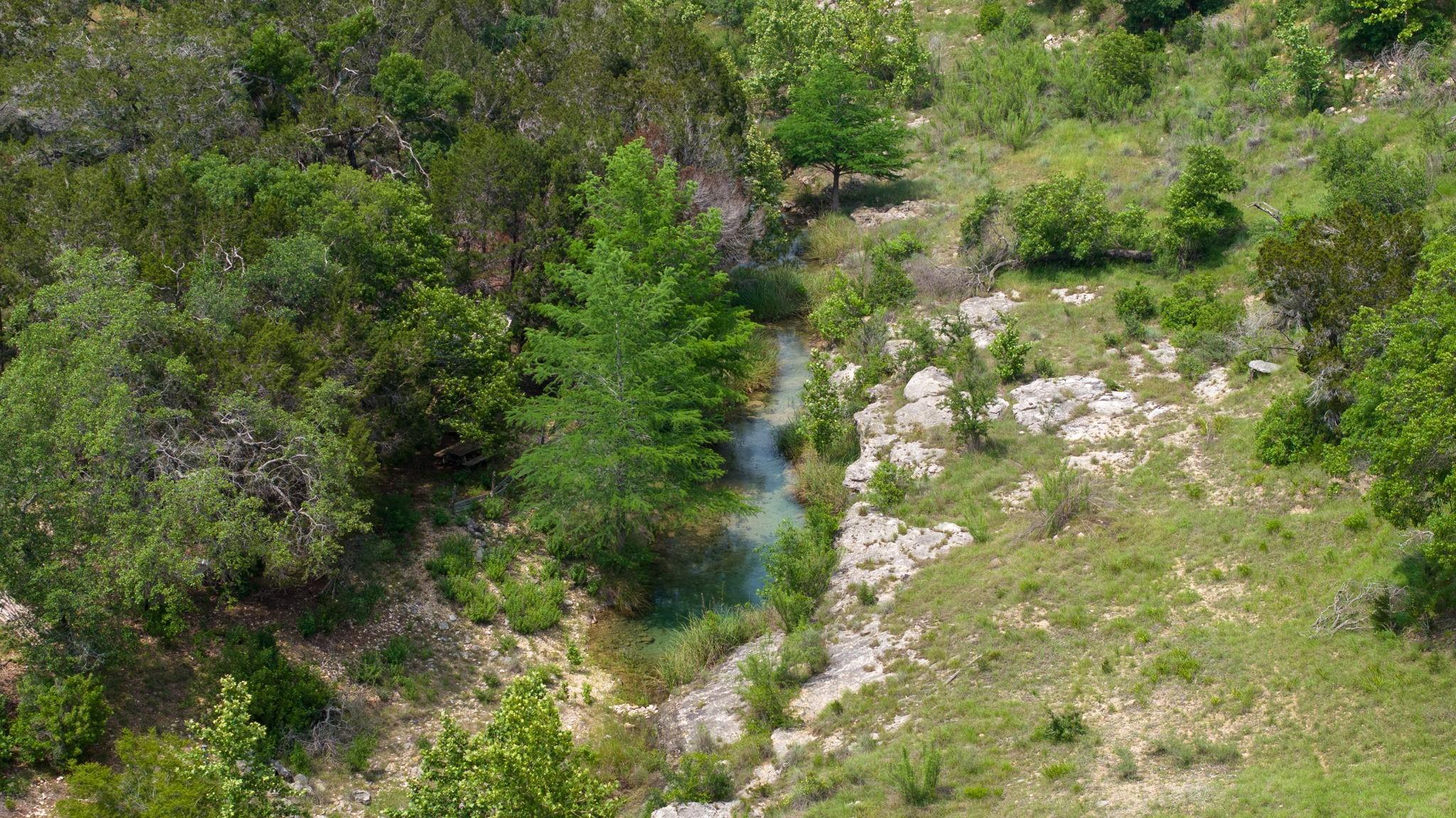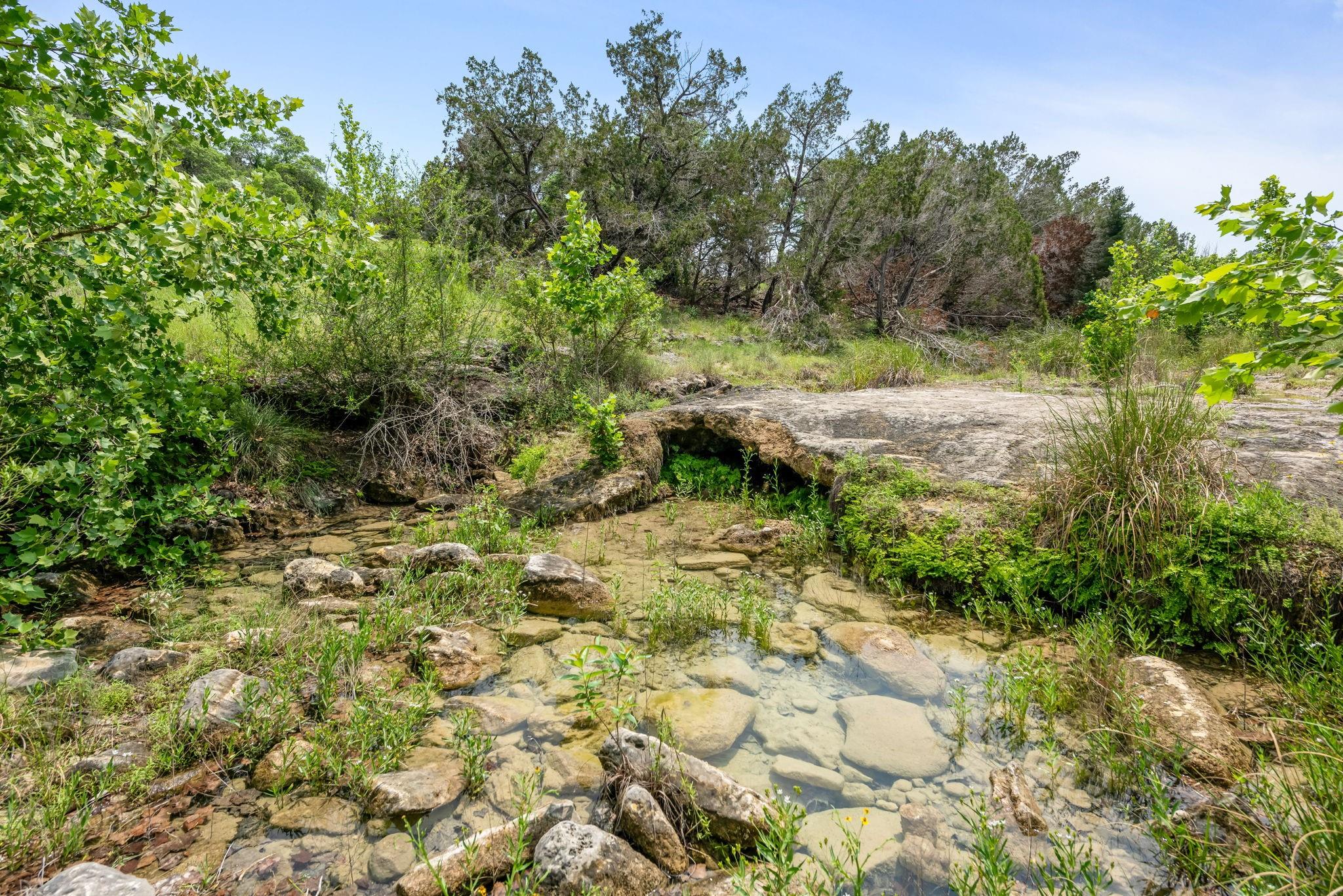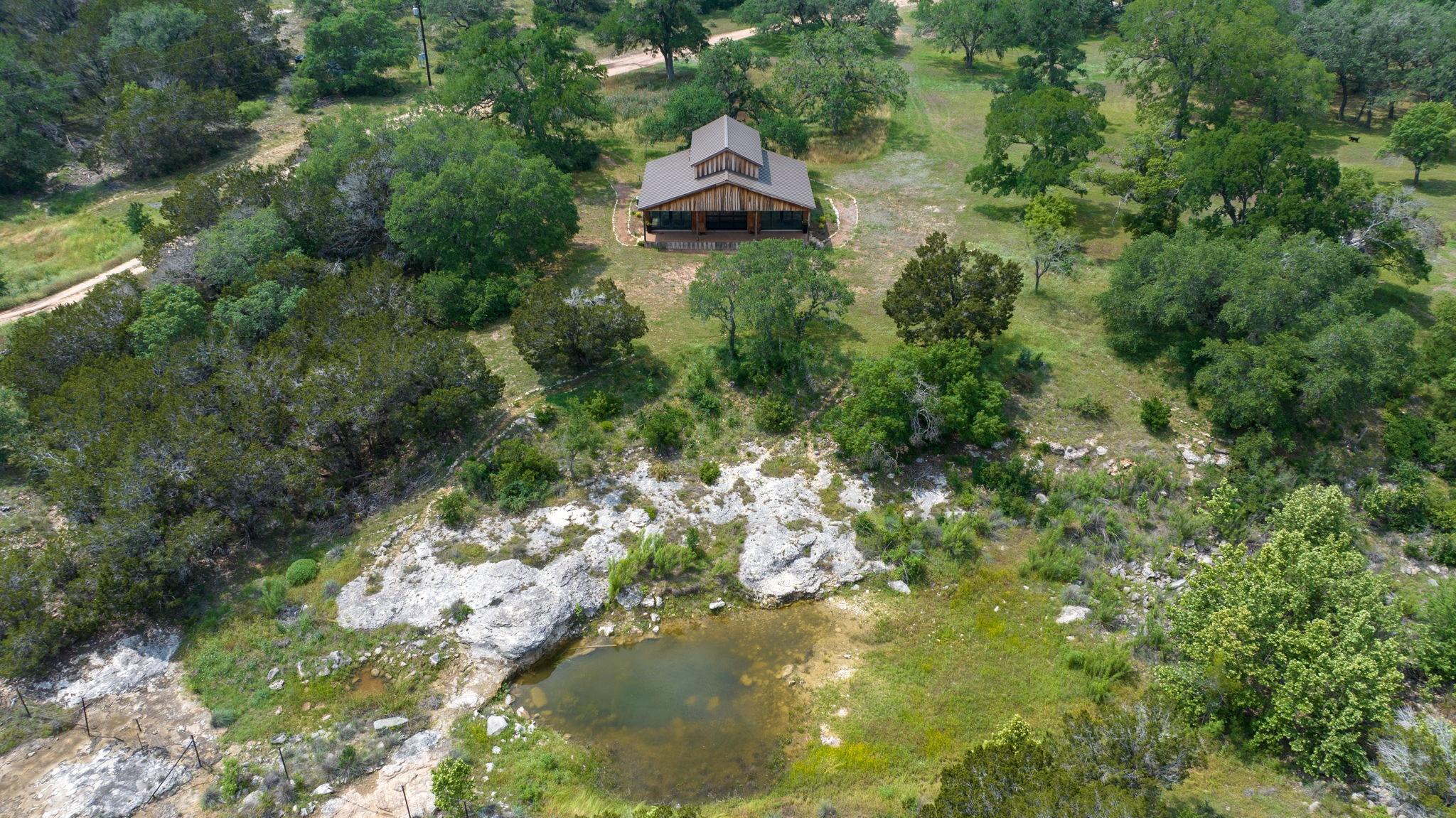 New build on a 32+ Acre Unrestricted Ranch along Spring Fed Deadman's Creek in Dripping Springs. A Spring Fed Creek, a large swimming hole, luscious grotto w/manicured walking trails throughout surrounded by limestone rock walls from the 1800's. Property has lots to offer, including vista views, beautiful bottom portion with mature oaks, large green pasture, a year around creek with limestone bluffs. Fully fenced. 4 Custom Structures built in 2022 by builder Mattison Reynolds w/Live Edge Cypress Wood and Board & Batten Siding include: *3/2 Guest Cottage (1400 sf) with metal roof, high-end appliances, pecky cypress custom cabinetry, white Calcutta marble countertops, wide plank wood flooring throughout, limestone walls and fireplace, rustic reclaimed wood beams, high ceilings, expansive covered porch with two Big Ass Fans & limestone steps. *Studio Casita (450 sf) with metal roof, cypress wood walls, kitchenette with concrete countertops, full shower & laundry. *Office/Gym Barn (1456 sf) with metal roof, two offices, spacious gym and large porch. Vaulted 22ft Gym Ceiling with reclaimed beams, Large Big Ass Fan, Steel Garage Door, High-End Bathroom Finishes, kitchenette with Miele Coffee System, Ice Maker & Stainless Steel Fridge. Two offices with wood custom cabinetry & shelves, limestone countertops and wood flooring. *RV Barn with Attached Outdoor Pavilion & Fireplace (1500 sf) wrapped in limestone from the property and metal roof. RV Barn has space for two full size RV's and storage above. Well and septic on property. Metal roofs set up for rainwater collection. Perfect spot to build your custom home in between and have a complete family compound or great investment opportunity to build a retreat center, wedding venue, & more. Hawk Shadow winery located at the top of the hill. Additional build sites located in the upper portion w/endless vista views. Wildlife exempt for low taxes. Owner/Agent. https://www.575norwoodroad.com https://vimeo.com/944890402