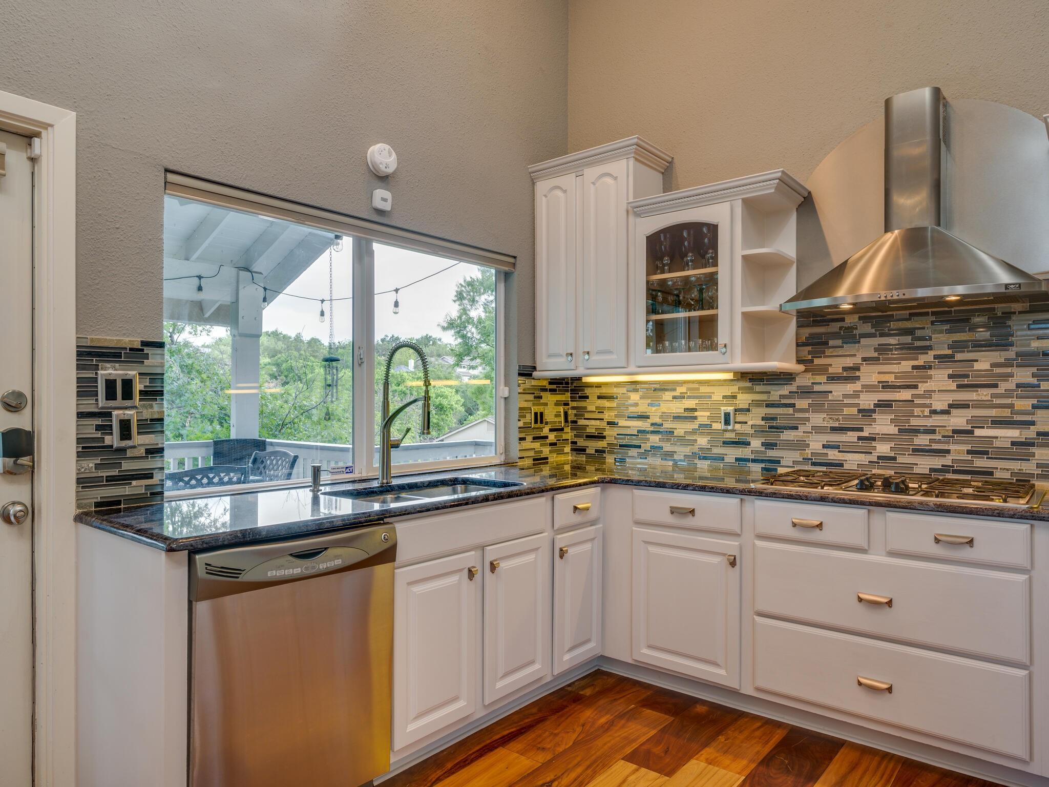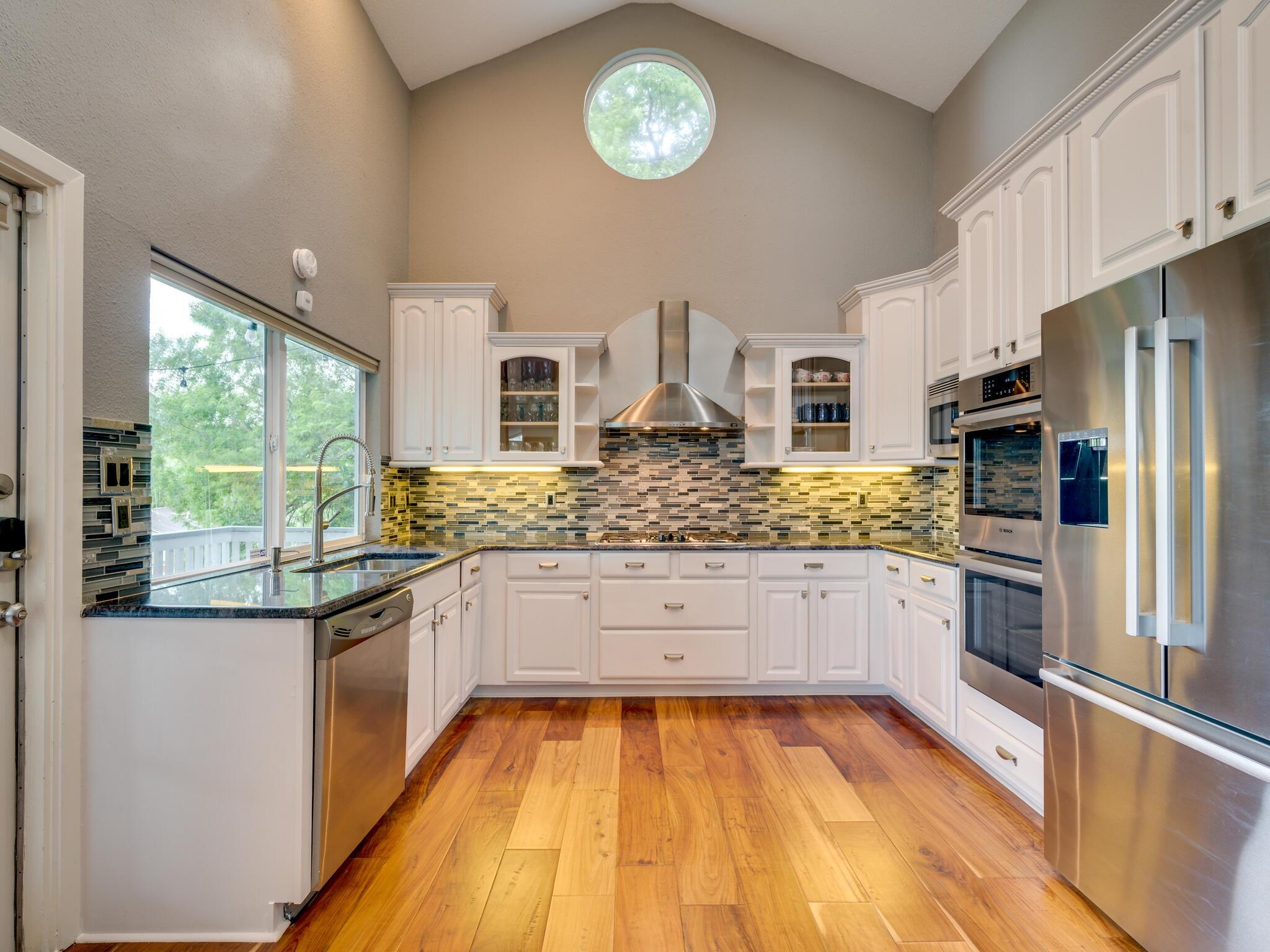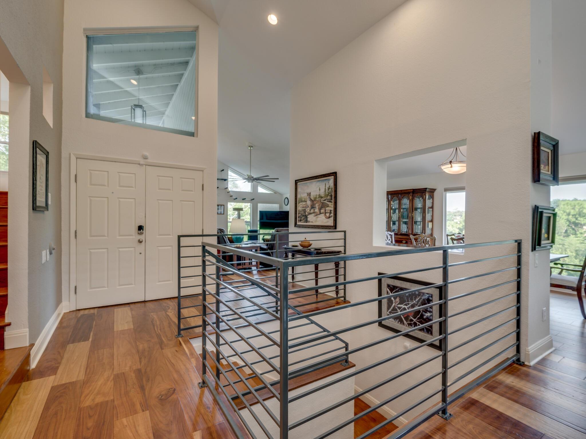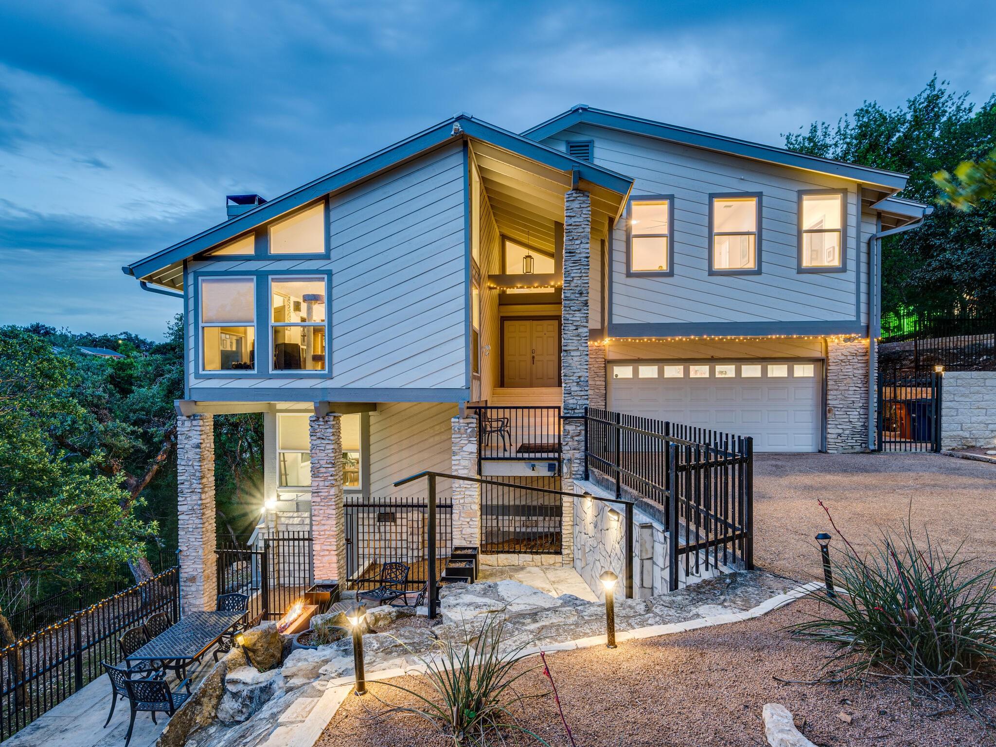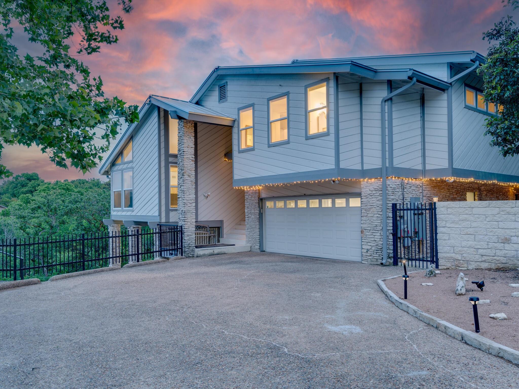 This stunning three-story home is in the highly sought-after neighborhood of Vista West, known for its natural beauty and close proximity to downtown and The Domain. The home boasts five spacious bedrooms, an office space and hardwood floors throughout. The property offers multiple outdoor spaces with breathtaking views of the surrounding hill country. Additional features of the stunning property include a xeriscaped yard for water conservation, a tankless gas water heater, a metal roof with 52 solar panels for low monthly electrical utilities, a new 5-ton AC unit and upgraded HVAC duct work throughout. Renovated with an open classic design, the main living area features floor-to-ceiling windows, soaring ceilings and ample natural light, creating a welcoming and inviting space that is perfect for entertaining guests or simply relaxing with family. The kitchen is equipped with high-end appliances and custom cabinetry. The adjacent dining area offers space for large family dinners or intimate gatherings. The luxurious master suite features a spacious bedroom with a built-in bookcase and access to outdoor living. The master bathroom features travertine tile, dual sinks, a walk-in closet, and a seven-head, spa-like large walk-in shower. The remaining bedrooms are all generously sized and feature ensuite bathrooms. The upstairs area includes a living space that can be used as a media or workout room and a bathroom with a built-in steam shower. The home includes an outdoor kitchen with a grill and separate smoker, with lights that automatically turn on at dusk and off at sunrise. This home with its stunning hill country views, unique floorplan and distinctive terrain is truly one of a kind with its unbeatable location.