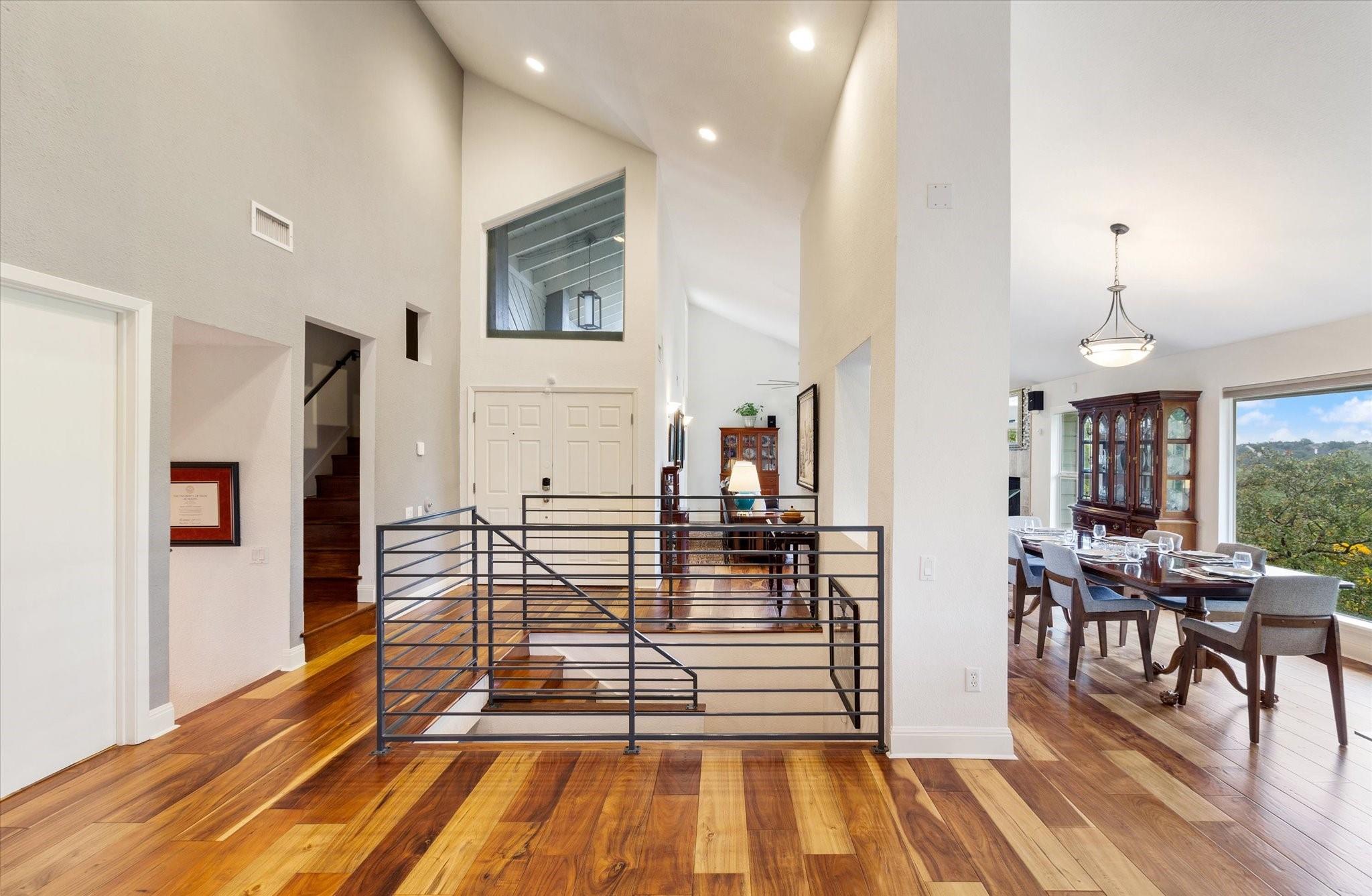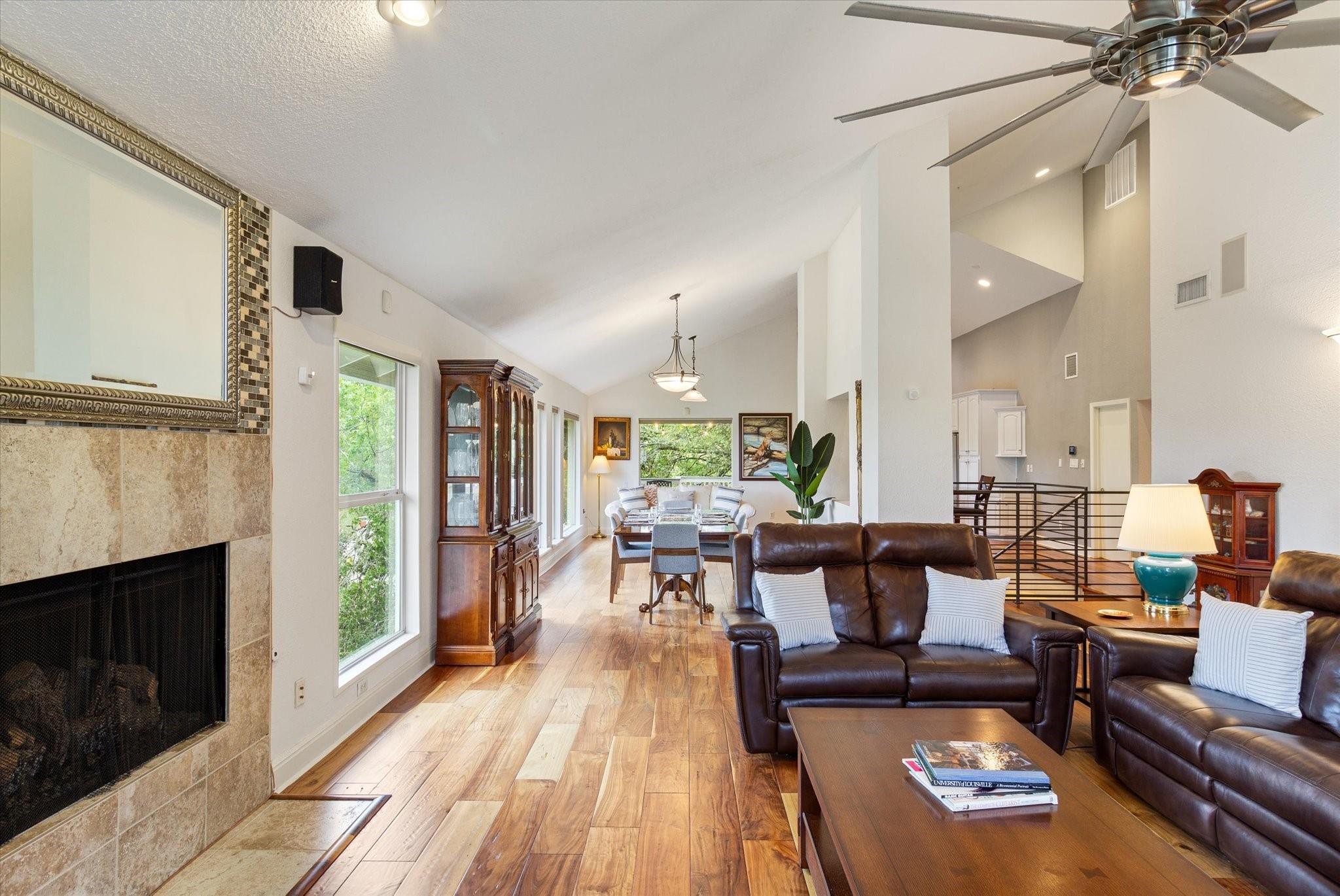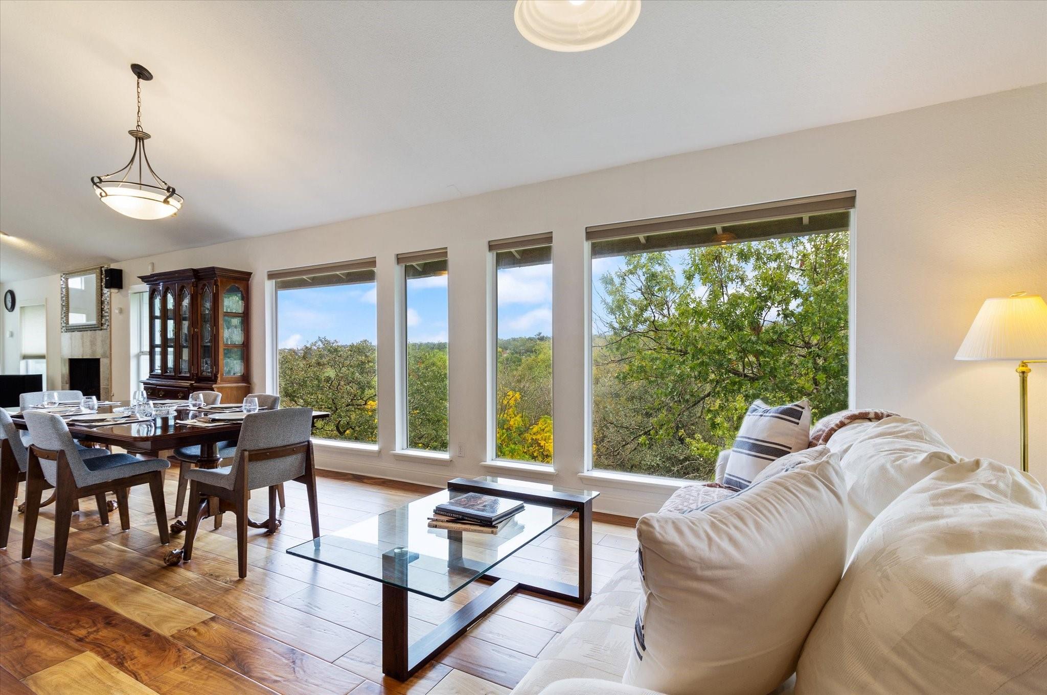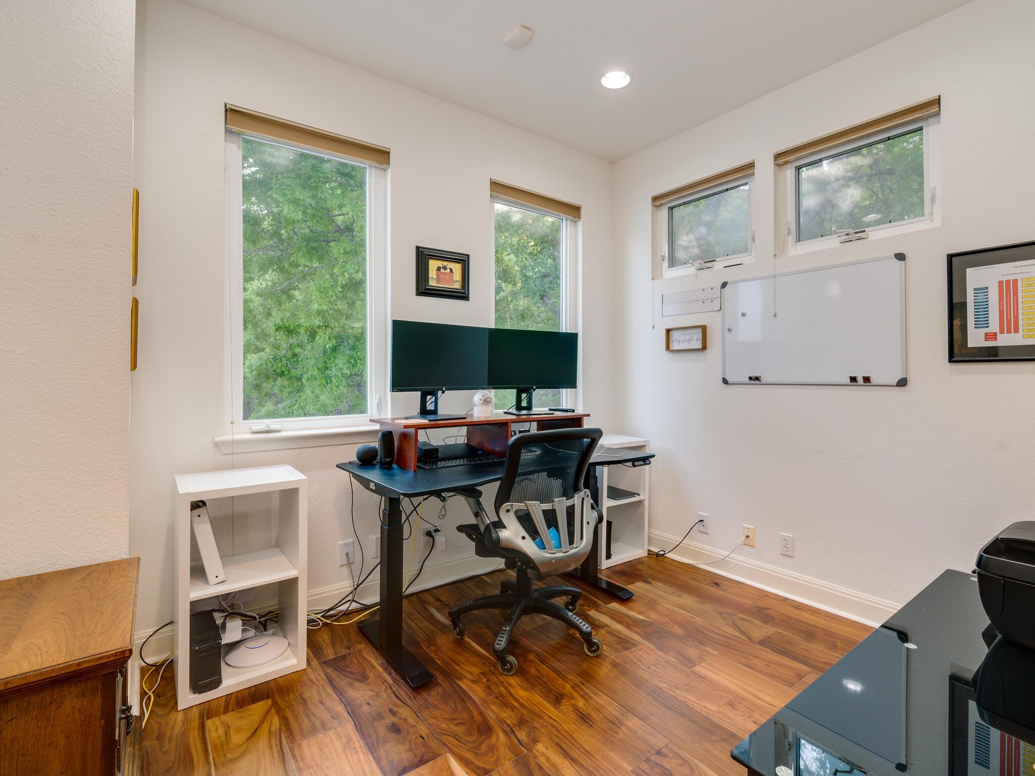 This stunning three-story home is in the highly sought-after neighborhood of Vista West, known for its natural beauty and close proximity to downtown and The Domain. The home boasts five spacious bedrooms, an office space and hardwood floors throughout. The property offers multiple outdoor spaces with breathtaking views of the surrounding hill country. Additional features of the stunning property include a xeriscaped yard for water conservation, a tankless gas water heater, a metal roof with 52 solar panels for low monthly electrical utilities, a new 5-ton AC unit and upgraded HVAC duct work throughout. Renovated with an open classic design, the main living area features floor-to-ceiling windows, soaring ceilings and ample natural light, creating a welcoming and inviting space that is perfect for entertaining guests or simply relaxing with family. The kitchen is equipped with high-end appliances and custom cabinetry. The adjacent dining area offers space for large family dinners or intimate gatherings. The luxurious master suite features a spacious bedroom with a built-in bookcase and access to outdoor living. The master bathroom features travertine tile, dual sinks, a walk-in closet, and a seven-head, spa-like large walk-in shower. The remaining bedrooms are all generously sized and feature ensuite bathrooms. The upstairs area includes a living space that can be used as a media or workout room and a bathroom with a built-in steam shower. The home includes an outdoor kitchen with a grill and separate smoker, with lights that automatically turn on at dusk and off at sunrise. This home with its stunning hill country views, unique floorplan and distinctive terrain is truly one of a kind with its unbeatable location.