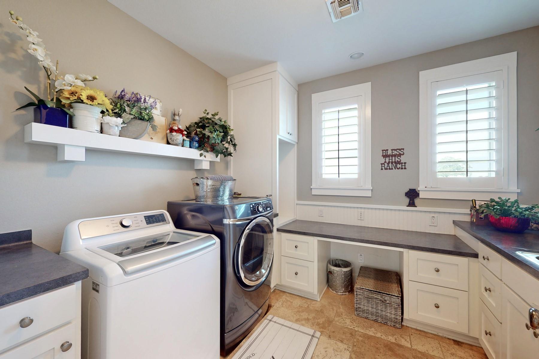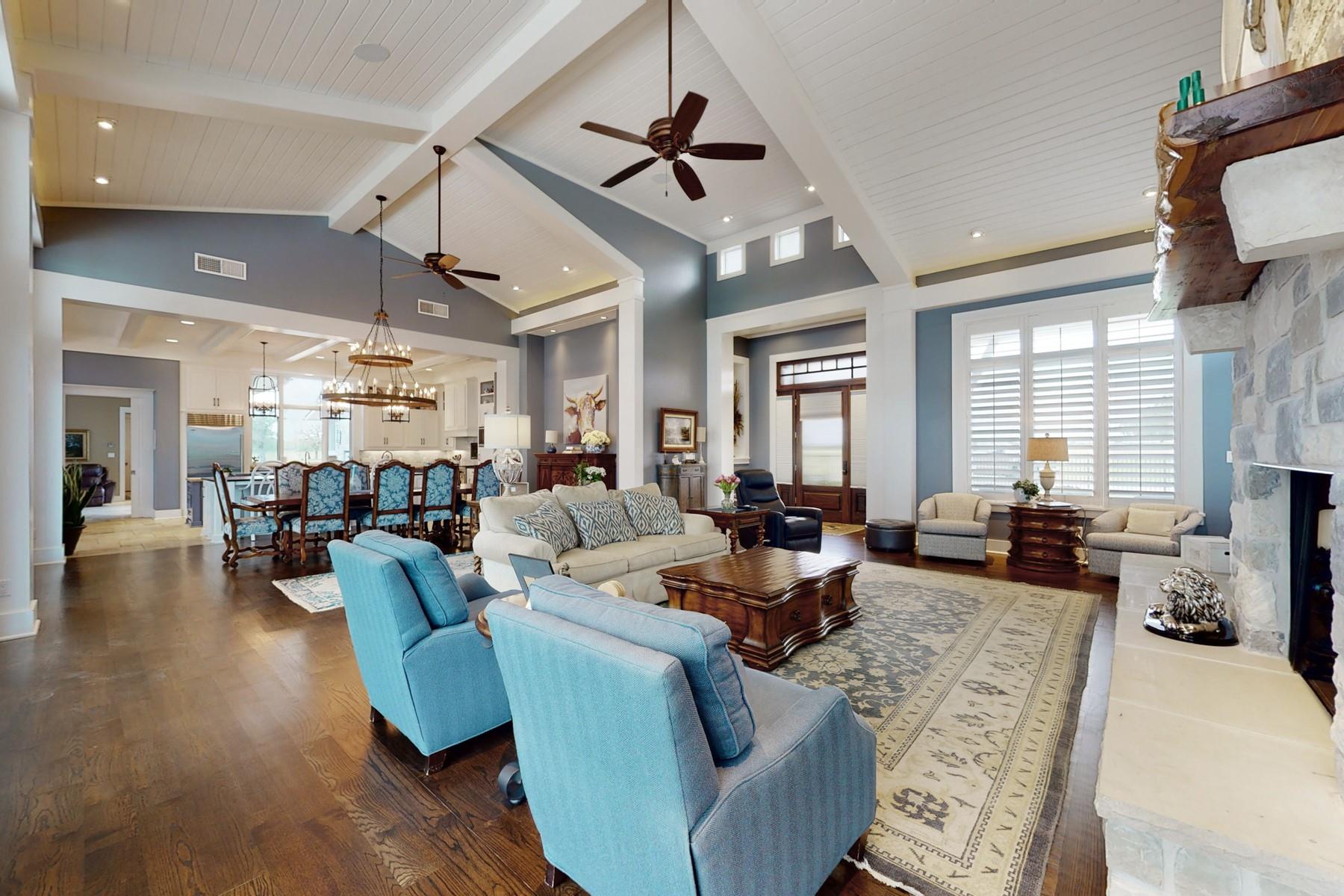 | Interior Features | Two Primary Suties, Bookcases, Breakfast Bar, Built-in Features, Ceiling Fan(s), Beamed Ceilings, Vaulted Ceiling(s), Granite Counters, Electric Dryer Hookup, Eat-in Kitchen, In-Law Floorplan, Kitchen Island, Multiple Dining Areas, Multiple Living Areas, Open Floorplan, Pantry, Primary Bedroom on Main, Recessed Lighting, Smart Thermostat, Soaking Tub, Walk-In Closet(s), Washer Hookup, Wet Bar | |