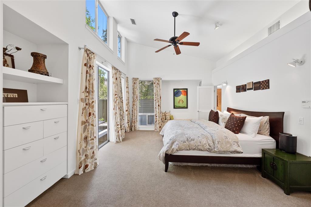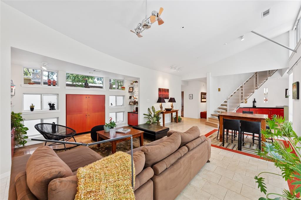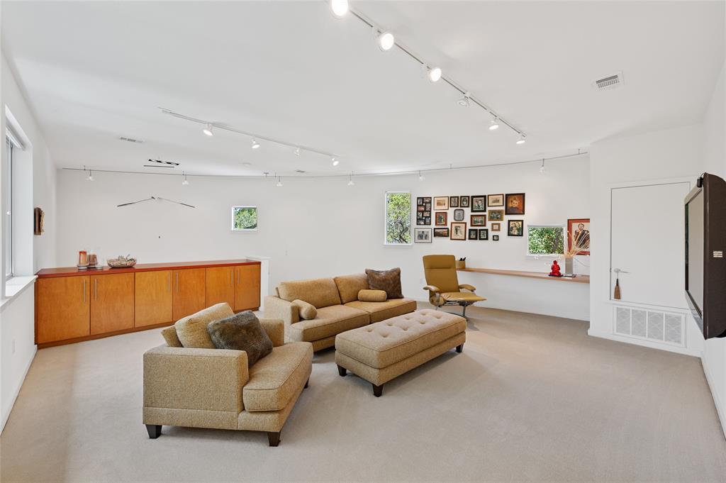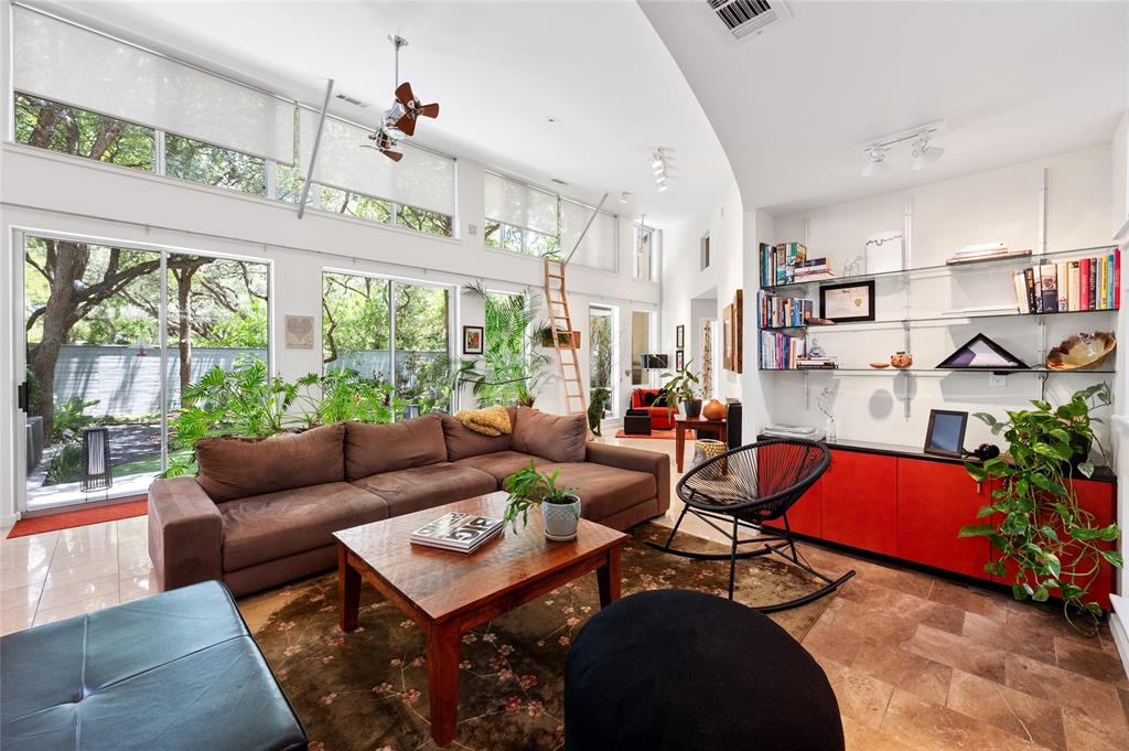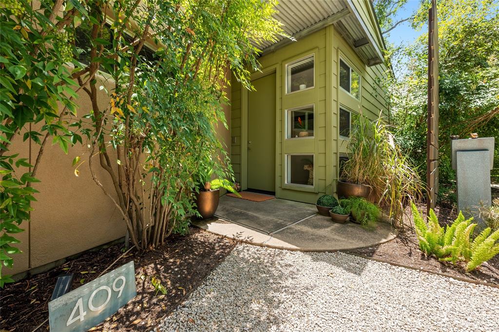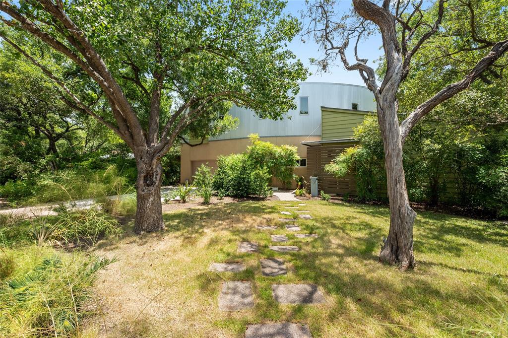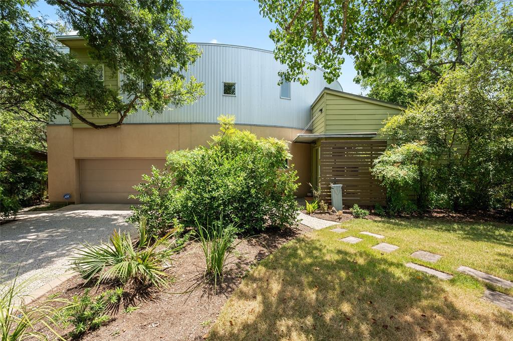 Very private modern home from street. Inside the house opens up with tall ceilings and a wall of windows to a beautiful private backyard sanctuary with gardens, a splash pool that also serves as a hot tub, and an outdoor fireplace. Curved walls and an open staircase add an interesting design element to the house. Primary bedroom and a guest bedroom are on main level. There's a beautiful, open, well lit living area as well as a private office on main level. Upstairs is another living area with 2 additional bedrooms. Great location in Rollingwood on street with lots of young families. Close to shopping and easy access to downtown. House has solar panels which make utility bills extremely low. See attached floorplan, survey and utility bills.