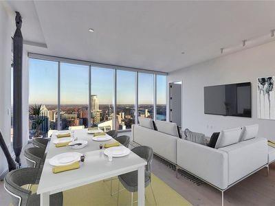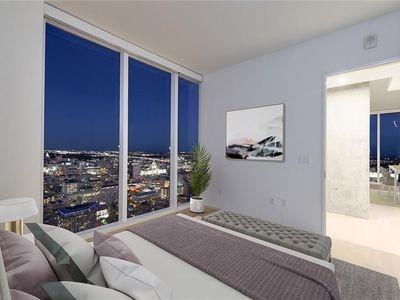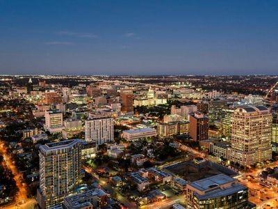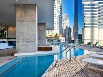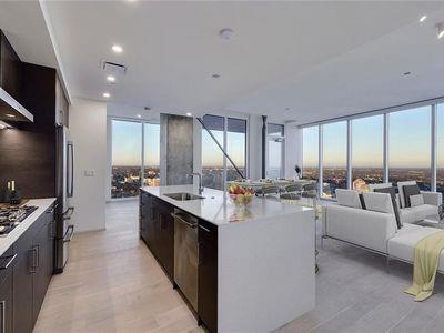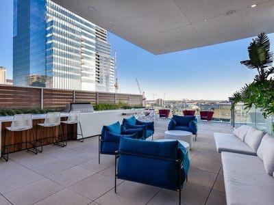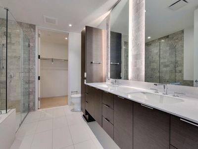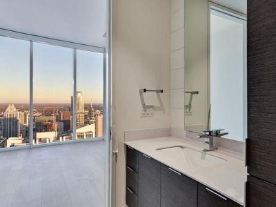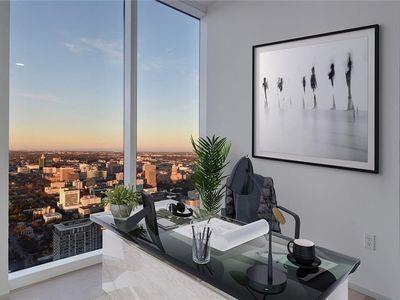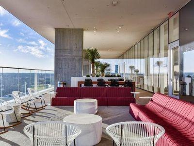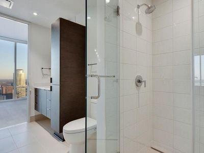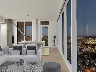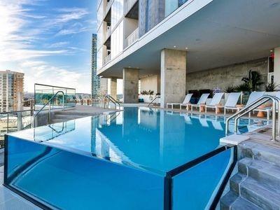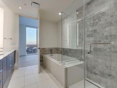 Luxury downtown living in one of Austin’s most iconic buildings. Unit 5103 is the highest 2 bedroom floorplan at the Independent making it truly unique. Sweeping views through floor to ceiling windows, 5103 clears all other downtown buildings with unobstructed views from Lady Bird Lake, through downtown, to the Capitol and UT. The photos do not do justice to the spectacular views! East & North facing windows allow for enjoyment of the cityscape, shades up all day without affecting your comfort with heat or sun fading your furnishings. This B7 floorpan includes 2 bedrooms and a den perfect for a home office. Primary Bedroom with large en-suite features soaking tub, walk in shower with seamless glass surround, upgraded tile, spacious floating double vanity with backlit mirrors and walk in closet. Secondary bedroom with en-suite includes floating vanity with ample storage, walk in shower with seamless glass surround and walk in closet. Kitchen features large waterfall island with quartz countertop and is outfitted with luxury stainless steel Bosch appliances, gas range and quartz slab backsplash & countertops. Upgraded wide plank, bleached oak hardwood floors throughout, blackout roller shades in both bedrooms, WiFi enabled ceiling fans+light fixtures and Nest thermostat all included. All appliances convey, including washer & dryer. Two deeded prime location parking spots (129 & 130) on 3rd floor. Interior location of parking ensures you and your car are better protected from outside elements and your drive in & out far quicker. The Independent includes 24 hour concierge and two levels of superior community amenities. Floor 9 features a heated infinity pool with outdoor deck & lounge, club room, children’s playground/play area and pet lounge with dog run and dog wash station. Floor 34 amenities include fitness center & yoga/barre studio, board room & business center, theater, owners lounge and outdoor deck.