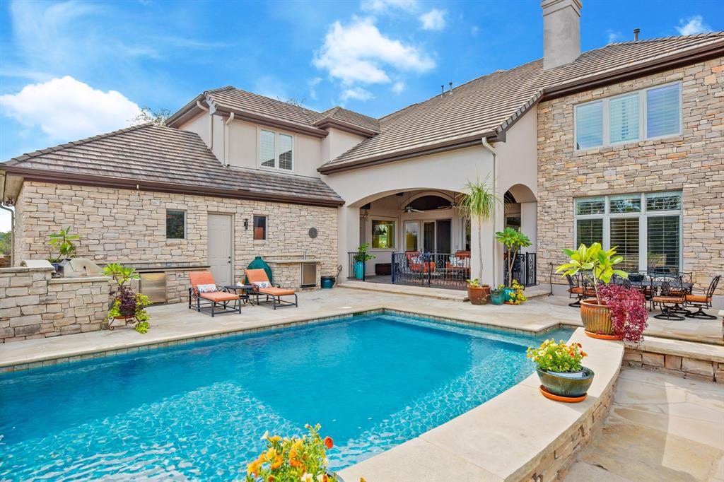 Gorgeous, custom built Harrington home in one of the most private and sought after neighborhoods in the Four Points area- Grandview Hills! This hill country modern home shines bright like a diamond with more contemporary exterior, many mature oaks and exquisitely manicured landscaping on an estate sized lot. Be greeted by soaring 25 foot ceilings, tons of natural light and an abundance of open entertaining space. The crown jewel of the home is the fully remodeled gourmet kitchen, featuring a custom stainless steel vent hood, commercial sized refrigerator/freezer, 6 burner Thermador range and single slab, very rare Blue Louise granite imported from Brazil for the island. This home also includes a spacious primary suite with direct access to the back patio and 17 linear feet of closet storage space. Upstairs you'll find a large secondary living space + 400 sq ft of easy accessible attic space! The backyard is nothing short of a stunning oasis which provides a resort-style swimming pool with multiple waterfall features and 10-person hot tub. Over 2000 sq ft of perfect outdoor living space, with numerous different areas for lounging, sun bathing, and eating. Fantastic outdoor kitchen with grill, refrigerator, and kegerator, along with an expansive grassy lawn for the kids or furry friends. Views of the protected greenbelt can be seen from the back patio, along with lovely hill country scenery. Private driveway on a cul-de-sac road with 3 car garage. Located in one of Austin’s highest rated school districts, Leander ISD. This home is walking distance to an IB elementary school, tons of restaurants, shopping, and in close proximity to all other conveniences of Austin, including The Domain, Lakeline Mall and downtown. Minutes to both Lake Austin and Lake Travis, this truly is an amazing placed to call HOME!