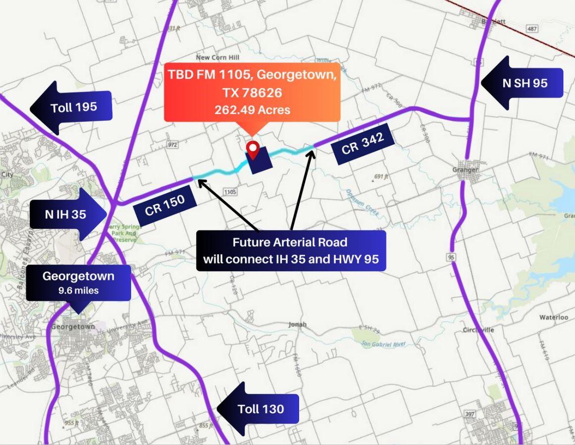 Situated on a sprawling 262.49-acre property along FM 1105 in Georgetown, Texas 78626, this land offers a unique investment prospect for a transformative community project. Its strategic location ensures seamless connectivity to key areas: just 9.6 miles from Georgetown, 21.3 miles from Round Rock, and a mere 39.3 miles from the heart of Austin. This prime property is a canvas for creativity, with the potential to accommodate up to 1000 homesites, feature designated areas for commercial ventures, and offer multi-use facilities and lush parks, creating an engaging living environment for future residents. Discover the potential of this exceptional property, offering a remarkable opportunity for the development of an expansive community.