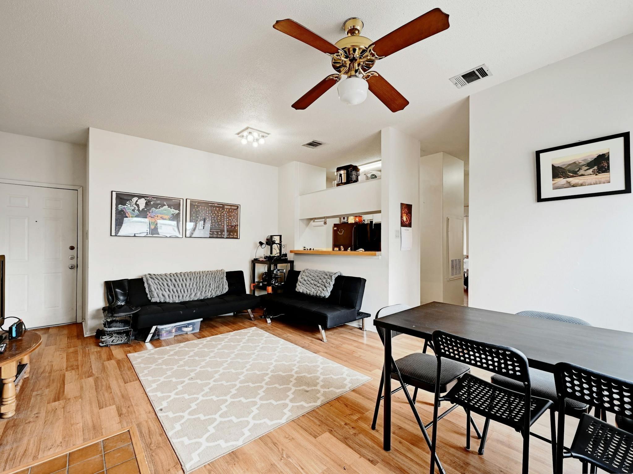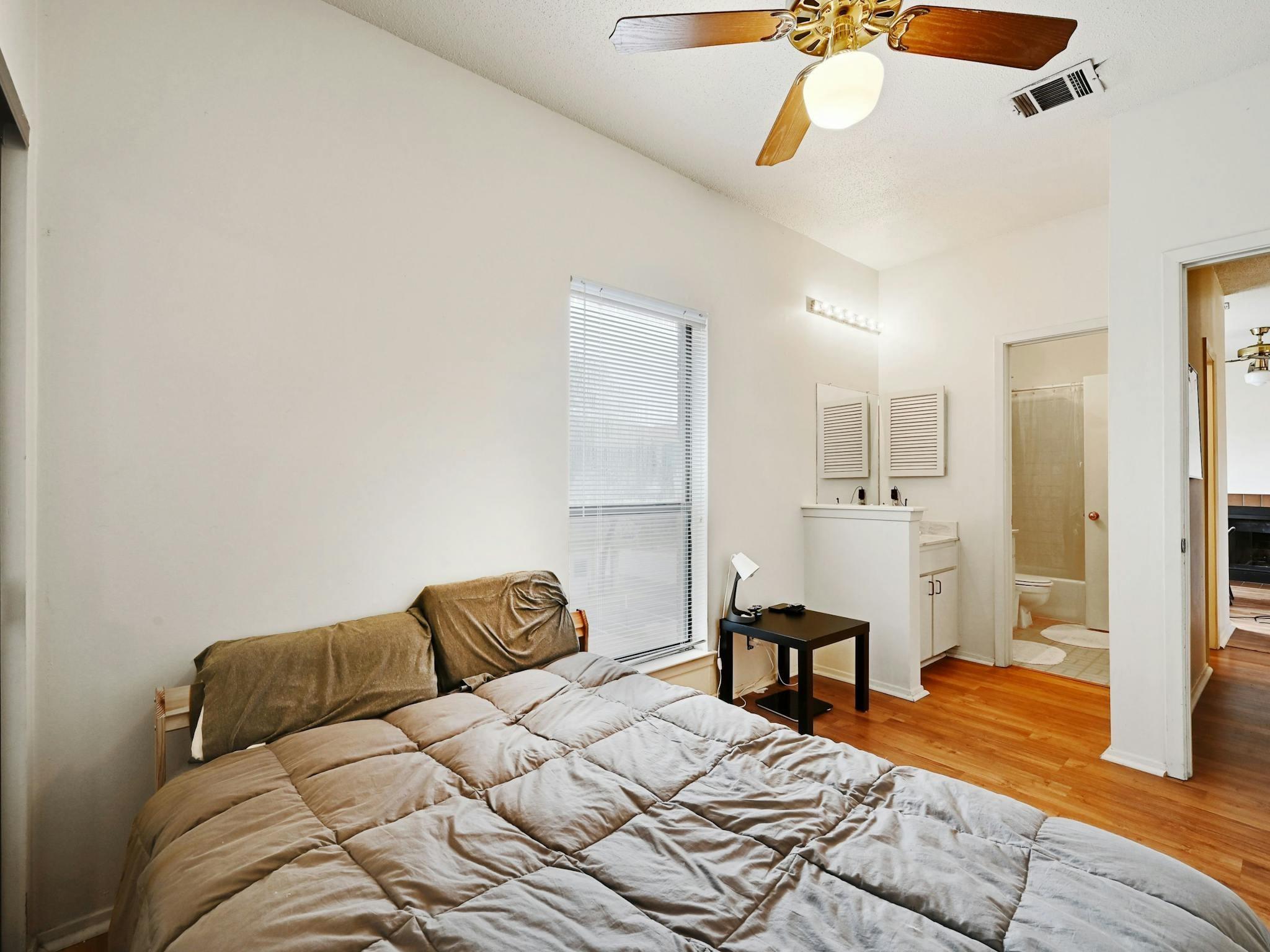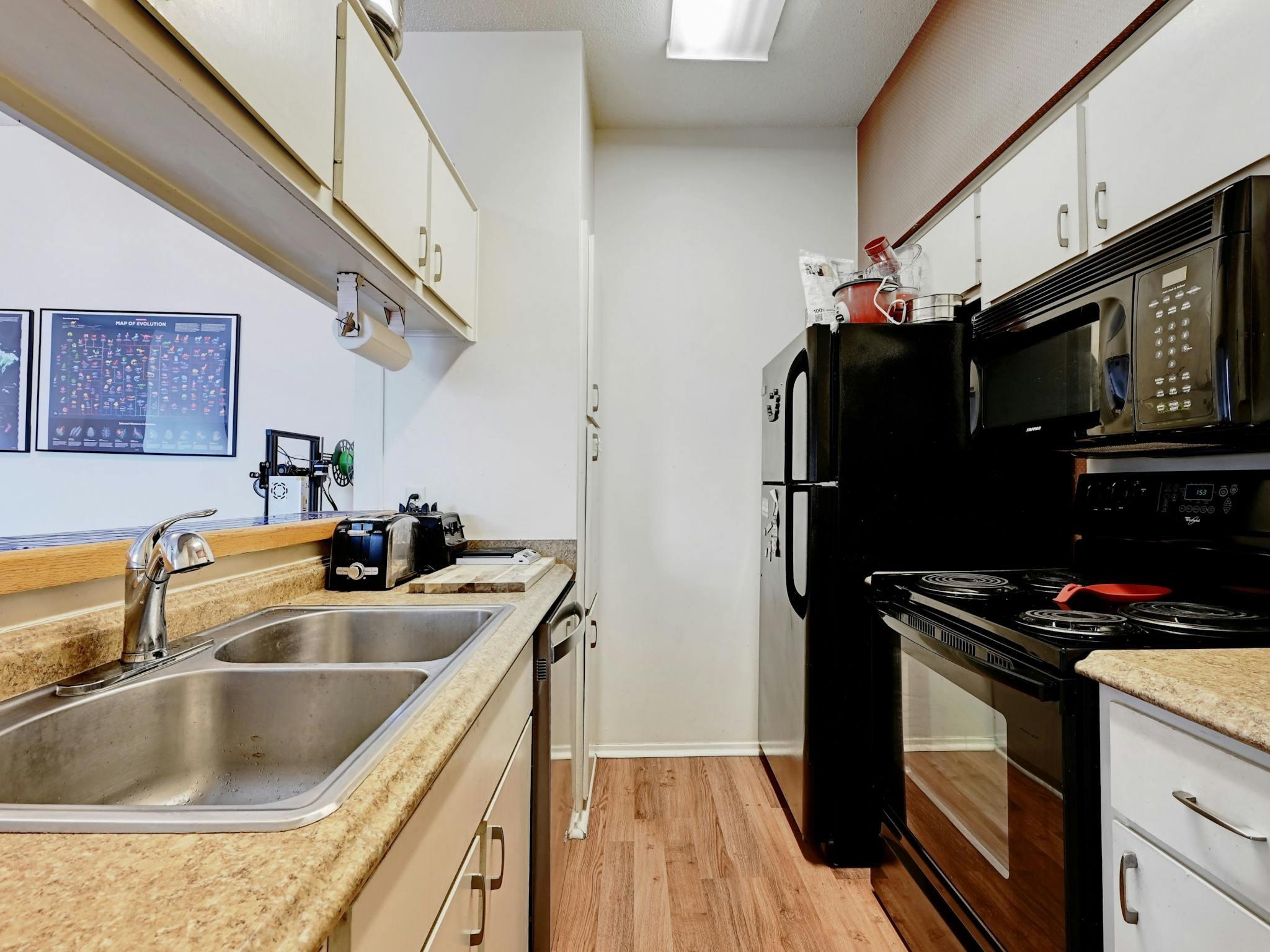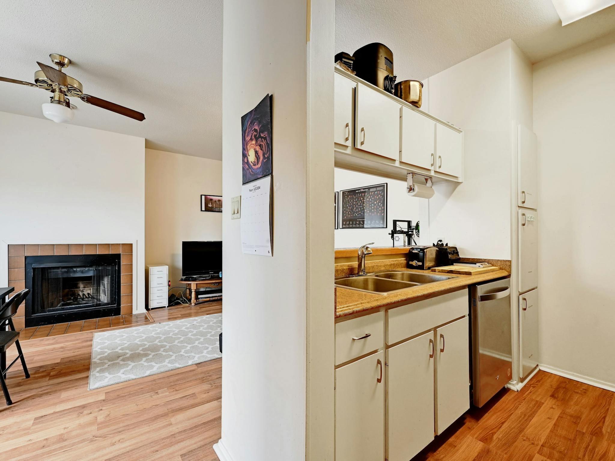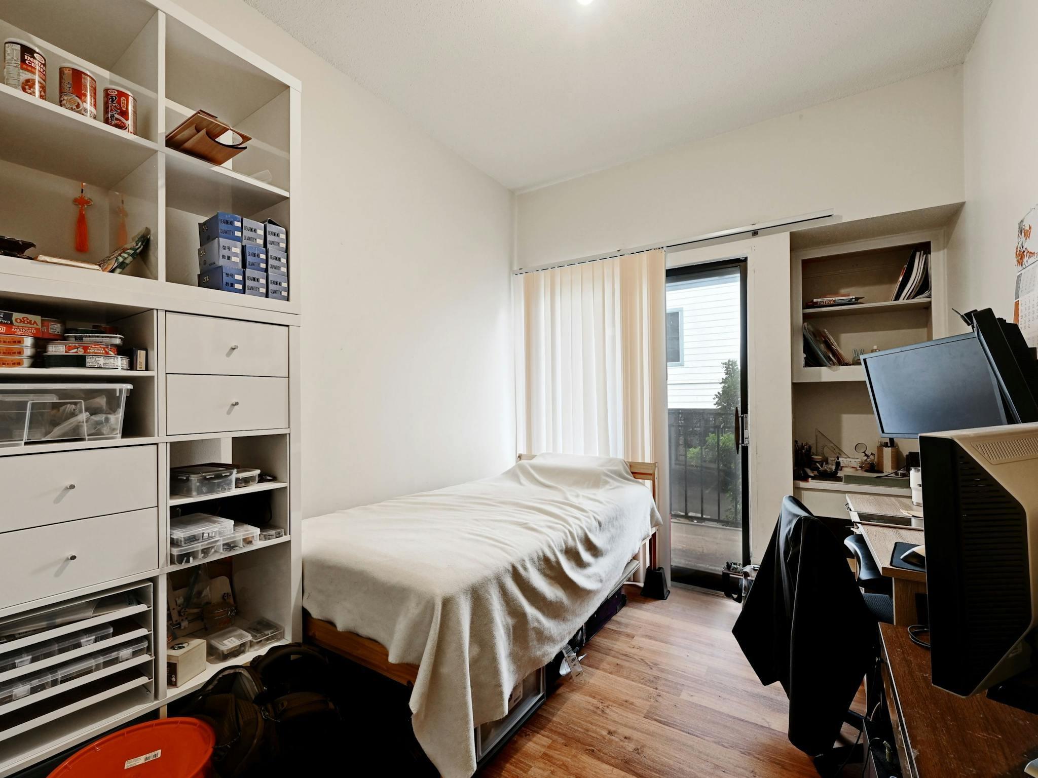 On the "quiet side" of campus near bus lines, this two bedroom, one and a quarter (private sink and vanity in primary room) features a jack and jill style bathroom, in unit laundry. A new Dishwasher and disposal have recently been installed. Covered reserved parking below the building. Gated entry into the building. Balcony off second bedroom.