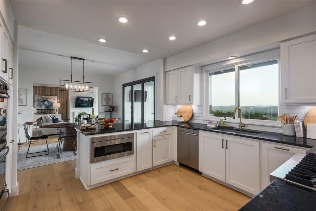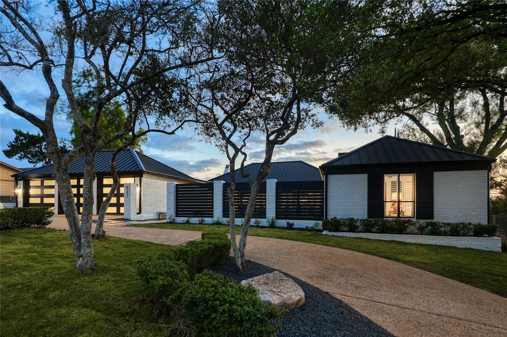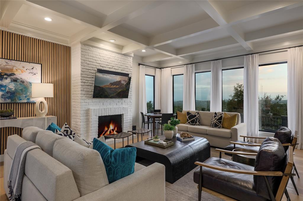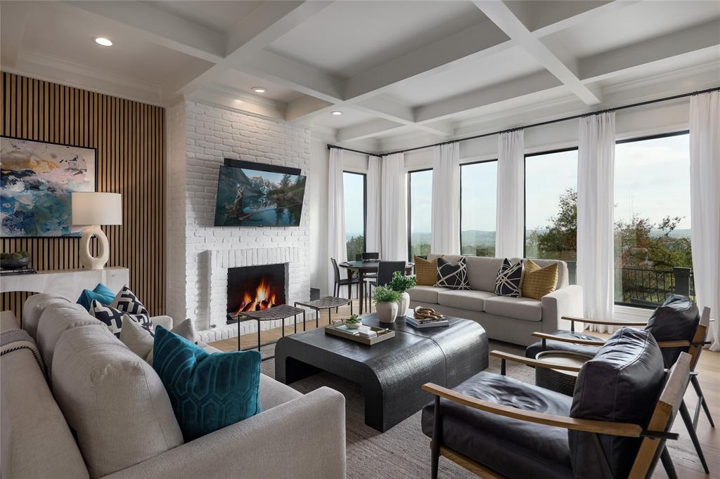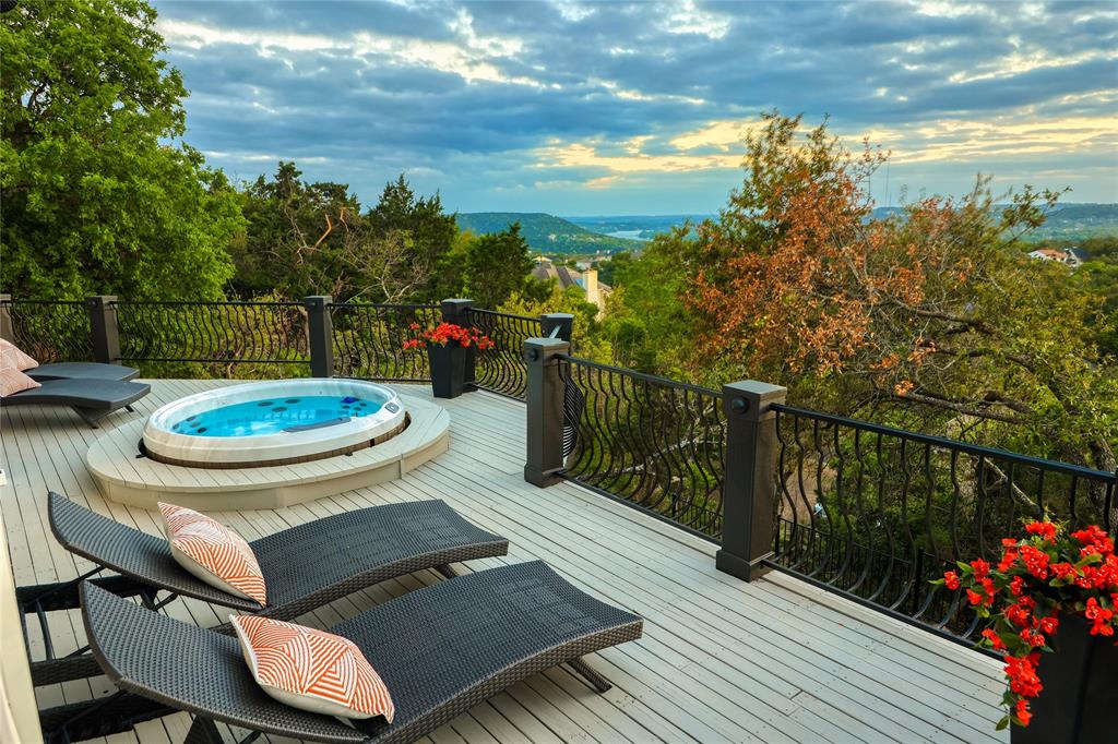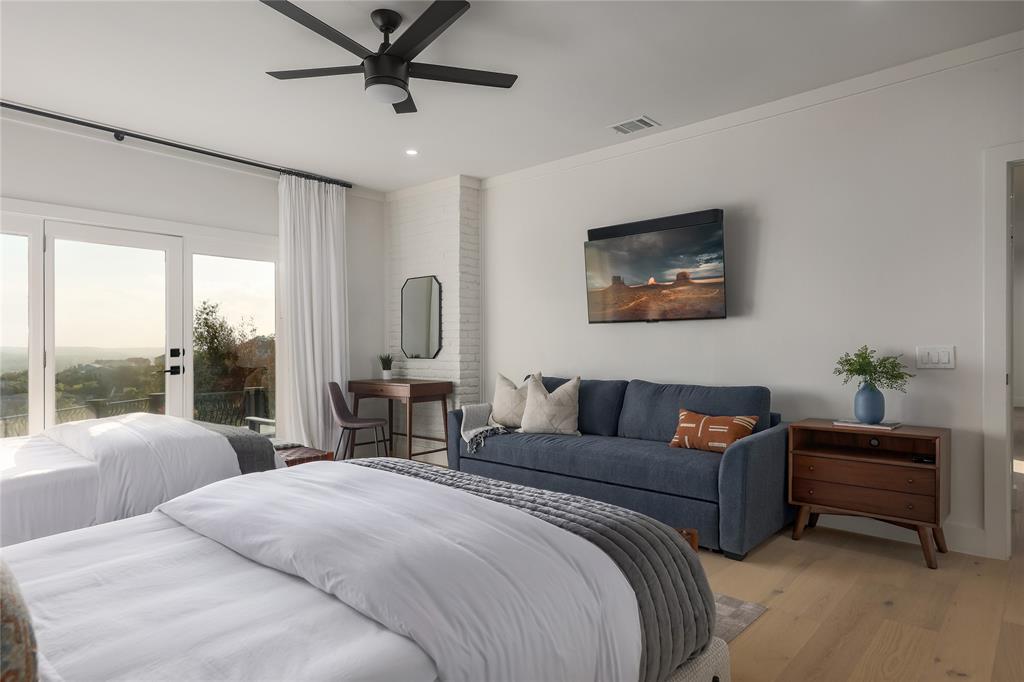 A truly exceptional mid-century modern home, this fully-furnished 4-bed, 3.5-bath residence in Northwest Hills was designed to entertain with views of the Hill Country and Town Lake. In the front yard, you are greeted by a picturesque courtyard meticulously landscaped with new grass, shrubs, and flowers that perfectly accent the newly painted exterior and roof. Inside, the living room has elegant coffered ceilings, a wood-burning fireplace, and sweeping views from the hilltop vantage point through a wall of windows with hurricane shutters. Boasting a desirable open-concept layout, new hardwood floors run throughout the living room, the dining room with folding glass doors to the terrace, and the gorgeous kitchen. The kitchen is outfitted with ample storage and countertop space; a pantry; bar seating; a breakfast nook with another sliding door to the terrace; and high-end stainless-steel appliances, including a Sub-Zero refrigerator, a Viking stove top, and a Bosch dishwasher and convection microwave. Just off the kitchen is a well-appointed wet bar with an ice maker dishwasher and a new wine fridge. Retreat to the light-filled primary suite that offers large windows with more amazing views and access to a terrace with a gas fire pit and back deck hot tub. The spa-like primary bathroom has a soaking tub, dual sinks, a spacious walk-in shower, separate makeup vanity and an expansive walk-in closet with custom built-ins and a window for natural light. The three other bedrooms have also been beautifully upgraded with stunning accent walls and luxurious bathrooms with new tile, marble floors, showers, and countertops. This home is complete with a family room, a laundry room, a powder room, a mud room, and a coveted 3-car garage with acrylic-sealed floors. The terrace features exquisite sunset views over the magnificent hills with a large hot tub and an outdoor TV. Property is available for sale and lease. See agent.