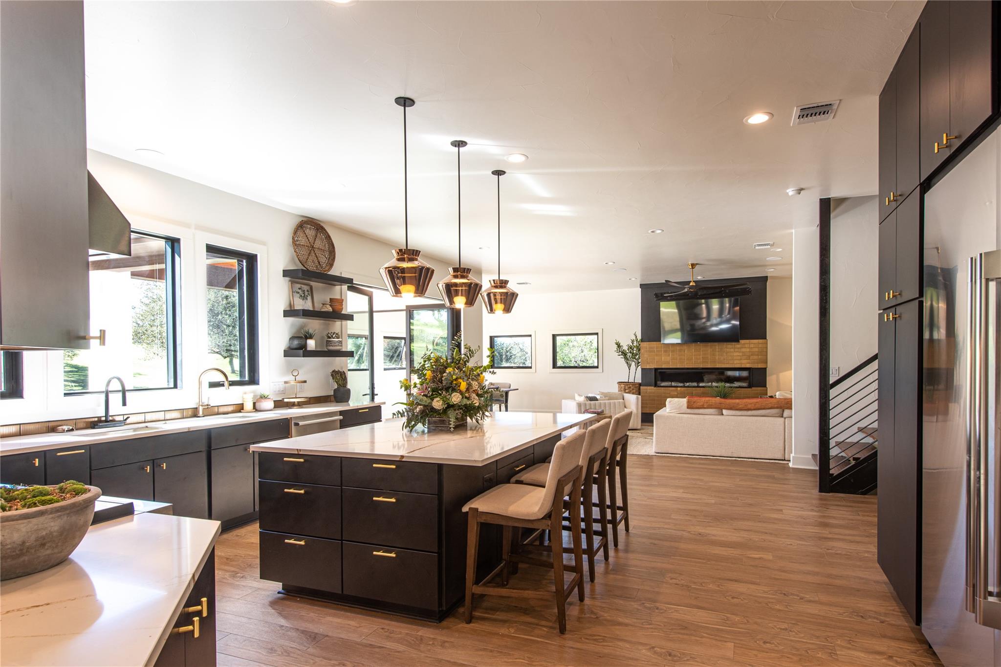 Summit $205,000 membership waiver to be provided by seller upon application & acceptance. This is the perfect golf home and location in Horseshoe Bay! Right across the street from The Caprock entrance and backing up to the #1 Tee Box on Apple Rock. Walk or take your golf cart just two lots away from the entrance and enjoy golf, two pools, outside cabana and bar and the fabulous Caprock Restaurant. The home itself has spectacular drive-up appeal; especially at dusk with the landscape illuminated. On the inside, THE TECHNICUREAN KITCHEN IS THE MAIN ATTRACTION! Appliances are by Signature Kitchen Suites featuring Sous Vide cooking, duel fuel dbl oven with warming and steam functions, restaurant style vent hood all controlled by I Phone App or simply manually. The five foot wide stainless sink has a touch spray faucet and separate veggie sprayer for salad prep along with a deck mounted glass rinser and sliding trays and racks. After parking the golf cart in the attached garage, walk right into the mud area with a half bath, shoe bench and coat hooks and then grab a cold drink from the glass door wine column. The open kitchen, living and dining areas are all connected and have fantastic views of the rolling double wide fairway lined with oaks. Bring the outside in when you open the double 8' tall trifold doors onto the covered patio. Elsewhere, the master bath freestanding polished black tub is the highlight of the owner's retreat. The upstairs is perfect for when the kids and grandkids visit. They'll have their own wet bar, fridge, ice maker, brk bar, laundry room, game room, separate AC'd sleeping porch along with 3 bedrooms and 2 baths. Enjoy all the amenities of the HSB Resort life, including golf, tennis, boating, fine dining and member activities! * Upon application and acceptance, the property includes a $205,000 waiver of initiation at the Summit Level to The Club at Horseshoe Bay. This expires June 15, 2024. Most amenities require Membership to HSB Resort.