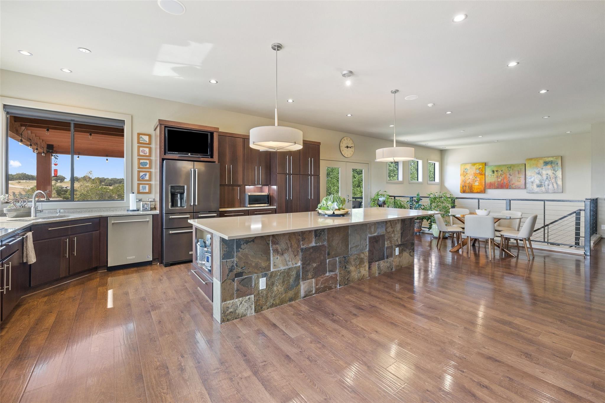 Welcome to Dragonfly Ranch, a hill country oasis with stunning views, green pastures, and the coveted hill country lifestyle. Beautifully nestled on 22.594 acres, this private retreat features over 4820' of living space, a 3183' drive thru garage barn able to accommodate 10+ cars, or service vans if you desire a live/work environment. The open floor plan seamlessly blends the indoor and outdoor together, creating serenity while working, entertaining or relaxing and enjoying endless sunsets. The property includes a two bed guest house, pool & spa, horse and equipment barns, a geothermal heating and cooling system, a 30,000 rainwater collection system, water well, fully fenced, and much more for those who prefer practical luxury in this Lifestyle Ranch. Come experience the tranquility of the countryside and seize the opportunity to live your dream life at Dragonfly Ranch.