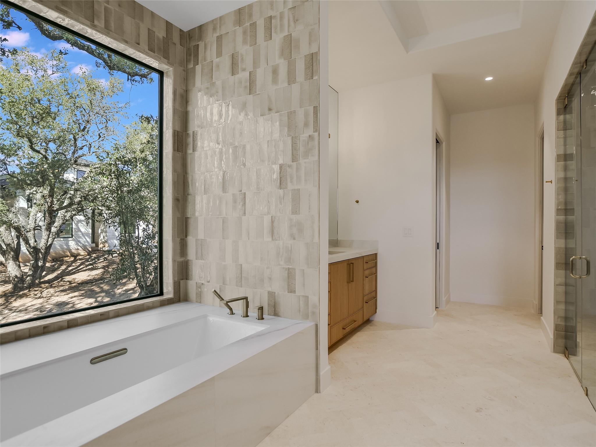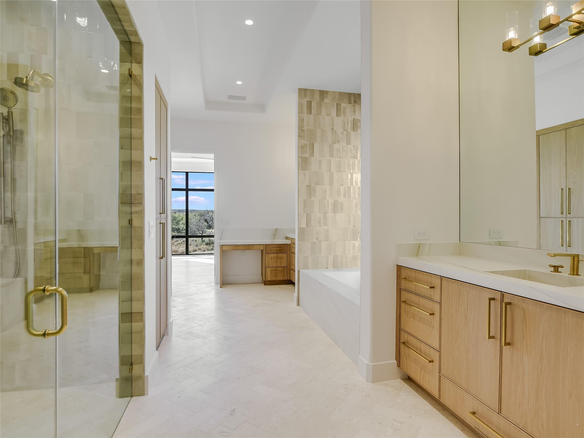 Stunning new construction by Canyon Creek Homes in Summit Rock overlooking Pecan Creek and #15 with an initiation waiver to the resort upon application and approval. This is an entertainer's dream home -Offering a large open great room and kitchen with Thermador concealed appliances featuring the 60" range with griddle and double oven and a comprehensive butler's pantry equipped with a full size dual beverage frig, commercial grade sink, Thermador coffee station, secondary dishwasher, and ice maker. The interior finishes feature Michael Edwards Custom Cabinetry done in white oak with slab fronts, undermount primary tub with honed porcelain slab by Ceasarstone, and an Italian handmade faucet in powder room. Other details include include trimless recessed downlights, linear flush mount AC vents, and level four smooth wall treatment. The floorplan offers a primary suite and casita with kitchenette on the main level with 2 en suite bedrooms, flex game room with terrace, and bar on second level. The exterior is appointed with beautiful oak trees, heated pool/hot tub and an entrance courtyard with landscape lighting.