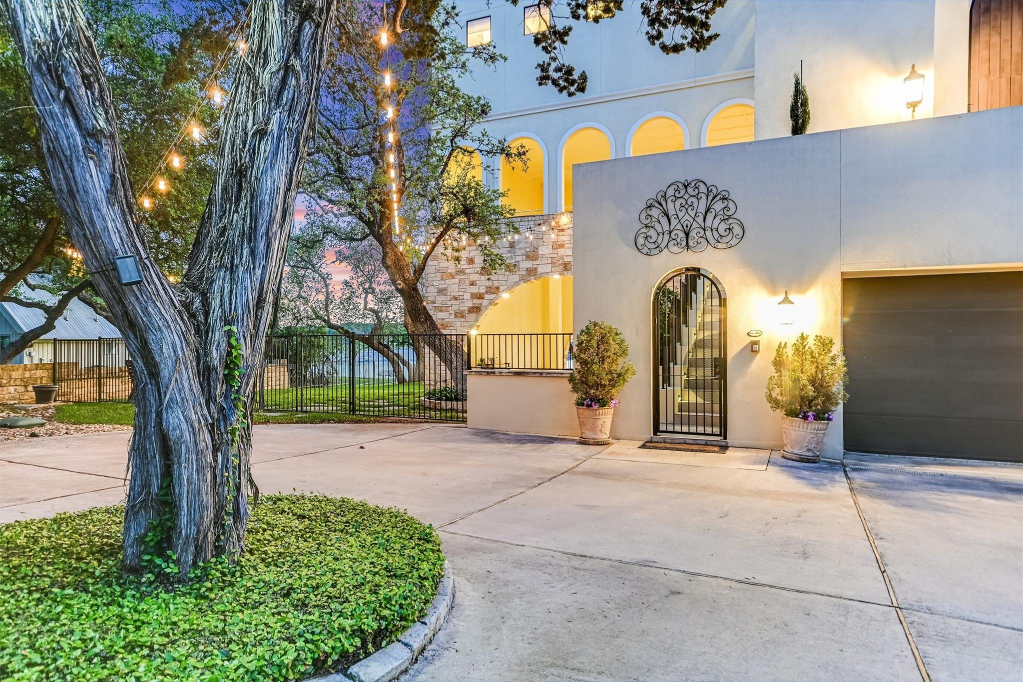 Welcome to your exclusive lakeside sanctuary! Built to entertain with thoughtful architectural design, it boasts panoramic views of Lake Travis from every level. As you wander through the entry courtyard you are greeted by over 2100 sf of covered outdoor living space, featuring a resort-style pool, in-ground spa, and expansive illuminated arches designed for savoring breathtaking sunsets. Also included are multiple seating areas, a fireplace, and outdoor lounging and dining areas. This outdoor oasis is designed for unforgettable moments, capable of hosting both large gatherings and quiet evenings at home. The elevator, linking all levels, ensures effortless access throughout the home. On the main living area, panoramic views take center stage with expansive windows framing the serene beauty of the Lake Travis from every angle. The living room features a wood-beamed ceiling and retractable sliding glass doors that open to a spacious covered outdoor living. Designed to satisfy both at-home dinners and catered affairs, the kitchen features professional-grade panel front appliances, a huge center island, and an expansive butler's pantry. Discover the epitome of luxury in the primary suite with it's own covered outdoor living area and immerse yourself in the tranquility of the lake. Retreat to the spa-like ensuite primary bath for a pampering escape. A private office with a built-in Miele coffee bar, expansive views of Lake Travis and covered outdoor living allow you to work both inside and out. The 4th bedroom is a guest suite with both a bedroom and a private living room - great for visiting families w/children or guests with longer stays. Outside, the lush yard with mature trees and commercial-grade custom lighting creates an enchanting backdrop for outdoor gatherings. With its prime location, luxurious amenities, and unparalleled views, this home offers a lifestyle of luxury and tranquility that is truly unmatched.