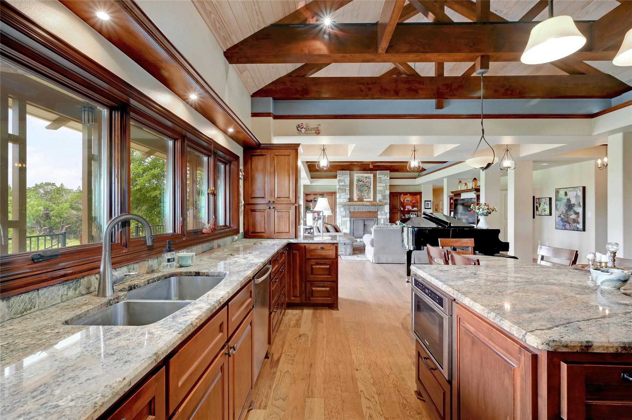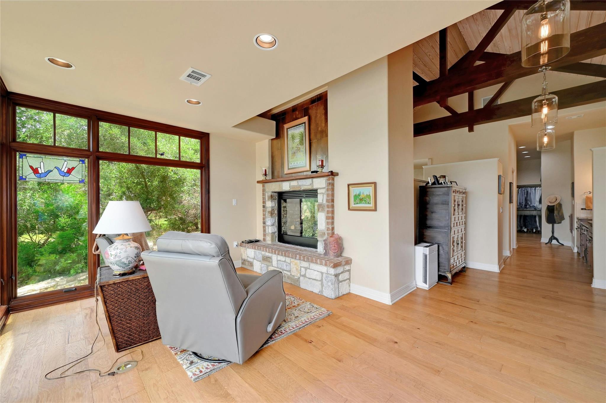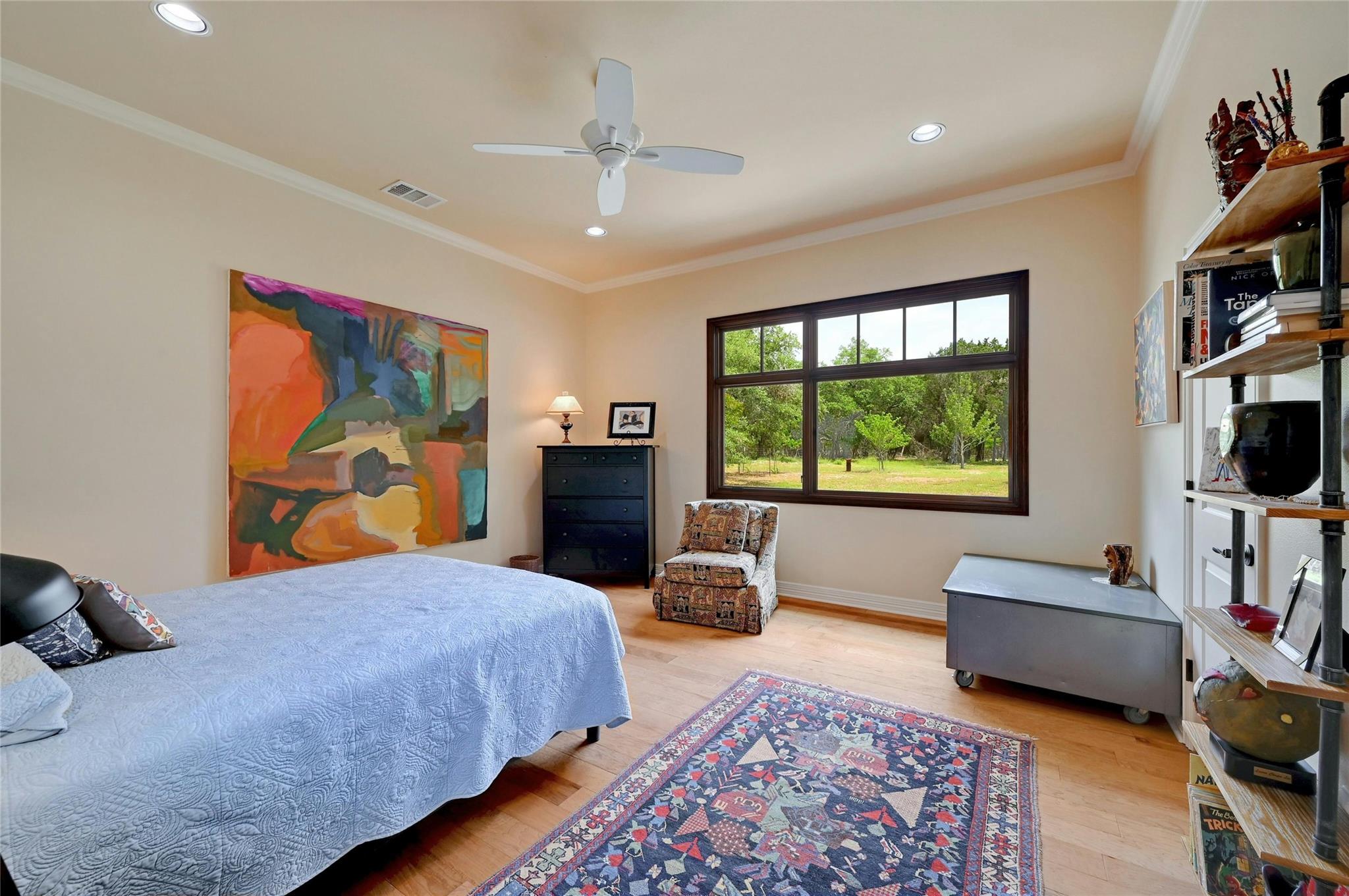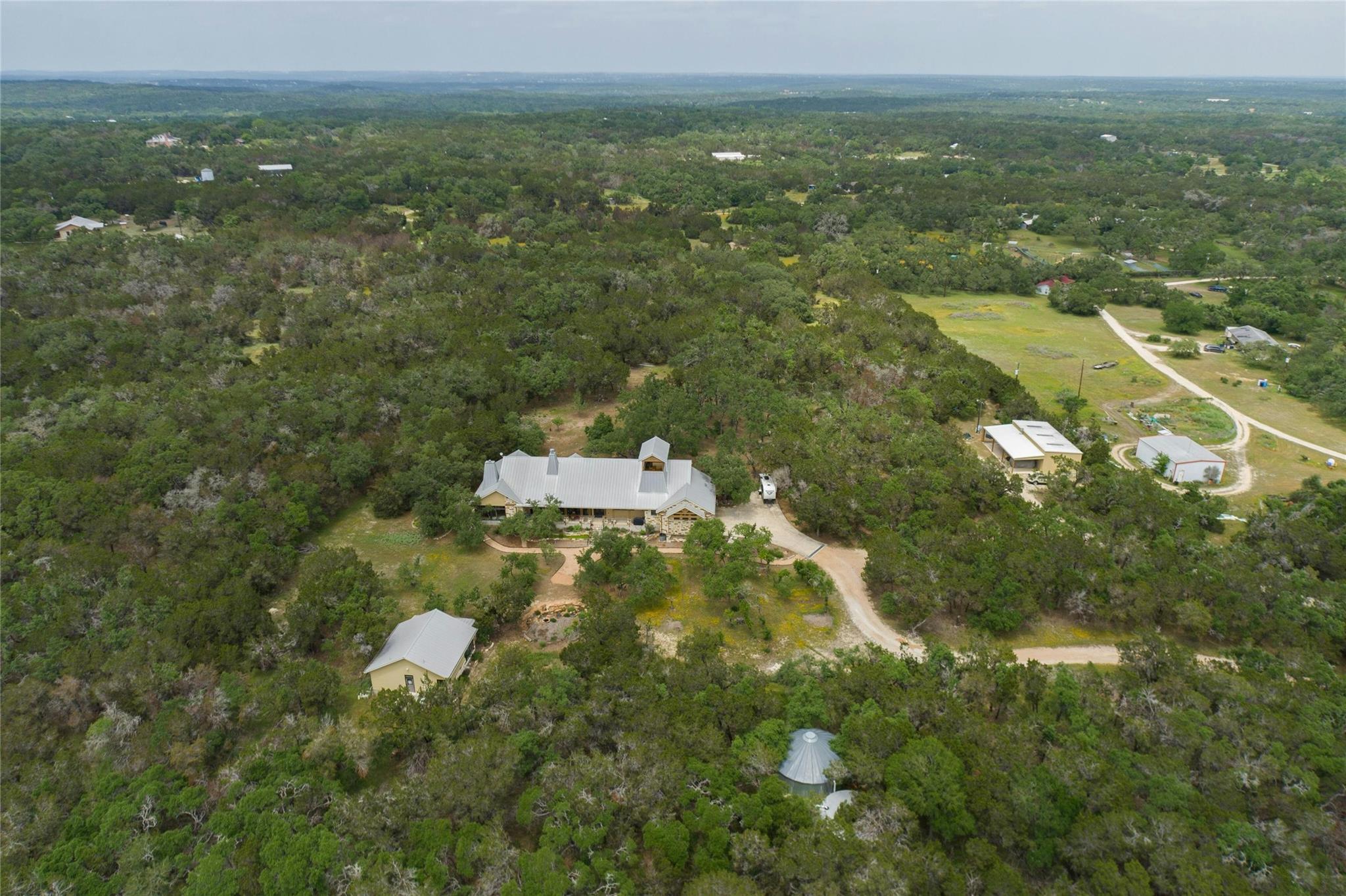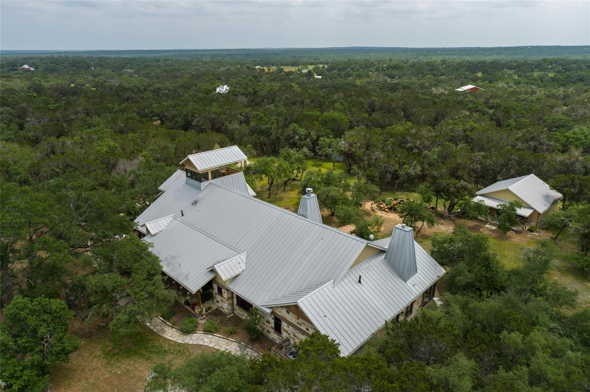 Situated on 14.2 acres is this well-crafted, architect designed single story home, studio/guest house and spacious workshop. The attention to detail is evident the moment you enter the home with beautiful hand-scraped Hickory floors throughout, extensive custom cabinetry and wood casement dual-paned Pella windows. The wonderfully equipped chef's kitchen includes a large center island, Wolf 6-burner cooktop, Wolf double oven, warming drawer, Miele steam oven, Subzero refrigerator and Bosch dishwasher. The dining room is welcoming to groups large and small with windows opening out into a grove of Oaks. As you walk into the primary suite the stepped bookcases reveal the room as the wraparound windows expose the beauty of the property which can be enjoyed from the sitting area. The primary suite also boasts a dual sided fireplace, soaking tub, walk-in shower and very large closet with built in cabinetry. Adjoining the primary suite is an exercise room/versatile space. The home features two additional bedrooms plus an office/bedroom, two full bathrooms and two half baths. Take the spiral staircase up to a private viewing space overlooking the Hill Country or down to the wine cellar. The environmentally conscious home and guest house are entirely spray foam insulated with high SEER cooling/heating and connected to a 50K gallon capacity rainwater collection system. There is a 585' well on the property that has a holding tank next to the home. There is a separate 1000 square foot work shop with an additional full bath. You can sit on the front porch and watch the animals walk through the clearing or sit on the expansive back porch and listen to the waterfall and nature all around you. Very close to all the shopping and activities in Wimberley, Kyle and Austin.