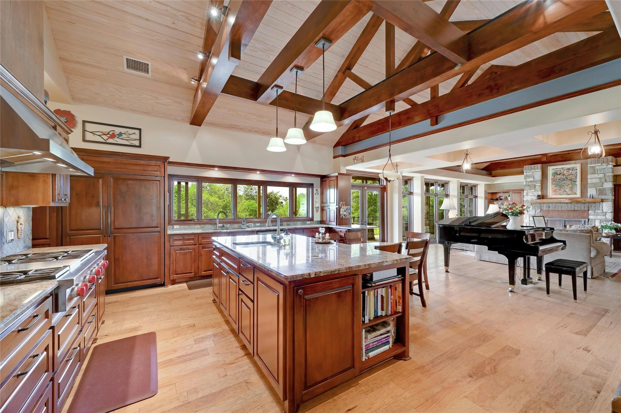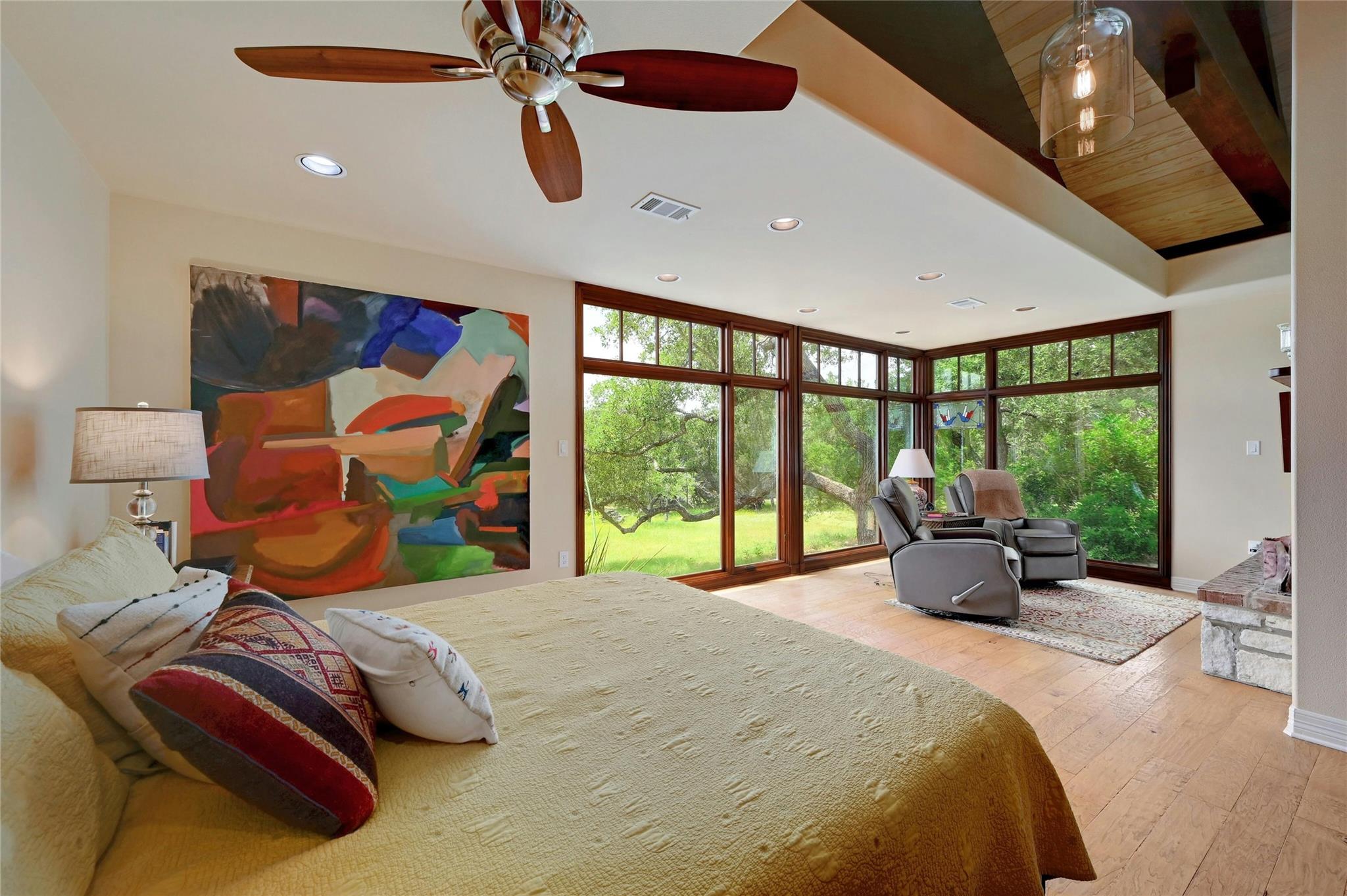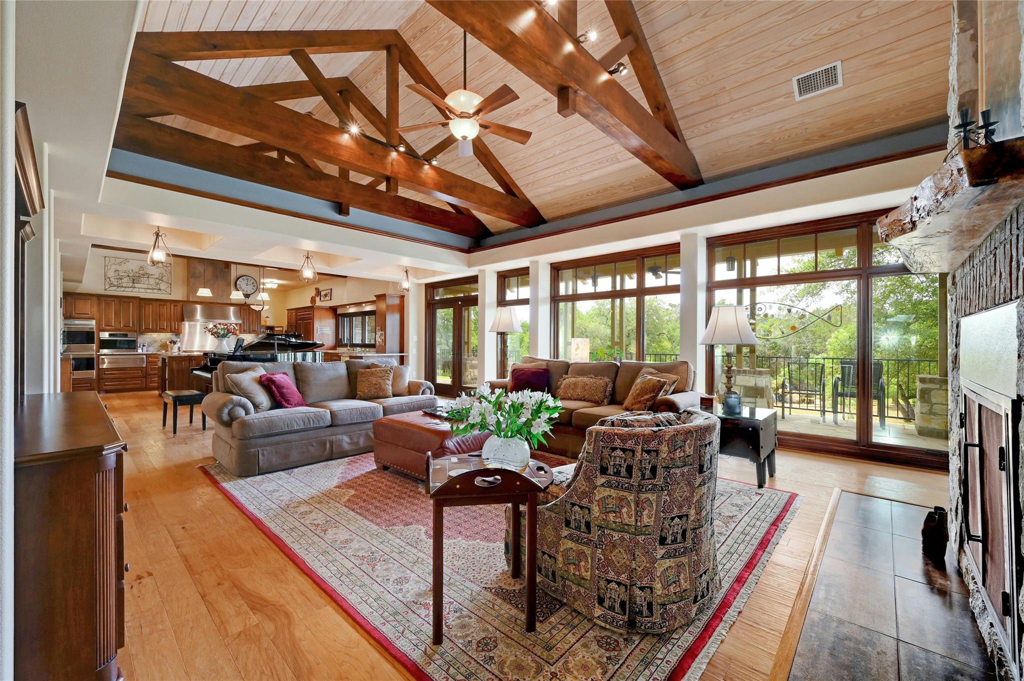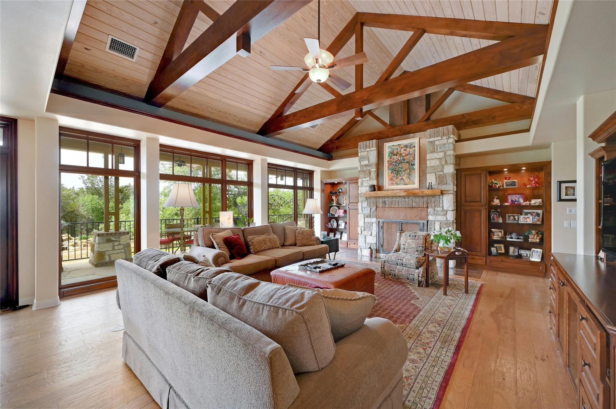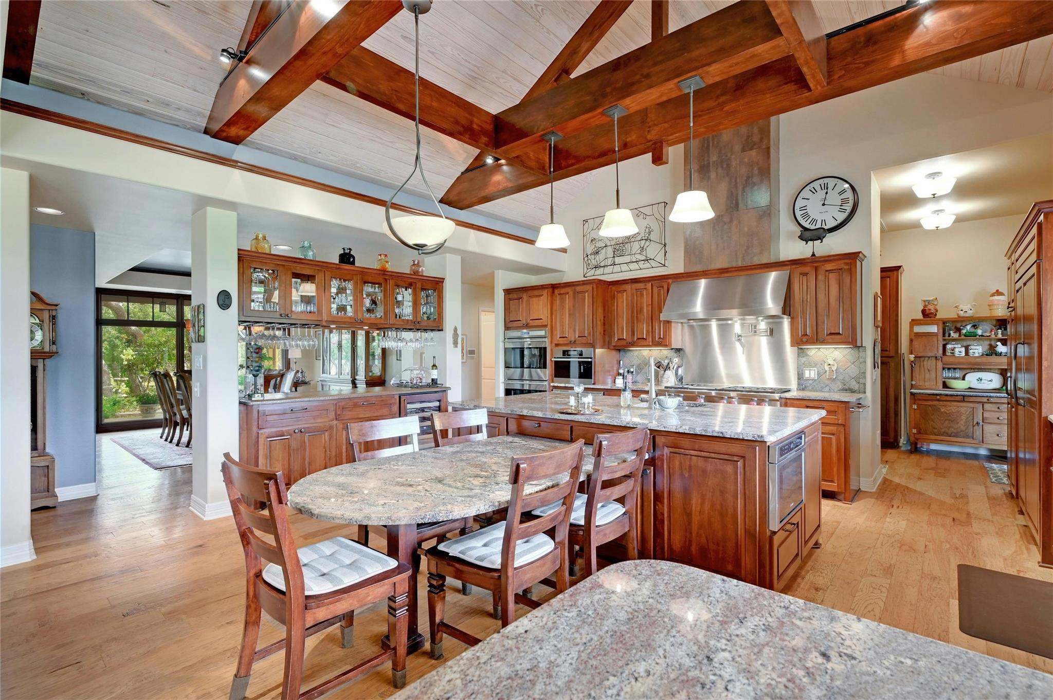 Situated on 14.2 acres is this well-crafted, architect designed single story home, studio/guest house and spacious workshop. The attention to detail is evident the moment you enter the home with beautiful hand-scraped Hickory floors throughout, extensive custom cabinetry and wood casement dual-paned Pella windows. The wonderfully equipped chef's kitchen includes a large center island, Wolf 6-burner cooktop, Wolf double oven, warming drawer, Miele steam oven, Subzero refrigerator and Bosch dishwasher. The dining room is welcoming to groups large and small with windows opening out into a grove of Oaks. As you walk into the primary suite the stepped bookcases reveal the room as the wraparound windows expose the beauty of the property which can be enjoyed from the sitting area. The primary suite also boasts a dual sided fireplace, soaking tub, walk-in shower and very large closet with built in cabinetry. Adjoining the primary suite is an exercise room/versatile space. The home features two additional bedrooms plus an office/bedroom, two full bathrooms and two half baths. Take the spiral staircase up to a private viewing space overlooking the Hill Country or down to the wine cellar. The environmentally conscious home and guest house are entirely spray foam insulated with high SEER cooling/heating and connected to a 50K gallon capacity rainwater collection system. There is a 585' well on the property that has a holding tank next to the home. There is a separate 1000 square foot work shop with an additional full bath. You can sit on the front porch and watch the animals walk through the clearing or sit on the expansive back porch and listen to the waterfall and nature all around you. Very close to all the shopping and activities in Wimberley, Kyle and Austin.