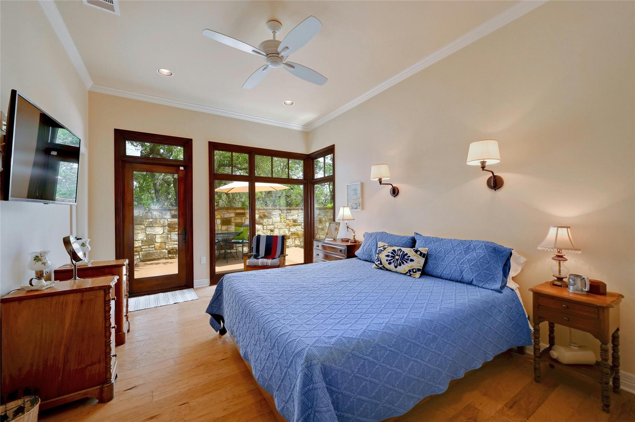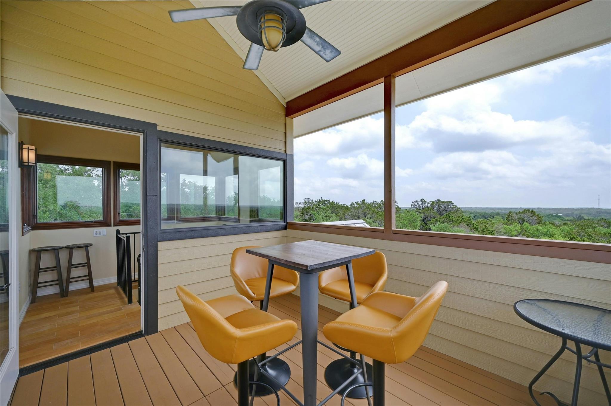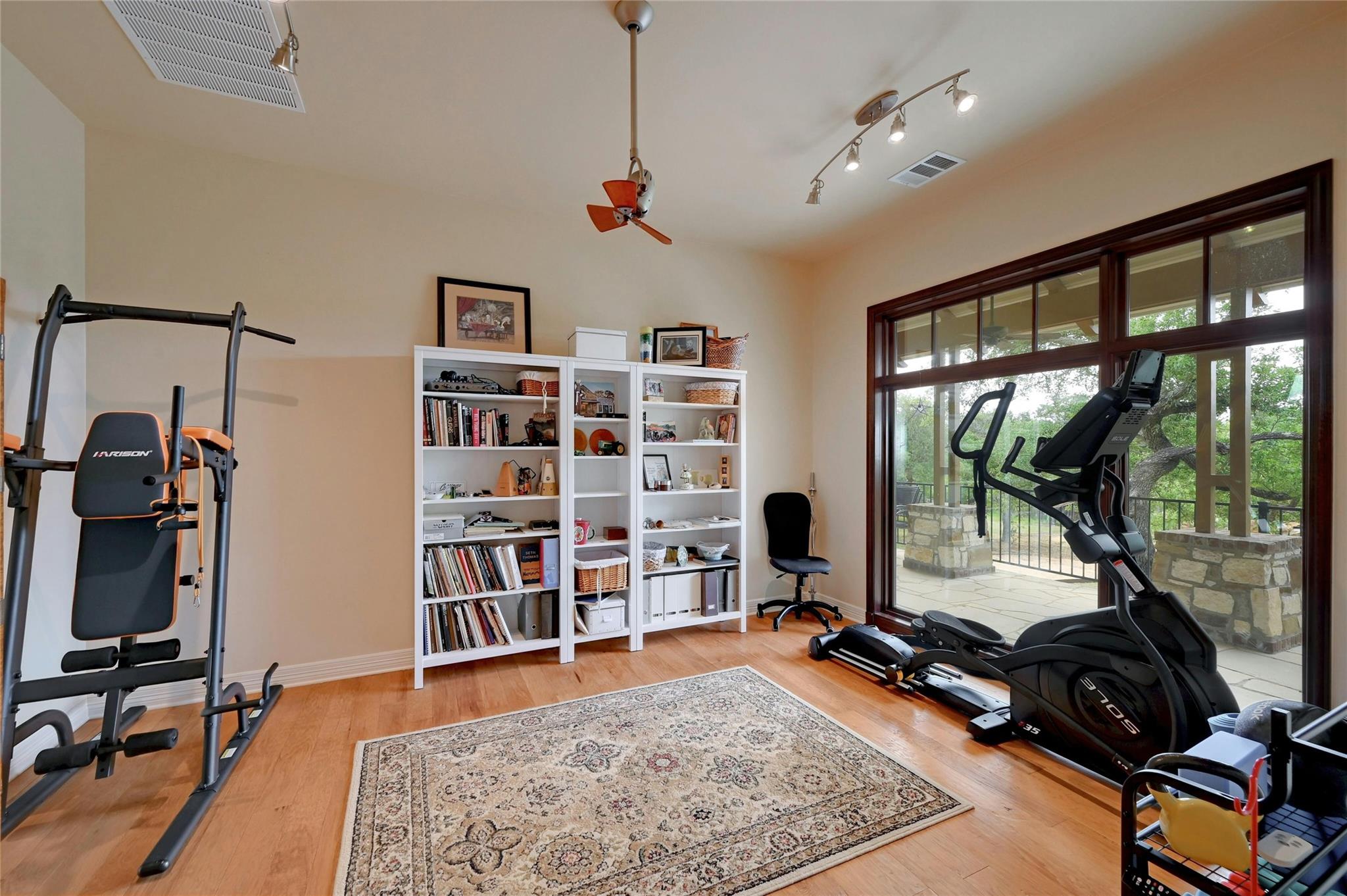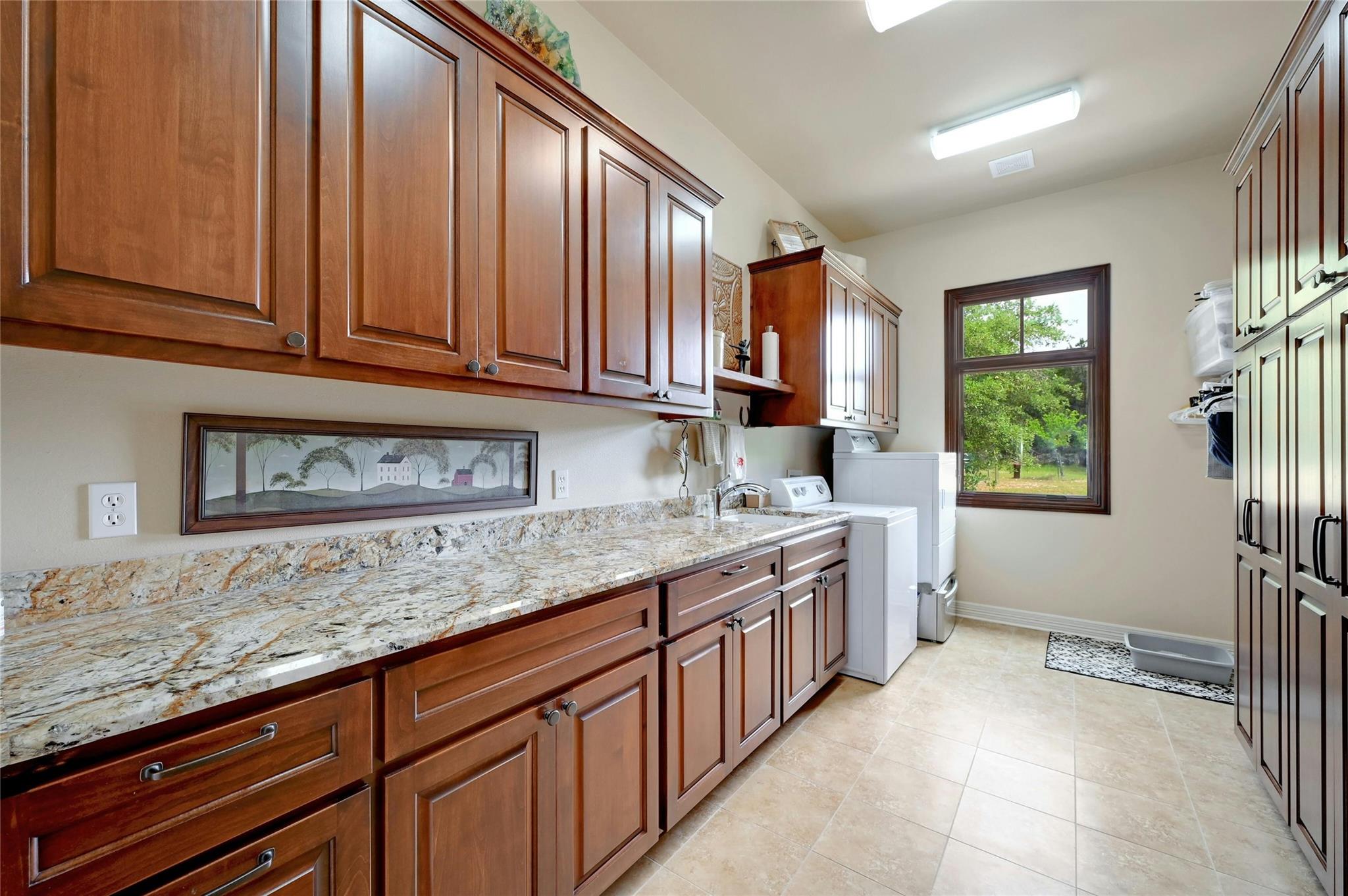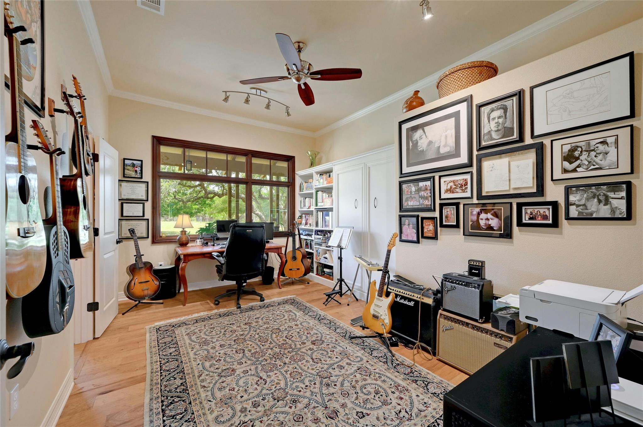 Situated on 14.2 acres is this well-crafted, architect designed single story home, studio/guest house and spacious workshop. The attention to detail is evident the moment you enter the home with beautiful hand-scraped Hickory floors throughout, extensive custom cabinetry and wood casement dual-paned Pella windows. The wonderfully equipped chef's kitchen includes a large center island, Wolf 6-burner cooktop, Wolf double oven, warming drawer, Miele steam oven, Subzero refrigerator and Bosch dishwasher. The dining room is welcoming to groups large and small with windows opening out into a grove of Oaks. As you walk into the primary suite the stepped bookcases reveal the room as the wraparound windows expose the beauty of the property which can be enjoyed from the sitting area. The primary suite also boasts a dual sided fireplace, soaking tub, walk-in shower and very large closet with built in cabinetry. Adjoining the primary suite is an exercise room/versatile space. The home features two additional bedrooms plus an office/bedroom, two full bathrooms and two half baths. Take the spiral staircase up to a private viewing space overlooking the Hill Country or down to the wine cellar. The environmentally conscious home and guest house are entirely spray foam insulated with high SEER cooling/heating and connected to a 50K gallon capacity rainwater collection system. There is a 585' well on the property that has a holding tank next to the home. There is a separate 1000 square foot work shop with an additional full bath. You can sit on the front porch and watch the animals walk through the clearing or sit on the expansive back porch and listen to the waterfall and nature all around you. Very close to all the shopping and activities in Wimberley, Kyle and Austin.