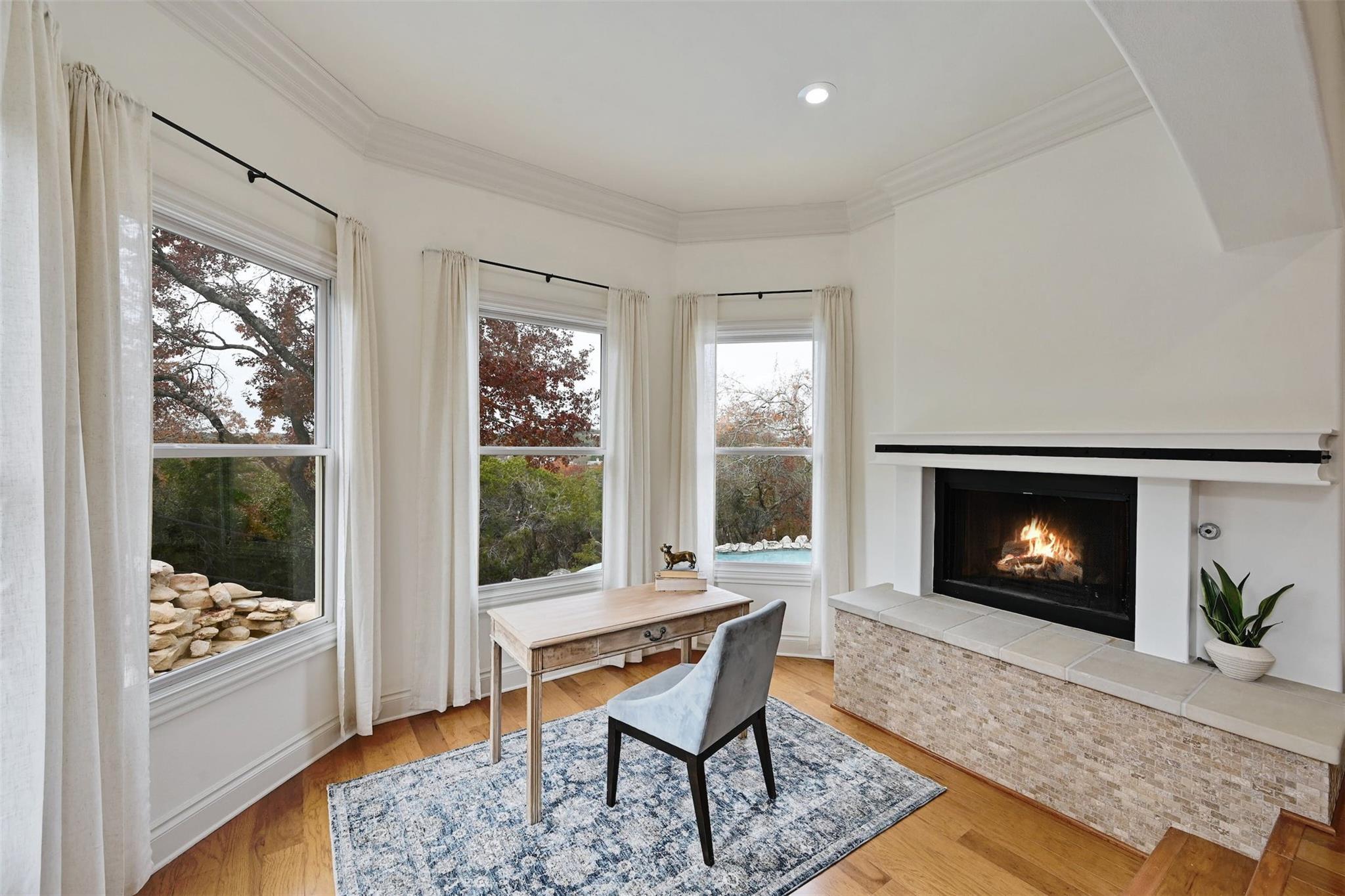 Don't miss this luxury estate with pool and incredible Hill Country views in the exclusive community of The Woods at Barton Creek! Thoughtfully designed open floor plan boasts 4 bedrooms, 4.5 bathrooms and 5,262 square feet. Chef’s kitchen with oversized granite island, two dishwashers, Bertazzoni 6 burner gas cooktop with integrated griddle, dual ovens, counter height seating and light-filled breakfast nook. Formal dining room is perfect for more upscale occasions with adjacent butler’s pantry. Plus hidden flex space next to formal dining room features fireplace and built-ins. Magnificent living room with soaring ceilings, panoramic Hill Country views and gas fireplace. Entertain in the formal living room. French doors open to a home office with custom cabinetry, gas fireplace and private entrance to the primary bedroom suite with two large walk-in closets, private entrance to backyard, fireplace and bay windows with views. Luxury continues in the primary bath with dual vanities, deep soaking tub and walk-in shower with custom tile work. Upstairs includes a second bedroom with Juliette balcony and ensuite full bath, third bedroom with an ensuite full bath, and spacious fourth bedroom offering unparalleled views and access to its own full bath. Bonus room makes entertaining a breeze with built-in cabinetry and expansive wet bar. Dedicated media room is an ideal place to enjoy the latest blockbuster. Backyard oasis features incredible patio overlooking infinity edge pool, spa, slide and waterfall. Community impresses with Barton Creek Country Club offering golf, tennis and social memberships; St. Gabriel's Catholic School; and St. Michael's Catholic Academy. Just 15 minutes to Downtown Austin and easy access Austin-Bergstrom International Airport!