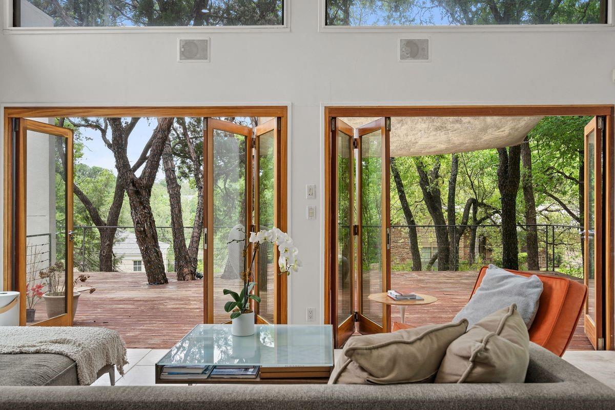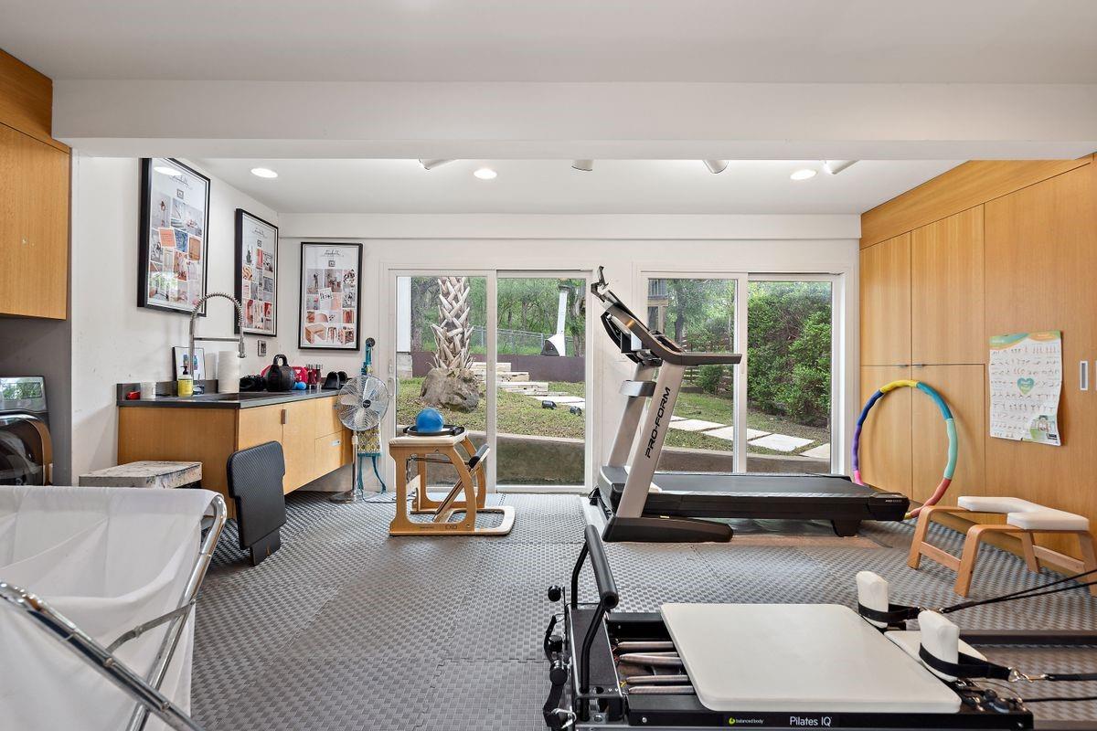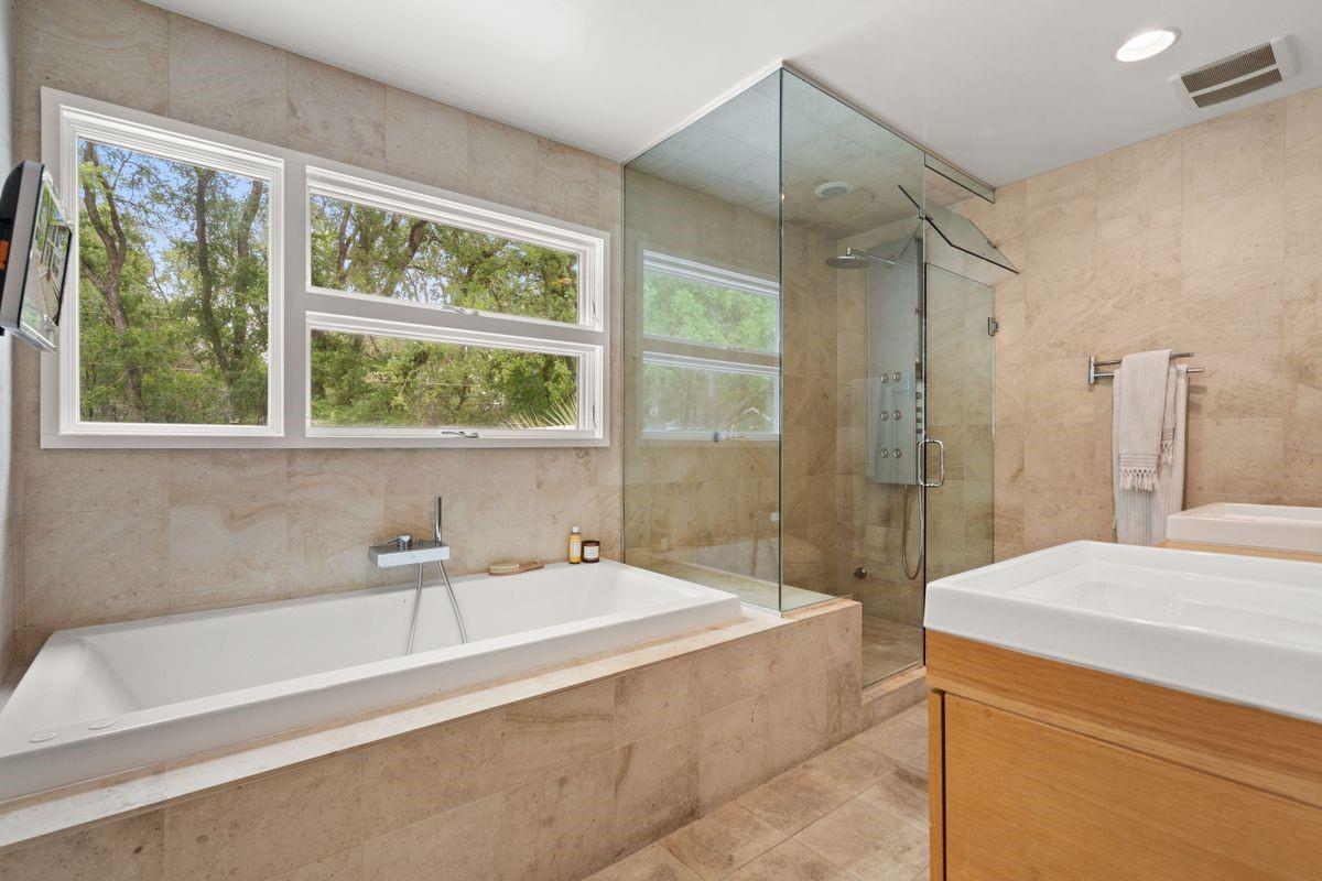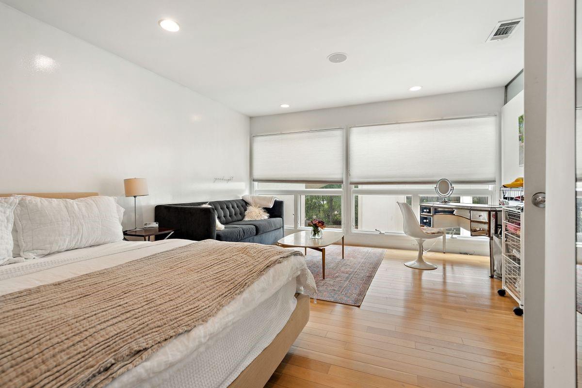 Private contemporary home in the heart of Tarrytown. As you enter the home you are greeted by natural light pouring into the main living area, high ceilings and giant windows. The kitchen has built in electric stove, ovens and microwaves including an espresso machine. The kithcen looks out into a dining/felx space with accordion doors that great a dining patio and views of the back yard. The lower level has 1 living are and 1 bedroom used as a gym with a washer and dryer. Easily can be converted into a separate bedroom. Several other rooms that can be used as office or at home gyms. The living space looks out into a central garden. The second level boast two en suite bedrooms as well as a linen closet. The upperlevel you will find the Primary bedroom as if in your own tree house with a spa like bath. Two separate closets and an office the bedroom a few steps away.