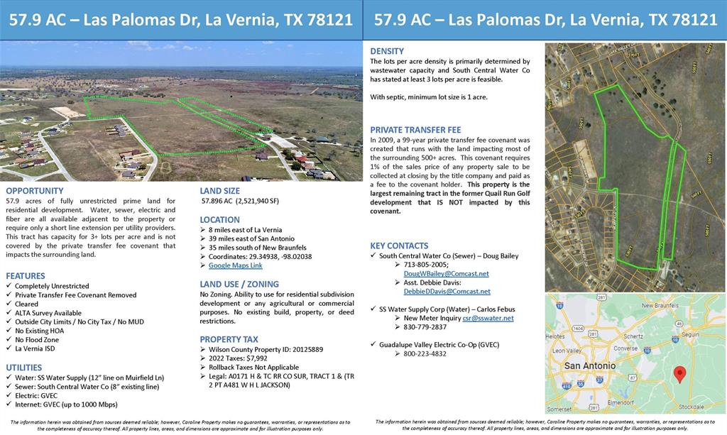 57.9 acres of completely unrestricted, prime residential development land. Water (SS Water Supply), sewer (South Central Water), electric (GVEC) and fiber (GVEC) are all available adjacent to the property or with a short line extension per utility providers. Density of 3+ lots per acre is feasible per sewer provider. ALTA survey available. Not subject to private transfer fee covenant. Coordinates 29.34938, -98.02038