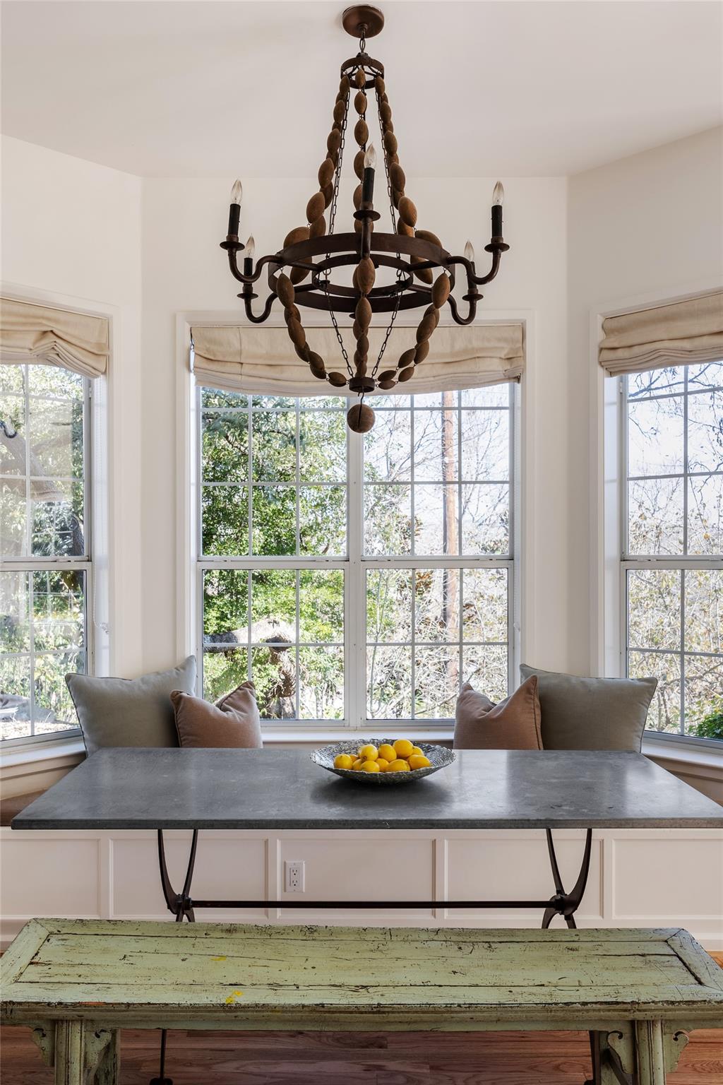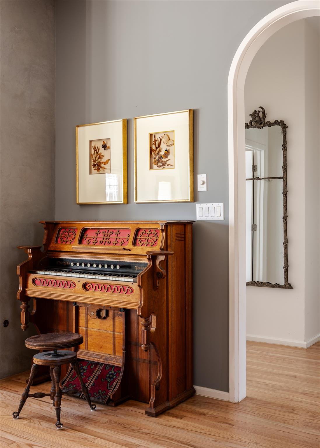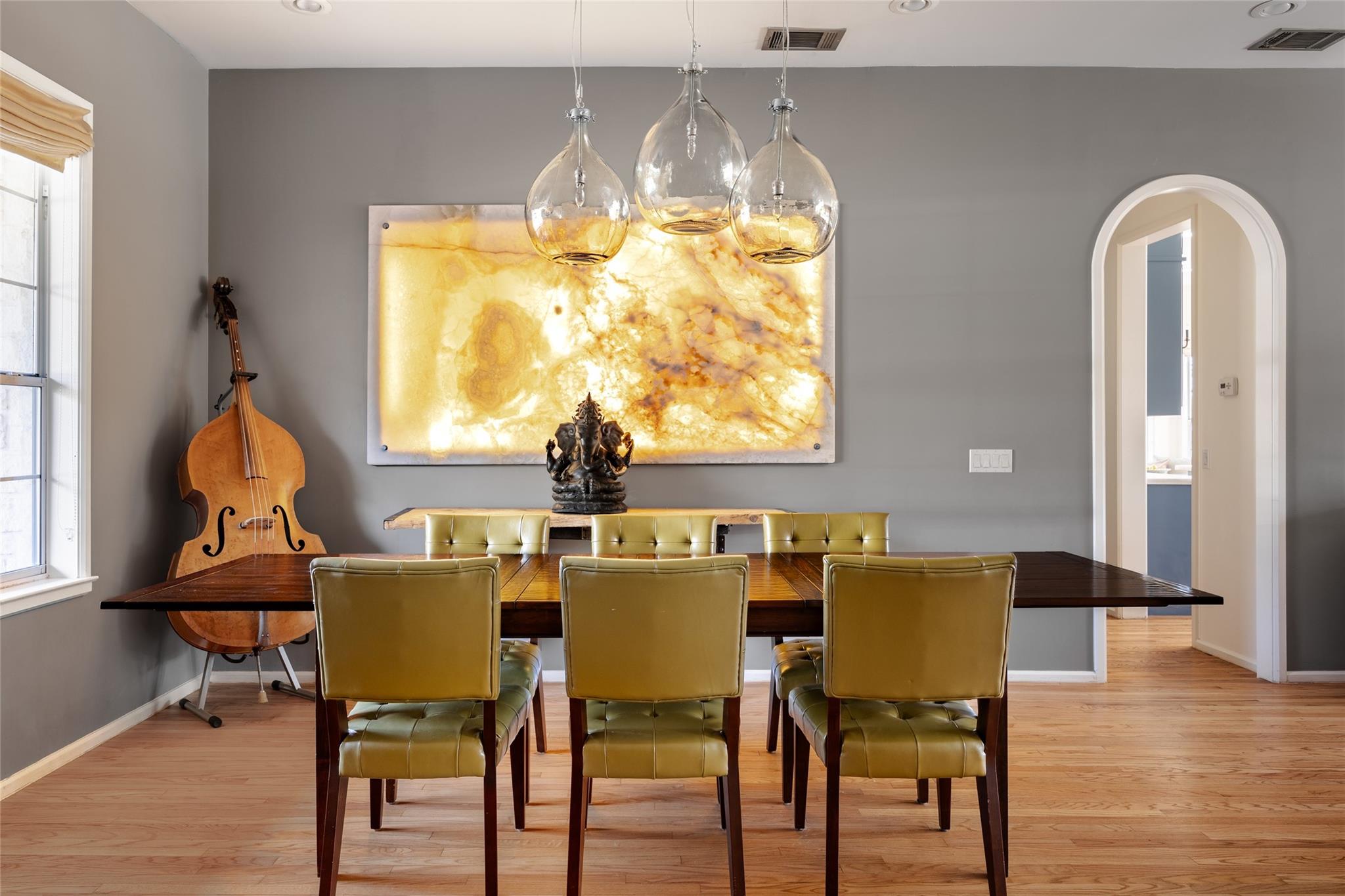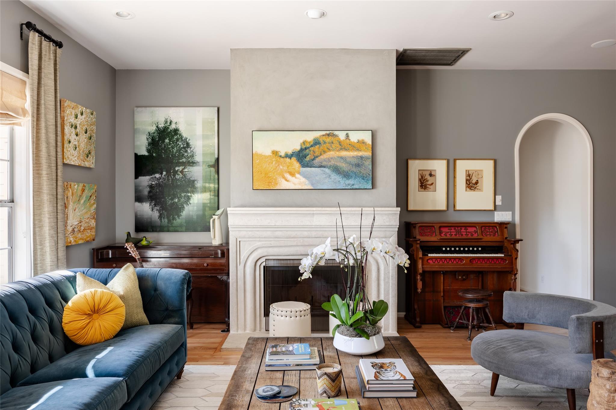 Elegance abounds with hardwood floors, soaring ceilings, graceful archways, and wide windows. The charming dining room leads to a spacious living room with a fireplace, perfect for gatherings.
