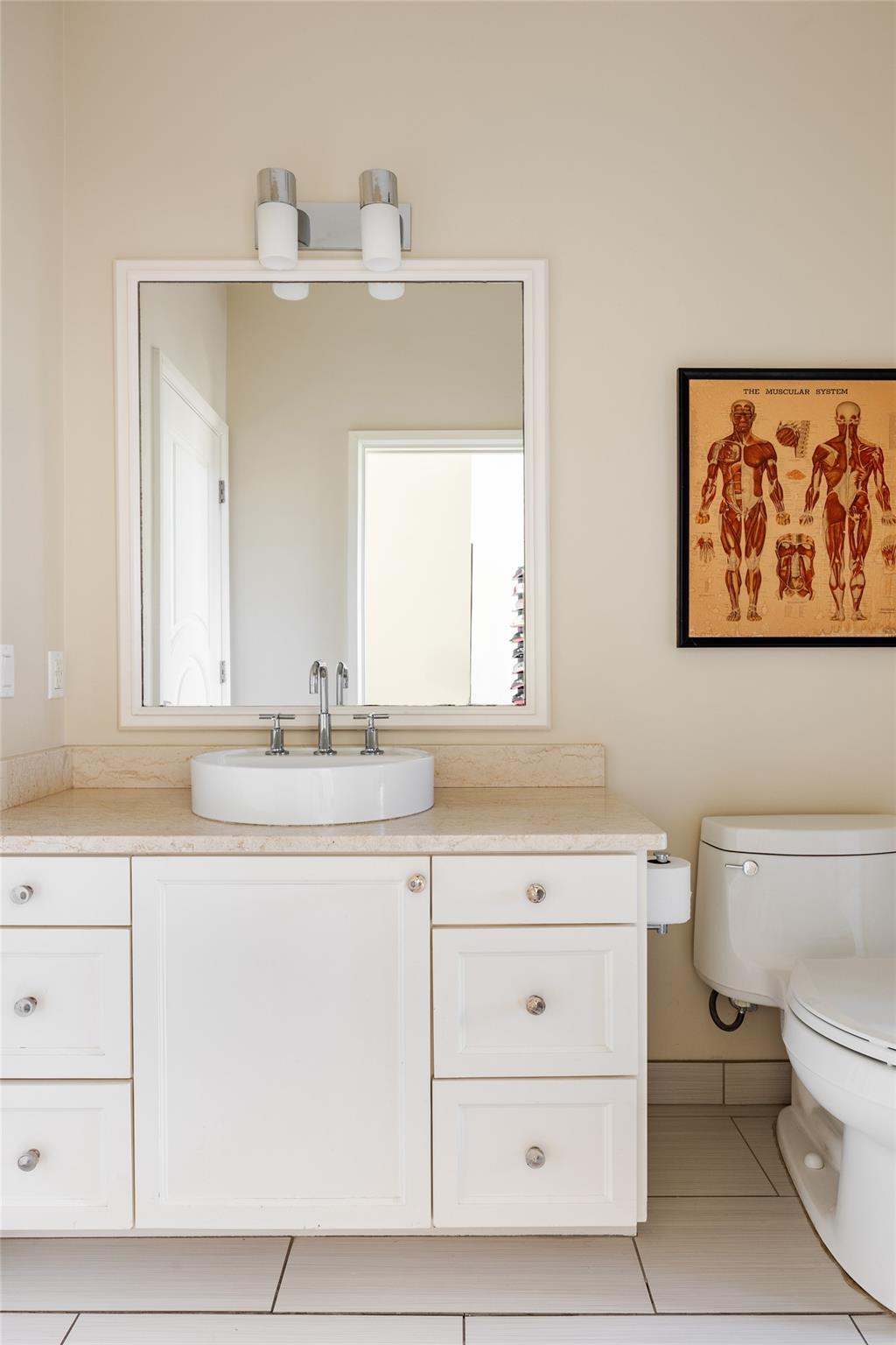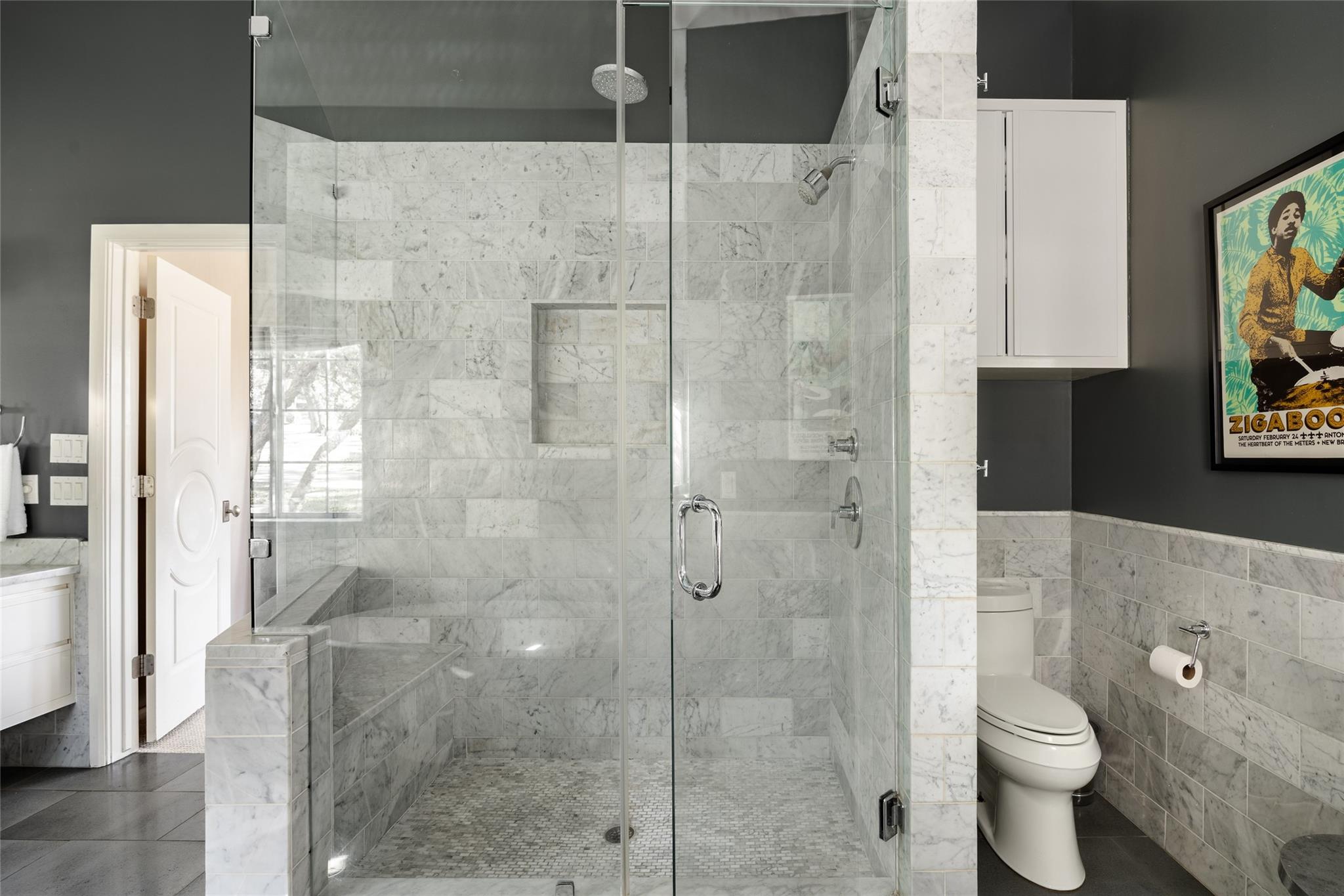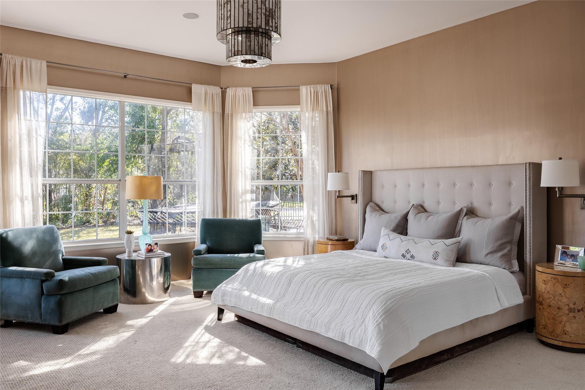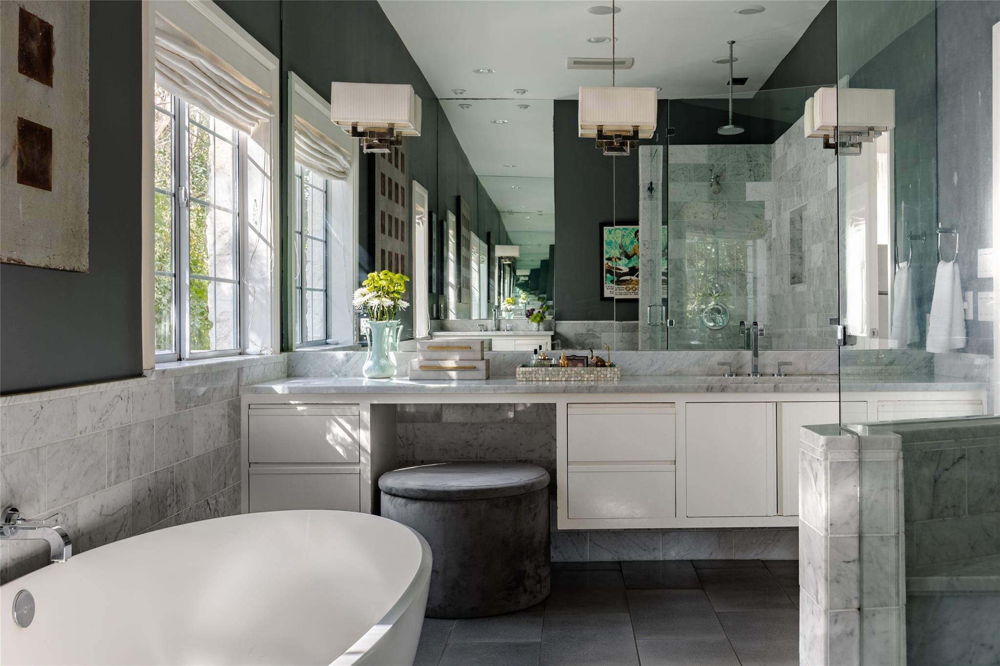 The private bedroom wing includes a main-floor owner's suite with bay windows and patio access. The marble en suite bathroom adds a touch of luxury.