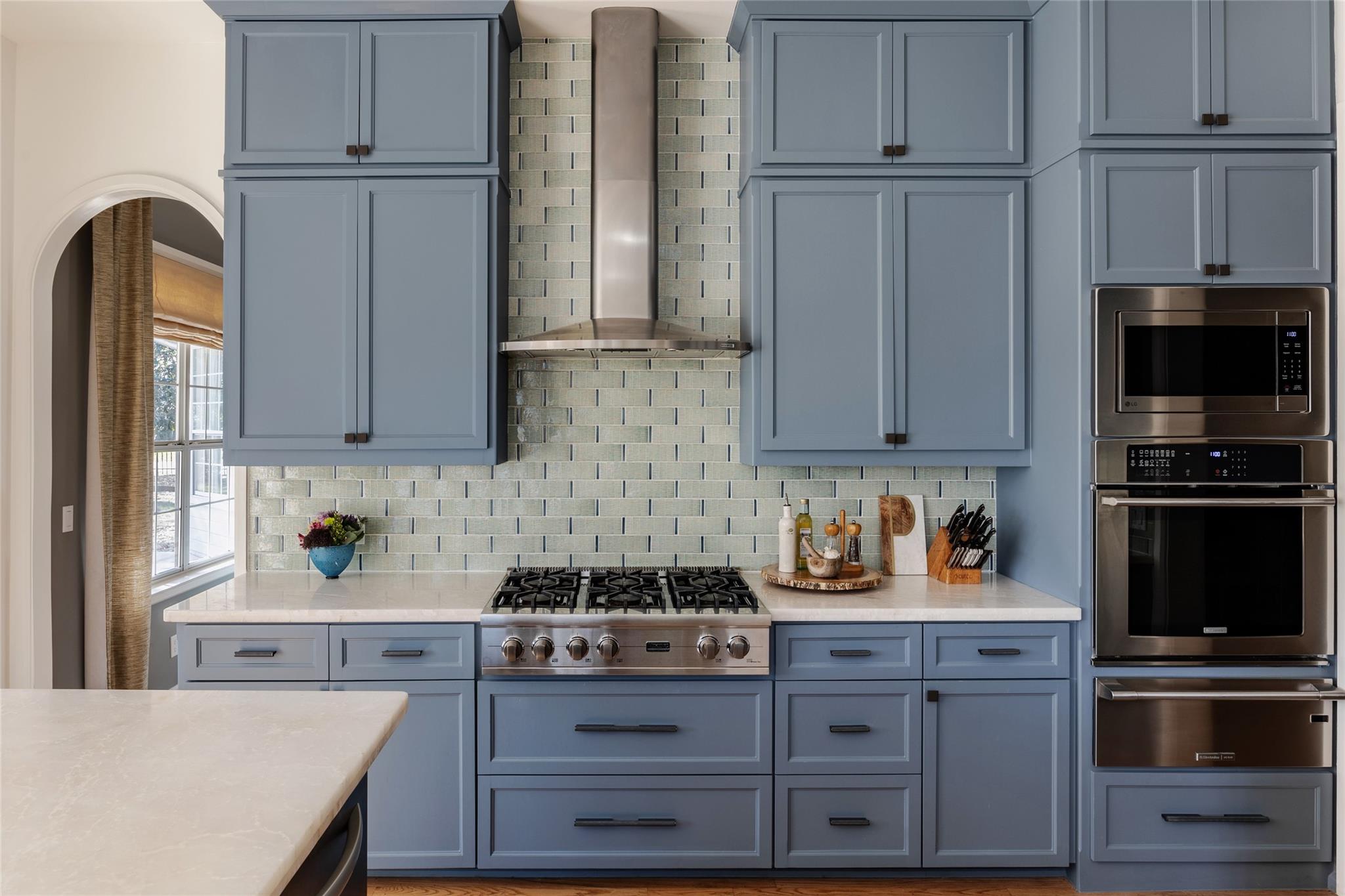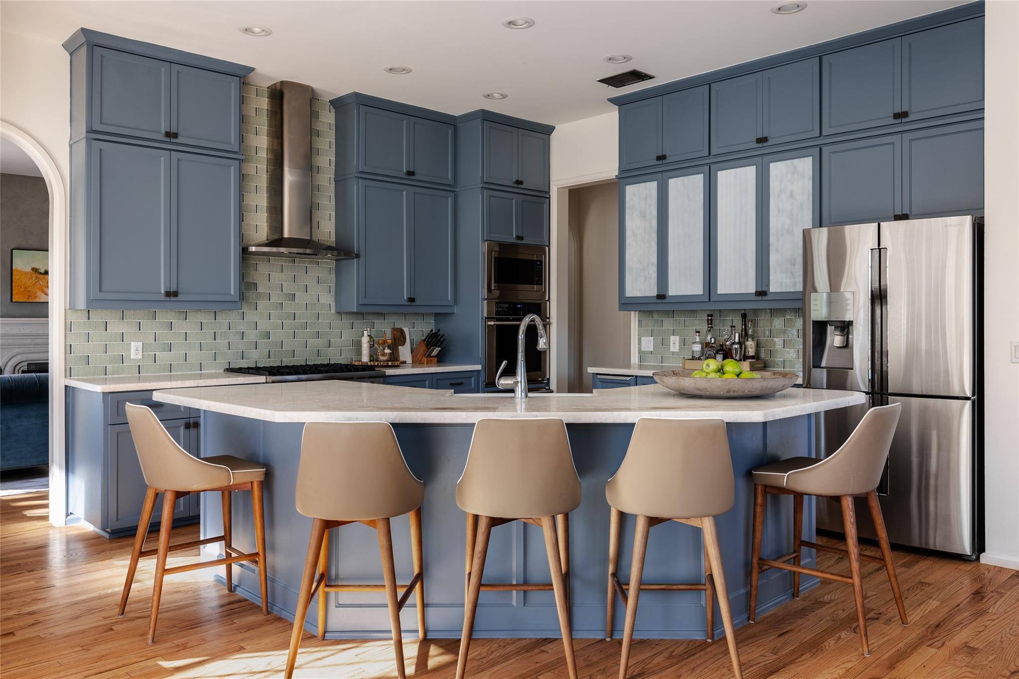 The gourmet eat-in kitchen boasts blue custom cabinetry, quartz countertops, and high-end appliances, including a Viking gas cooktop. The adjacent family room is ideal for relaxation and entertainment.