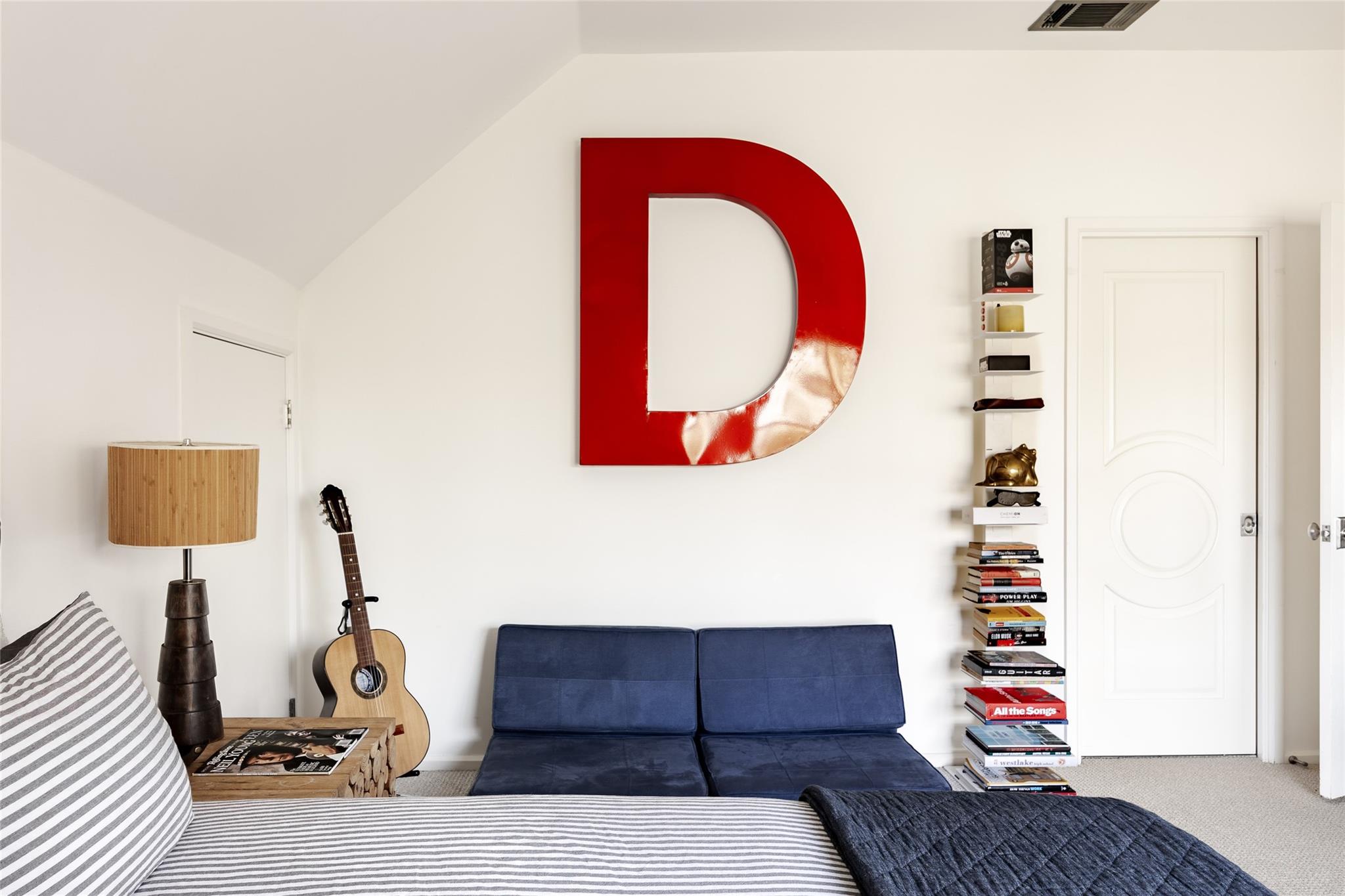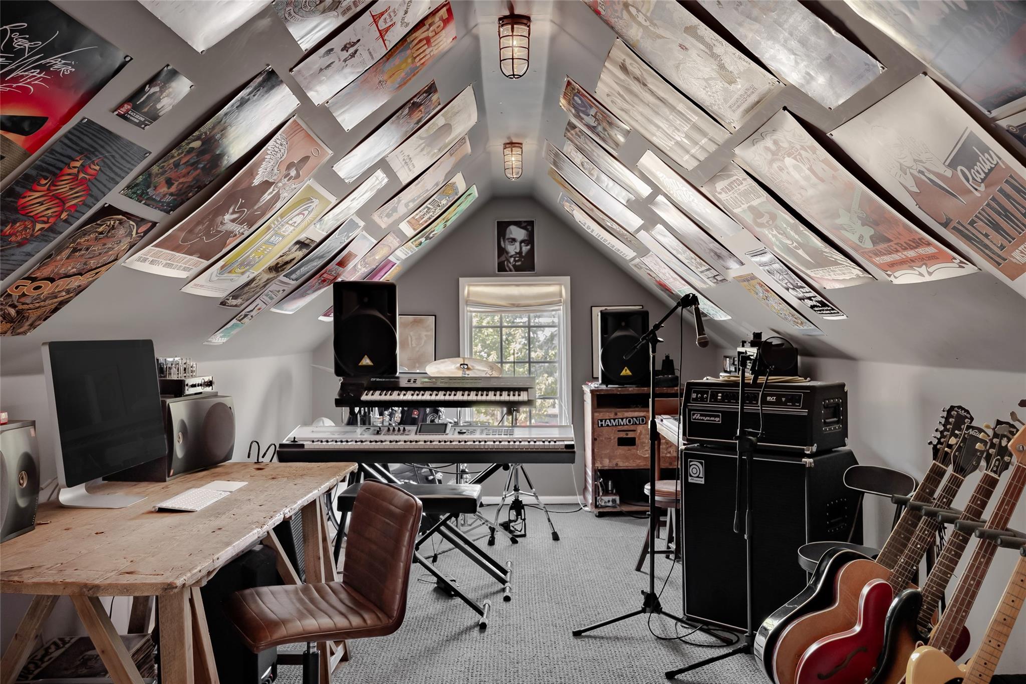 The upper level features two bedrooms, a Jack-and-Jill bathroom, and an expansive vaulted game room with media cabinets and a wet bar. The home also includes a wine closet, sound-attenuated music studio, and a versatile bonus room with built-in desks.