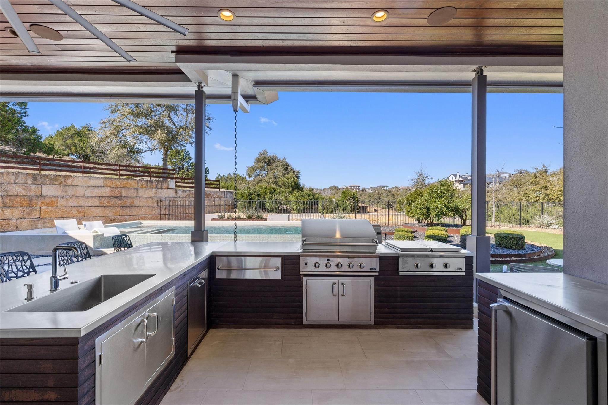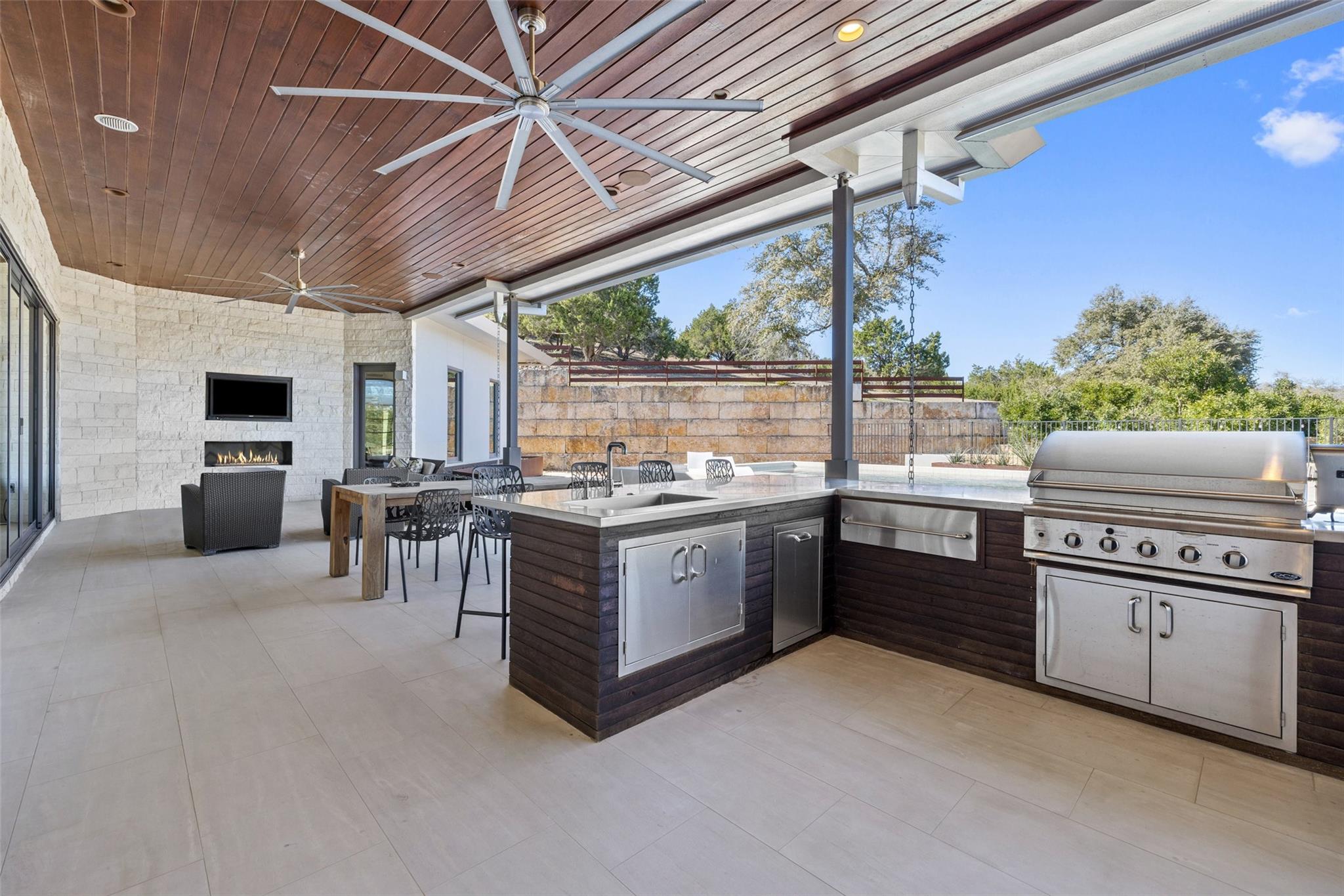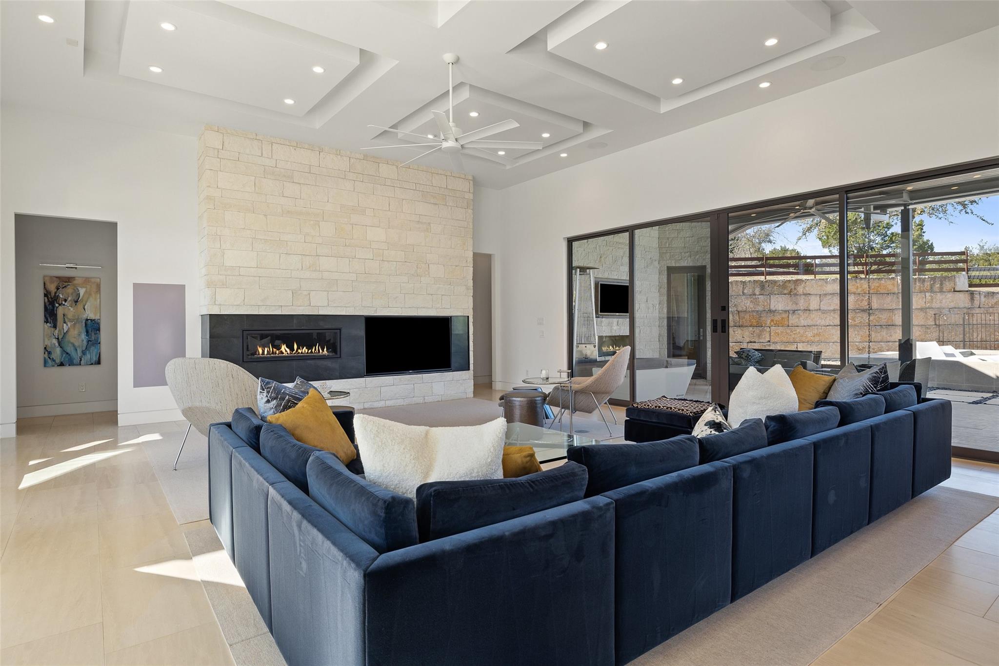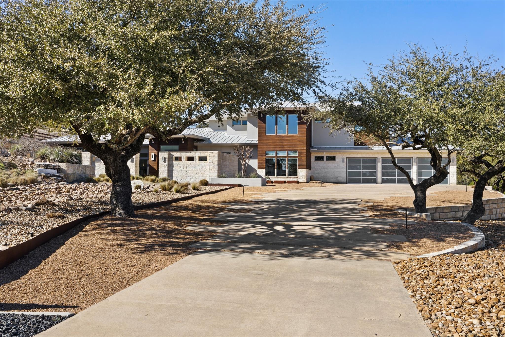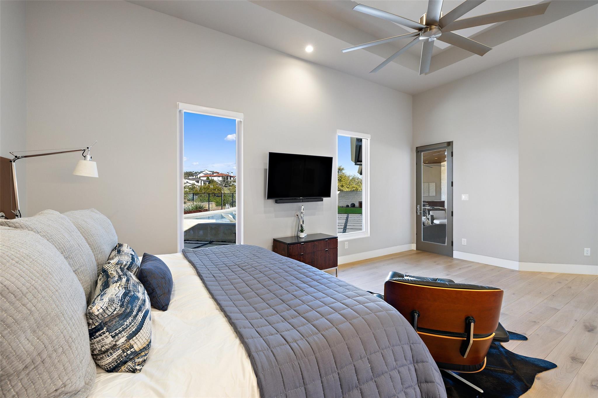 Welcome to 8300 Verde Mesa! Situated on a nearly 2-acre cul-de-sac lot with hill country views, this 4-bedroom, 6-bathroom home in Belvedere provides a serene retreat. This home lives like a single story with light-filled open spaces, every room has unique ceiling treatments, custom window shades, and surround sound speakers. The expansive primary bedroom opens to the back patio pool area and a private deck. The primary bathroom boasts a walk-through shower, soaking tub, and dual vanity with quartz countertops. The open kitchen is perfect for gatherings, featuring a quartz waterfall island and commercial-grade appliances. The secondary bedroom with an ensuite bath and also has access to the front courtyard. Additionally on the first floor, there is a dedicated study with bookshelves, a two washer/two dryer laundry room, and a craft room with ample storage enhance the functionality of the home. Upstairs, the fitness room has panoramic views, a media room with a kitchenette, and two spacious bedrooms with ensuite bathrooms. The outside patio is accessed through double sliding glass doors for seamless indoor/outdoor entertaining. revealing a covered patio, outdoor living area with a fireplace, outdoor dining, and kitchen. After a dip in the pool/spa, enjoy the convenience of an outdoor shower. The community amenities includes 80 acres of trails, a lazy river, splash pad, fishing pond, natural preserve, sport court, and an amenity center where social events are hosted. Furniture is negotiable.