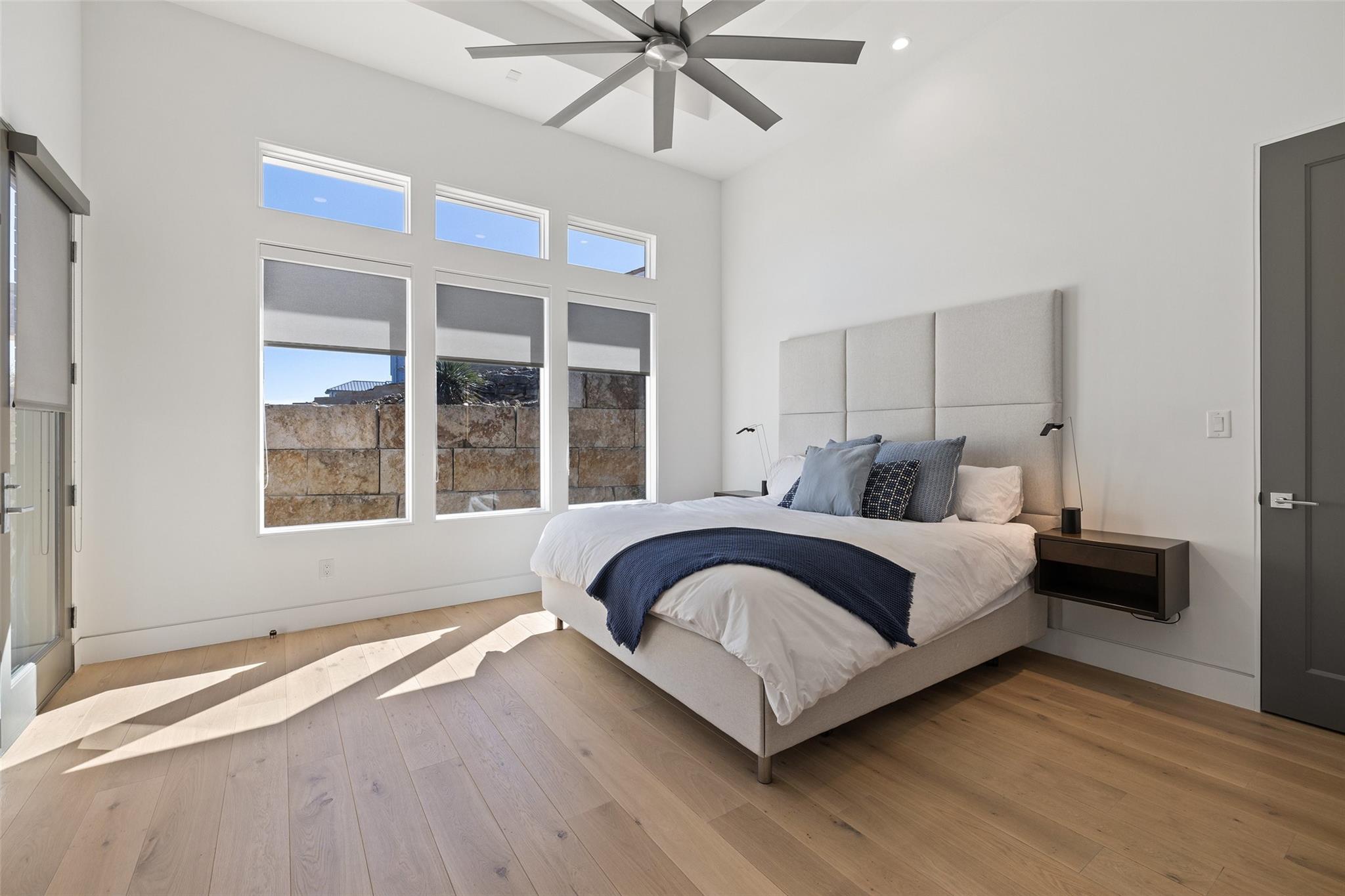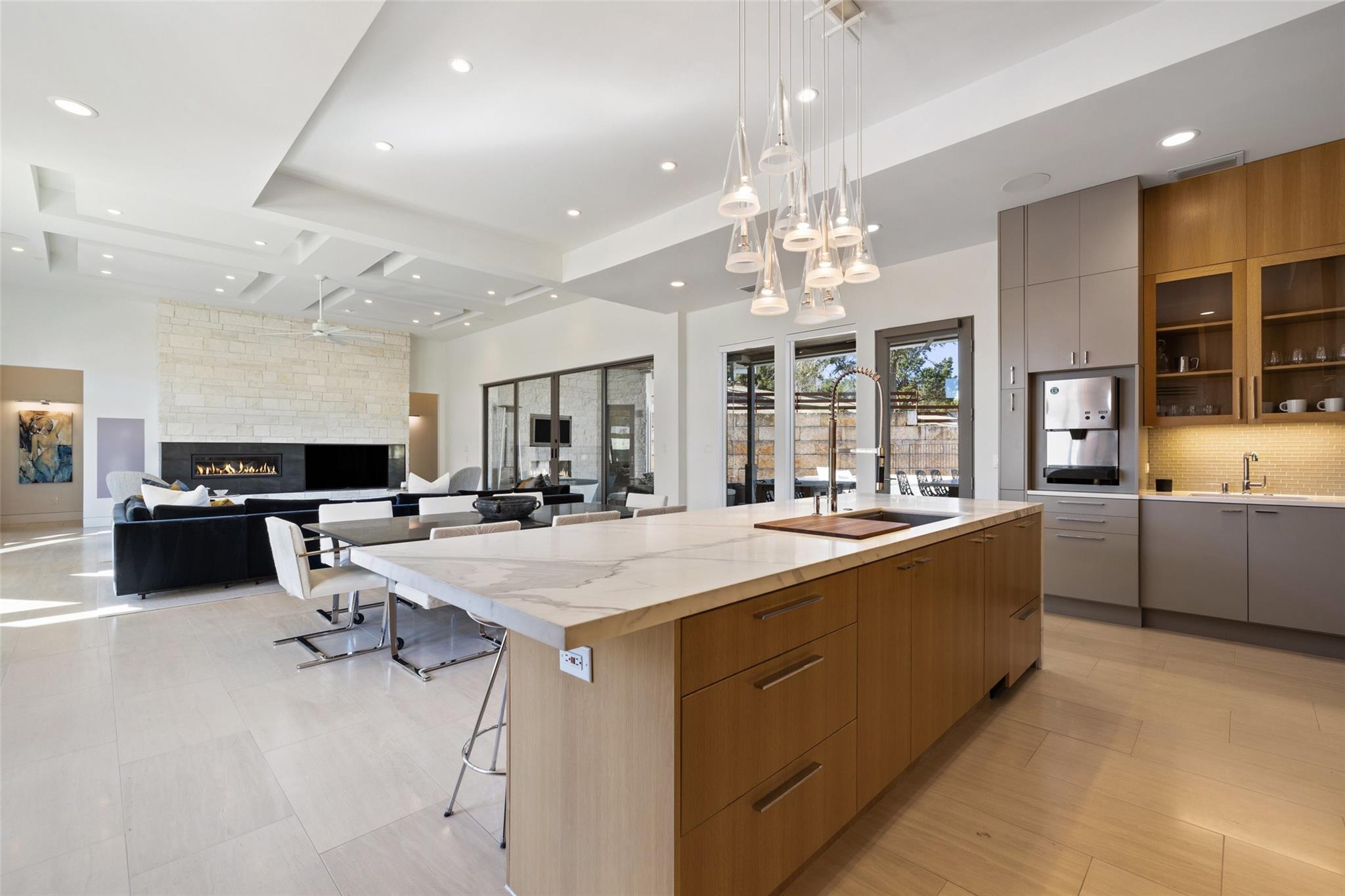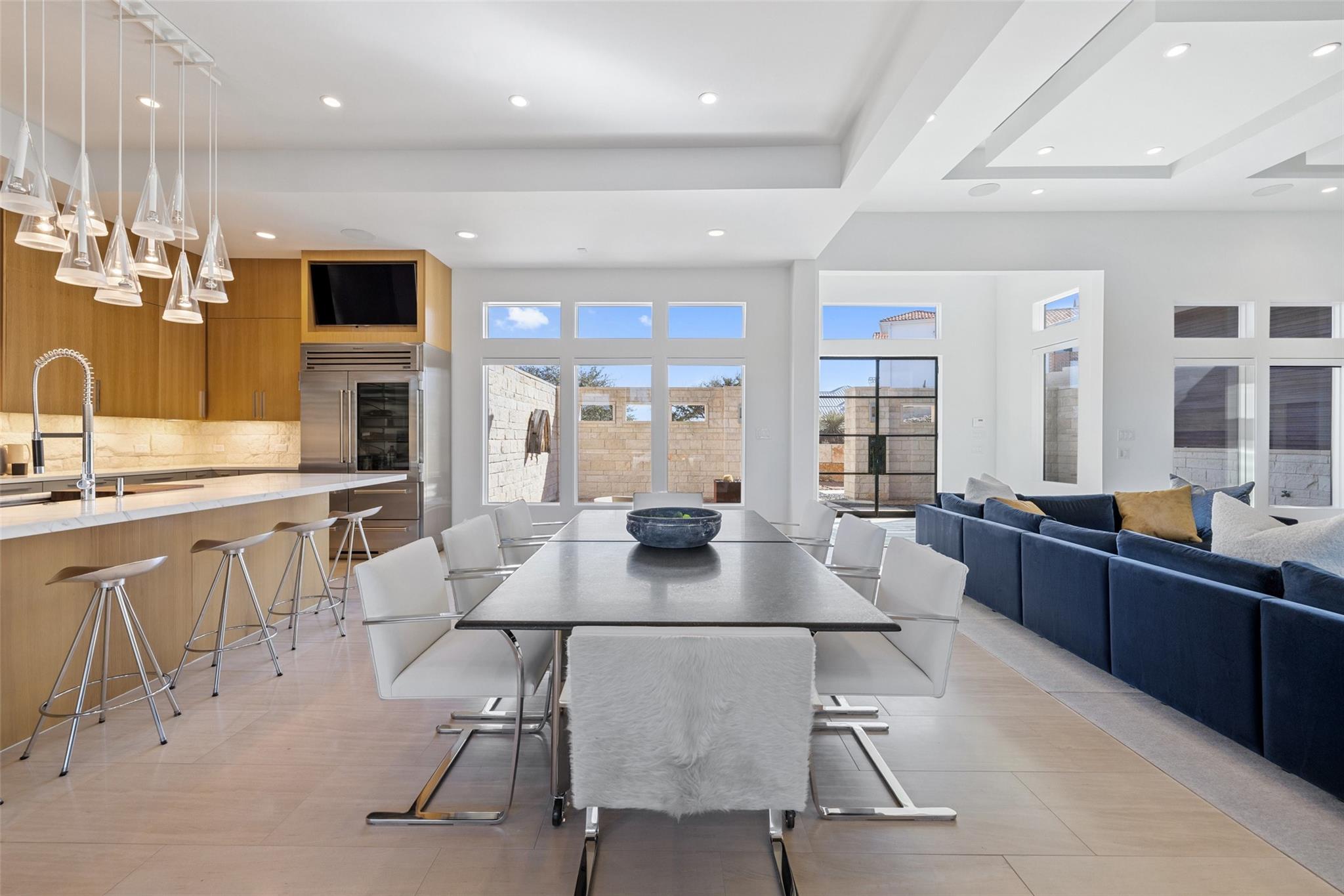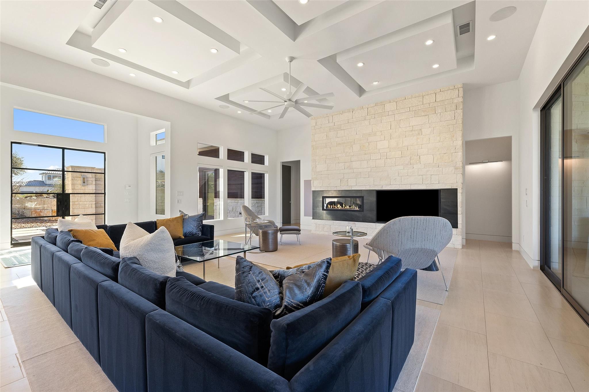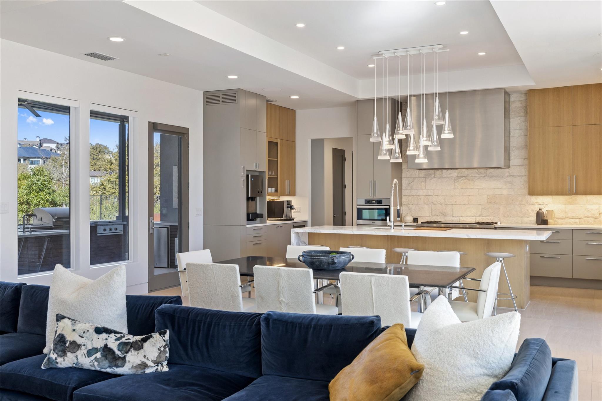 Welcome to 8300 Verde Mesa! Situated on a nearly 2-acre cul-de-sac lot with hill country views, this 4-bedroom, 6-bathroom home in Belvedere provides a serene retreat. This home lives like a single story with light-filled open spaces, every room has unique ceiling treatments, custom window shades, and surround sound speakers. The expansive primary bedroom opens to the back patio pool area and a private deck. The primary bathroom boasts a walk-through shower, soaking tub, and dual vanity with quartz countertops. The open kitchen is perfect for gatherings, featuring a quartz waterfall island and commercial-grade appliances. The secondary bedroom with an ensuite bath and also has access to the front courtyard. Additionally on the first floor, there is a dedicated study with bookshelves, a two washer/two dryer laundry room, and a craft room with ample storage enhance the functionality of the home. Upstairs, the fitness room has panoramic views, a media room with a kitchenette, and two spacious bedrooms with ensuite bathrooms. The outside patio is accessed through double sliding glass doors for seamless indoor/outdoor entertaining. revealing a covered patio, outdoor living area with a fireplace, outdoor dining, and kitchen. After a dip in the pool/spa, enjoy the convenience of an outdoor shower. The community amenities includes 80 acres of trails, a lazy river, splash pad, fishing pond, natural preserve, sport court, and an amenity center where social events are hosted. Furniture is negotiable.