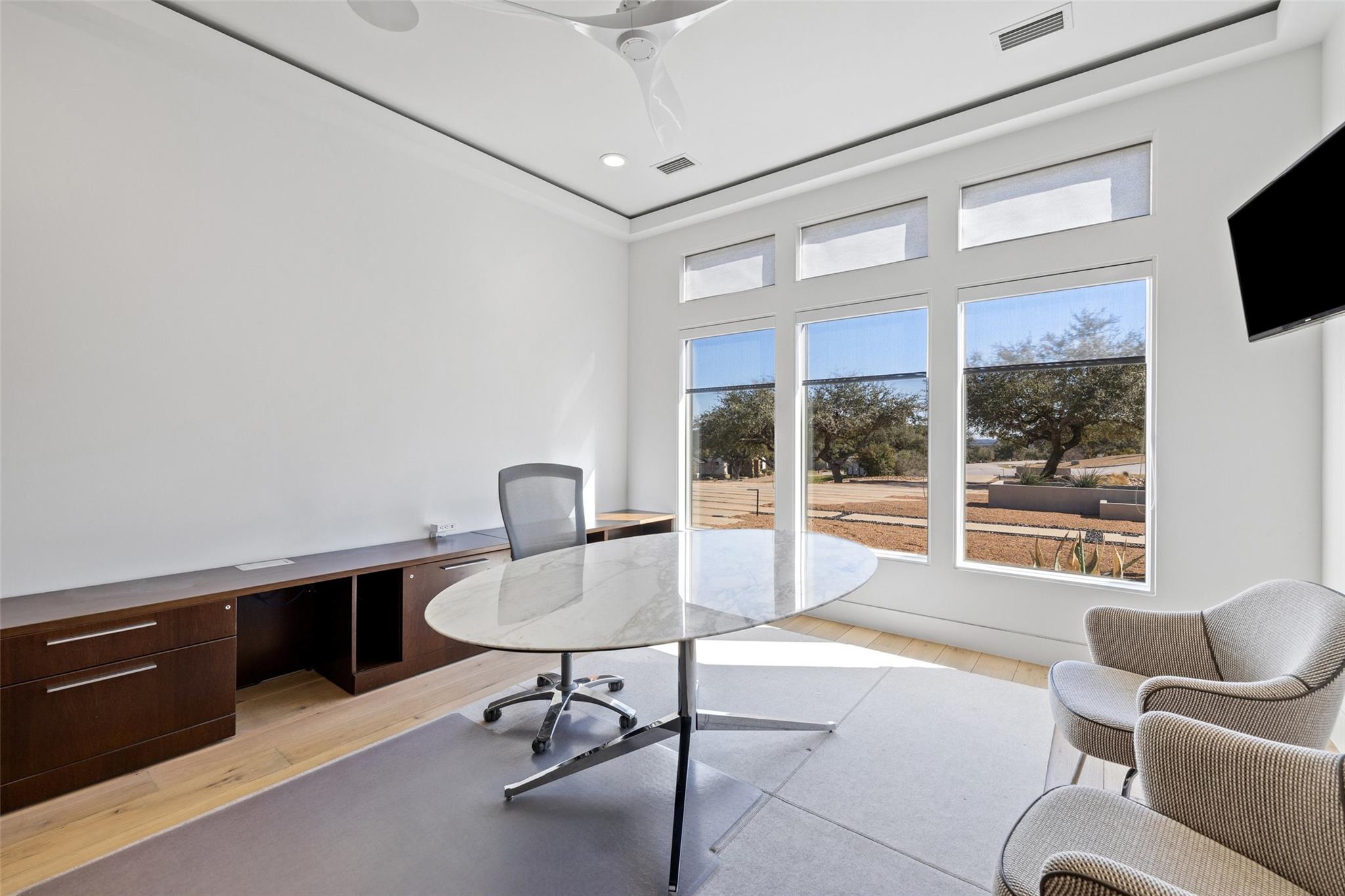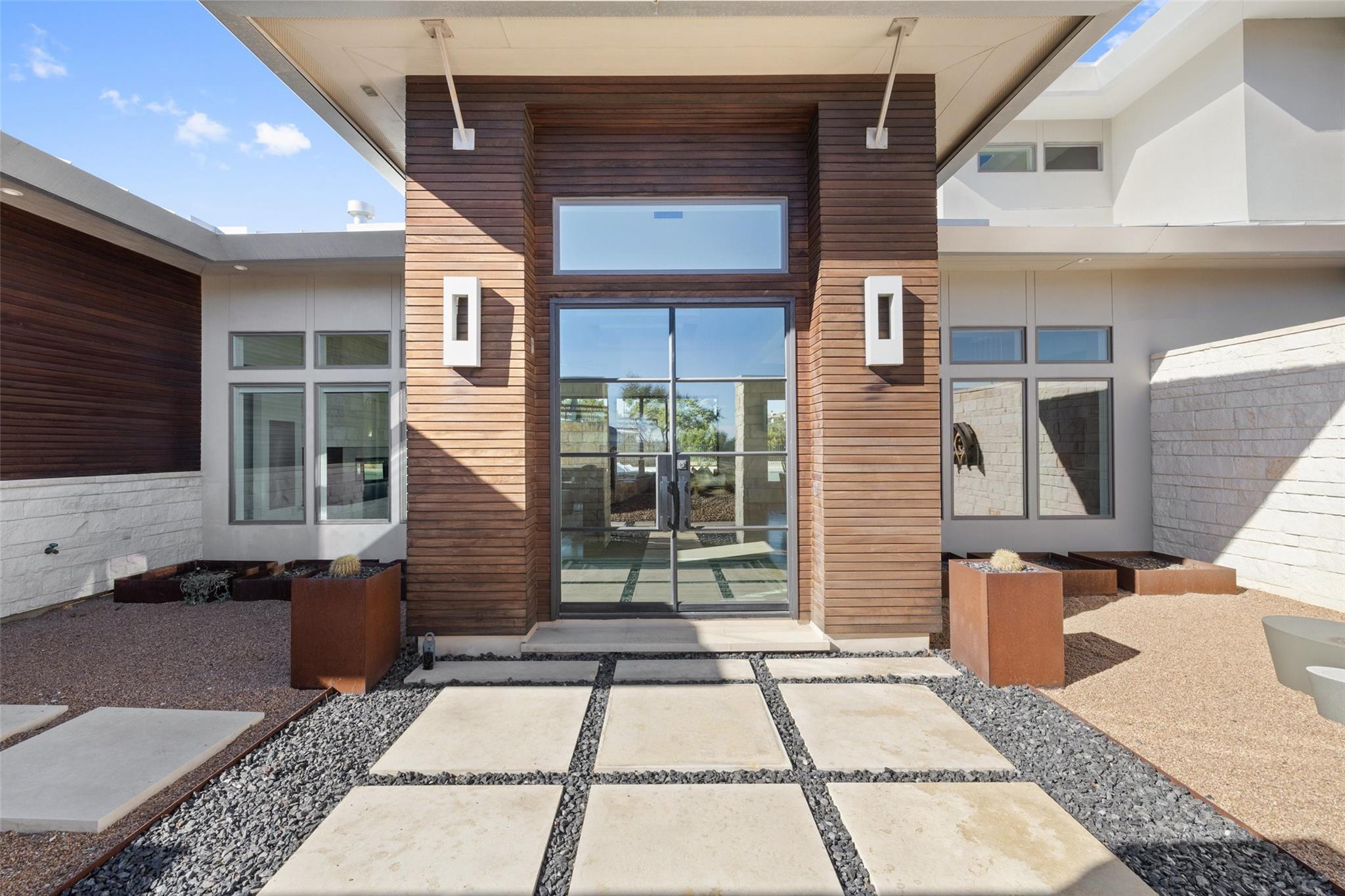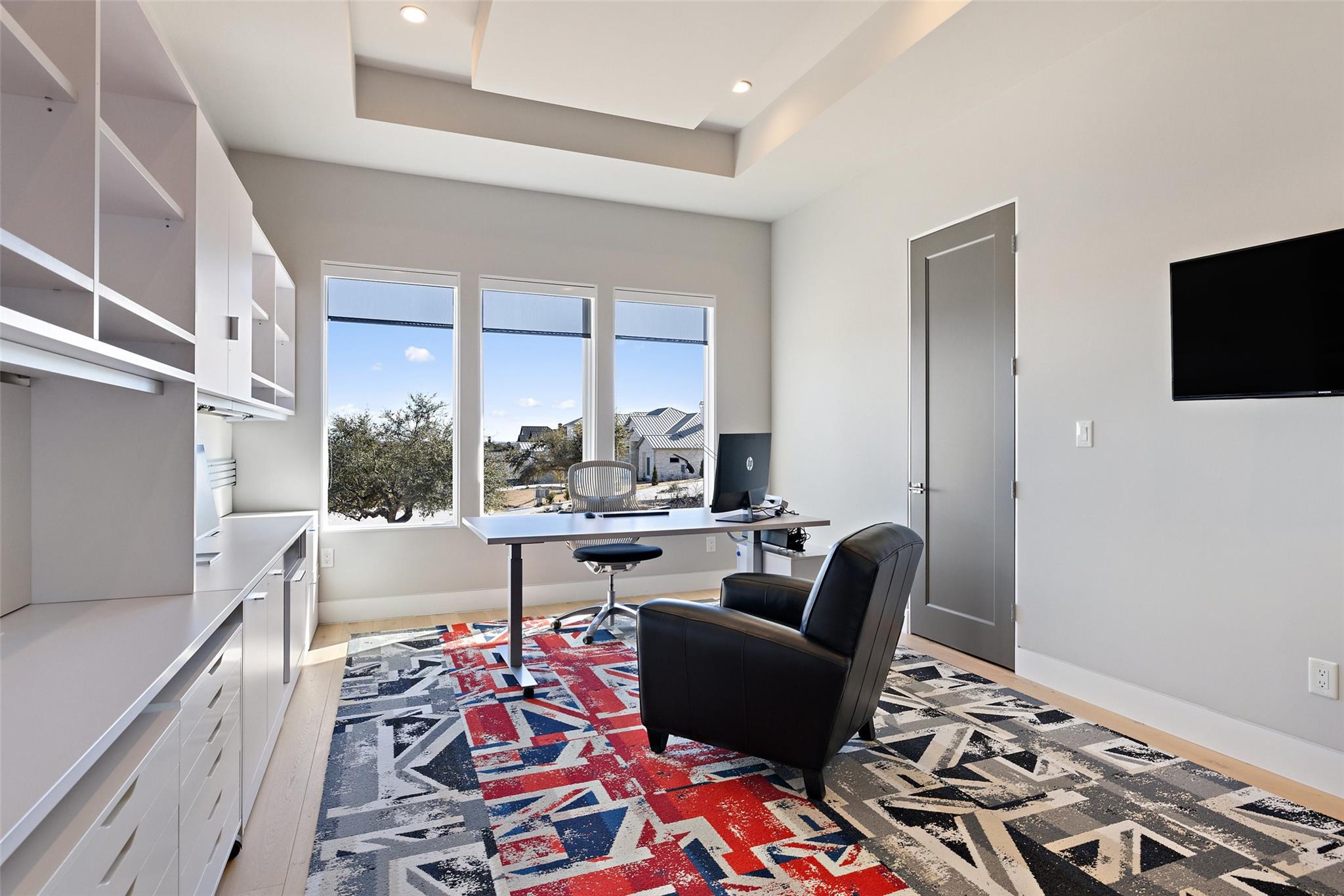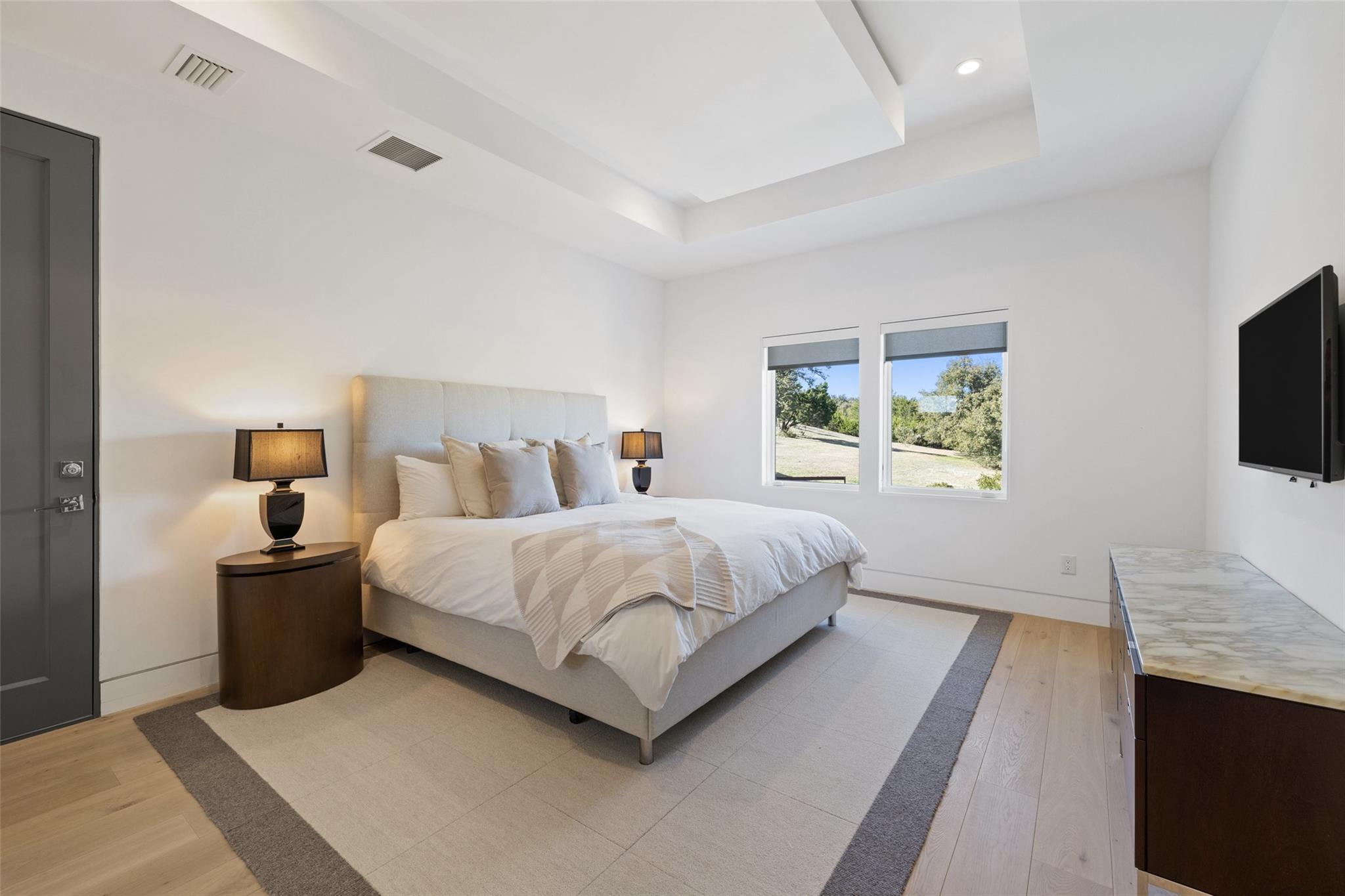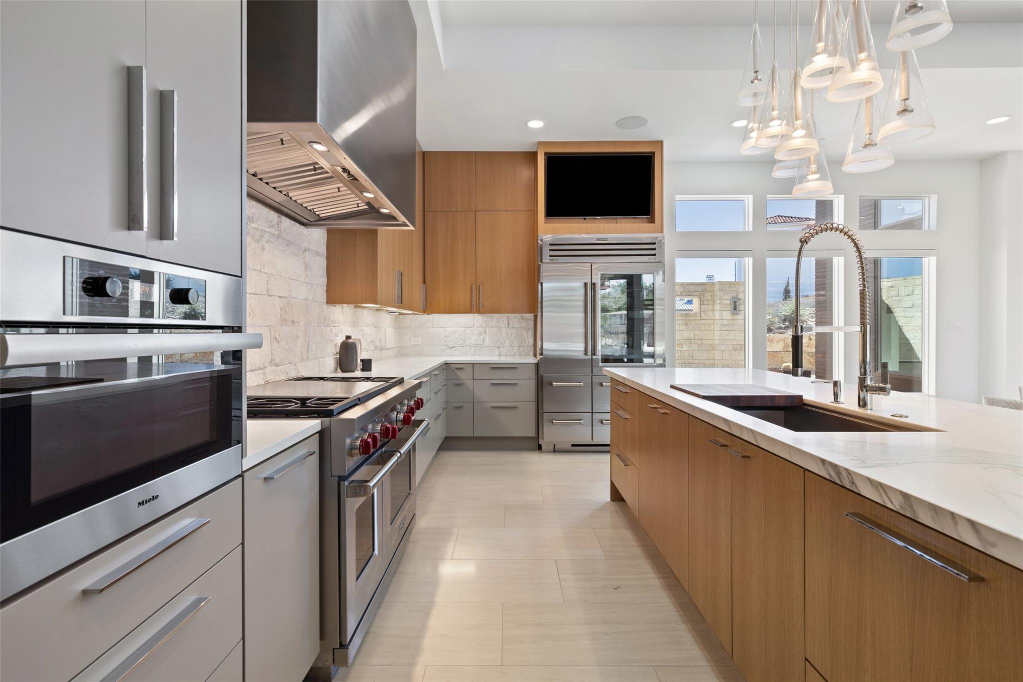 Welcome to 8300 Verde Mesa! Situated on a nearly 2-acre cul-de-sac lot with hill country views, this 4-bedroom, 6-bathroom home in Belvedere provides a serene retreat. This home lives like a single story with light-filled open spaces, every room has unique ceiling treatments, custom window shades, and surround sound speakers. The expansive primary bedroom opens to the back patio pool area and a private deck. The primary bathroom boasts a walk-through shower, soaking tub, and dual vanity with quartz countertops. The open kitchen is perfect for gatherings, featuring a quartz waterfall island and commercial-grade appliances. The secondary bedroom with an ensuite bath and also has access to the front courtyard. Additionally on the first floor, there is a dedicated study with bookshelves, a two washer/two dryer laundry room, and a craft room with ample storage enhance the functionality of the home. Upstairs, the fitness room has panoramic views, a media room with a kitchenette, and two spacious bedrooms with ensuite bathrooms. The outside patio is accessed through double sliding glass doors for seamless indoor/outdoor entertaining. revealing a covered patio, outdoor living area with a fireplace, outdoor dining, and kitchen. After a dip in the pool/spa, enjoy the convenience of an outdoor shower. The community amenities includes 80 acres of trails, a lazy river, splash pad, fishing pond, natural preserve, sport court, and an amenity center where social events are hosted. Furniture is negotiable.