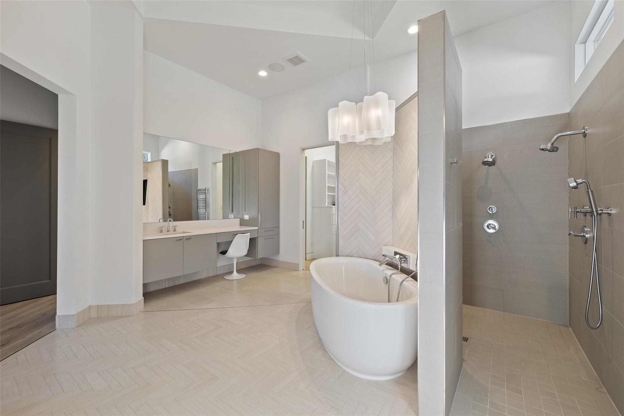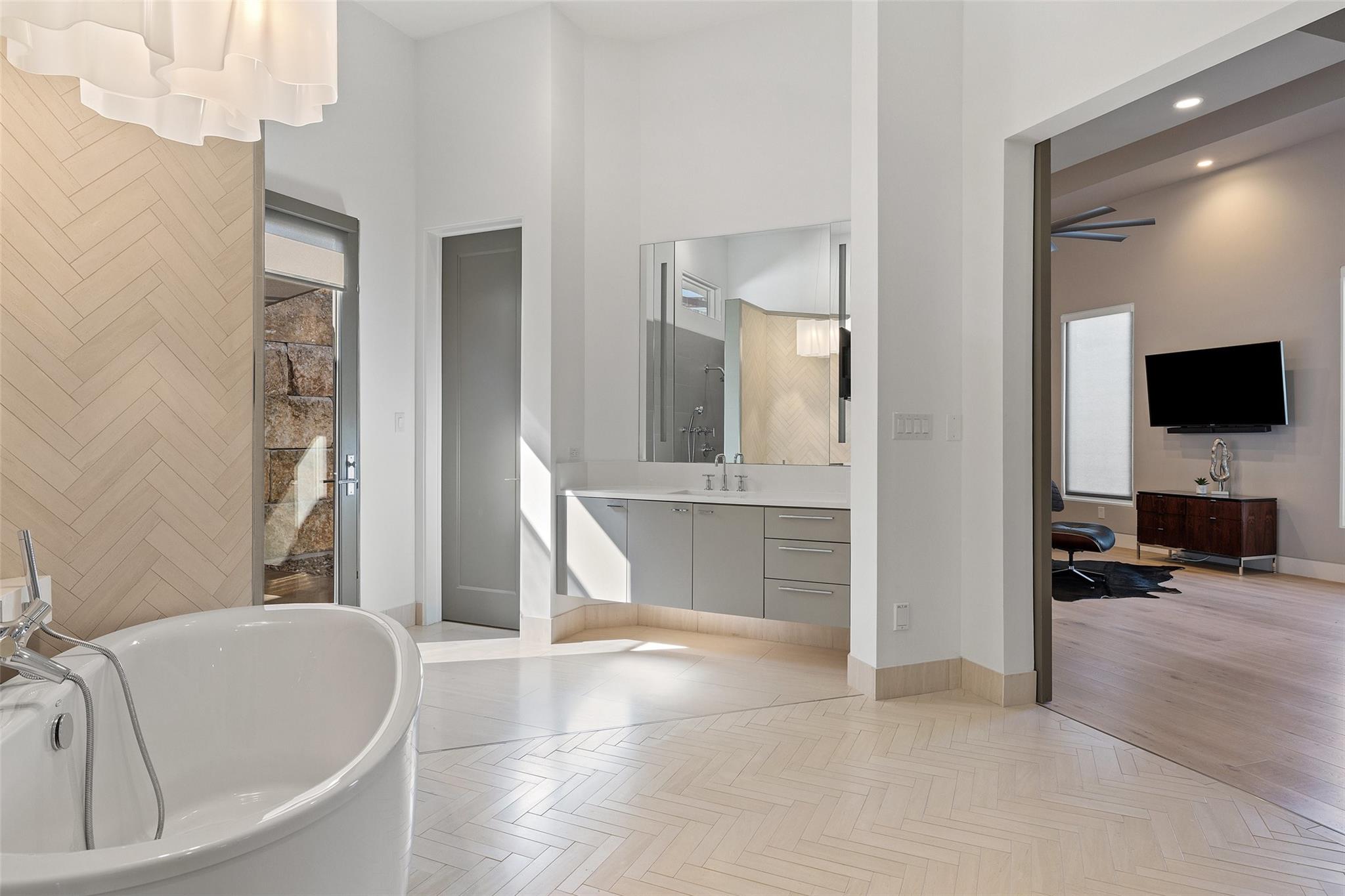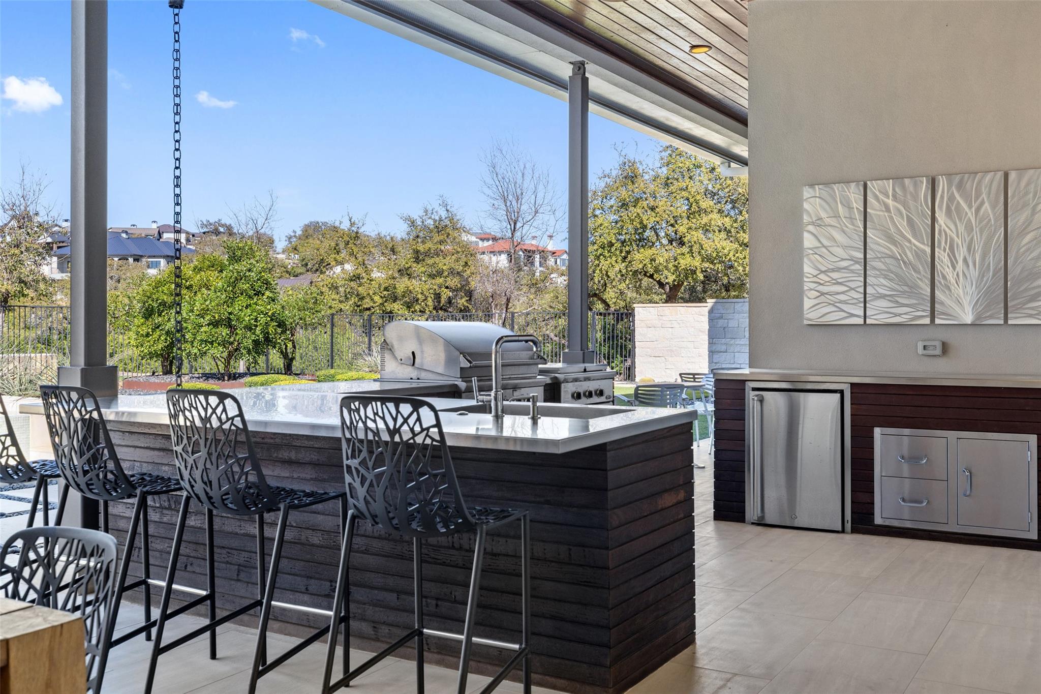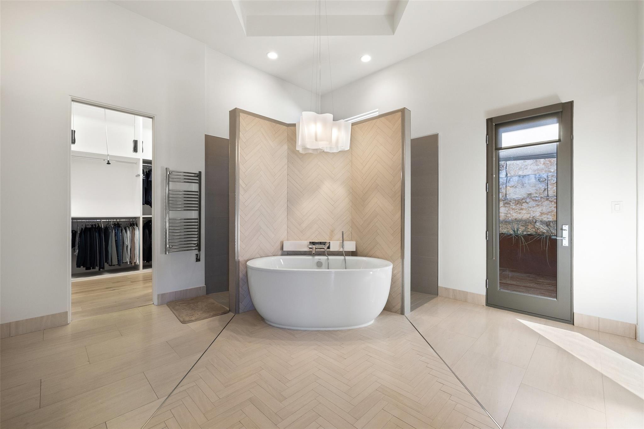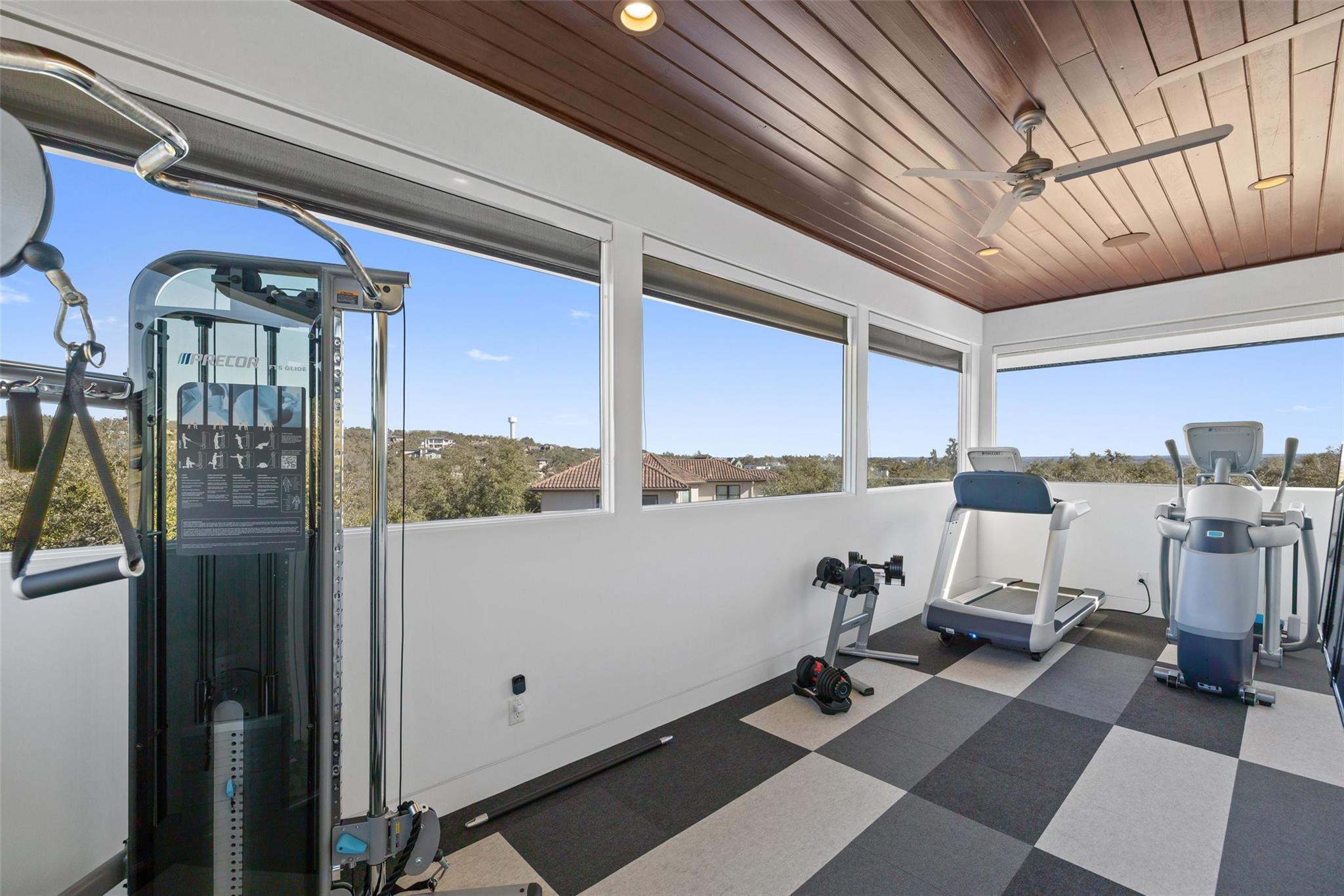 Welcome to 8300 Verde Mesa! Situated on a nearly 2-acre cul-de-sac lot with hill country views, this 4-bedroom, 6-bathroom home in Belvedere provides a serene retreat. This home lives like a single story with light-filled open spaces, every room has unique ceiling treatments, custom window shades, and surround sound speakers. The expansive primary bedroom opens to the back patio pool area and a private deck. The primary bathroom boasts a walk-through shower, soaking tub, and dual vanity with quartz countertops. The open kitchen is perfect for gatherings, featuring a quartz waterfall island and commercial-grade appliances. The secondary bedroom with an ensuite bath and also has access to the front courtyard. Additionally on the first floor, there is a dedicated study with bookshelves, a two washer/two dryer laundry room, and a craft room with ample storage enhance the functionality of the home. Upstairs, the fitness room has panoramic views, a media room with a kitchenette, and two spacious bedrooms with ensuite bathrooms. The outside patio is accessed through double sliding glass doors for seamless indoor/outdoor entertaining. revealing a covered patio, outdoor living area with a fireplace, outdoor dining, and kitchen. After a dip in the pool/spa, enjoy the convenience of an outdoor shower. The community amenities includes 80 acres of trails, a lazy river, splash pad, fishing pond, natural preserve, sport court, and an amenity center where social events are hosted. Furniture is negotiable.