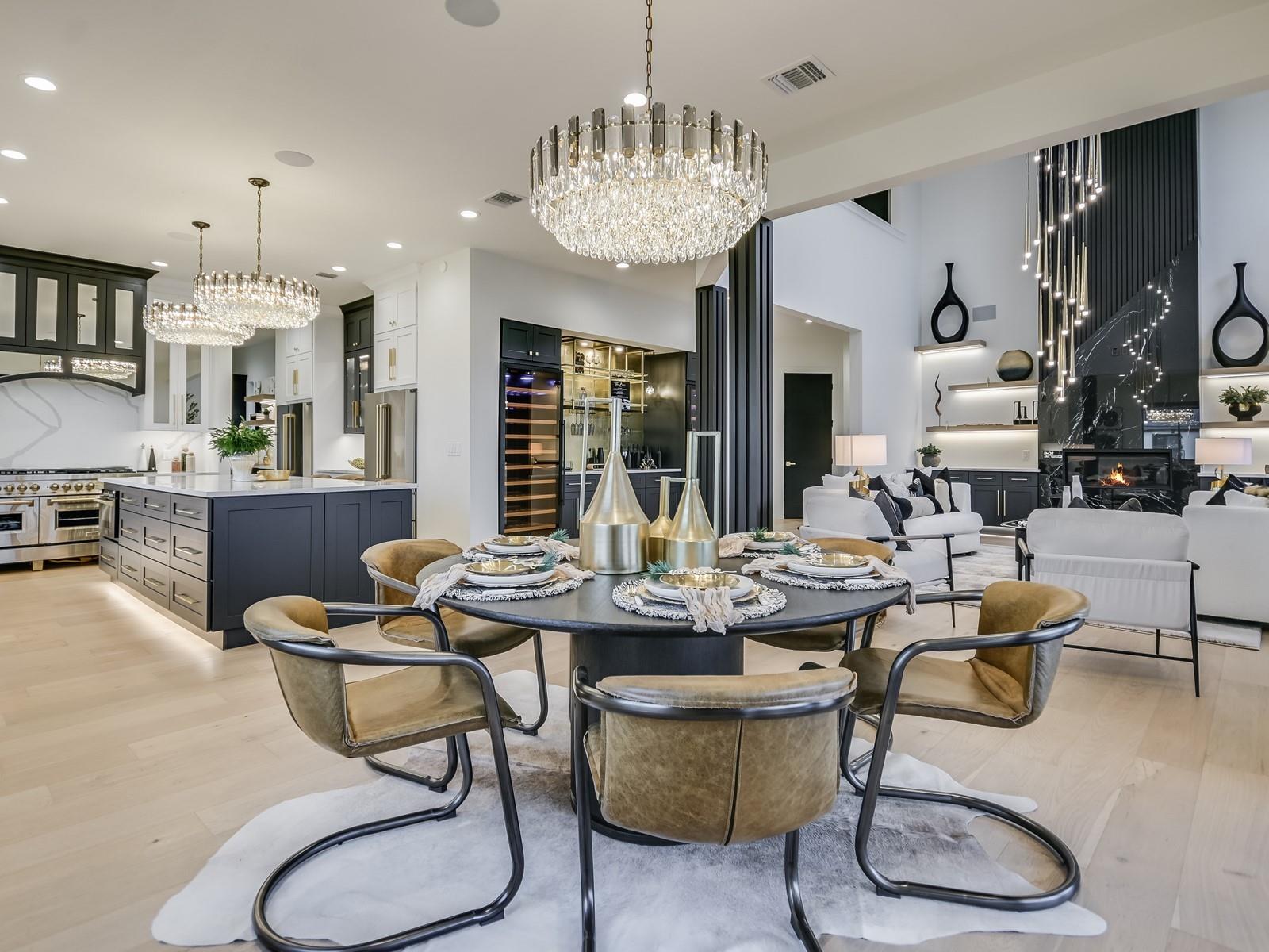 | Interior Features | Two Primary Baths, Two Primary Suties, Bar, Breakfast Bar, Built-in Features, Ceiling Fan(s), Beamed Ceilings, High Ceilings, Tray Ceiling(s), Central Vacuum, Chandelier, Quartz Counters, Double Vanity, Dry Bar, Electric Dryer Hookup, Eat-in Kitchen, Entrance Foyer, French Doors, Interior Steps, Kitchen Island, Multiple Dining Areas, Natural Woodwork, Open Floorplan, Pantry, Primary Bedroom on Main, Recessed Lighting, Smart Thermostat, Soaking Tub, Sound System, Storage, Two Primary Closets, Walk-In Closet(s), Washer Hookup, Wet Bar | |