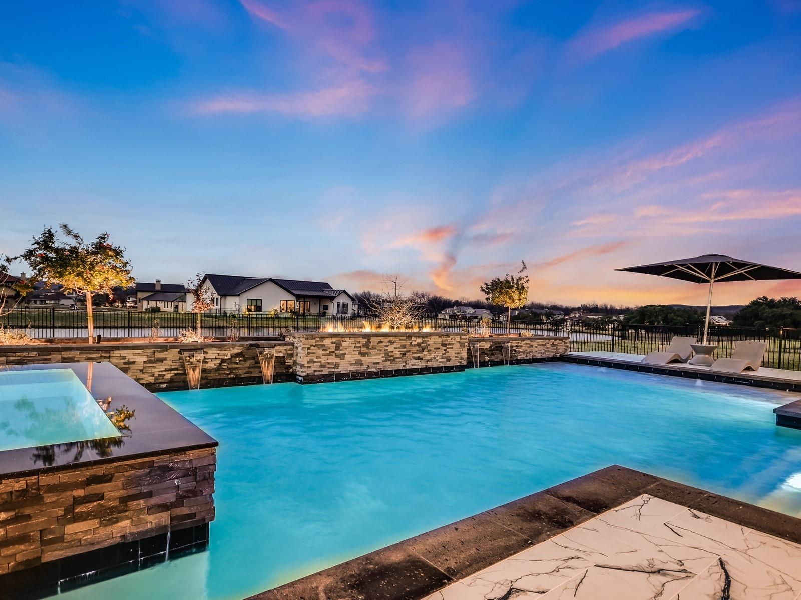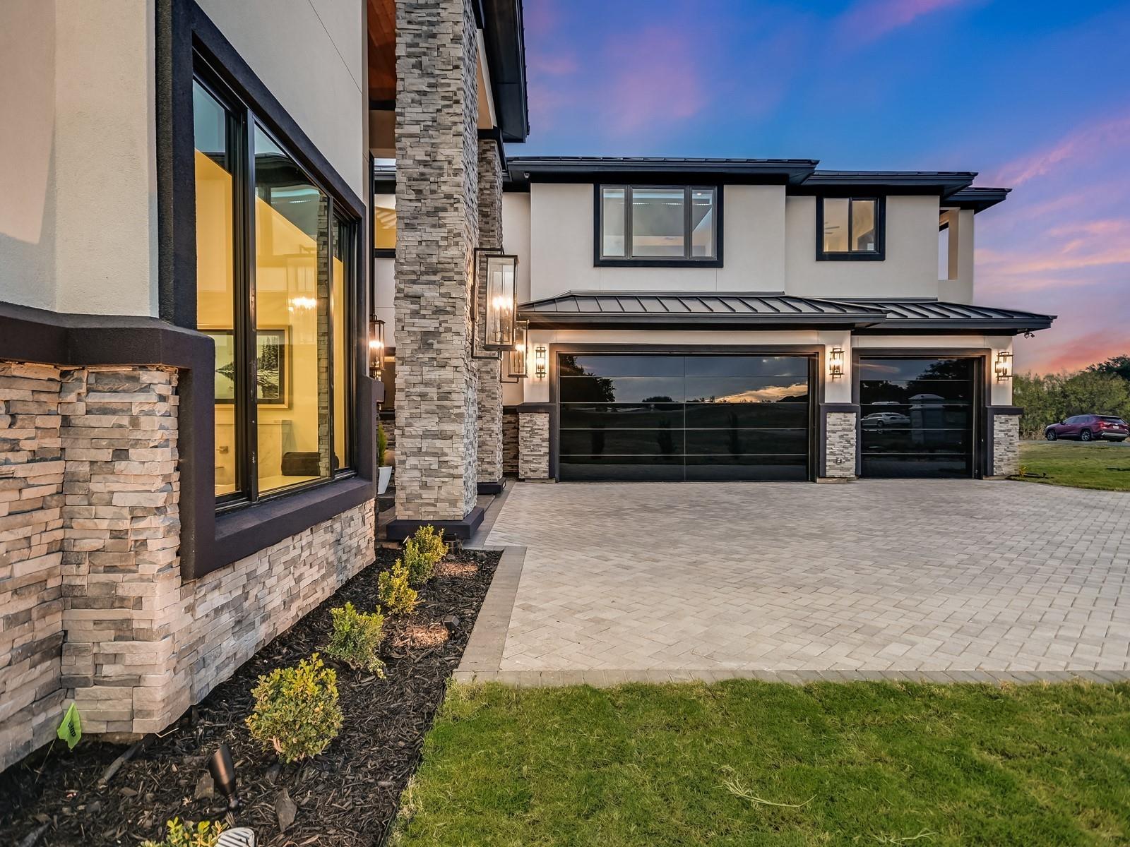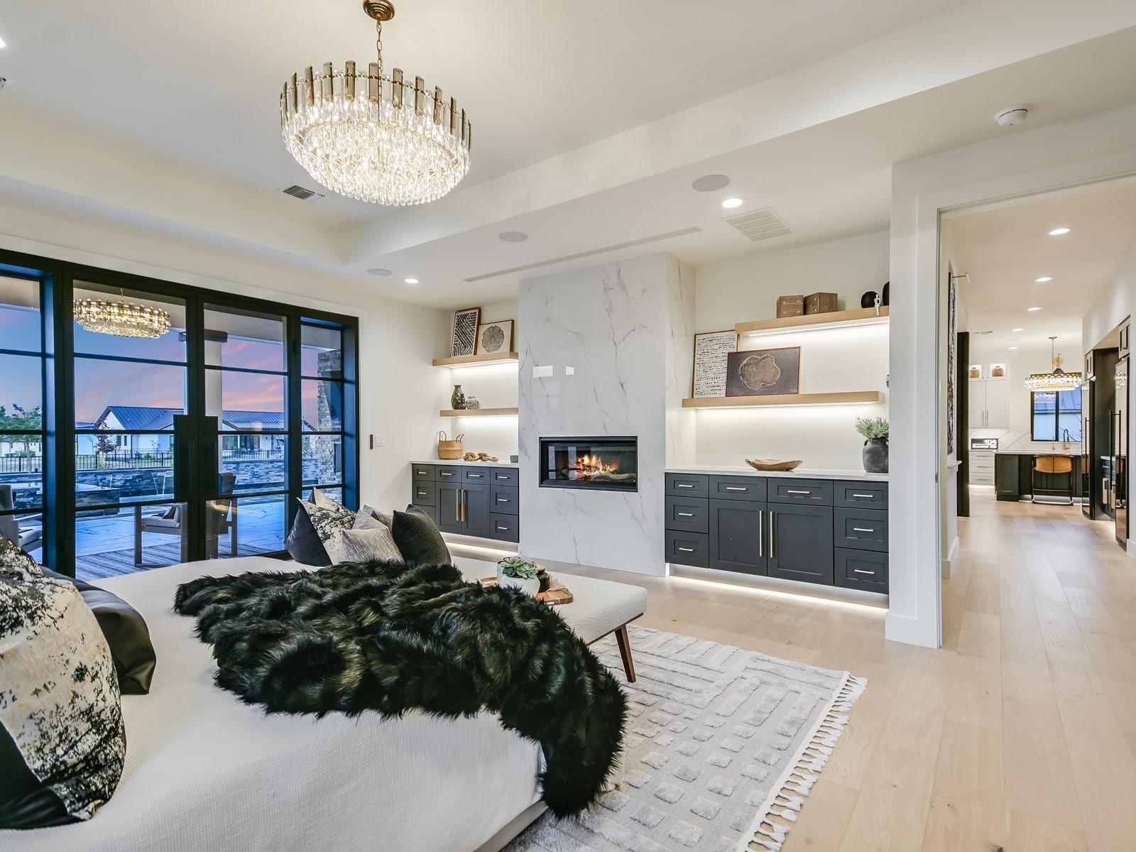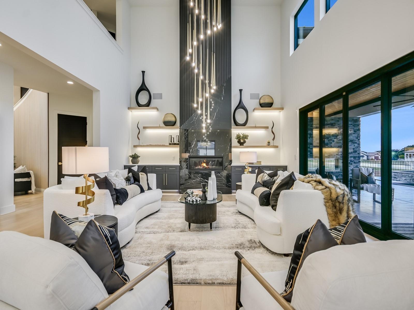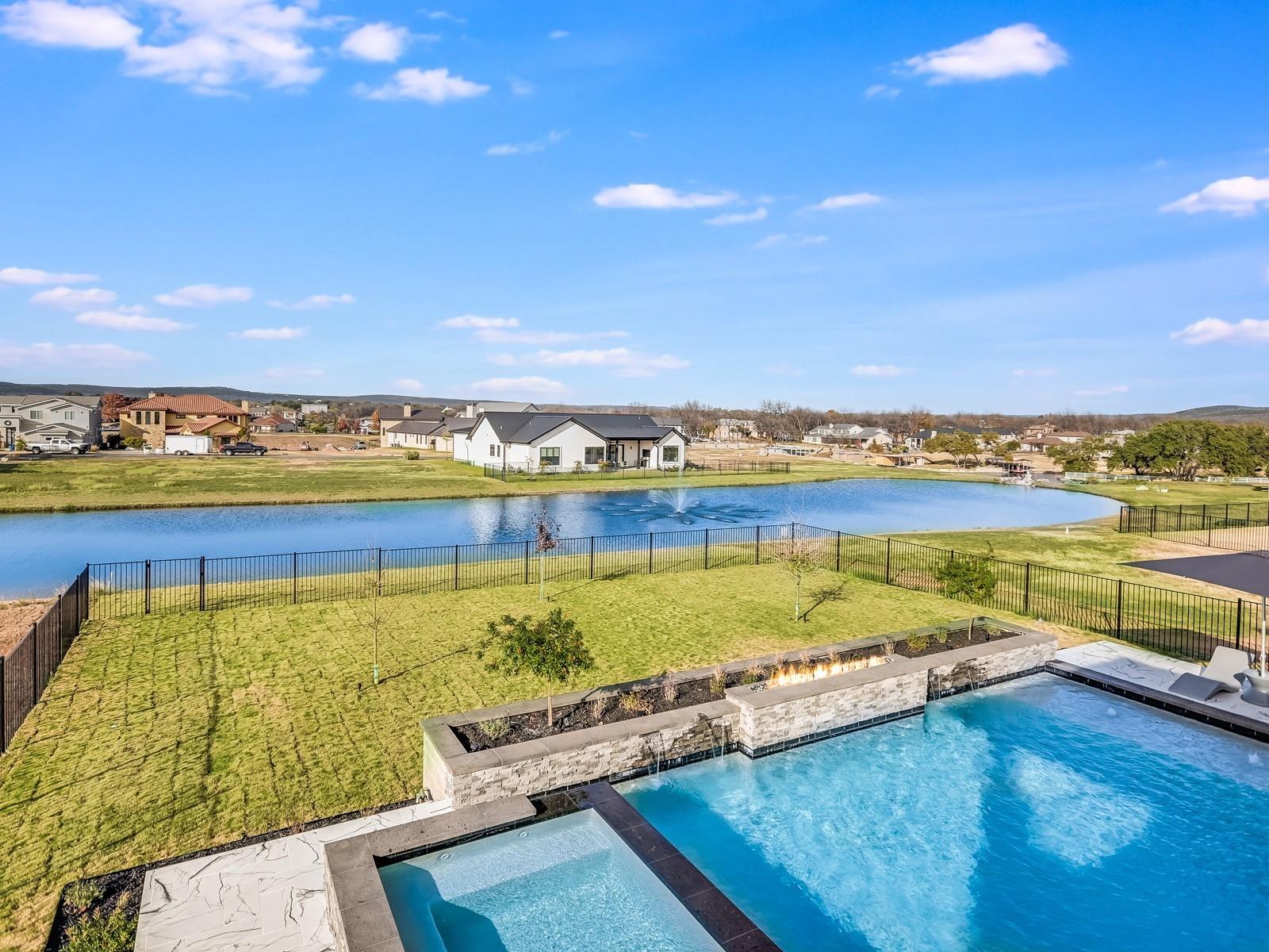Perched in the upscale Clearwater Landing at Lake LBJ community, this newly constructed residence is the ultimate dream home for those insisting on the finest in design and craftsmanship. Spanning 4,995 sq. ft., this two-story Hill Country contemporary home is graced by a bright and open floorplan boasting wide plank White Oak hardwood floors, designer light fixtures, and a joyful mix of creamy whitewalls, black wrought-iron and glass doors and wood-accented walls and ceiling beams. The captivating two-story foyer, with its cascading chandelier and curved staircase, draws you into a layout made for entertaining. Fluted wall panels anchored by a linear fireplace define the 20’ ceiling in the great room, lit by a dramatic pendant chandelier and natural light that spills in from the 12’ glass sliding doors. The show-stopping gourmet kitchen with custom cabinetry and a large center island features quartz countertops and professional-grade appliances that are duplicated in the adjacent Butler’s kitchen. The divine primary suite presents opulent amenities such as a coffee bar, retractable projector screen, surround sound, and fireplace, plus an ensuite bath better equipped than any high-end spa! The second floor hosts a junior suite, three guest suites, a bonus prayer room, and a loft. Enjoy family time in your home theater equipped with surround sound, a bar for snacks, and plush reclining seats. You will not find another home of this caliber, so don't miss the chance to make it yours! Short golf cart ride to the marina where your boat awaits! Boat slip #69. Lake access and leased boat slip convey.
