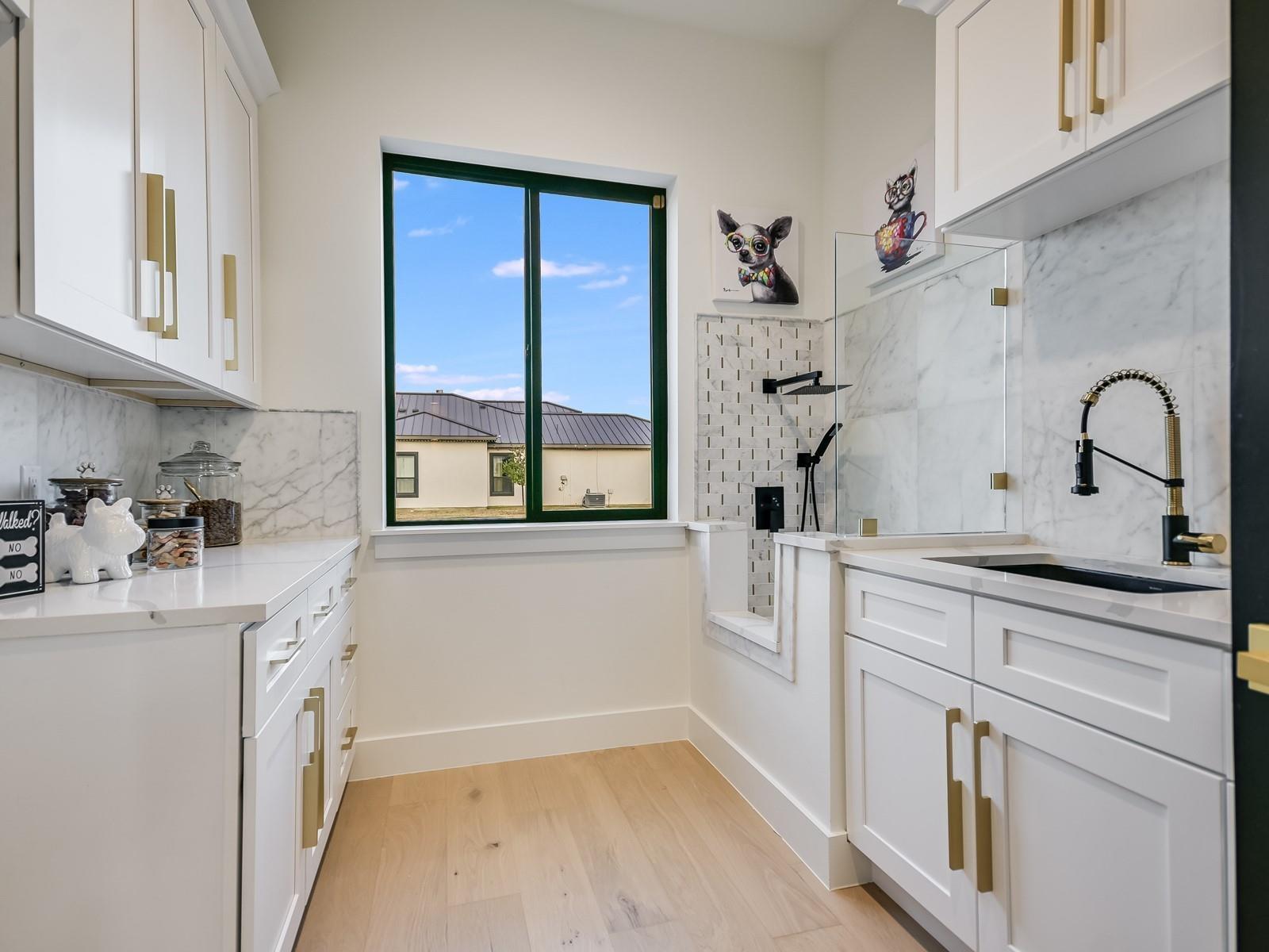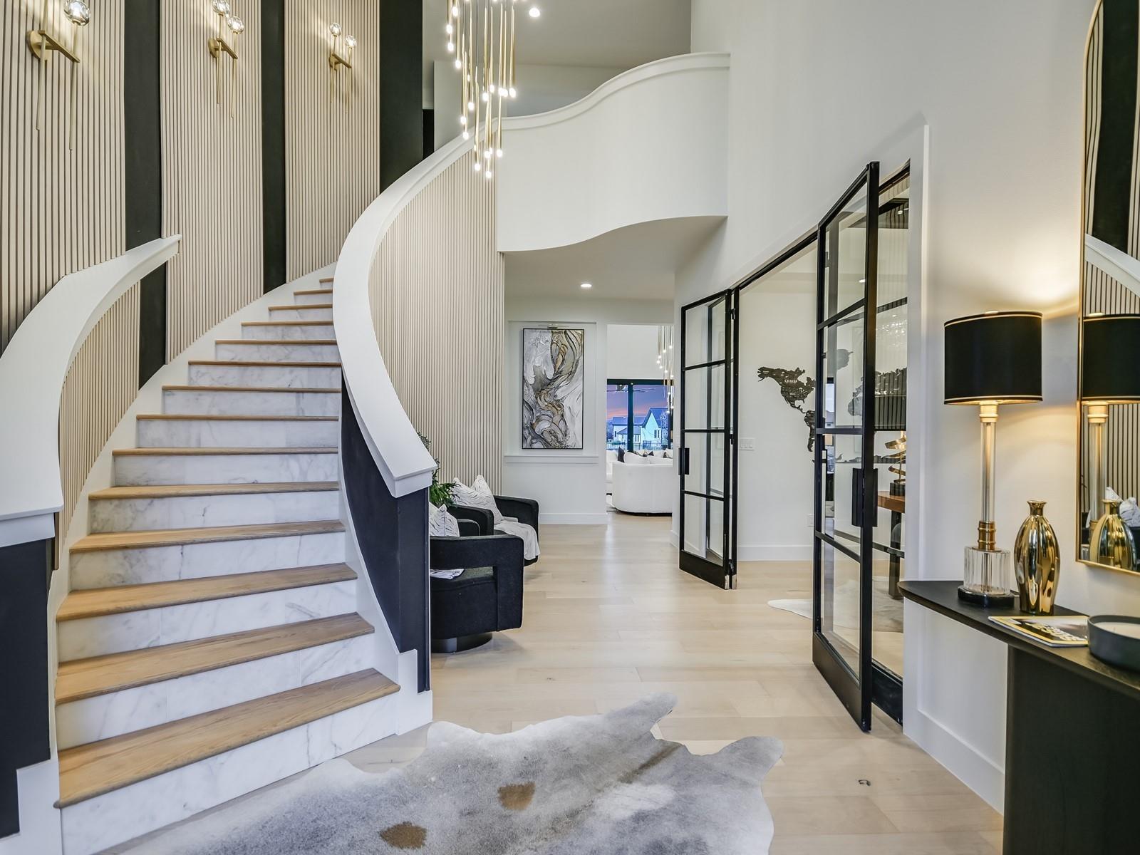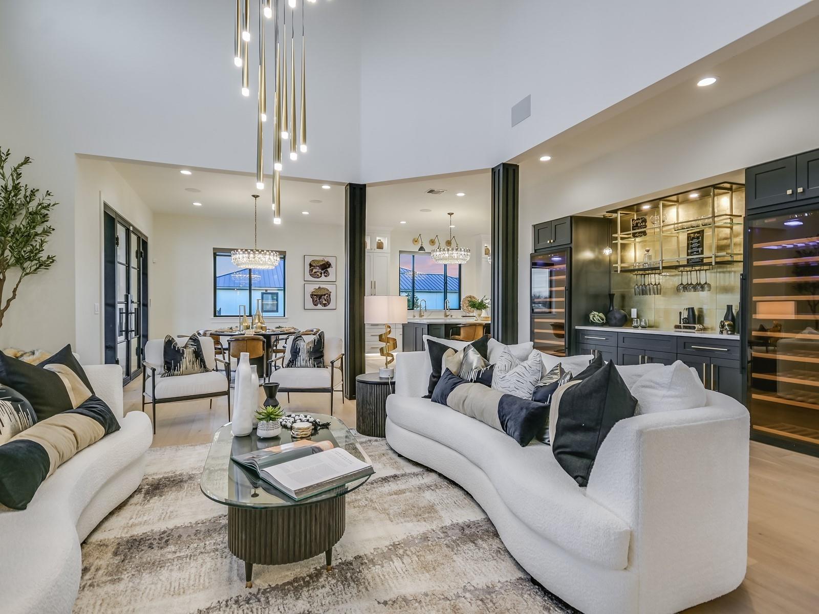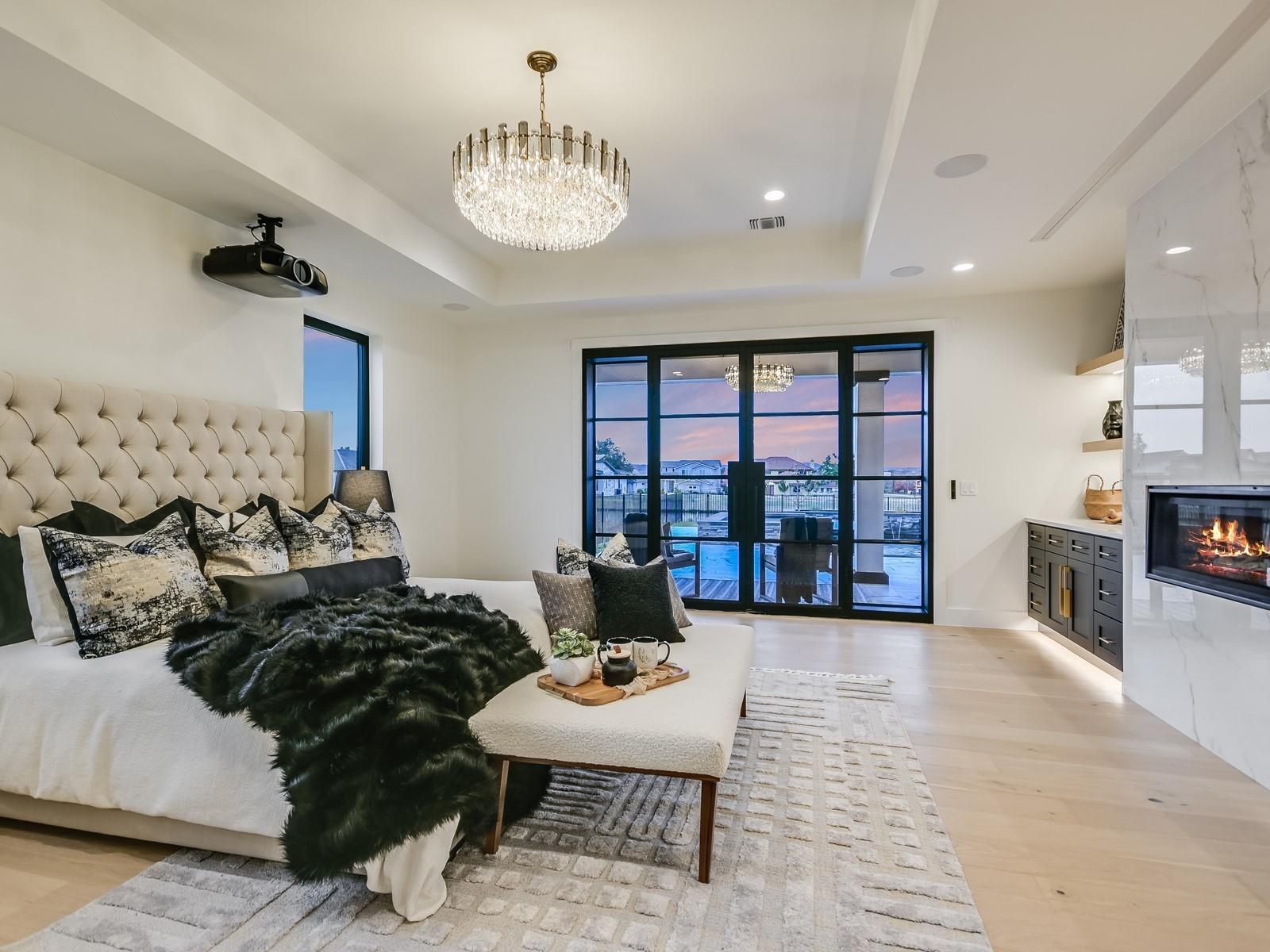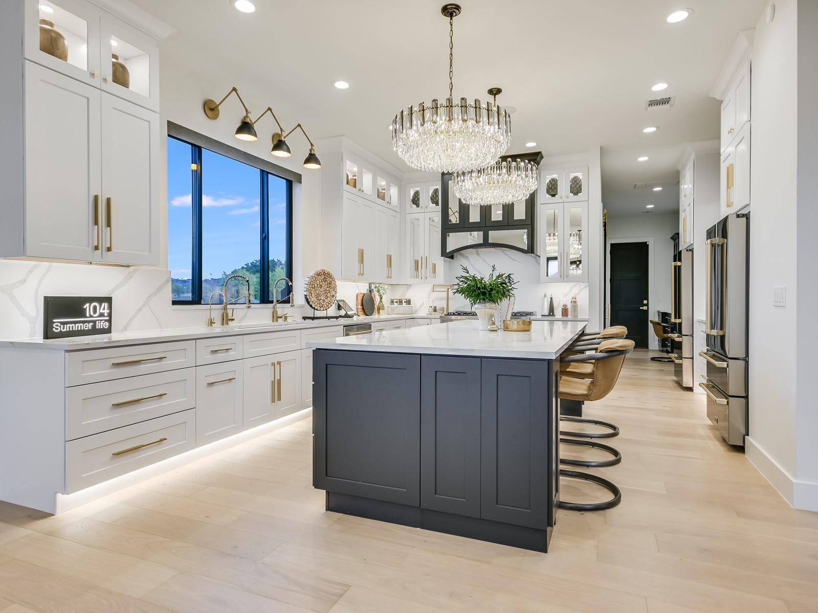 Perched in the upscale Clearwater Landing at Lake LBJ community, this newly constructed residence is the ultimate dream home for those insisting on the finest in design and craftsmanship. Spanning 4,995 sq. ft., this two-story Hill Country contemporary home is graced by a bright and open floorplan boasting wide plank White Oak hardwood floors, designer light fixtures, and a joyful mix of creamy whitewalls, black wrought-iron and glass doors and wood-accented walls and ceiling beams. The captivating two-story foyer, with its cascading chandelier and curved staircase, draws you into a layout made for entertaining. Fluted wall panels anchored by a linear fireplace define the 20’ ceiling in the great room, lit by a dramatic pendant chandelier and natural light that spills in from the 12’ glass sliding doors. The show-stopping gourmet kitchen with custom cabinetry and a large center island features quartz countertops and professional-grade appliances that are duplicated in the adjacent Butler’s kitchen. The divine primary suite presents opulent amenities such as a coffee bar, retractable projector screen, surround sound, and fireplace, plus an ensuite bath better equipped than any high-end spa! The second floor hosts a junior suite, three guest suites, a bonus prayer room, and a loft. Enjoy family time in your home theater equipped with surround sound, a bar for snacks, and plush reclining seats. You will not find another home of this caliber, so don't miss the chance to make it yours! Short golf cart ride to the marina where your boat awaits! Boat slip #69. Lake access and leased boat slip convey.