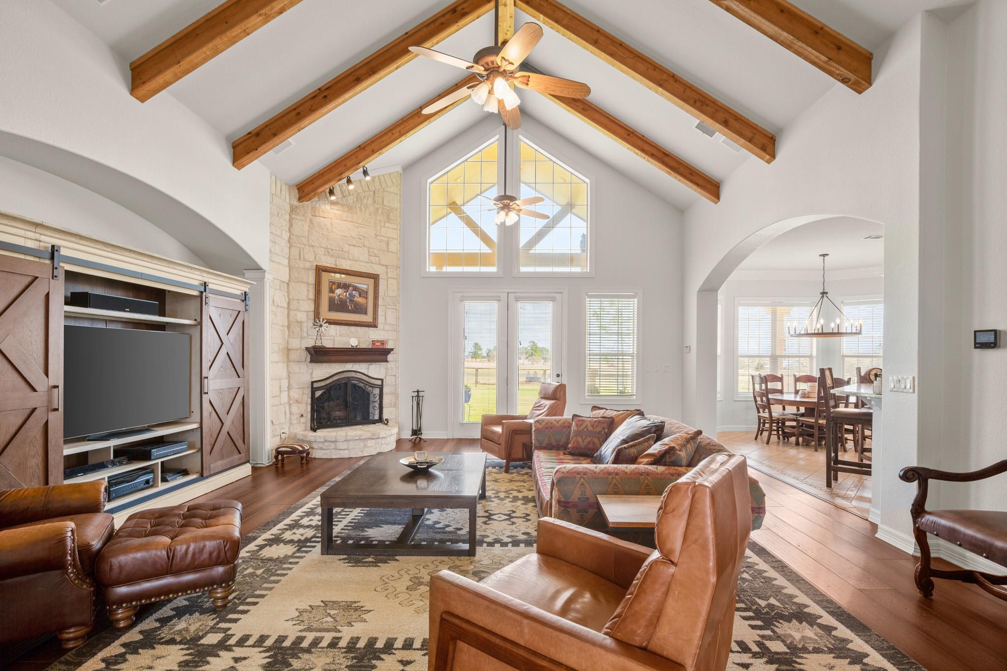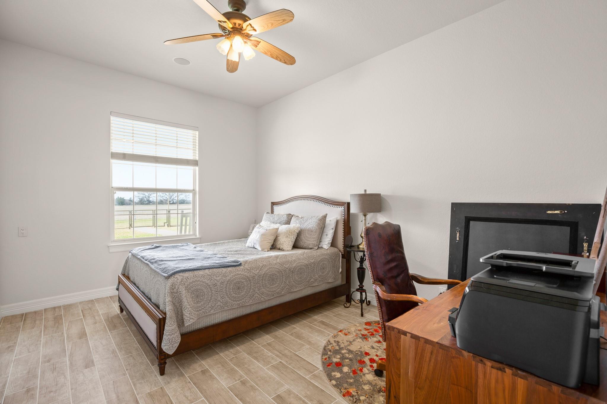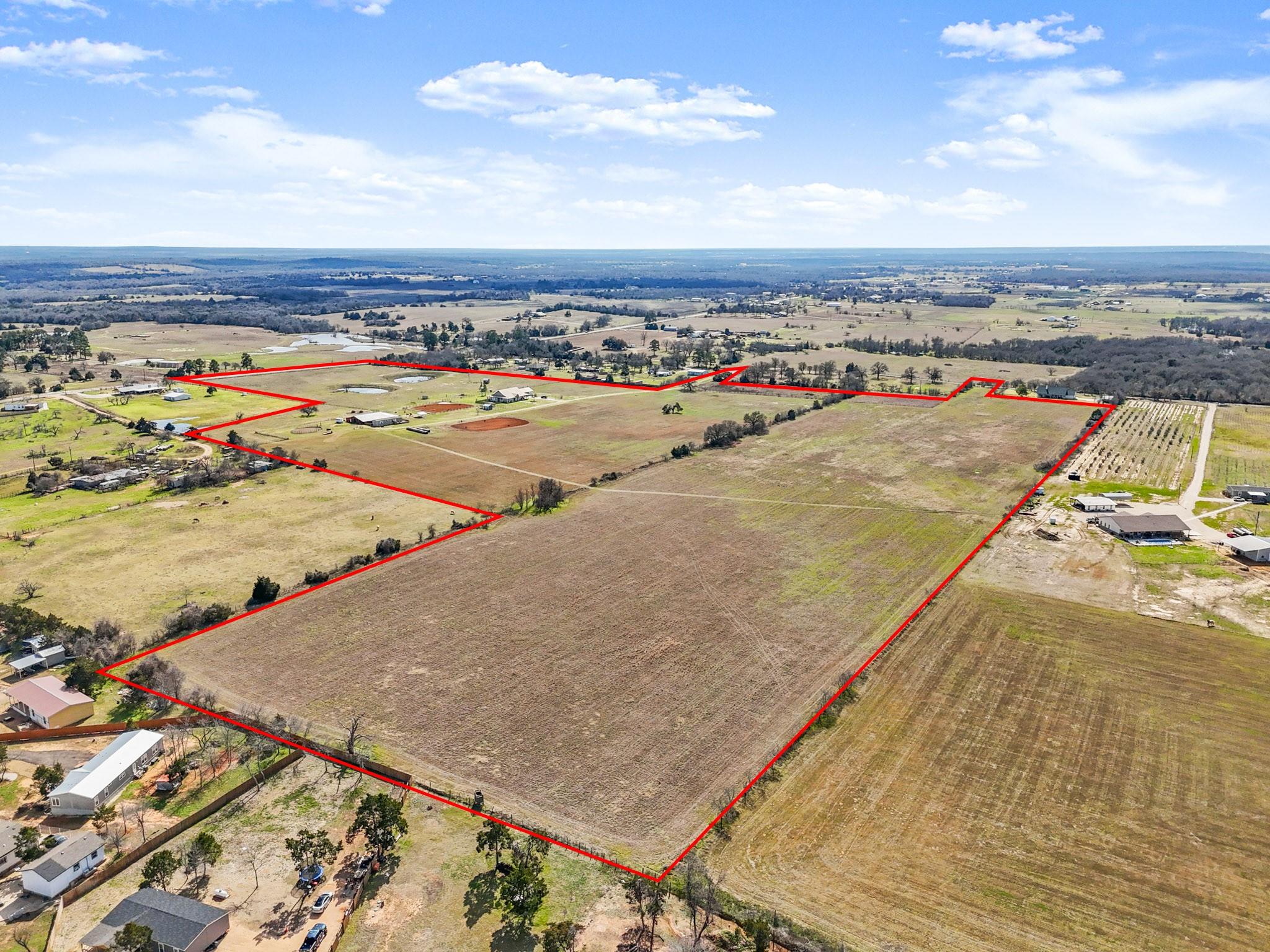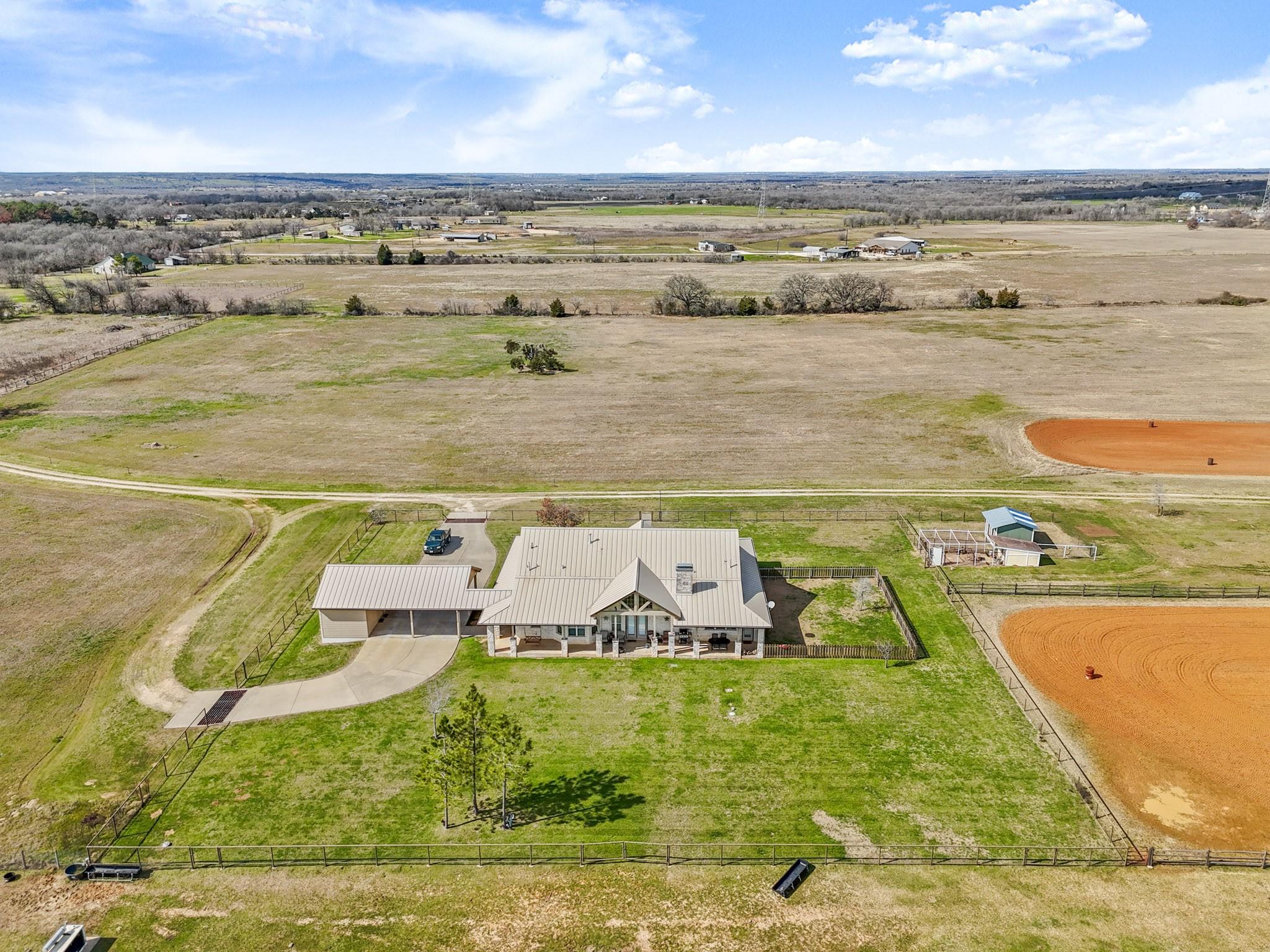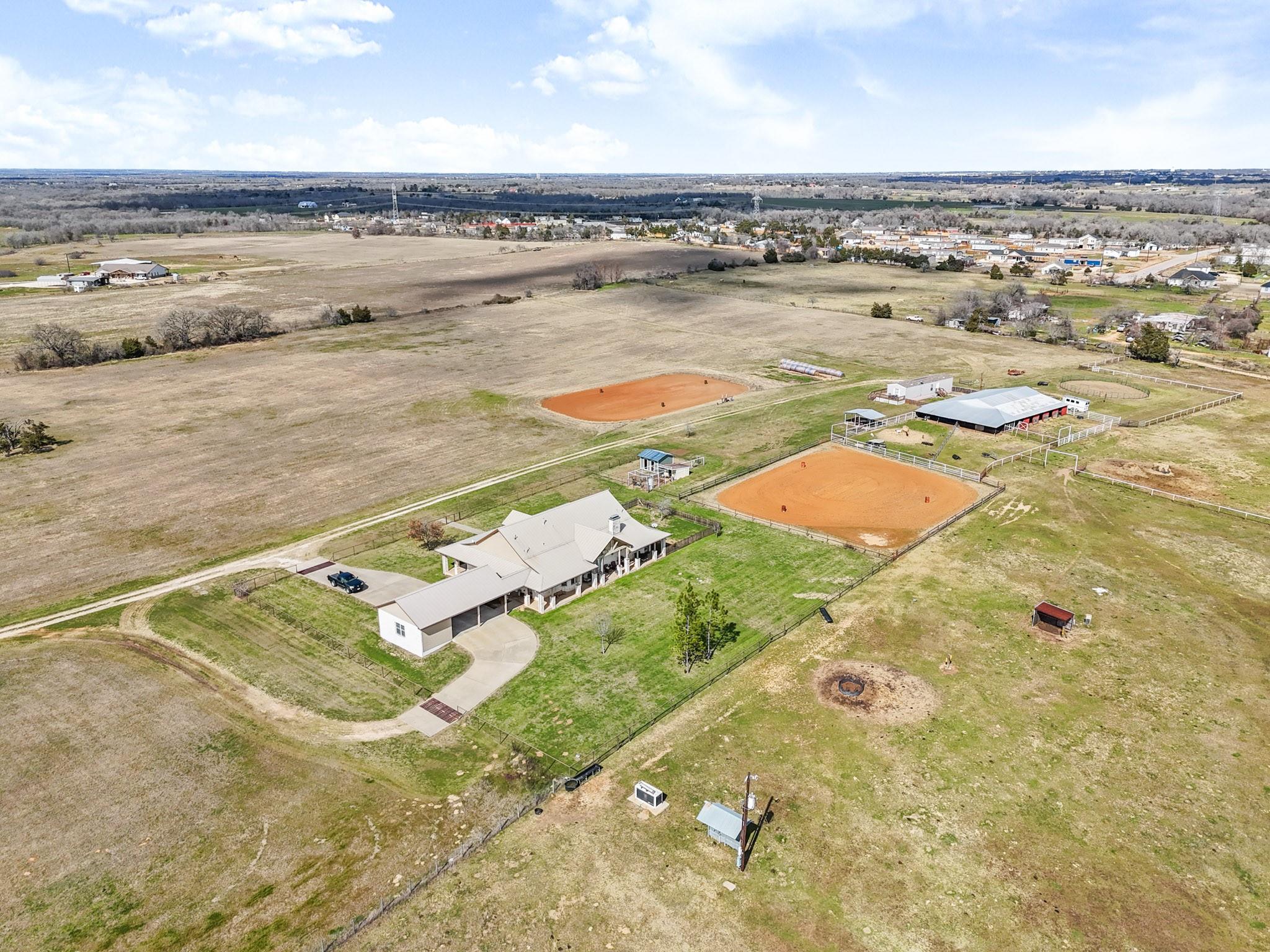 Experience the Ultimate Ranch Lifestyle! Nestled on a sprawling 56-acre expanse in Elgin, Texas, this property offers unmatched freedom, boasting an agricultural exemption and no restrictions. A haven for equestrian enthusiasts and nature aficionados alike, this ranch presents two delightful homes, a functional horse barn, two expansive riding arenas, and verdant hay fields. The primary residence greets you with a warm open floor plan, bathed in natural light streaming through expansive windows framing panoramic vistas of the surrounding countryside. The gourmet kitchen is a culinary oasis, adorned with elegant granite countertops, chic shaker-style cabinetry, a convenient breakfast bar, and top-of-the-line stainless steel appliances. Luxurious tile and hardwood floors grace the interior, complementing the modern ambiance. Enjoy modern comforts such as upgraded electrical fixtures, soaring vaulted ceilings, and a lavish master suite boasting a spa-like bathroom with a generous soaker tub and a walk-in shower featuring dual shower heads. Step outside onto the wrap-around porch and immerse yourself in the serene beauty overlooking two enchanting ponds. The property's exterior is equally impressive, featuring a well-appointed barn with a workshop, two storage rooms, and four horse stalls. Additionally, a charming 2-bedroom, 2-bathroom guest house offers cozy accommodations for visitors. Rest assured with amenities including a generator and a dependable working well. Don't miss this rare chance to own a slice of Texas paradise, where luxury meets ranch living in perfect harmony. Schedule your exclusive tour today and embark on the ranch lifestyle of your dreams.
