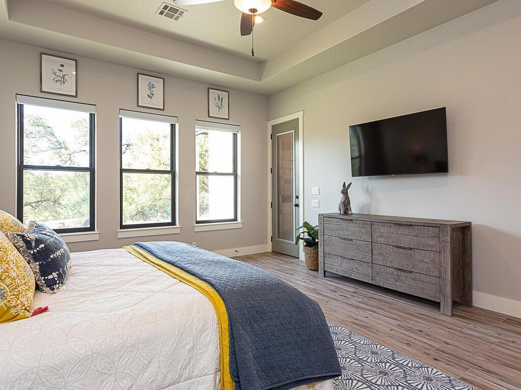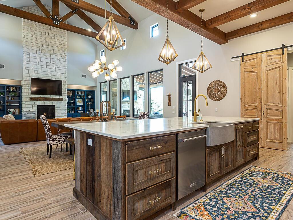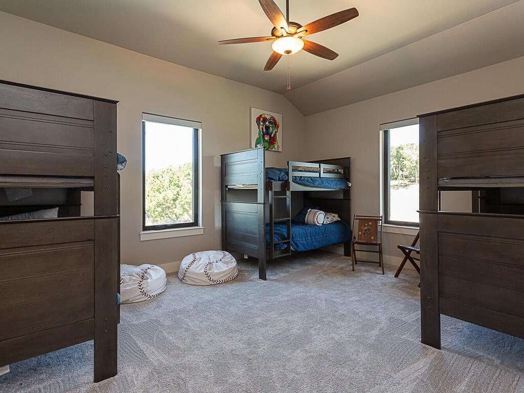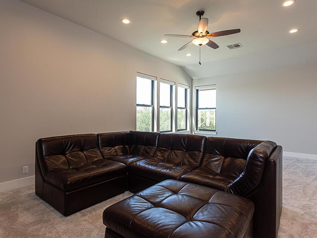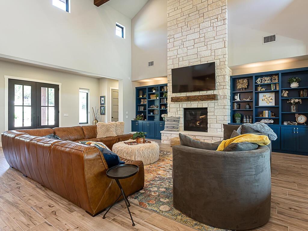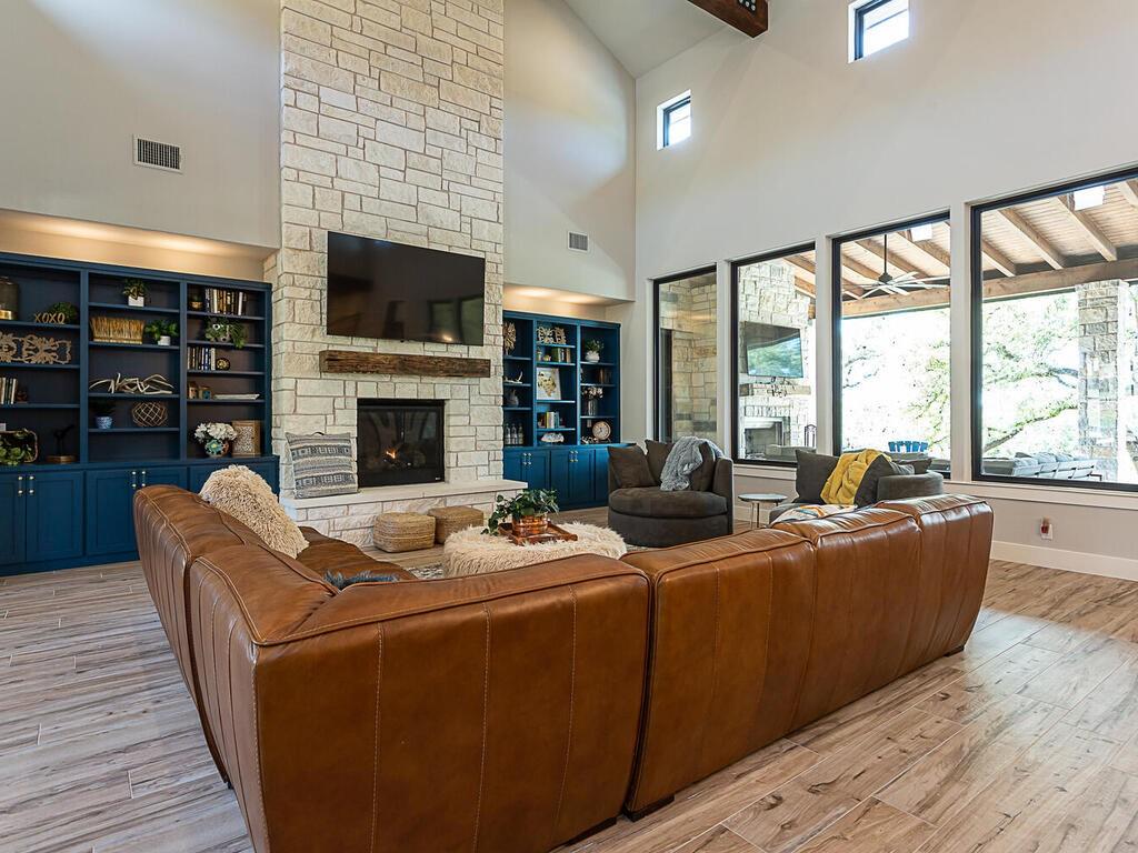 Magnificent custom home backing to a pond on 1.5 acres in The Reserve at Lake Travis. This home offers over 4,600 square feet, 5 bedrooms, 5.5 baths, office/media room, and an upstairs game room. Notice the designer touches throughout with beautiful built in features along with the amazing open concept, floor to ceiling stone fireplace, and beamed cathedral ceiling. The kitchen is a chefs paradise with all the amenities and storage one could desire featuring an enormous island for prepping & entertaining, custom blue accented cabinetry, a separate wet bar area attached to an amazing walk in pantry with matching cabinets & counter top space for the ideal coffee station. This floor plan is perfect for entertaining as well as offering a split bedroom plan with the owners suite on one side, and 2 guest suites on the opposite side of the main level. Each with their own en suite bathrooms. Additionally there are 2 bedrooms on the second level, one with an en suite bathroom as well, but also a separate full bath that services the second level. Back on the main level as you walk in from the oversized 3 car garage there is a large mudroom with bench seating and adjacent laundry room, both with matching blue accented cabinets. The exterior of the home starts with the well manicured landscaping leading to the front covered porch which frames the beautiful iron French entry doors. To the rear of the house is a large covered patio with outdoor kitchen, and stone fireplace, also equipped with electronic sun shades to enclose the entire patio. Just a short walk to the rear of the property is the stocked pond. With 1.5 acres there is plenty of space to add a pool, see pool renderings and video. The Reserve at Lake Travis is a lake front community with a 150 plus slip boat marina that is just a quick walk or golf cart ride away, a resort style lazy river pool with swim up bar & food service, and Lakeside Lodge offering seasonal dining, pickle ball court, and community clubhouse.