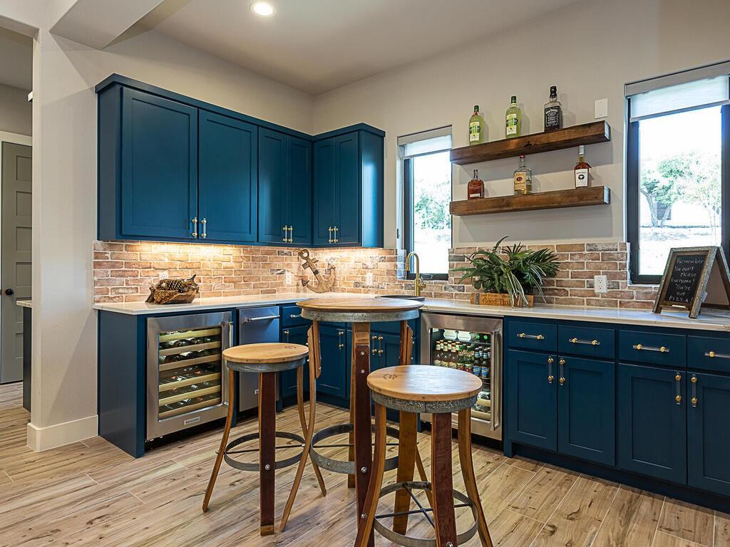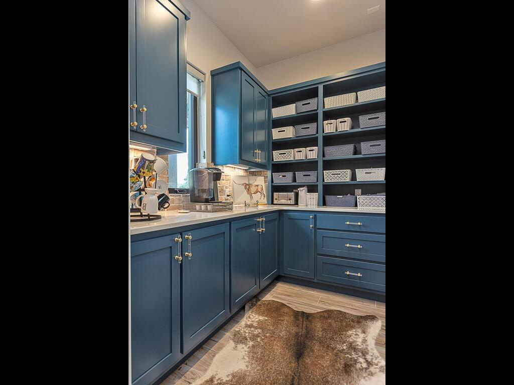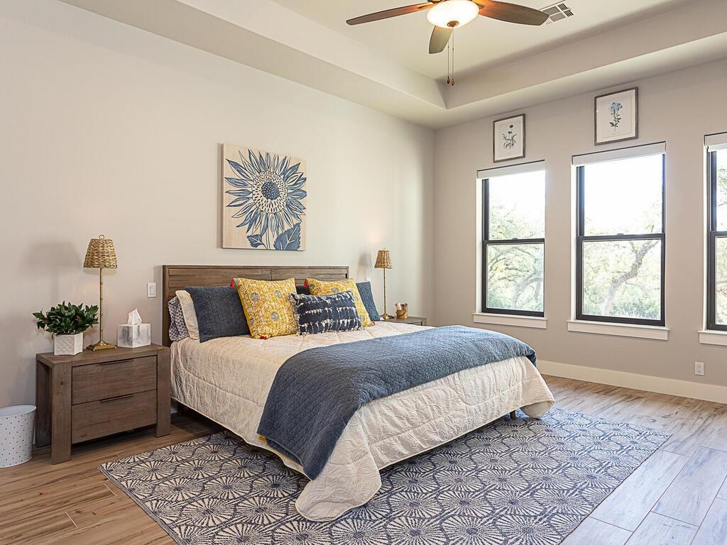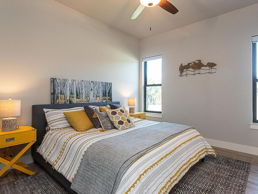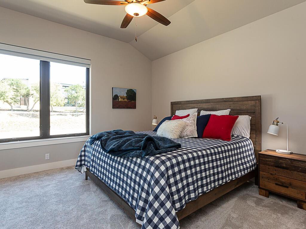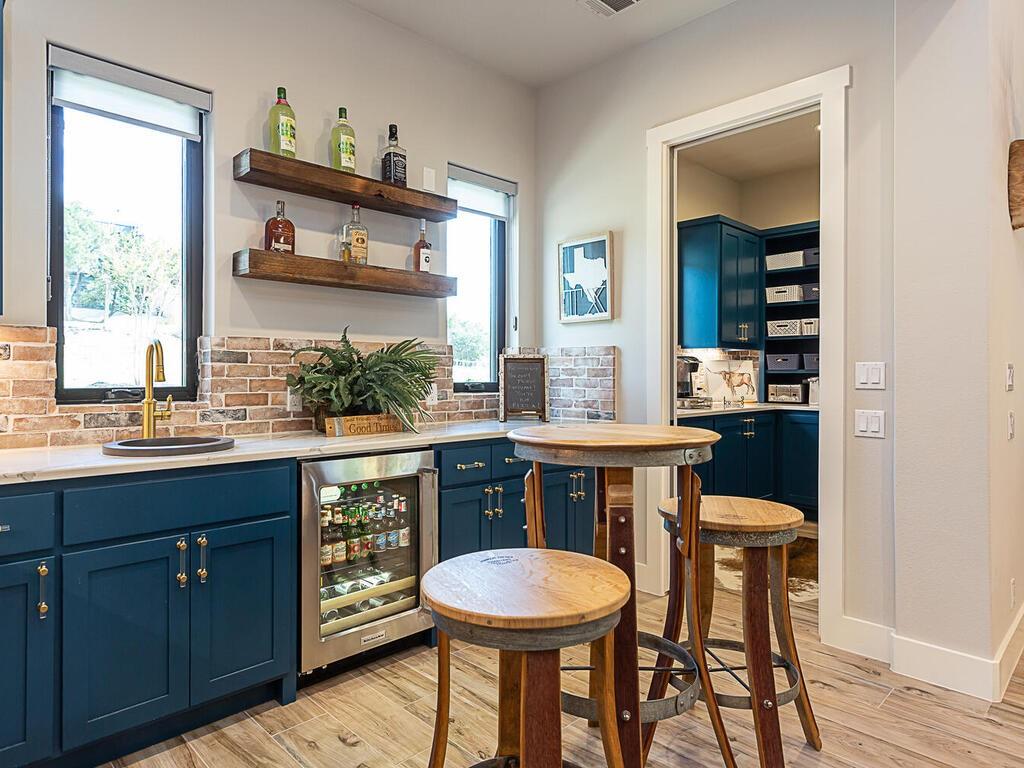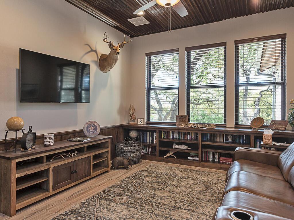 Magnificent custom home backing to a pond on 1.5 acres in The Reserve at Lake Travis. This home offers over 4,600 square feet, 5 bedrooms, 5.5 baths, office/media room, and an upstairs game room. Notice the designer touches throughout with beautiful built in features along with the amazing open concept, floor to ceiling stone fireplace, and beamed cathedral ceiling. The kitchen is a chefs paradise with all the amenities and storage one could desire featuring an enormous island for prepping & entertaining, custom blue accented cabinetry, a separate wet bar area attached to an amazing walk in pantry with matching cabinets & counter top space for the ideal coffee station. This floor plan is perfect for entertaining as well as offering a split bedroom plan with the owners suite on one side, and 2 guest suites on the opposite side of the main level. Each with their own en suite bathrooms. Additionally there are 2 bedrooms on the second level, one with an en suite bathroom as well, but also a separate full bath that services the second level. Back on the main level as you walk in from the oversized 3 car garage there is a large mudroom with bench seating and adjacent laundry room, both with matching blue accented cabinets. The exterior of the home starts with the well manicured landscaping leading to the front covered porch which frames the beautiful iron French entry doors. To the rear of the house is a large covered patio with outdoor kitchen, and stone fireplace, also equipped with electronic sun shades to enclose the entire patio. Just a short walk to the rear of the property is the stocked pond. With 1.5 acres there is plenty of space to add a pool, see pool renderings and video. The Reserve at Lake Travis is a lake front community with a 150 plus slip boat marina that is just a quick walk or golf cart ride away, a resort style lazy river pool with swim up bar & food service, and Lakeside Lodge offering seasonal dining, pickle ball court, and community clubhouse.