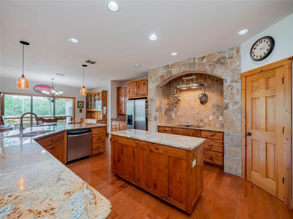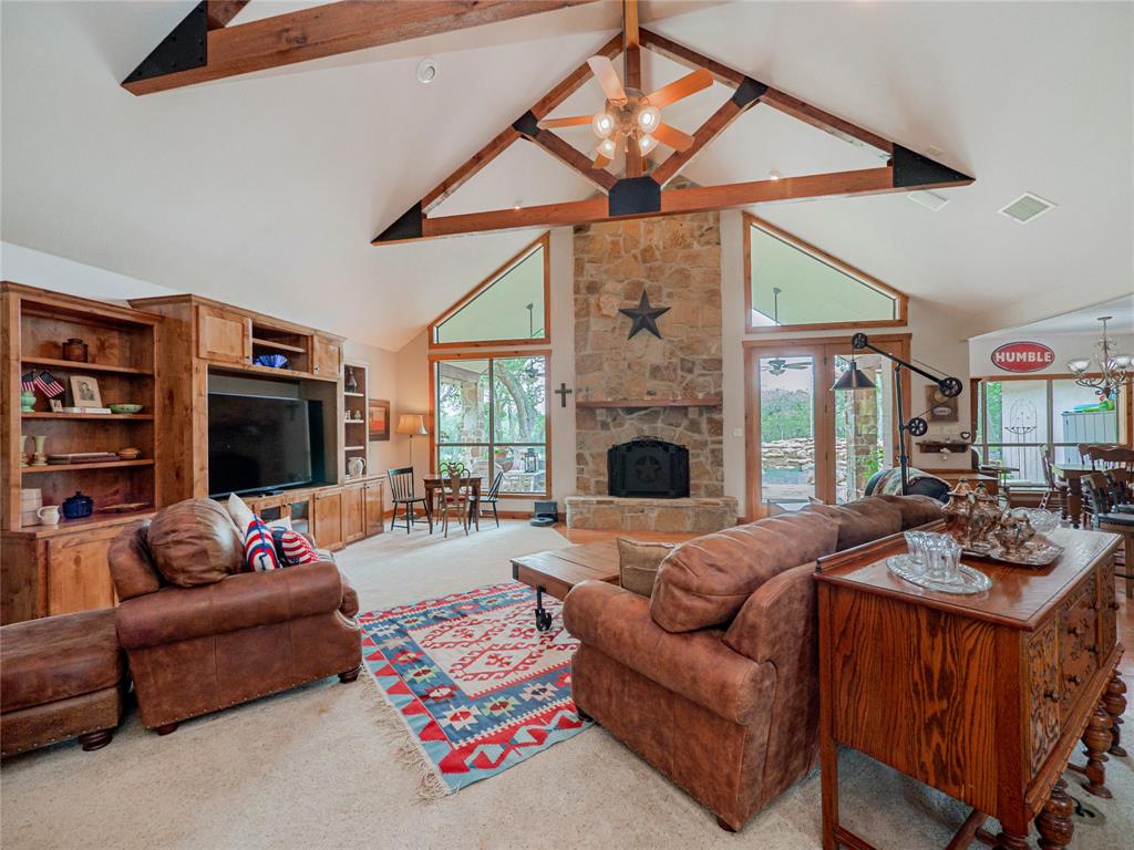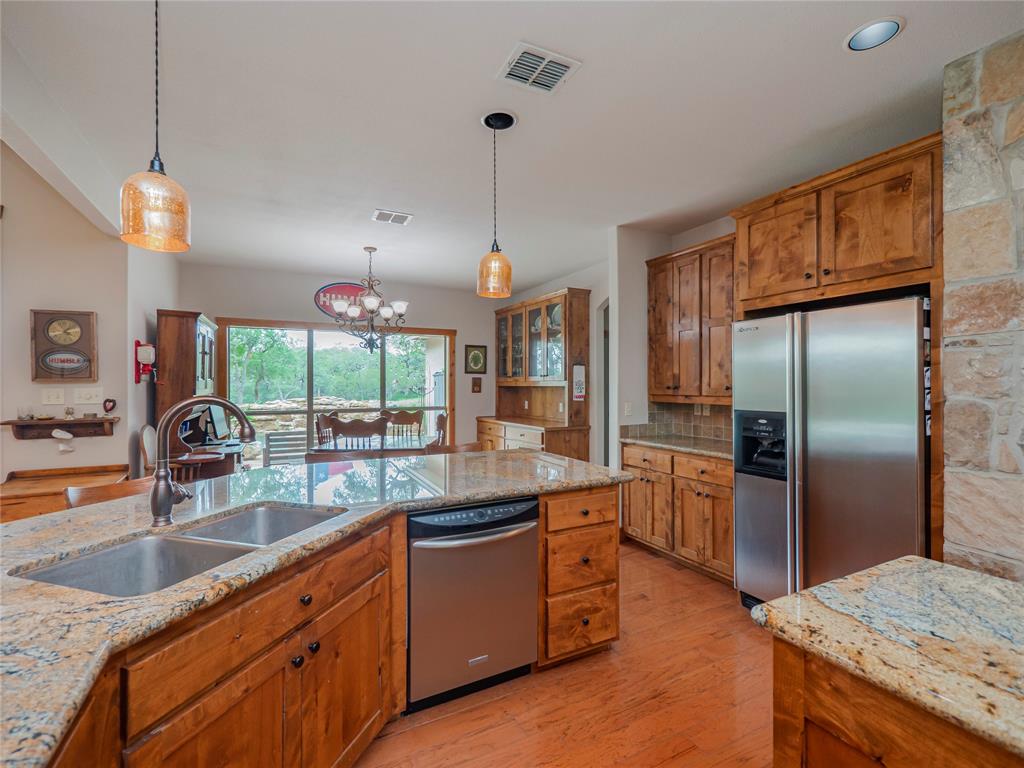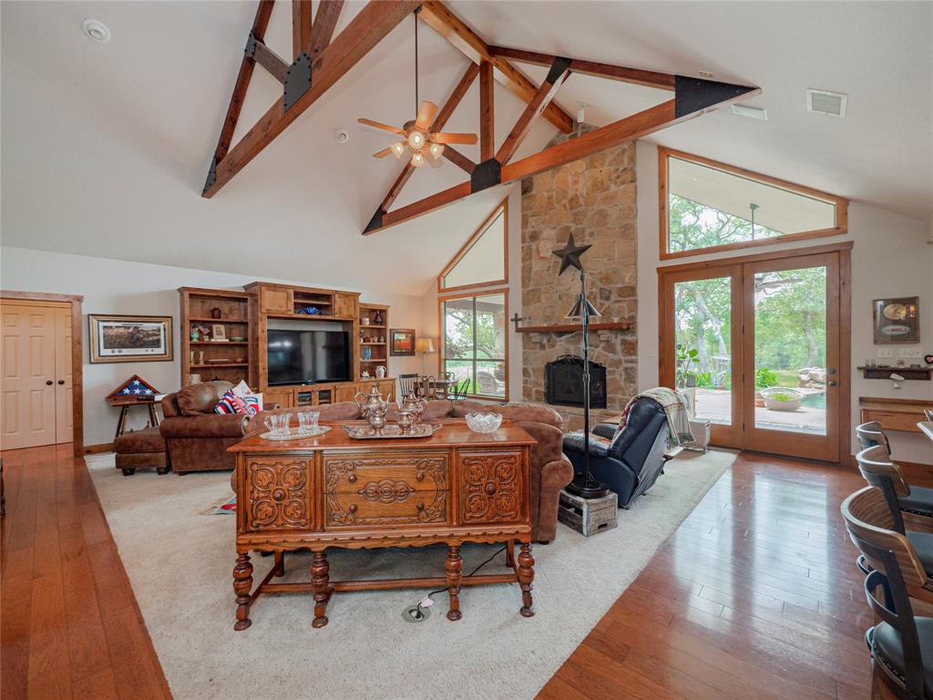 Welcome to your Hill Country retreat! Nestled on 25 fenced acres of mature oak trees and backing up to Rockwall Ranch with an AG exemption in place, this custom home offers all the privacy you could ever dream of. Step inside and be met with stunning cedar posts, high ceilings, rock accent walls and gorgeous wood floors throughout. You'll love cooking in the kitchen with its granite countertops, custom cabinetry and built-in entertainment center complete with a 65" tv. After dinner cozy up in front of the fireplace or take a dip in your resort style pool with waterfall and hot tub! The luxurious master suite includes an attached bonus room for gym, nursery or office. This home features a split floor plan consisting of 3 bedrooms, 3 bathrooms, a 4 car garage with full bath and office, plus an additional workshop with another full bath! There's plenty of room for relaxing or entertaining guests. You will love this 25 acre oasis (hunting is allowed)! Feel like you're way out in the country but less than 20 minutes to major retailers and restaurants in New Braunfels and less than 30 minutes to downtown San Antonio. Property consists of 3 separate parcels of land. With this unique gentlemen's ranch the opportunities are limitless!
