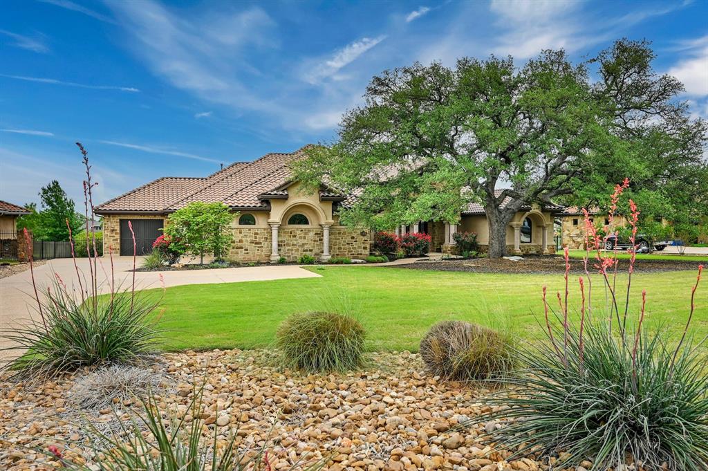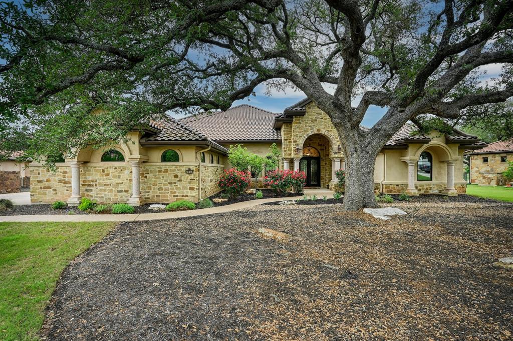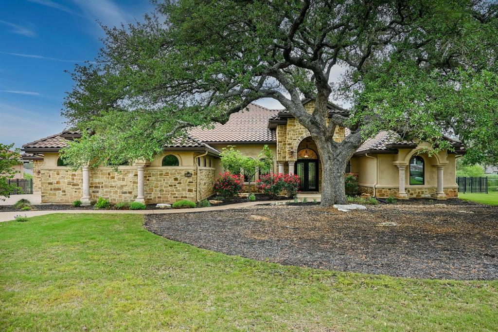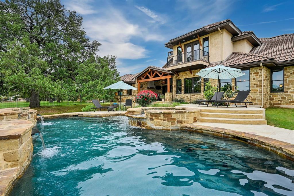 This immaculate home sits on an oversized, estate lot, almost one acre, adorned with heritage oak trees in the award-winning, Jack Nicklaus signature golf course community of Cimarron Hills in Liberty Hill ISD. Inside the home you will find a sprawling 5,233 sqft of living space, 4 bedrooms, 4 full/2 half bathrooms, 2 living areas, an office, & a media room. The floor to ceiling stone fireplace brings comfort and grandeur to the living room, while the white-oak flooring and wood beamed ceiling imbue the home with warmth. The truly uncompromising, state-of-the-art kitchen was designed with chefs and frequent entertainers in mind with an expansive center island, high-end SS appliances that include double ovens with convection, and oversized gas cooktop. The elegant primary suite inspires relaxation with its soft-toned walls, wood flooring, and direct access to the resort-style backyard. Enjoy a spa day in your own glamorous, ensuite bath that boasts 2 vanities, a standalone tub surrounded with stone, and a separate walk-in shower. Find each of the 3 secondary bedrooms on their own separate wing of the home, each having access to their own bath. Upstairs you will find a 3-tier media room with built in dry bar and beverage fridge, perfect for a poker night or family movie night. Extend your living outdoors under the expansive, covered living area that makes entertaining a breeze with an outdoor kitchen, glass fire pit & space for both dining and lounging. The glistening pool is a tempting treat on hot summer days while the outdoor spa is pure relaxation during the winter. An oasis of calm and tranquility can be found at the rear of the property which backs to a green space with direct access to the walking trail out of your back gate. Enjoy all that Cimarron Hills has to offer including golf, tennis, pickleball, spa, fitness center, pool, restaurant, events and socials. You will not just be making an address change; you will be making a lifestyle change...don't miss it!