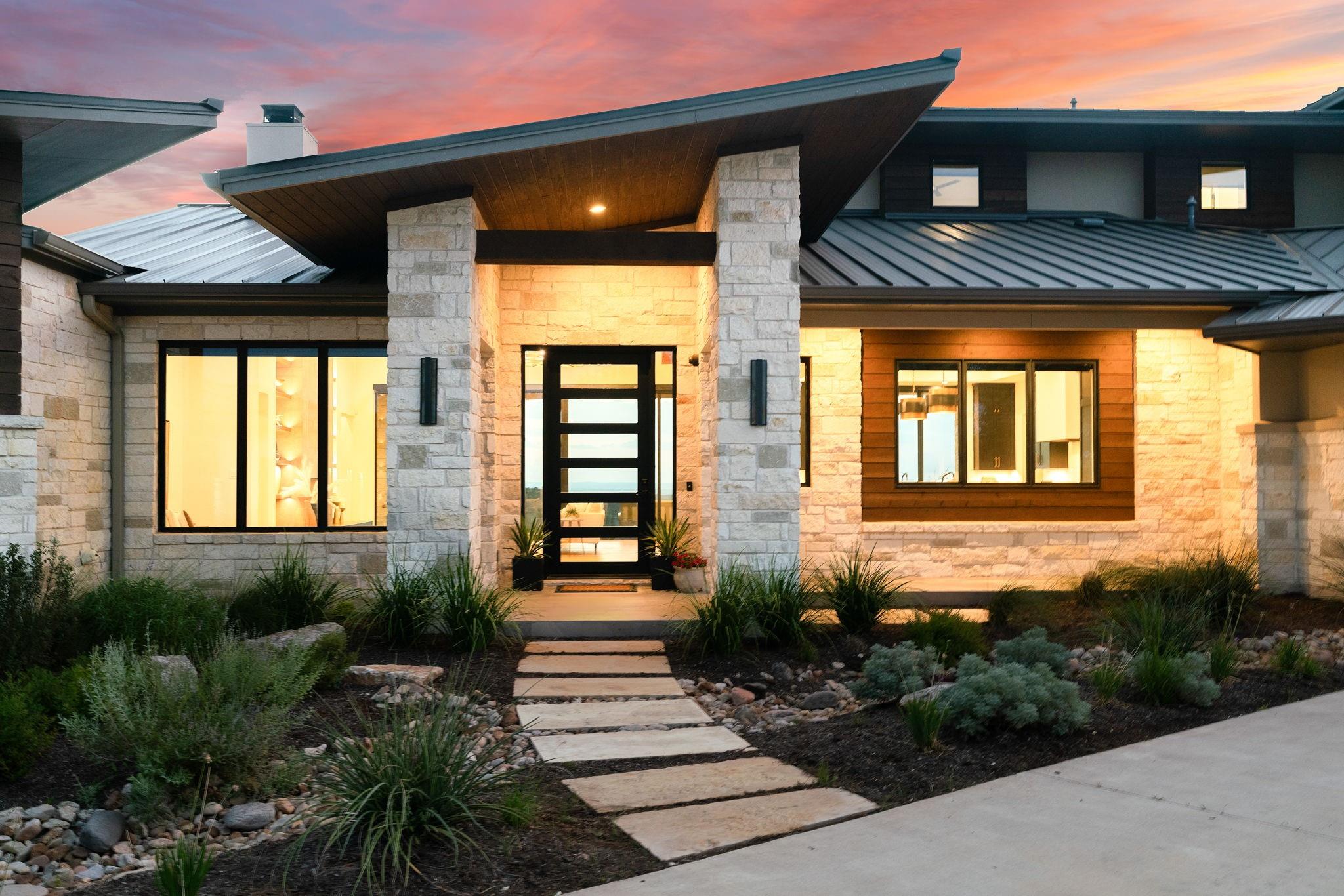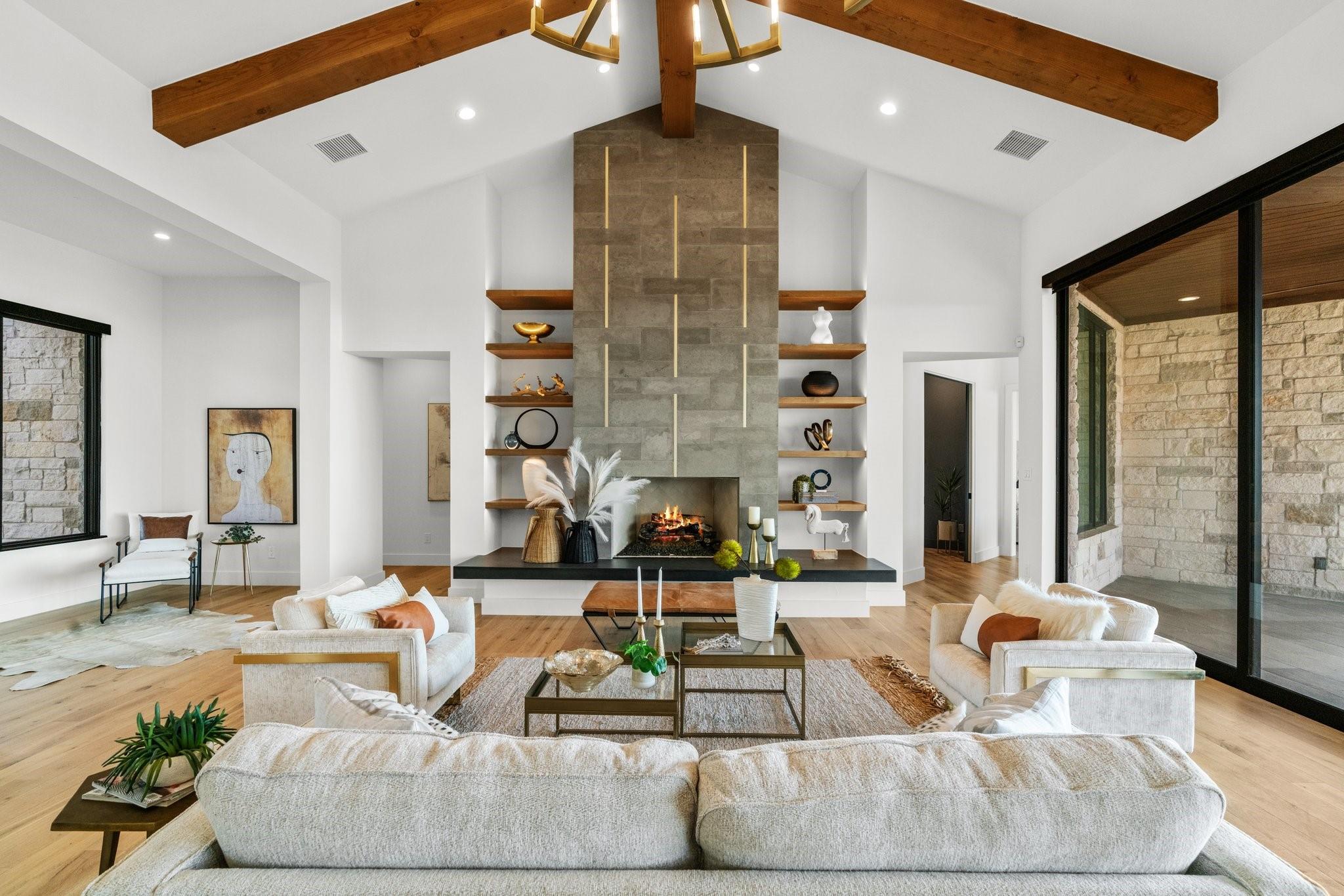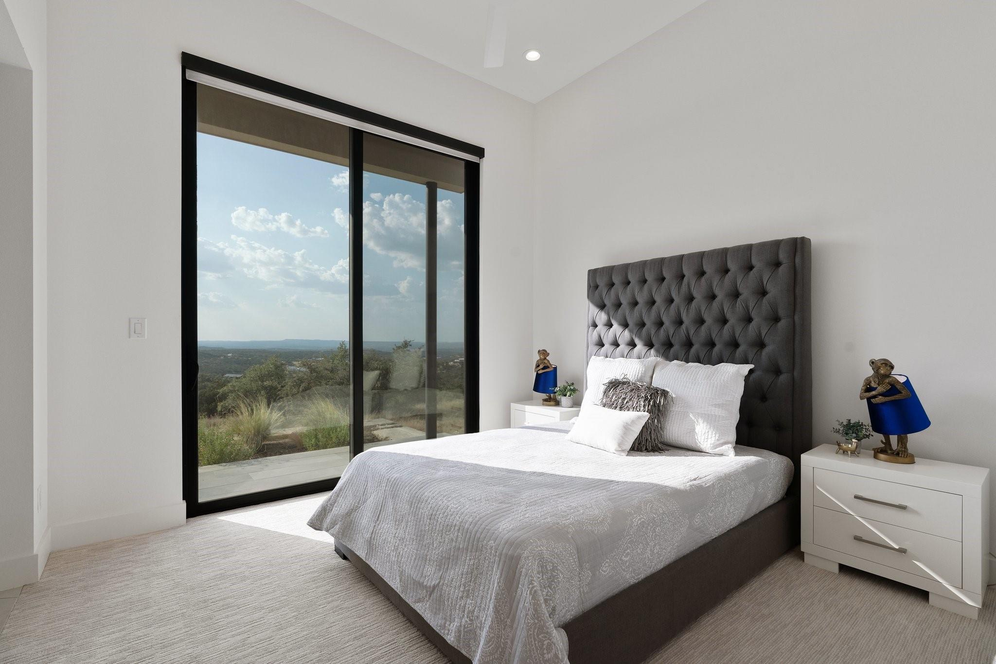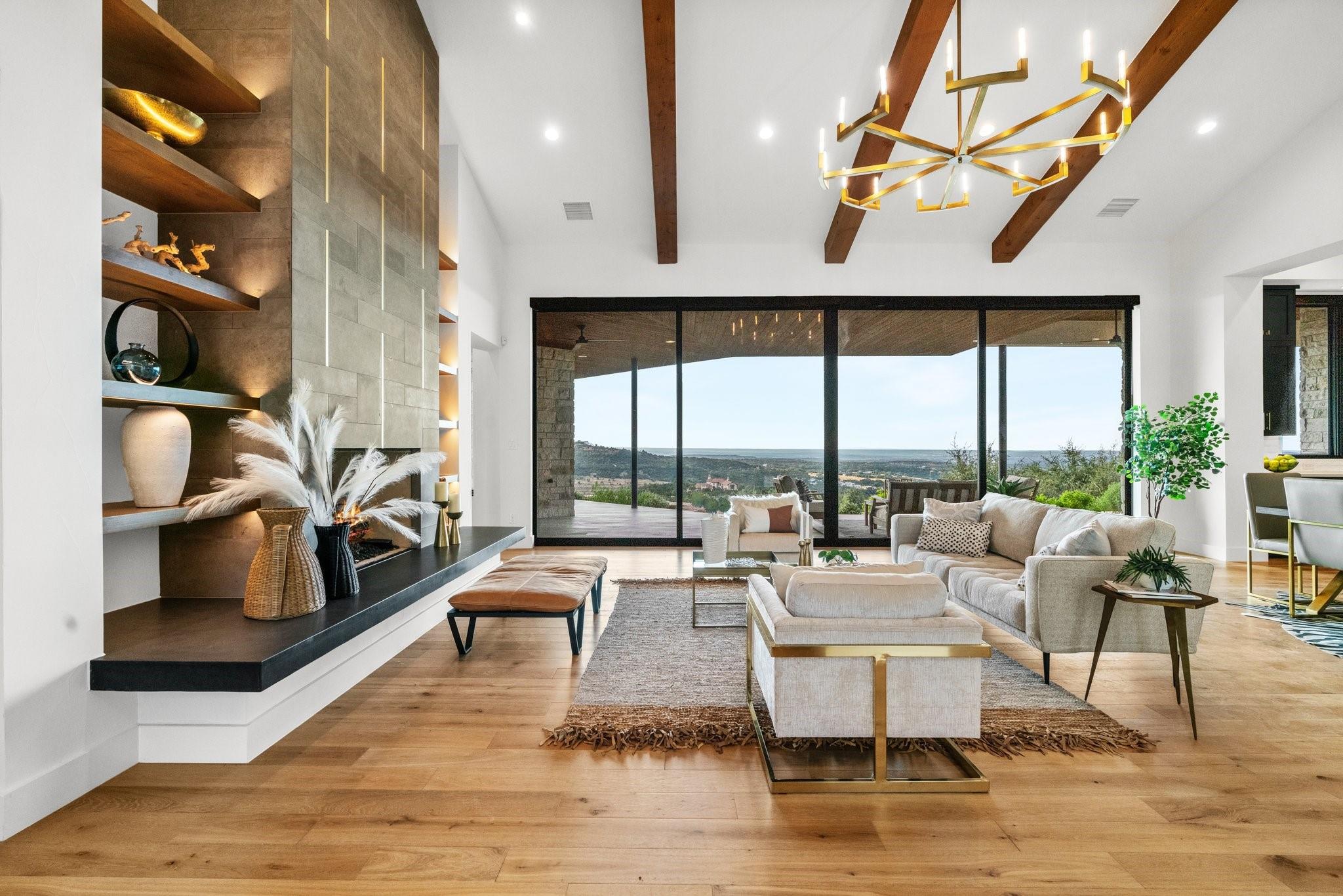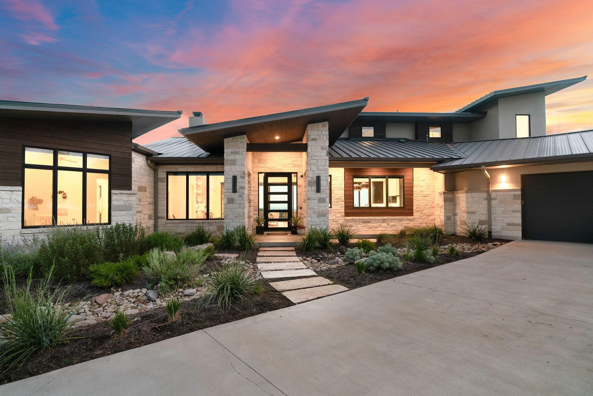 A stunning modern masterpiece graciously nestled atop 28+ private acres with breathtaking panoramic views of the Texas Hill Country. Built in 2018 by the renowned John Siemering Custom Homes, this meticulously designed home beautifully blends bold and neutral tones, harmonizing with the natural surroundings while prioritizing comfort, functionality, and luxury. The open floor plan flows gracefully, boasting a luxurious main-level owner’s retreat, 2 secondary bedrooms, a dedicated study (or 4th downstairs bedroom), and an upper level 5th bedroom, full bath, and spacious additional living, game or media room. The brilliantly designed gourmet-style kitchen is the heart of this exquisite home and a culinary enthusiast's dream, featuring top-of-the-line Thermador appliances, custom black cabinetry with elegant brass hardware creating an eye-catching contrast against the crisp white walls and clean lines of the designer backsplash. The generous granite island serves as the centerpiece of this gorgeous kitchen, providing a dreamy space for cooking, entertaining and gathering with family and friends. The dining flows easily into the main living space further enhanced by soaring wood-beamed ceilings, white oak hardwood floors, a stunning fireplace with custom stone hearth and hand-crafted built-ins, adding warmth and refinement. Bathed in natural light with an abundance of windows and floor-to-ceiling glass doors, spectacular views of the tranquil rolling hills can be seen for miles and miles. Additional smart features include a deep water well, whole-house reverse osmosis + water purification system, 3 zoned HVACs, tankless water heaters, motorized shades, AV wiring, and highly-efficient foam insulation. Endless opportunities for further enhancements such as a pool, extended outdoor living spaces, a guesthouse, sport courts, barns, and more. Low tax rate. Dripping Springs ISD. Minutes to shopping, restaurants, schools, and Lake Travis. The best of Texas Hill Country living!