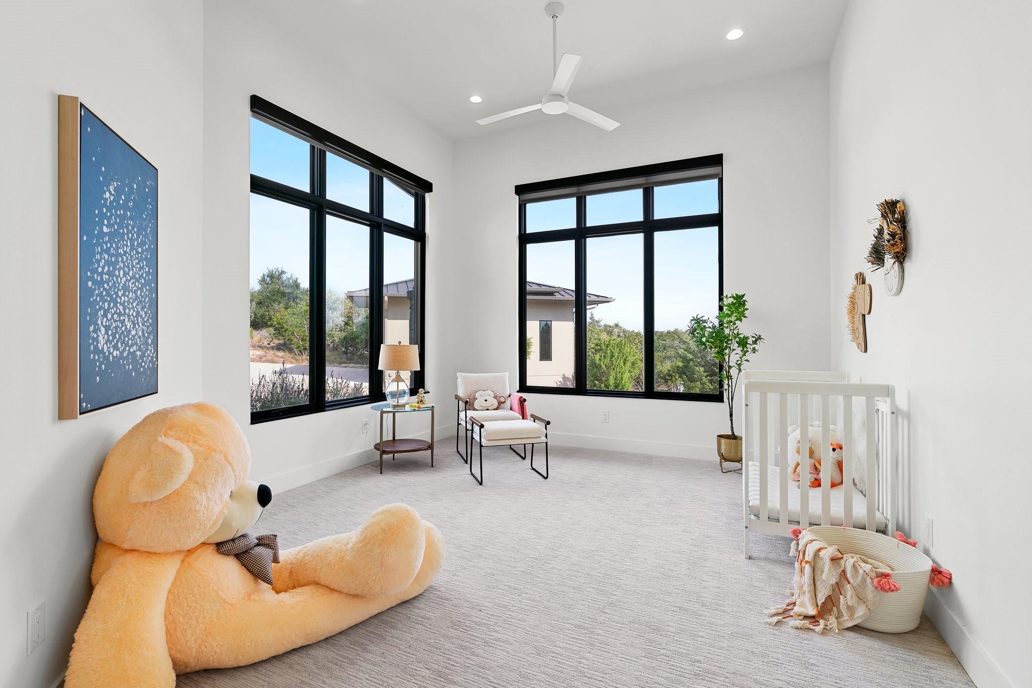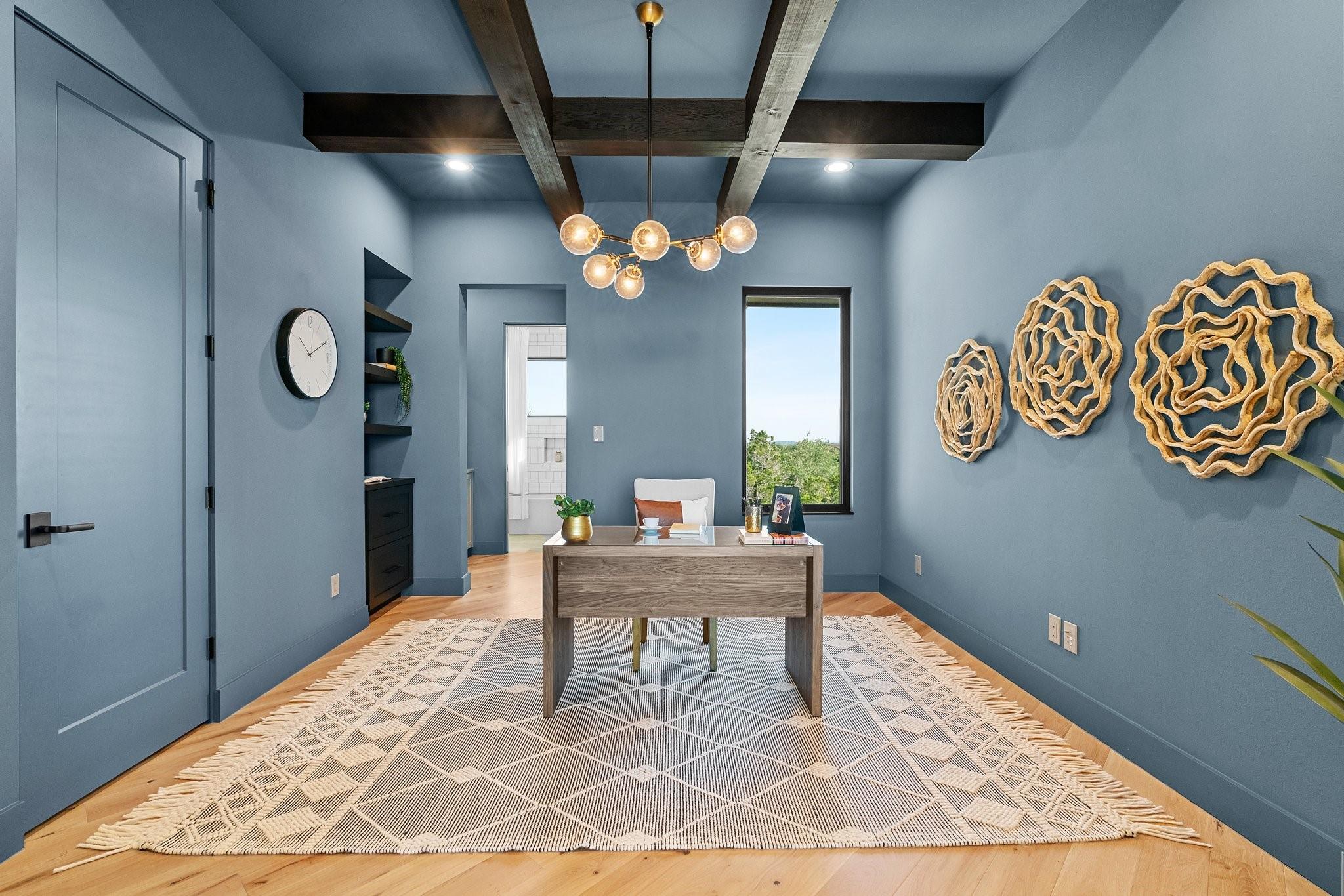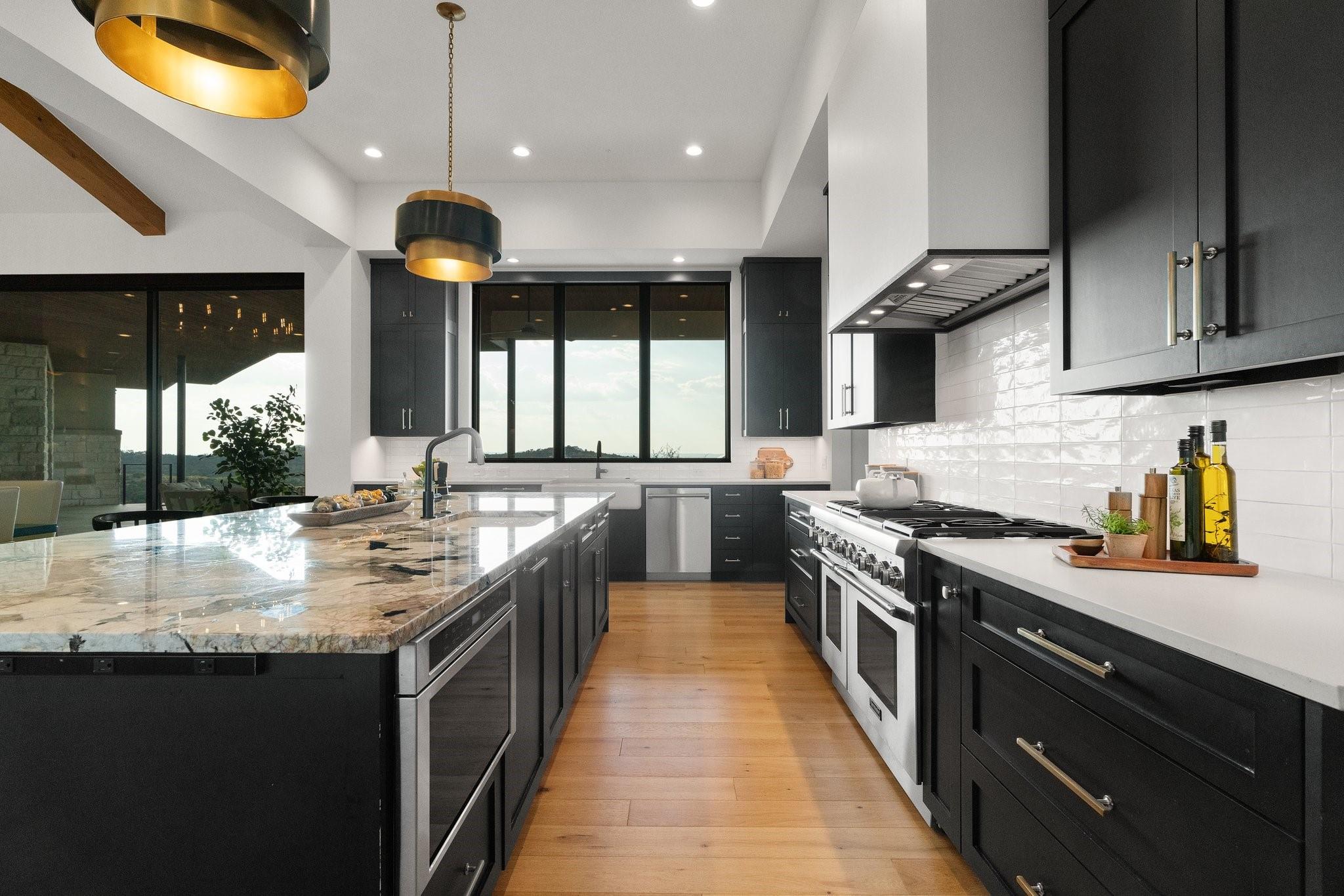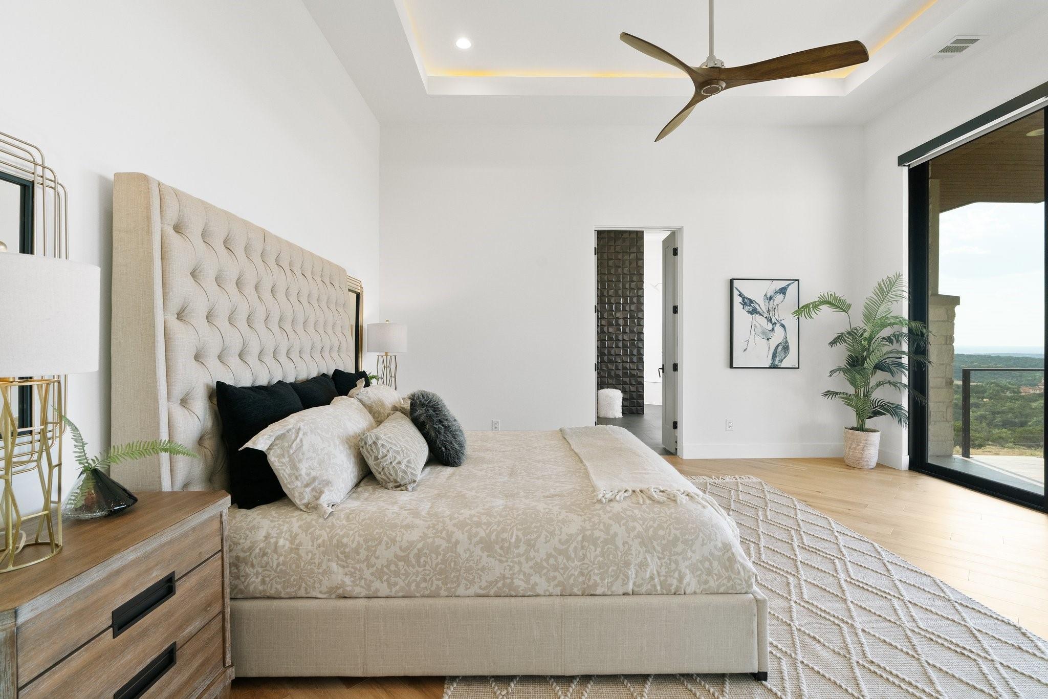 A stunning modern masterpiece graciously nestled atop 28+ private acres with breathtaking panoramic views of the Texas Hill Country. Built in 2018 by the renowned John Siemering Custom Homes, this meticulously designed home beautifully blends bold and neutral tones, harmonizing with the natural surroundings while prioritizing comfort, functionality, and luxury. The open floor plan flows gracefully, boasting a luxurious main-level owner’s retreat, 2 secondary bedrooms, a dedicated study (or 4th downstairs bedroom), and an upper level 5th bedroom, full bath, and spacious additional living, game or media room. The brilliantly designed gourmet-style kitchen is the heart of this exquisite home and a culinary enthusiast's dream, featuring top-of-the-line Thermador appliances, custom black cabinetry with elegant brass hardware creating an eye-catching contrast against the crisp white walls and clean lines of the designer backsplash. The generous granite island serves as the centerpiece of this gorgeous kitchen, providing a dreamy space for cooking, entertaining and gathering with family and friends. The dining flows easily into the main living space further enhanced by soaring wood-beamed ceilings, white oak hardwood floors, a stunning fireplace with custom stone hearth and hand-crafted built-ins, adding warmth and refinement. Bathed in natural light with an abundance of windows and floor-to-ceiling glass doors, spectacular views of the tranquil rolling hills can be seen for miles and miles. Additional smart features include a deep water well, whole-house reverse osmosis + water purification system, 3 zoned HVACs, tankless water heaters, motorized shades, AV wiring, and highly-efficient foam insulation. Endless opportunities for further enhancements such as a pool, extended outdoor living spaces, a guesthouse, sport courts, barns, and more. Low tax rate. Dripping Springs ISD. Minutes to shopping, restaurants, schools, and Lake Travis. The best of Texas Hill Country living!