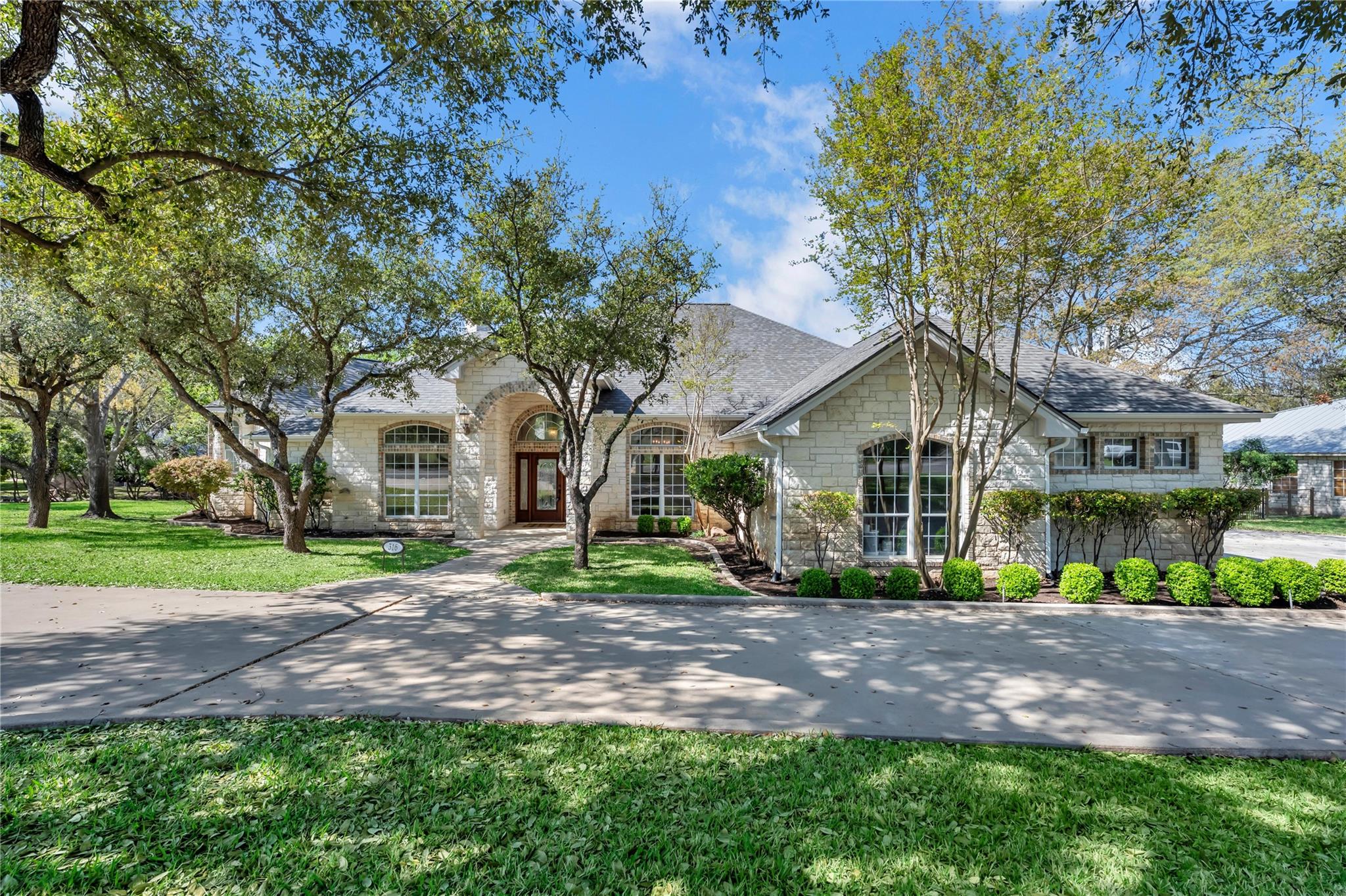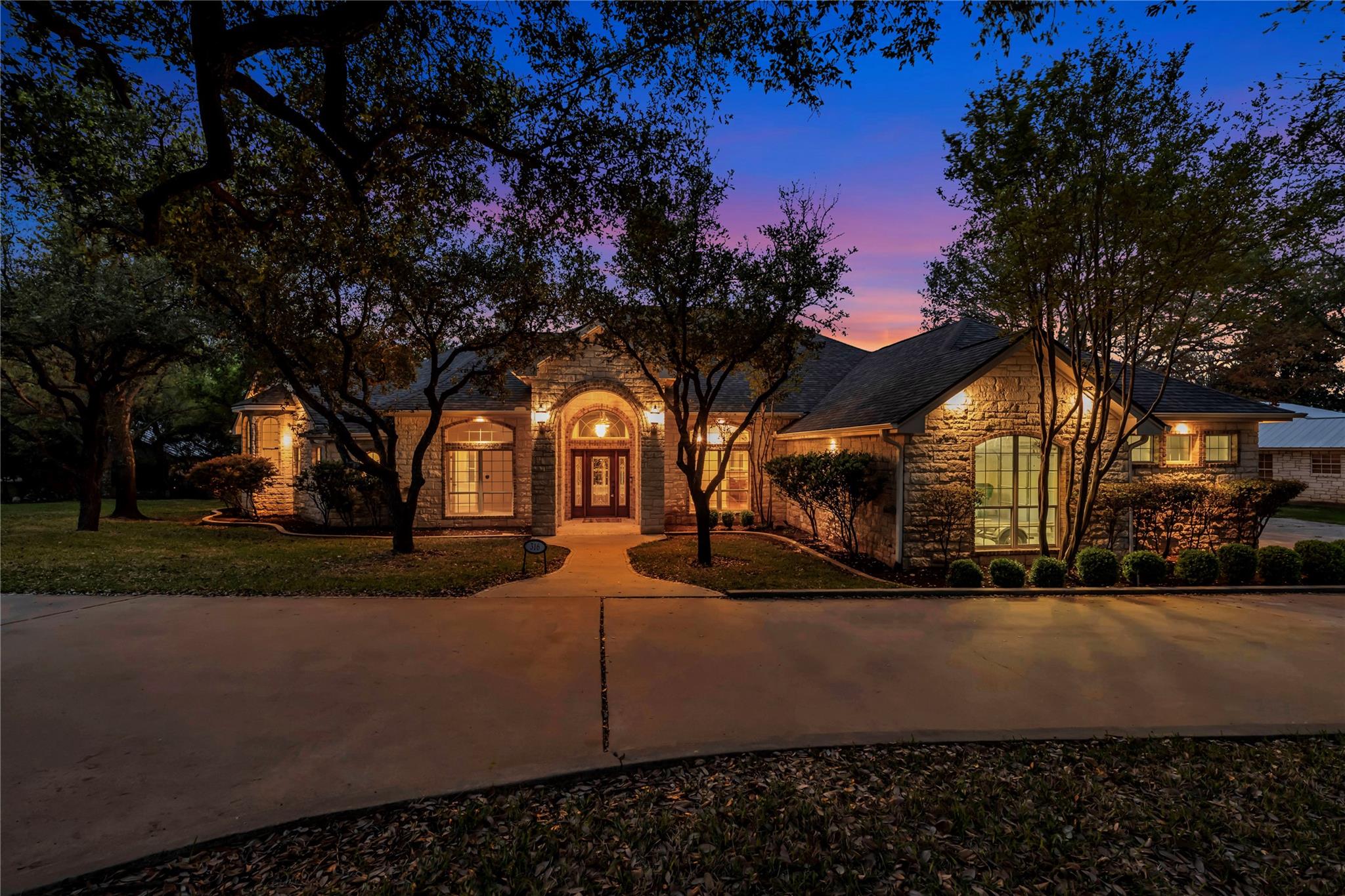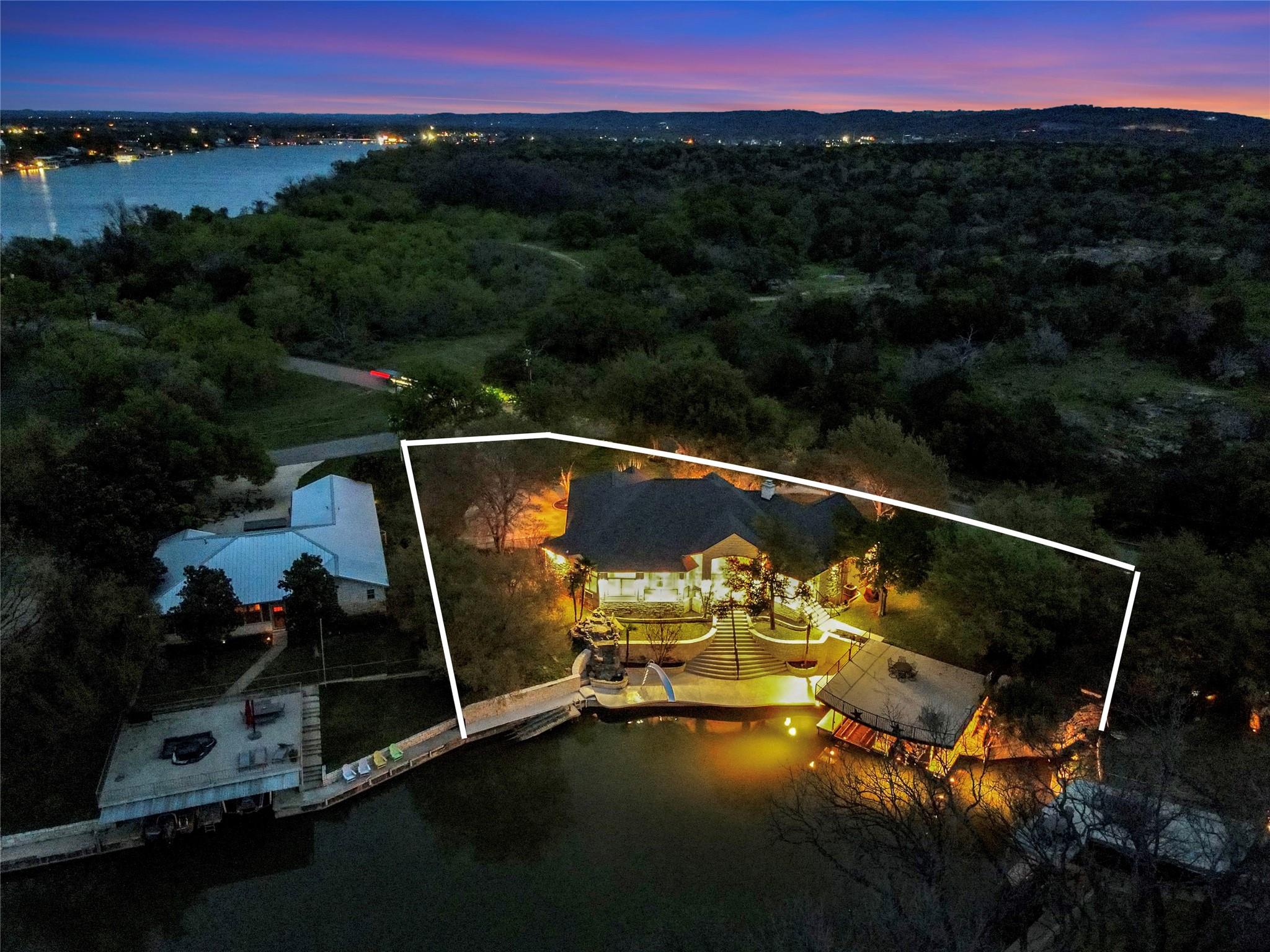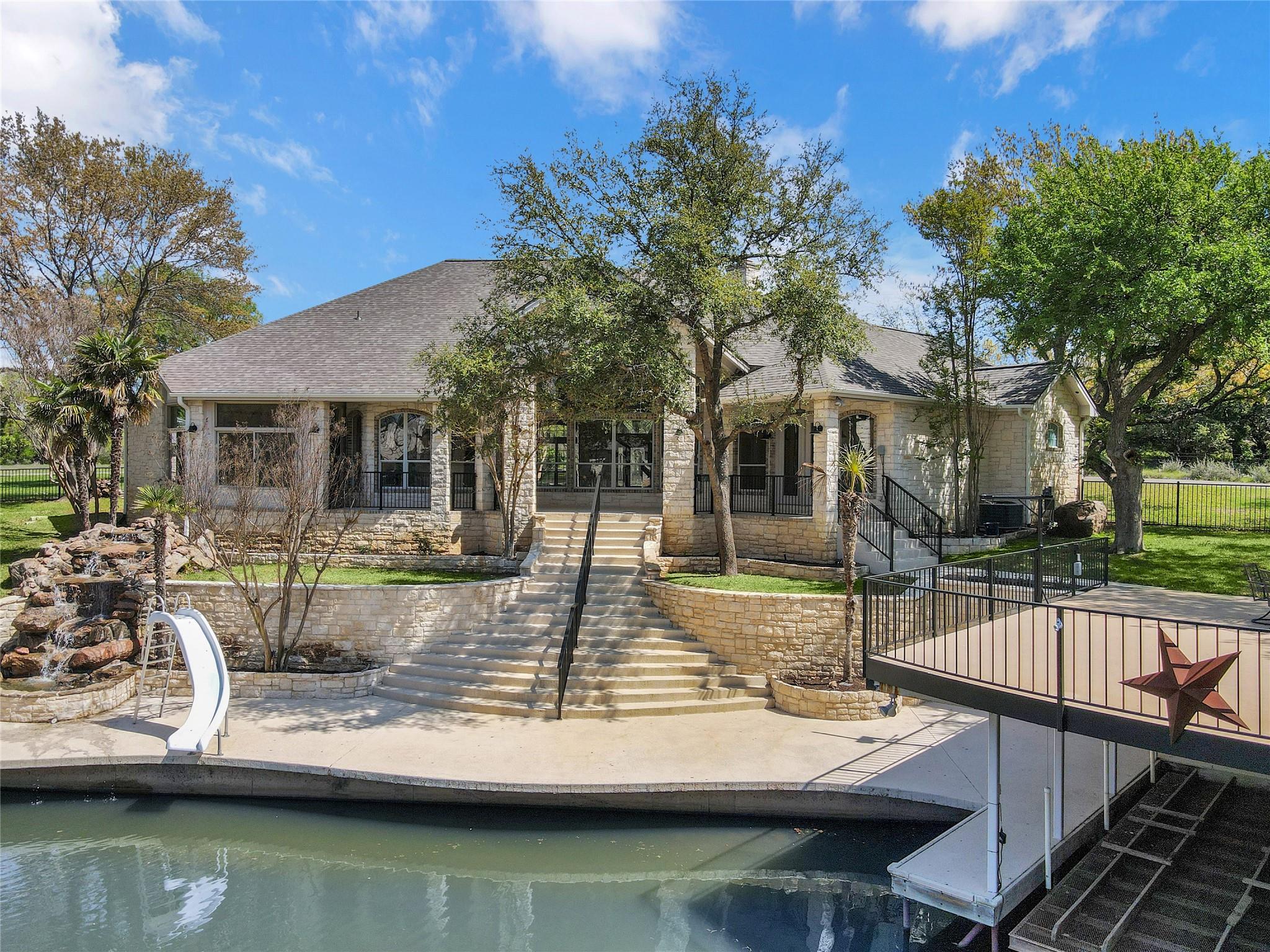 Welcome to the GRAND 316 Bridgepoint Dr on Lake LBJ! This property will capture your attention on the drive in through the quiet neighborhood, the driveway shaded with stunning mature trees! This property gives you enough space inside and out for all your family and guests from parking, bedrooms & outdoor living space! You are invited into the home by gorgeous custom rock work and soaring ceilings that showcase your lake view! With 122 ft of waterfront you have space for your personal boat dock with 2 electric boat lifts, large concrete patio upstairs, lots of deck area, large serene water fountain, water slide and jet ski ramp. The house recently got all new paint inside and out, new cool deck, all the metal painted, new carpet, new roof and gutters!