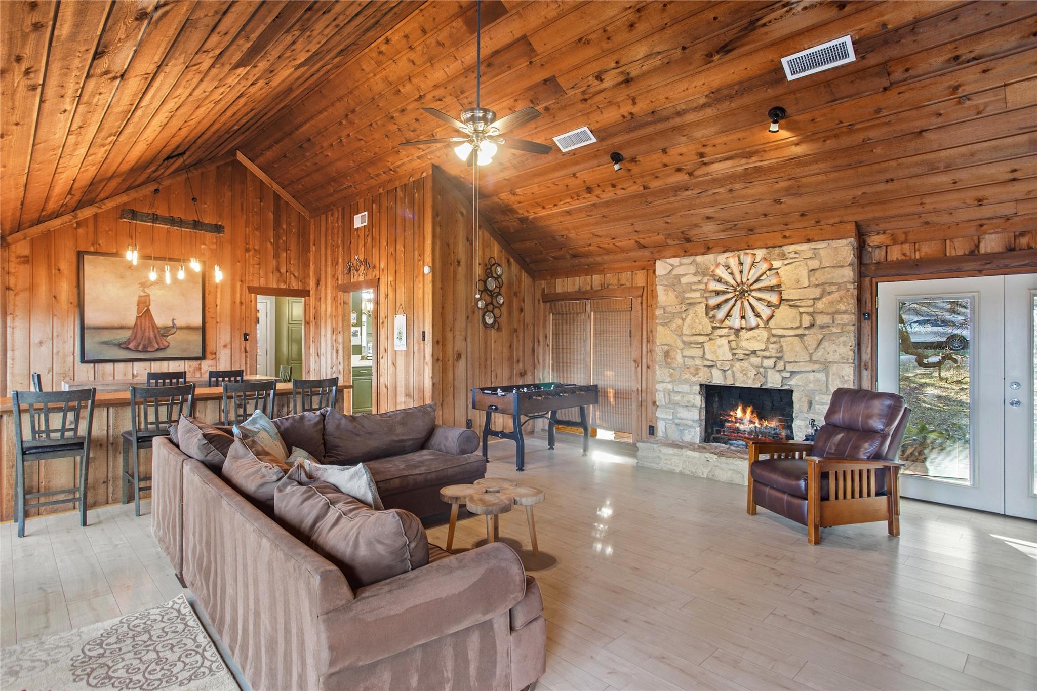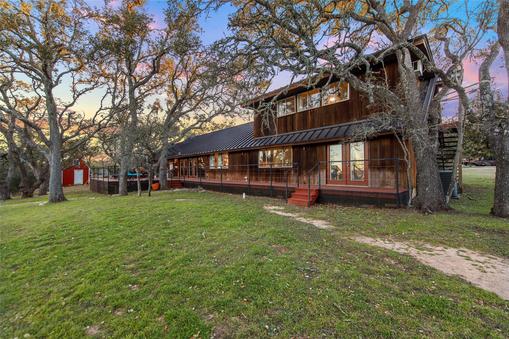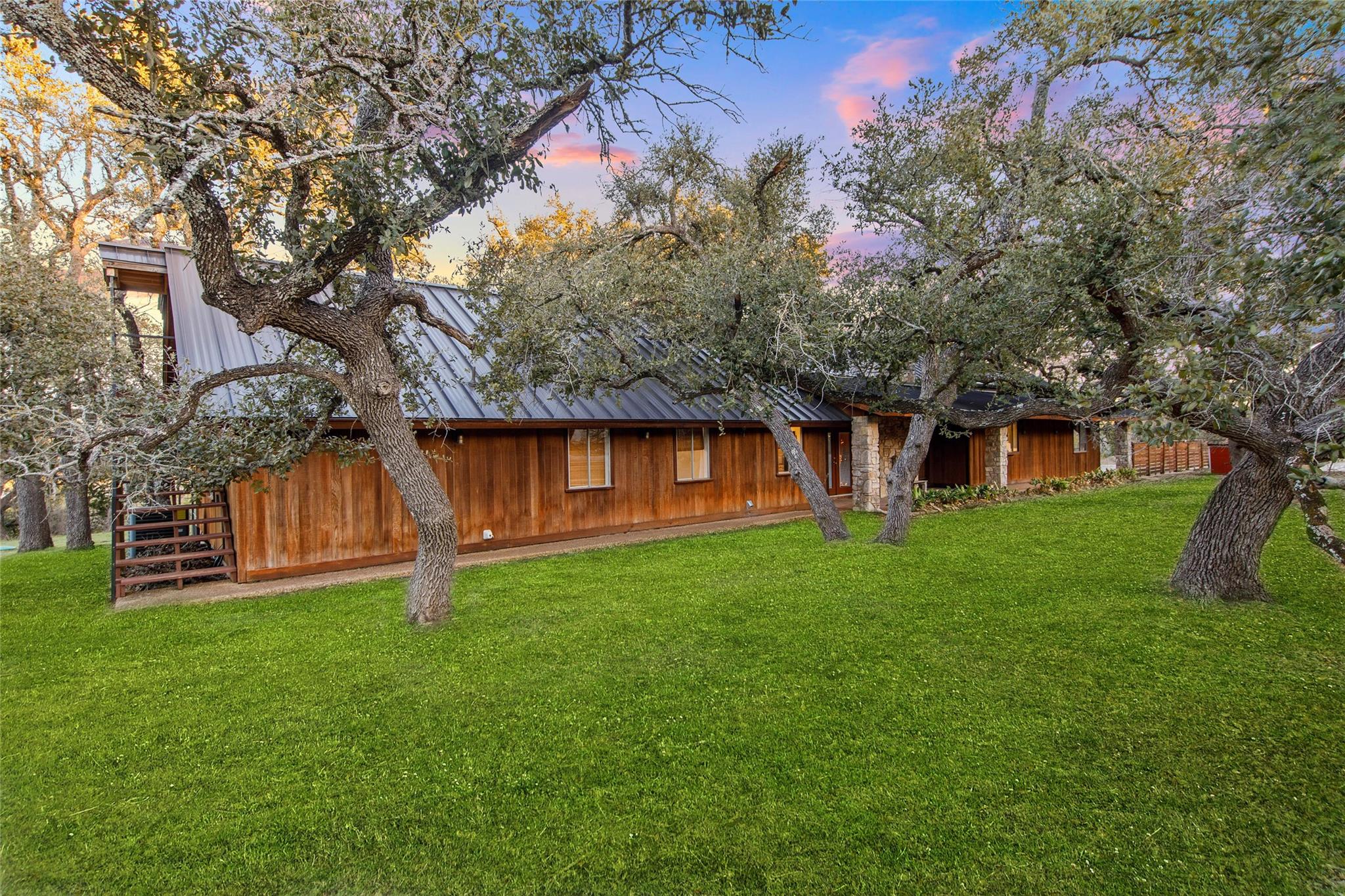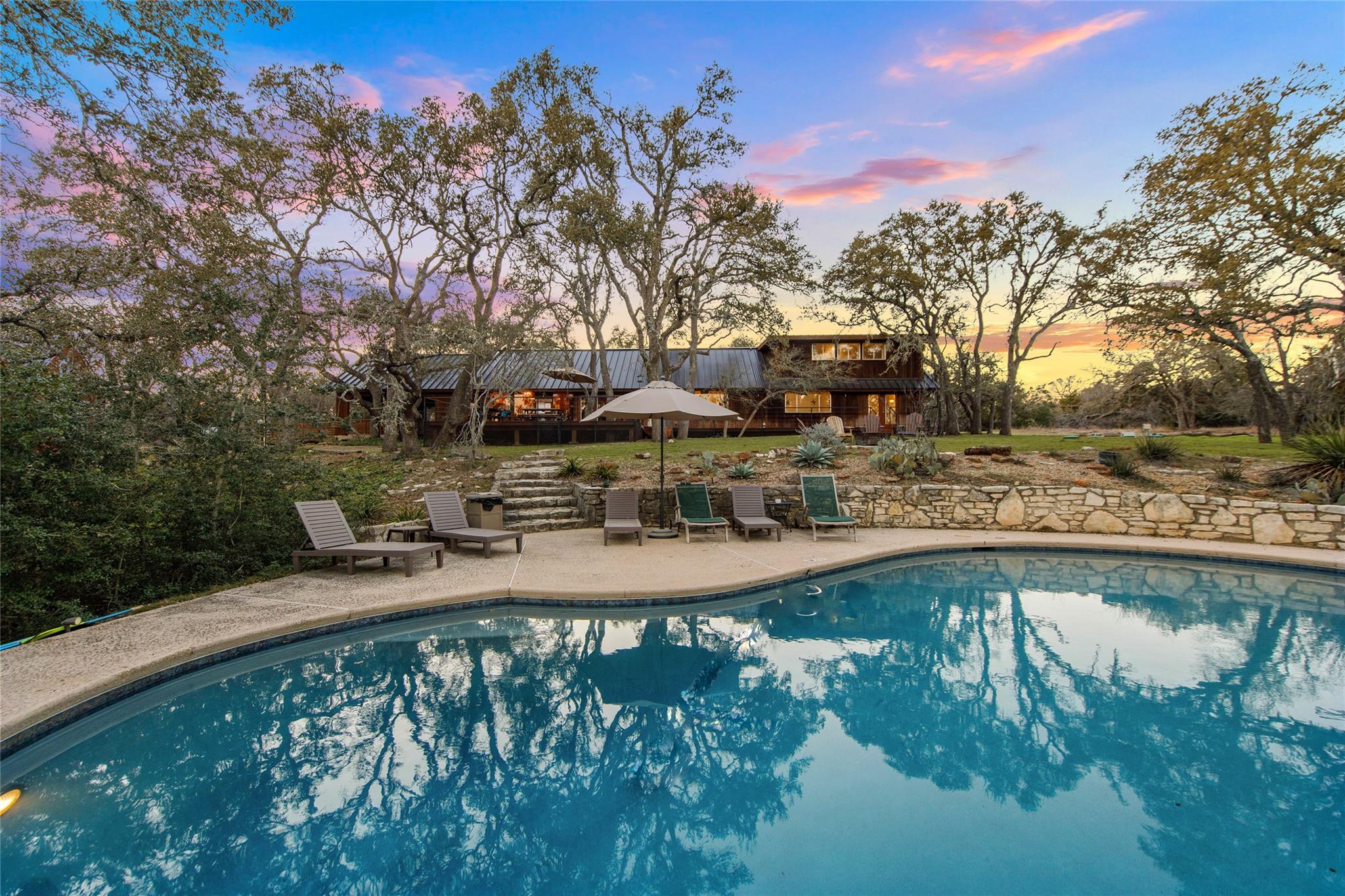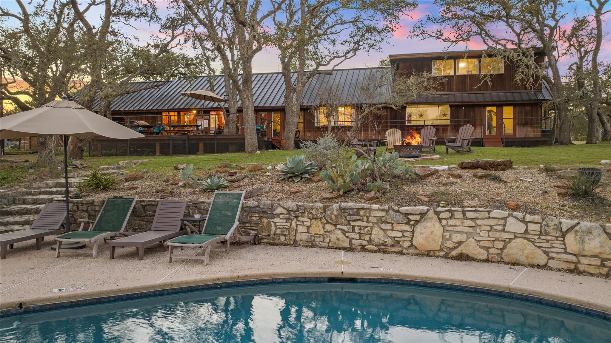 Commercial development opportunity on HWY 290!! Discover the allure of Dripping Springs with this rustic property, where country tranquility meets city accessibility. Just 28 minutes from vibrant Austin, it's your hill country getaway close to local dining, breweries and entertainment in Dripping Springs. Sitting on over 15 acres with varying topography and a wet weather creek, this retreat is ideal for nature lovers. The 2,378 sq ft home, built in 1972 and thoughtfully updated, features four bedrooms, three bathrooms, including an upstairs apartment with its own bath and kitchenette. A successful short-term rental, it comes fully furnished. The kitchen, bathed in natural light from a skylight and framed by heritage oak views, showcases olive green cabinets and a unique hand-painted backsplash. The adjoining dining and living space, with its limestone fireplace and cabin inspired wood paneled walls provides breathtaking Hill Country views and leads to the pool and outdoor dining areas. The home's freshly painted bedrooms and new flooring create a tranquil, modern vibe. The property also includes a fun-filled carport with games and various outdoor dining areas under majestic oaks, overlooking the pool and picturesque landscape. Outdoor features include a beautifully replastered pool, new deck railing, and inviting fire pit areas, ideal for stargazing under the dark skies. Recent improvements include a new metal roof, AC, flooring, pool enhancements, updated piping, a new well pump, and a maintained septic system. With no deed or zoning restrictions and significant HWY 290 frontage, this property is perfect for commercial development or entrepreneurial projects. Residential development schematic available also including proposed HWY 290 expansion. With this property having NO HOA, NO deed restrictions, and now out of the DS ETJ it's a commercial opportunity in the expanding area of Dripping Springs, between downtown Drip and Belterra Village.