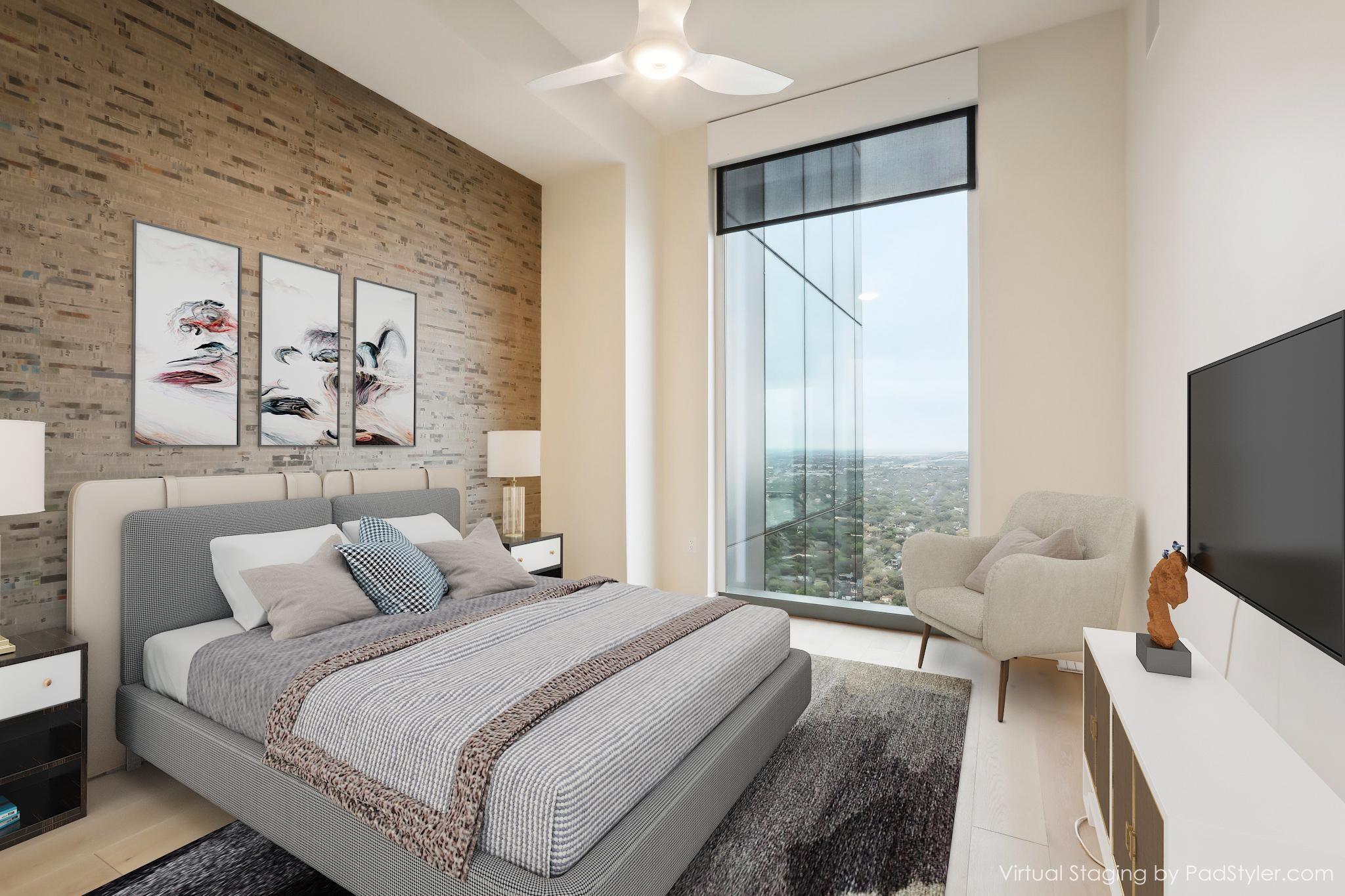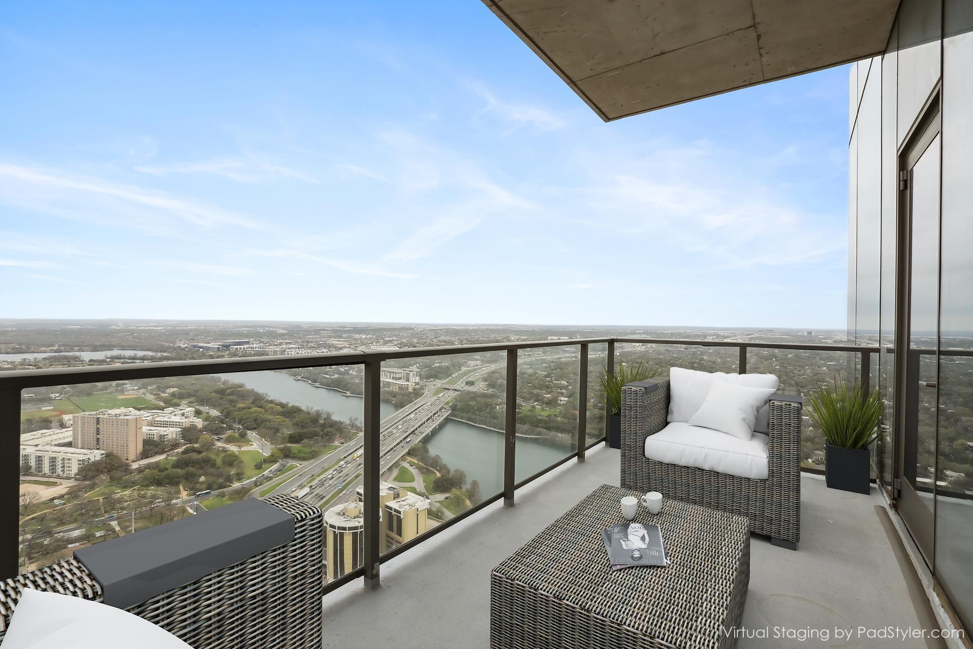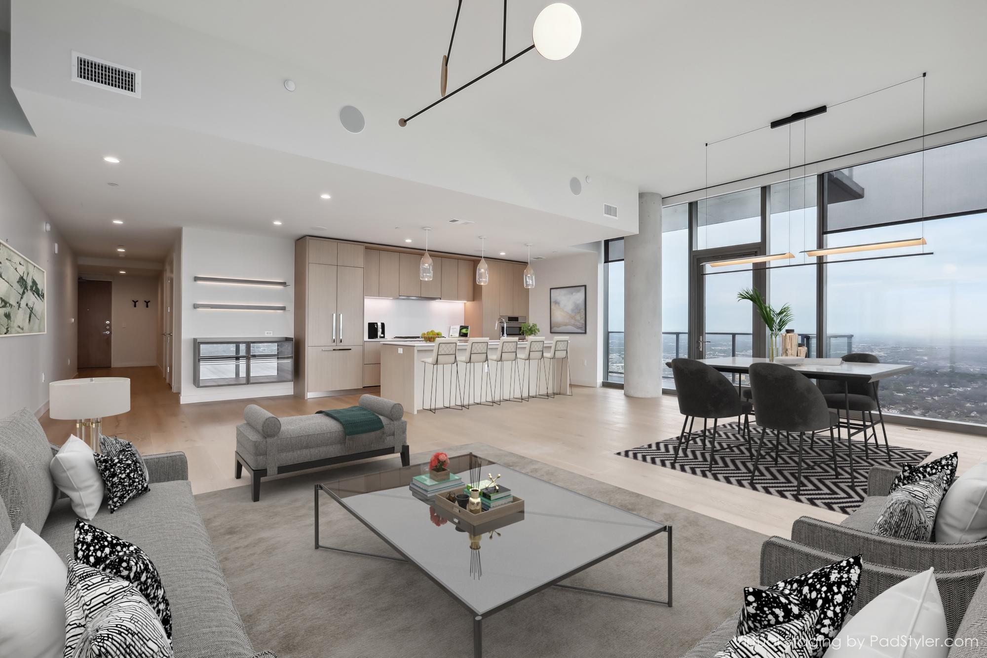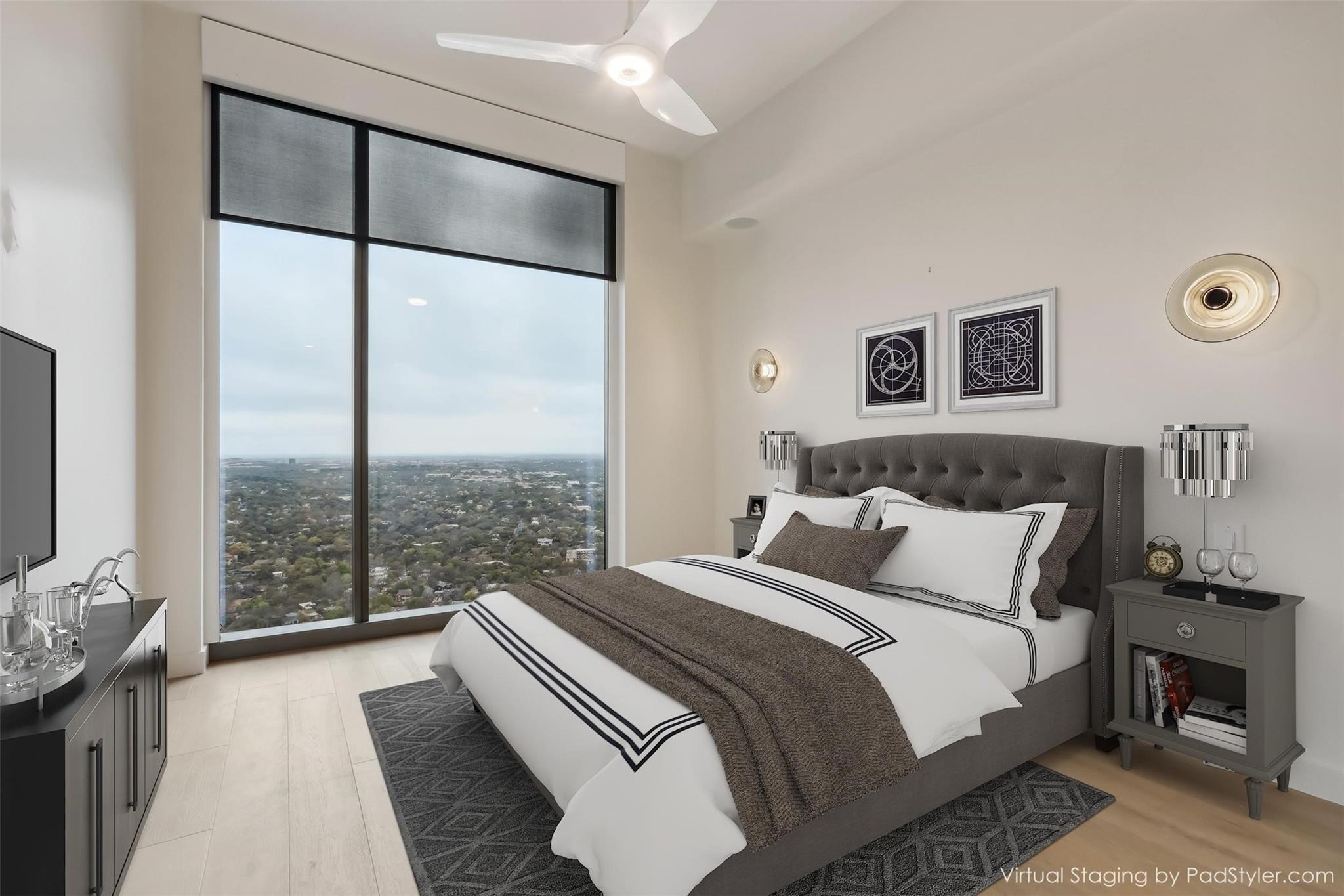 Stunning 180-degree panoramic view of Lady Bird Lake* Luxurious condo nestled at the end of Rainey St on the shores of Lady Bird Lake*3 bedroom/3 full baths*Sleek quartz counter tops, Italian cabinetry with soft close* Paneled dishwasher & built in refrigerator & under-counter Thermador wine fridge*Smart full home technology including automated solar shades, lighting, door locks, video door bell, and integrated Sonos audio system in every room*Perched on the 44th floor* 4406 includes 2 parking spaces with a rare EV charger.* White oak wood floors* The building offers exceptional amenities that encompass 13,000 sq ft of communal spaces on the 11th and 37th floors
