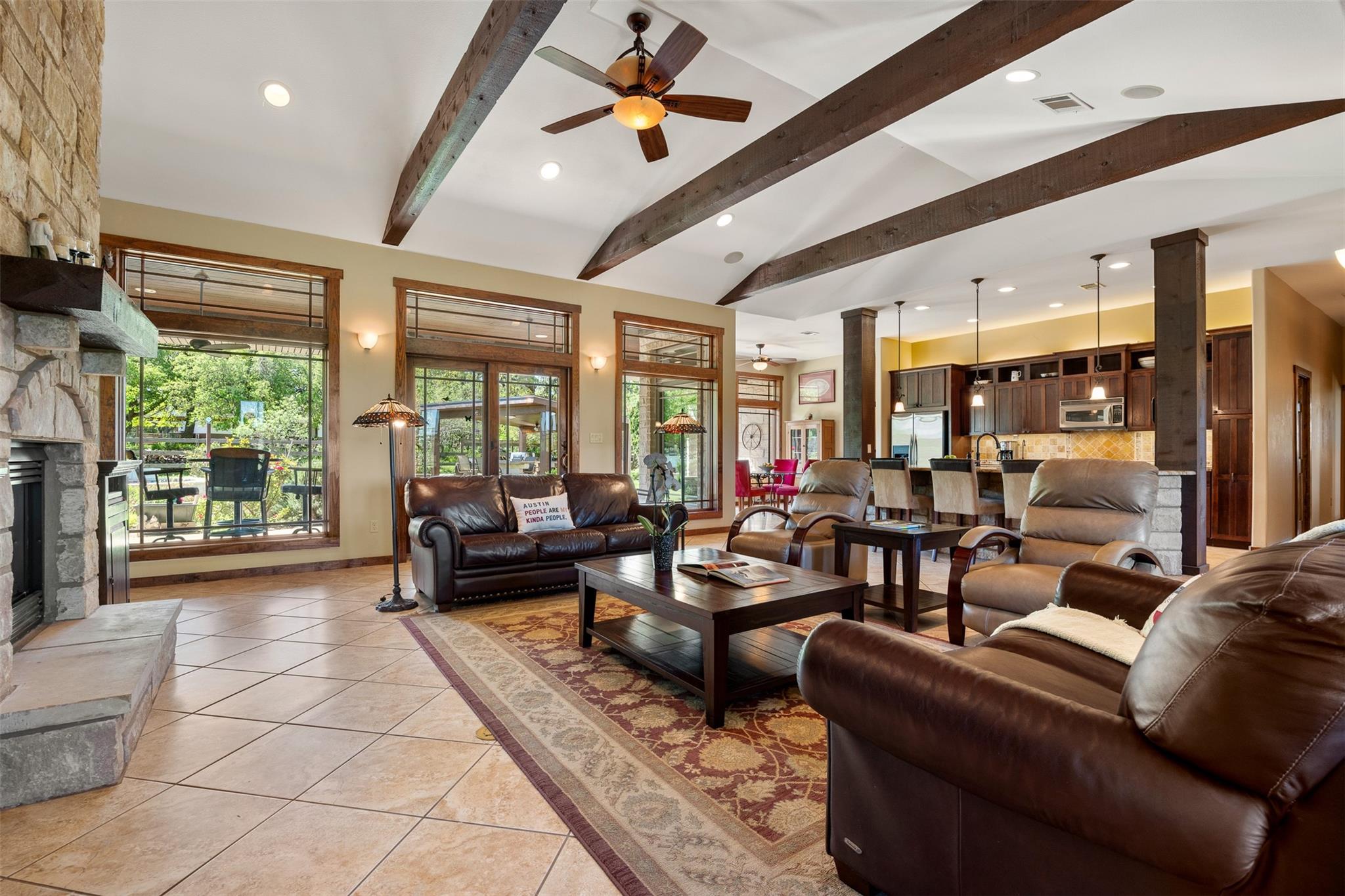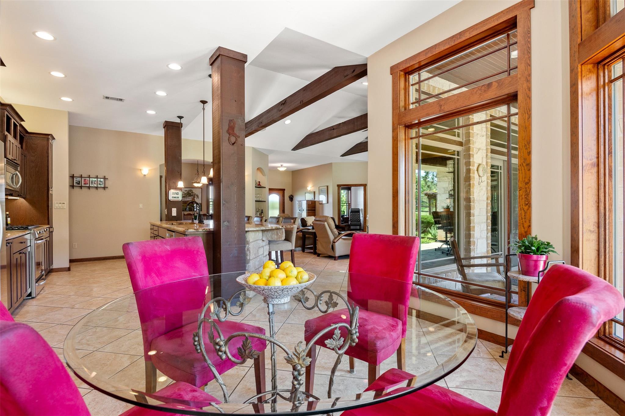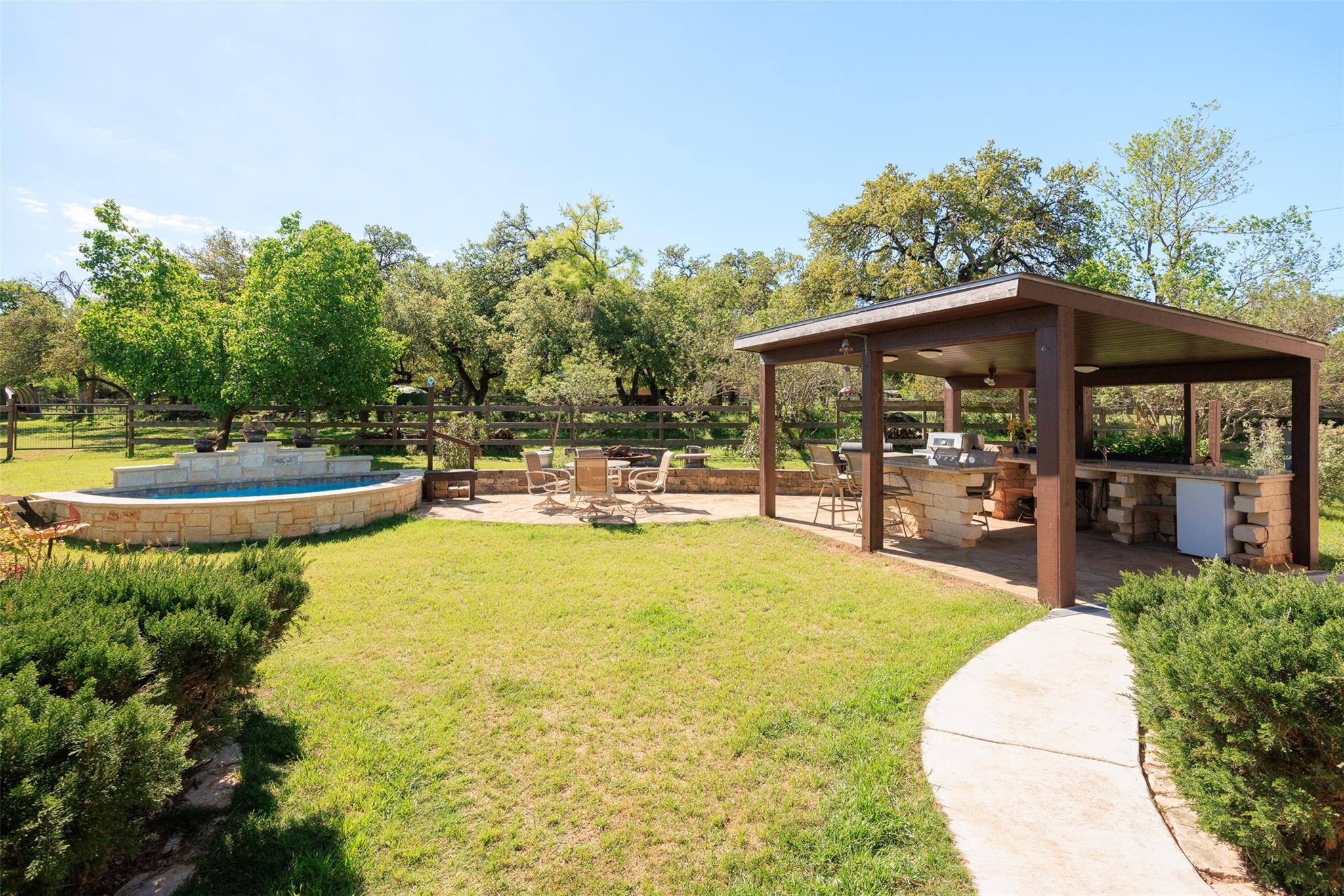 Experience the beauty and serenity of peaceful Texas Hill Country living tucked away from busy roads, along with easy access to in-town conveniences in under 3 miles with Ag Exemption! This wonderful single-level home on generous scenic grounds rests in desirable Dripping Springs and offers an exceptional lifestyle. Complementing the expansive main residence is an income-generating attached vacation rental suite, with its own separate entrance and dedicated electric meter. Total square footage is 3,520, with 4 bedrooms and 3.5 bathrooms. Heightening the appeal are large front and rear porches for taking in the views, covered/uncovered patios plus an outdoor kitchen for entertaining, a heated outdoor soaking pool, and an oversized garage for your vehicles. Beyond double front doors await elegant interiors accented by high vaulted ceilings with wood beams, huge sun-filled windows, lovely tile flooring, and rich wood trim adding warmth throughout. The spacious living room is a dream space for the host with a built-in bar area and an adjoining formal dining room. The open chef’s kitchen is finely appointed with ample wood cabinetry, stainless steel appliances, and a large stone and granite island providing extra seating. A charming breakfast nook makes a perfect spot for morning coffee and casual meals. Nearby is a sizable pantry, half bath, and full laundry room. From the living room, glass doors open to the rear oasis for effortless indoor/outdoor living. The private primary bedroom suite is a tranquil retreat offering access to the patio and yard, a huge walk-in closet, and spa-like bath with dual sinks, soaking tub and shower. Two additional bedrooms sit on the opposite side of the house, flanking a full hall bath. Other highlights include a handsome office for working remotely, central AC & heat, and a water storage tank. The excellent location is close to town amenities and in the highly acclaimed DSISD. See documents for personal property that conveys.