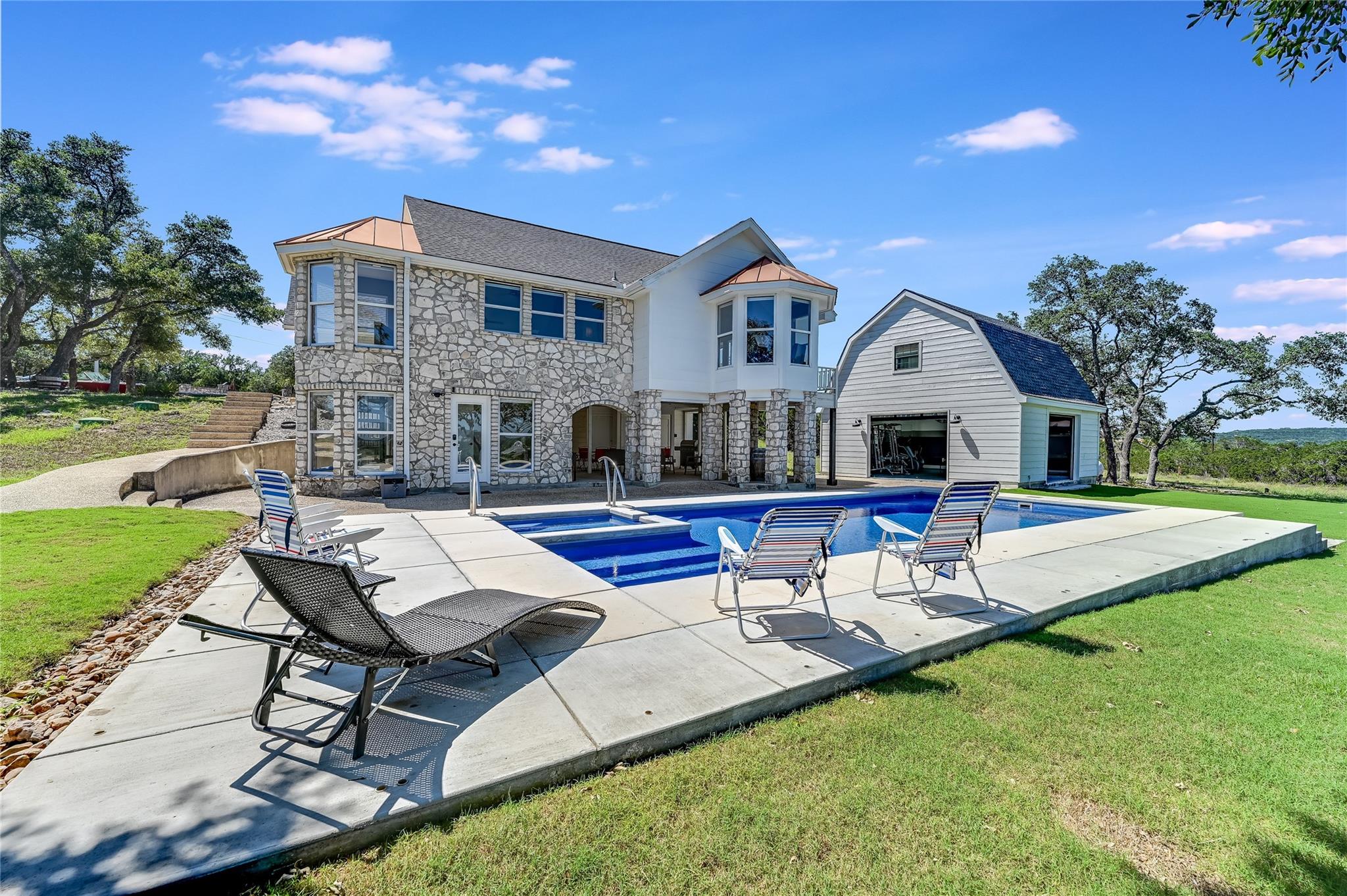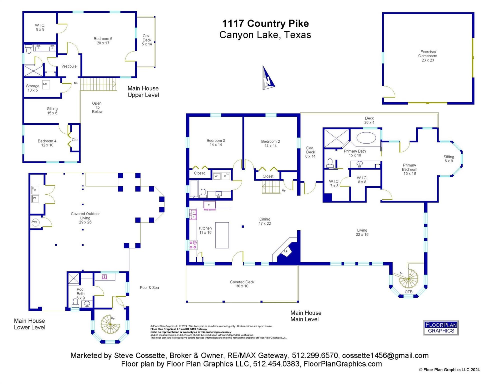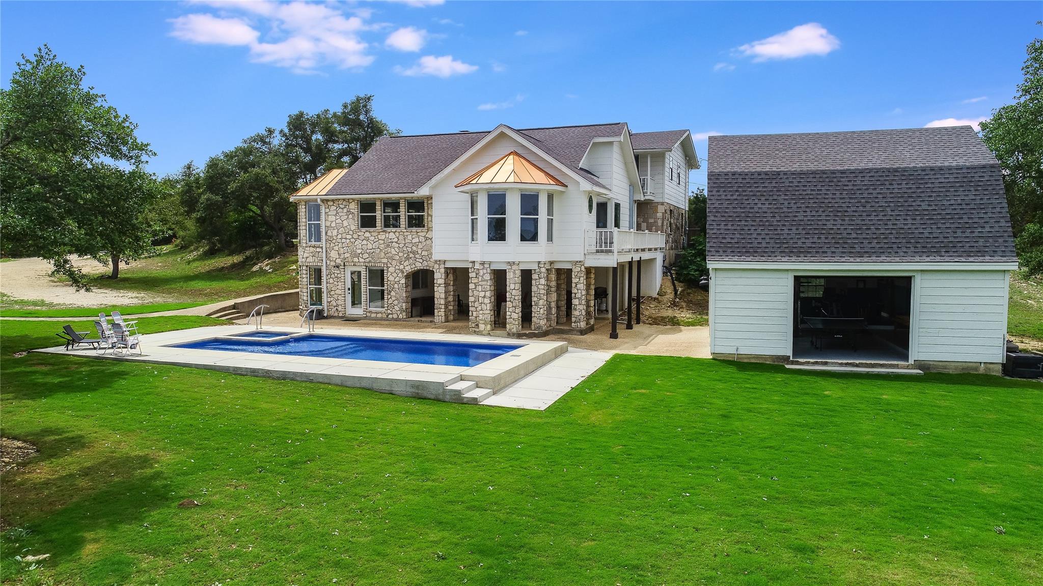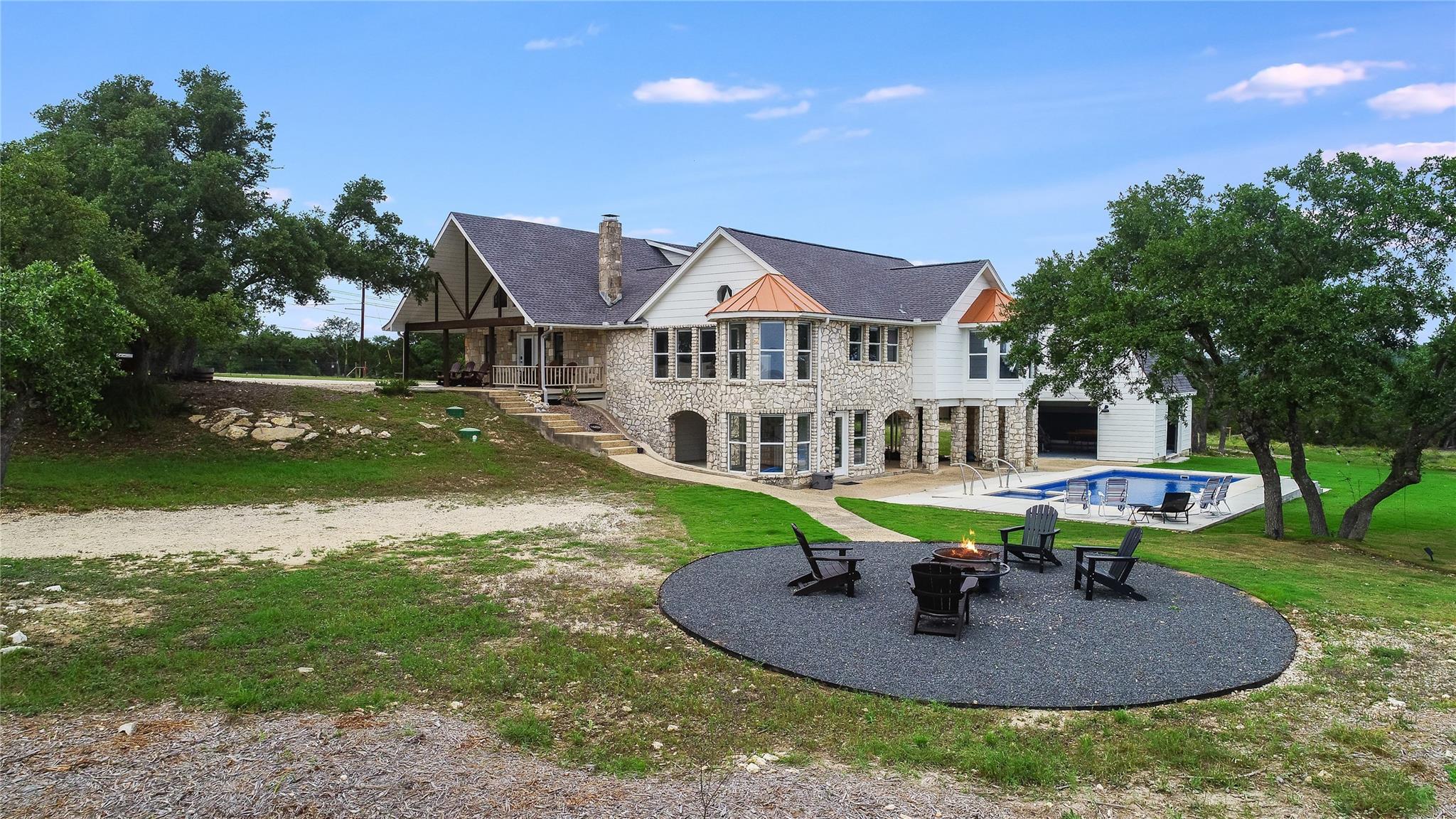 TRIPLE PLAY: Purchase any combination or all three houses together, each on 5+ UNRESTRICTED acres, totaling approximately 16.1 contiguous acres. FIRST: 1065 Country Pike features a 4bd, 3bath, single-story home roughly 2403 sqft with a resort-style pool overlooking Canyon Lake. SECOND: 1117 Country Pike offers a 5bd, 4 bath, over 3600 sqft home, recently remodeled and fully furnished for short-term rentals, including a resort-style pool and a detached fitness & game room. THIRD: 1193 Country Pike, a new modern luxury home on 5+ acres, nearing the end of construction, with 4 bd, 4.5 bath, a 3-car garage, and an estimated 3456 sqft, complete with a landscaping allowance. All properties boast stunning panoramic views of the Hill Country and Canyon Lake. Situated in the heart of the Hill Country, they are ideally located between San Antonio and Austin, close to Wimberley, historic Gruene Hall, New Braunfels and Canyon Lake Marina. These homes present a unique opportunity for luxury living, short-term rentals and/or vacation homes. Also available is a lot in The Enclave, which includes access to amenities and 28-acre private waterfront park, a boat AND slip at Canyon Lake Marina, and/or a T-Hangar at the adjacent Canyon Lake Airport, so you and friends may fly in for a huge recreational weekend. The properties also hold potential for additional subdivision and development, inviting inquiries from investors.