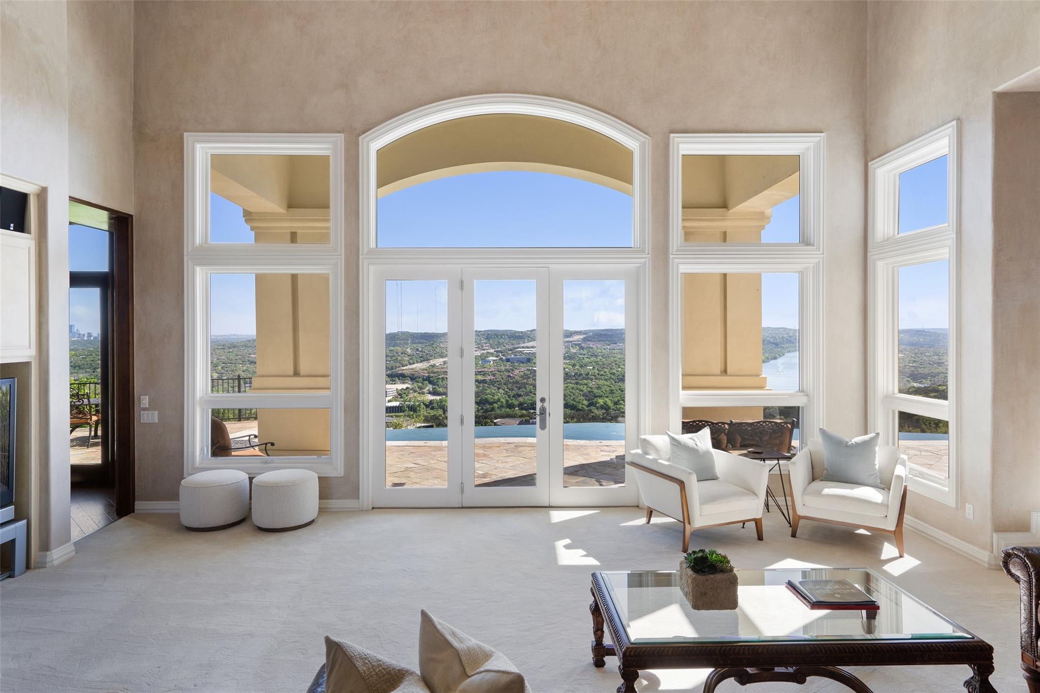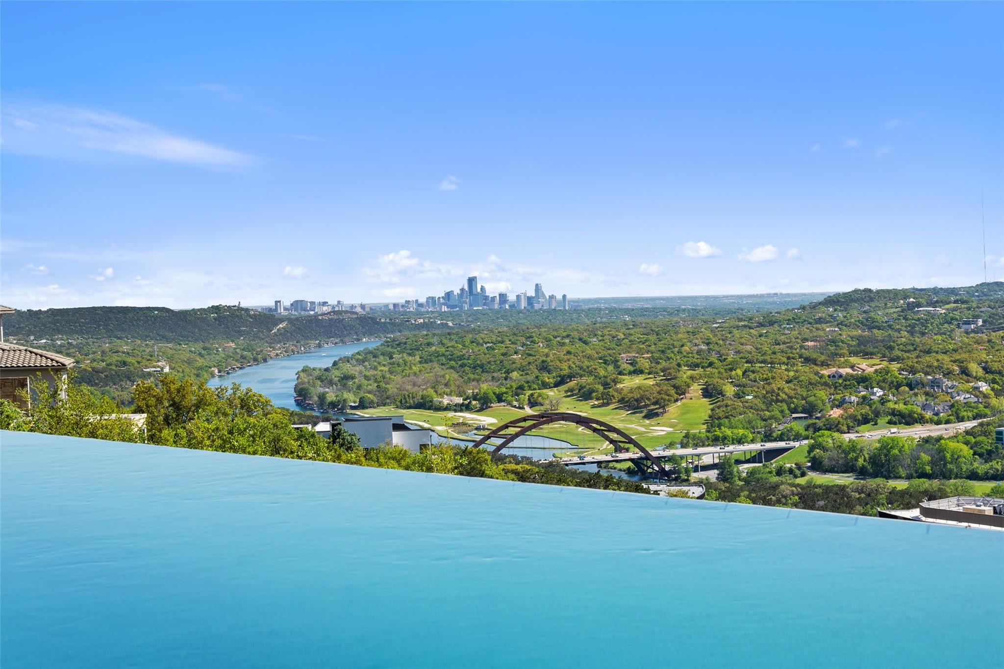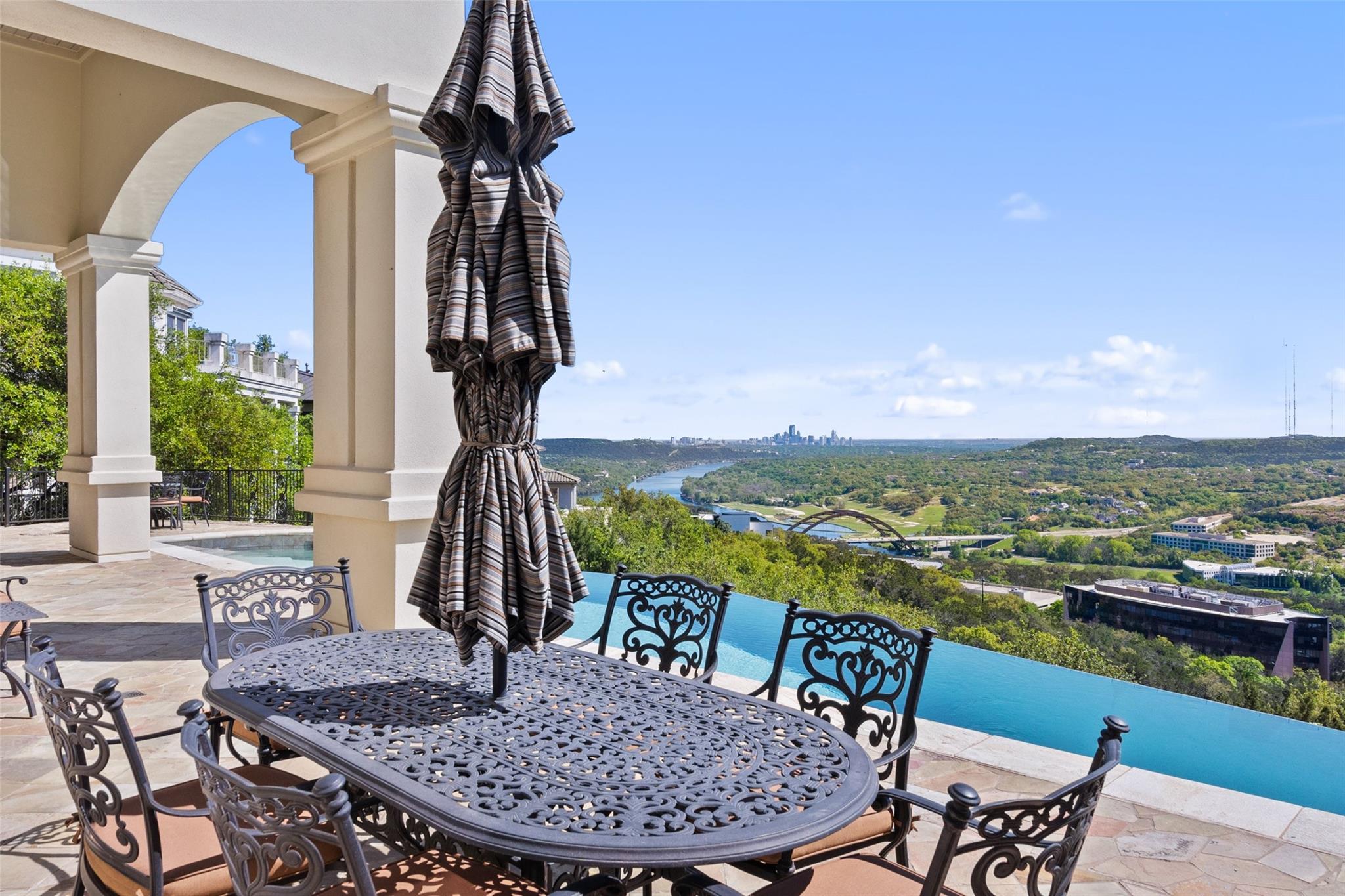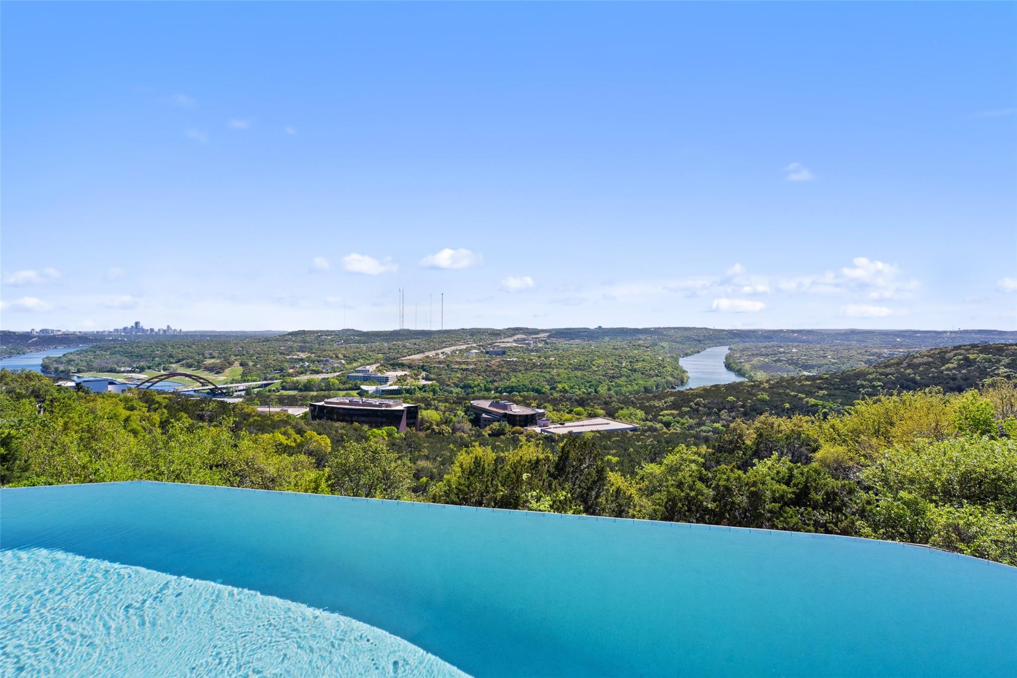 Positioned at the top of Shepherd Mountain with astonishing unobstructed views of Lake Austin, downtown Austin and the surrounding landscape, this Mediterranean-style home is a one-of-a-kind setting for a luxurious, romantic lifestyle. Impeccably maintained by the original owner, the home features refined finishes and custom touches throughout. As you drive through the gates and step inside, you’ll discover three ensuite bedrooms and soaring 20-foot-plus ceilings on the first floor, providing ample space for gracious living. Abundant windows offer natural light and showstopping views, with a main living area that opens up to the patio for seamless indoor-outdoor entertaining. From the patio and infinity pool, take in 180-degree panoramic vistas of Lake Austin, the Pennybacker Bridge and the lush Austin Country Club golf course, with the city just beyond. The main level also features a gourmet kitchen with ample storage, coffee bar and large walk-in pantry, a dining room with sunlit ambience, and a traditional study with rich wood trim and large windows to look out over the scenery. Ascend the elegant spiral staircase to the second level, where the primary suite offers 900-plus square feet of luxury. The primary suite has been designed to prioritize the far-reaching views, and includes a fireplace and sitting area, two large walk-in closets, a coffee bar with refrigerator, and a primary bathroom clad in hand-cut Italian tile. This exceptional residence offers an enticing alternative to the forthcoming Four Seasons on Lake Austin, presenting unparalleled views without the wait. With easy access to Loop 360, adventure through Austin is just moments away. Don’t miss this opportunity to embrace a truly extraordinary lifestyle in one of Austin’s most iconic locations.