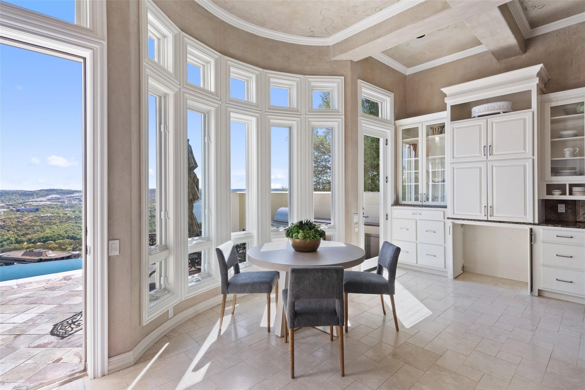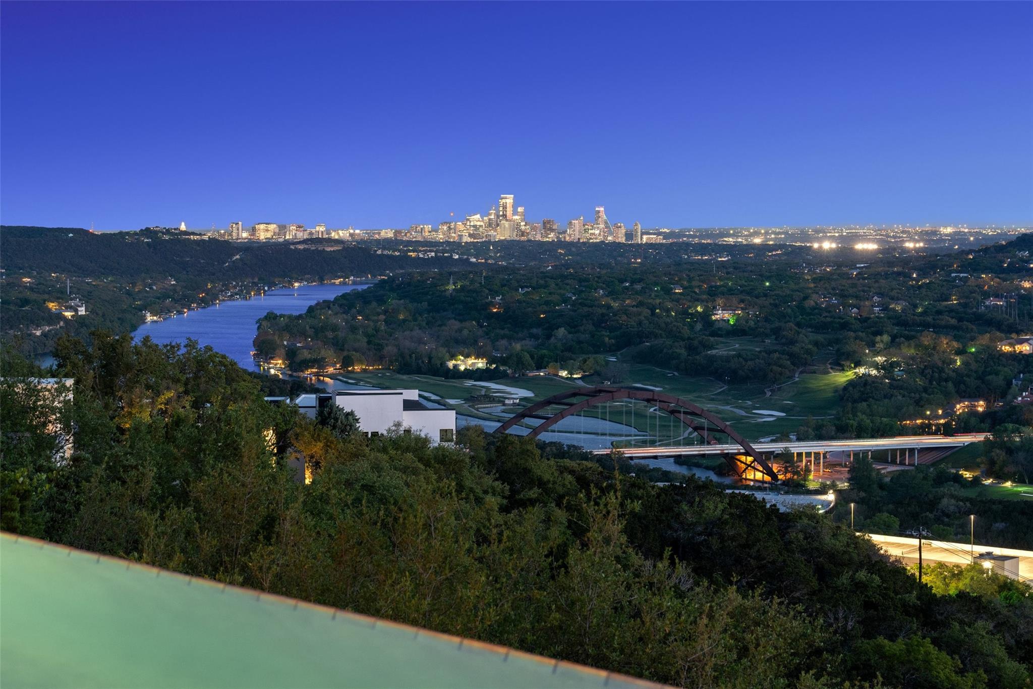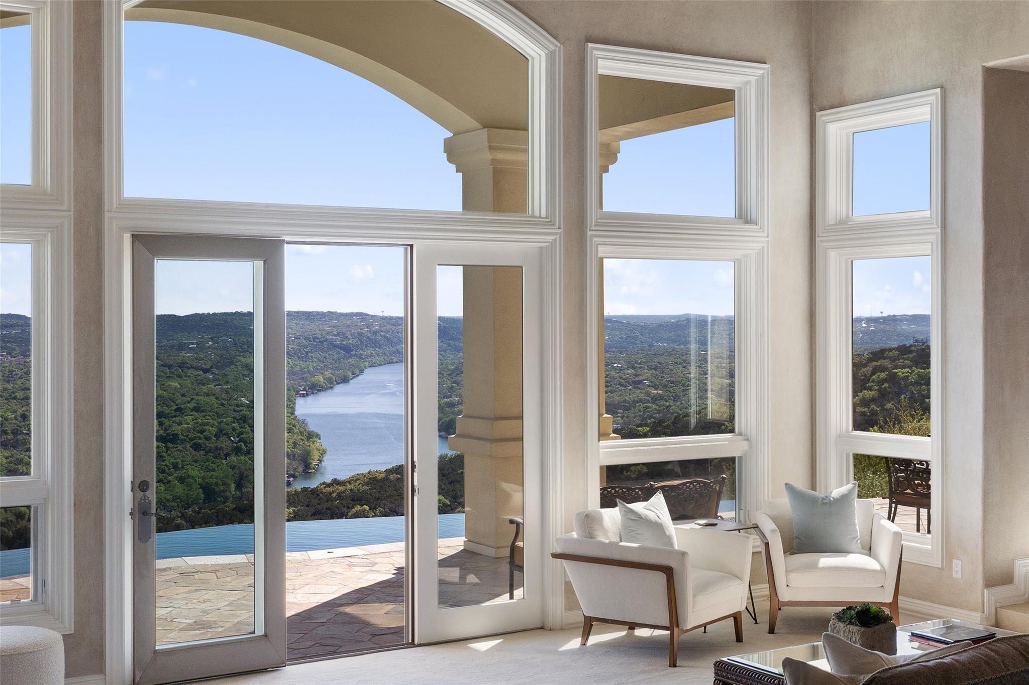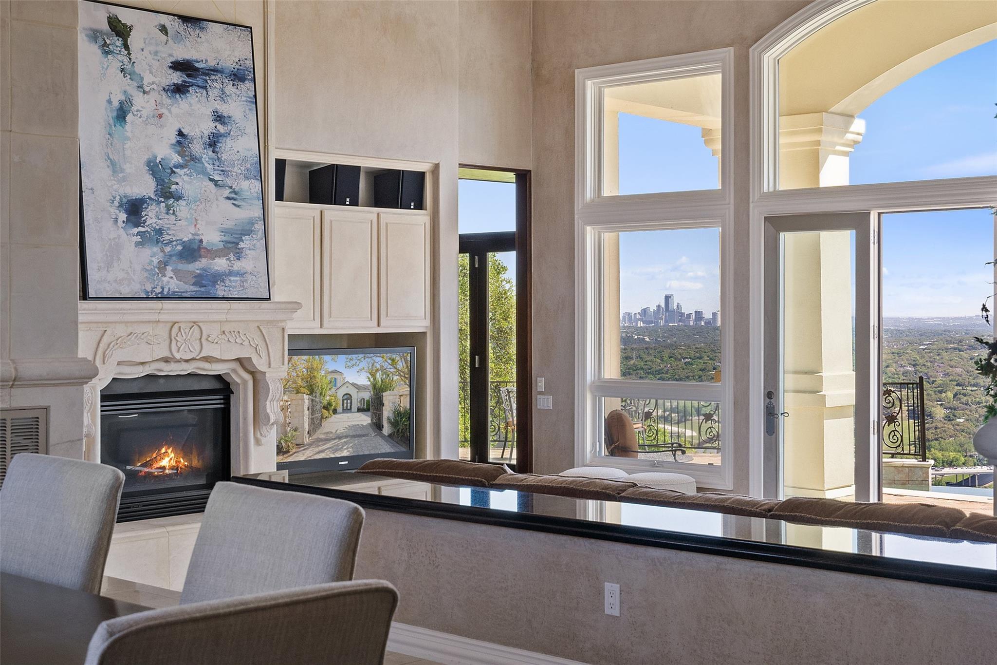 Positioned at the top of Shepherd Mountain with astonishing unobstructed views of Lake Austin, downtown Austin and the surrounding landscape, this Mediterranean-style home is a one-of-a-kind setting for a luxurious, romantic lifestyle. Impeccably maintained by the original owner, the home features refined finishes and custom touches throughout. As you drive through the gates and step inside, you’ll discover three ensuite bedrooms and soaring 20-foot-plus ceilings on the first floor, providing ample space for gracious living. Abundant windows offer natural light and showstopping views, with a main living area that opens up to the patio for seamless indoor-outdoor entertaining. From the patio and infinity pool, take in 180-degree panoramic vistas of Lake Austin, the Pennybacker Bridge and the lush Austin Country Club golf course, with the city just beyond. The main level also features a gourmet kitchen with ample storage, coffee bar and large walk-in pantry, a dining room with sunlit ambience, and a traditional study with rich wood trim and large windows to look out over the scenery. Ascend the elegant spiral staircase to the second level, where the primary suite offers 900-plus square feet of luxury. The primary suite has been designed to prioritize the far-reaching views, and includes a fireplace and sitting area, two large walk-in closets, a coffee bar with refrigerator, and a primary bathroom clad in hand-cut Italian tile. This exceptional residence offers an enticing alternative to the forthcoming Four Seasons on Lake Austin, presenting unparalleled views without the wait. With easy access to Loop 360, adventure through Austin is just moments away. Don’t miss this opportunity to embrace a truly extraordinary lifestyle in one of Austin’s most iconic locations.