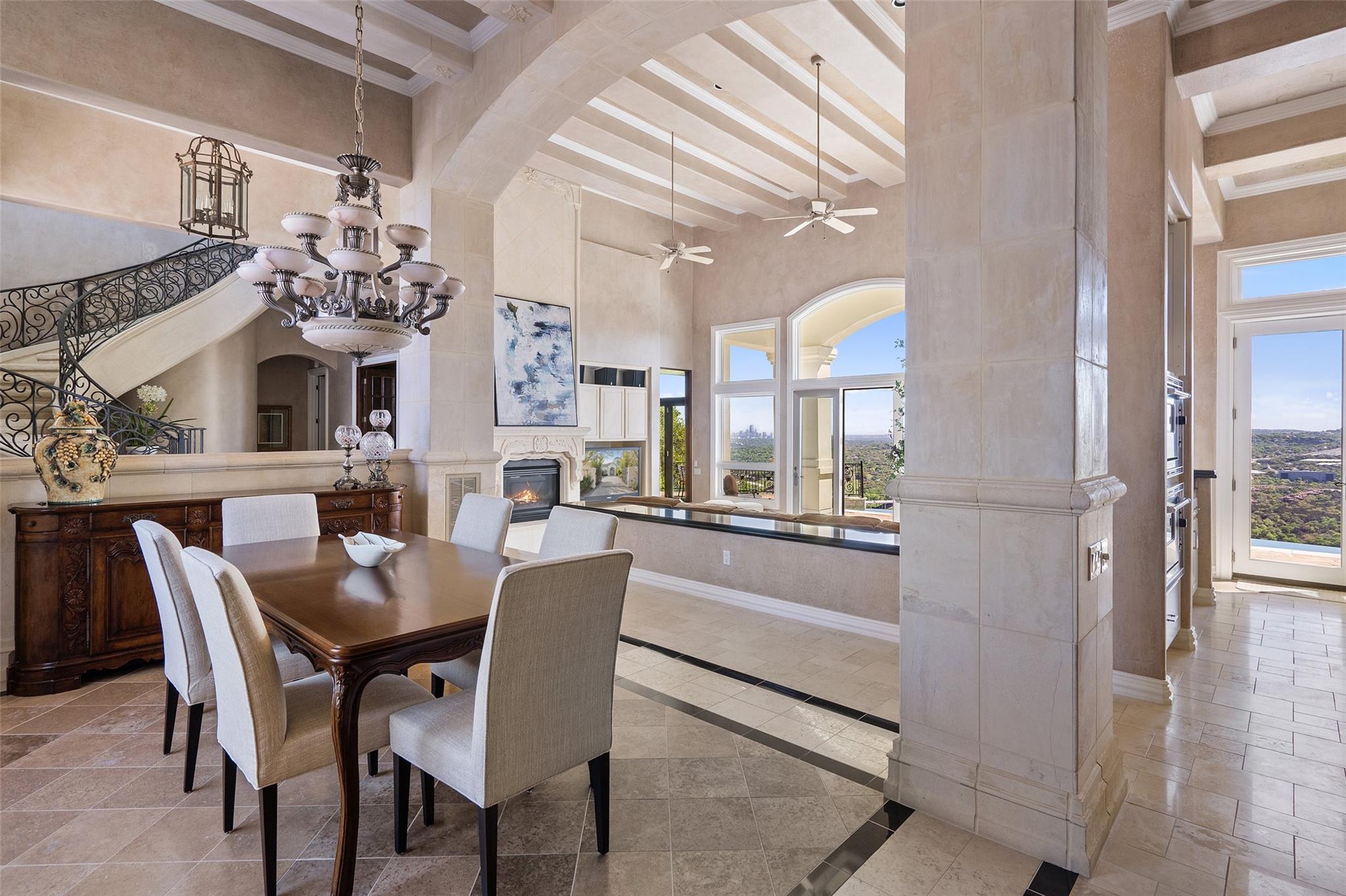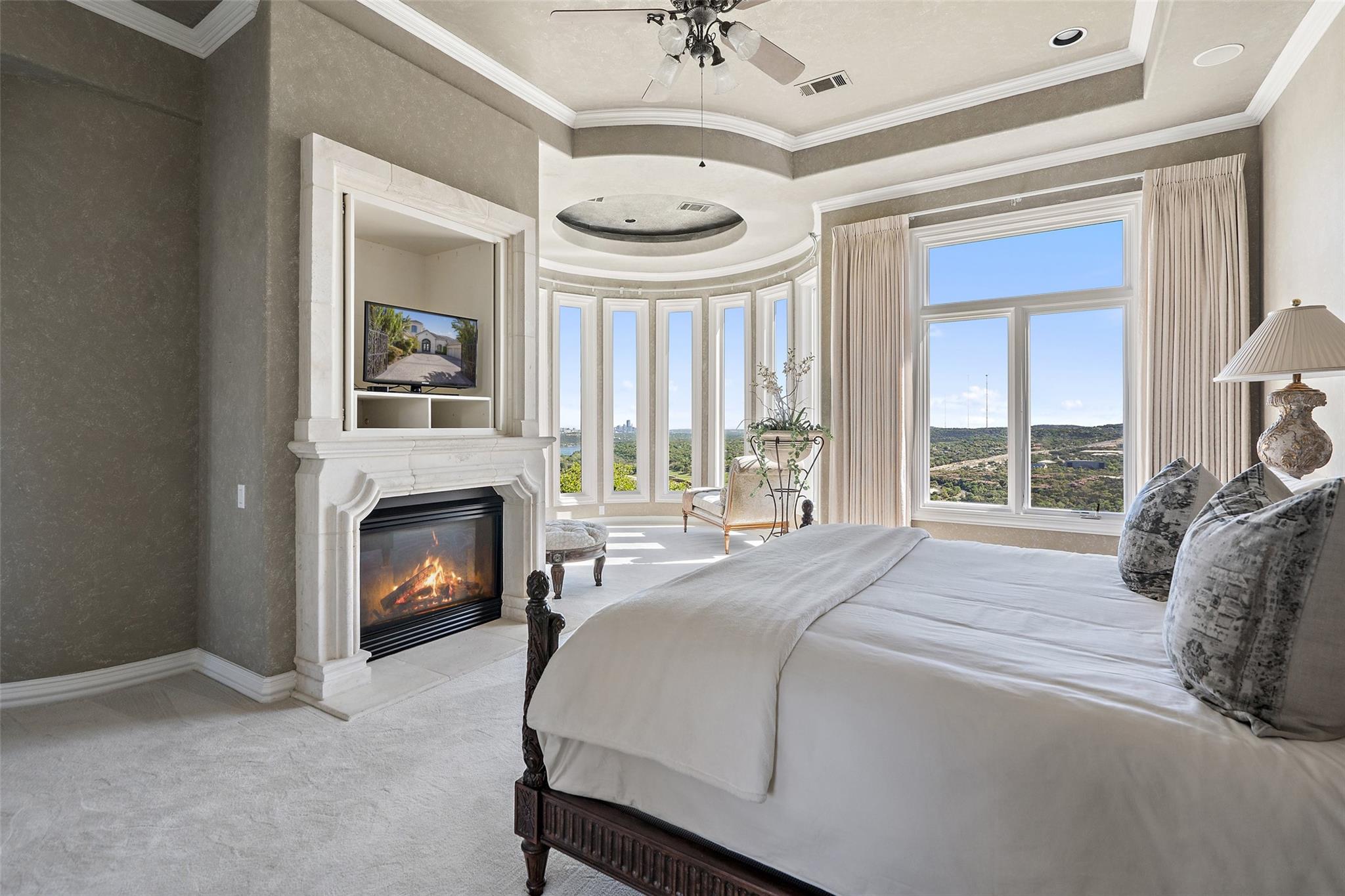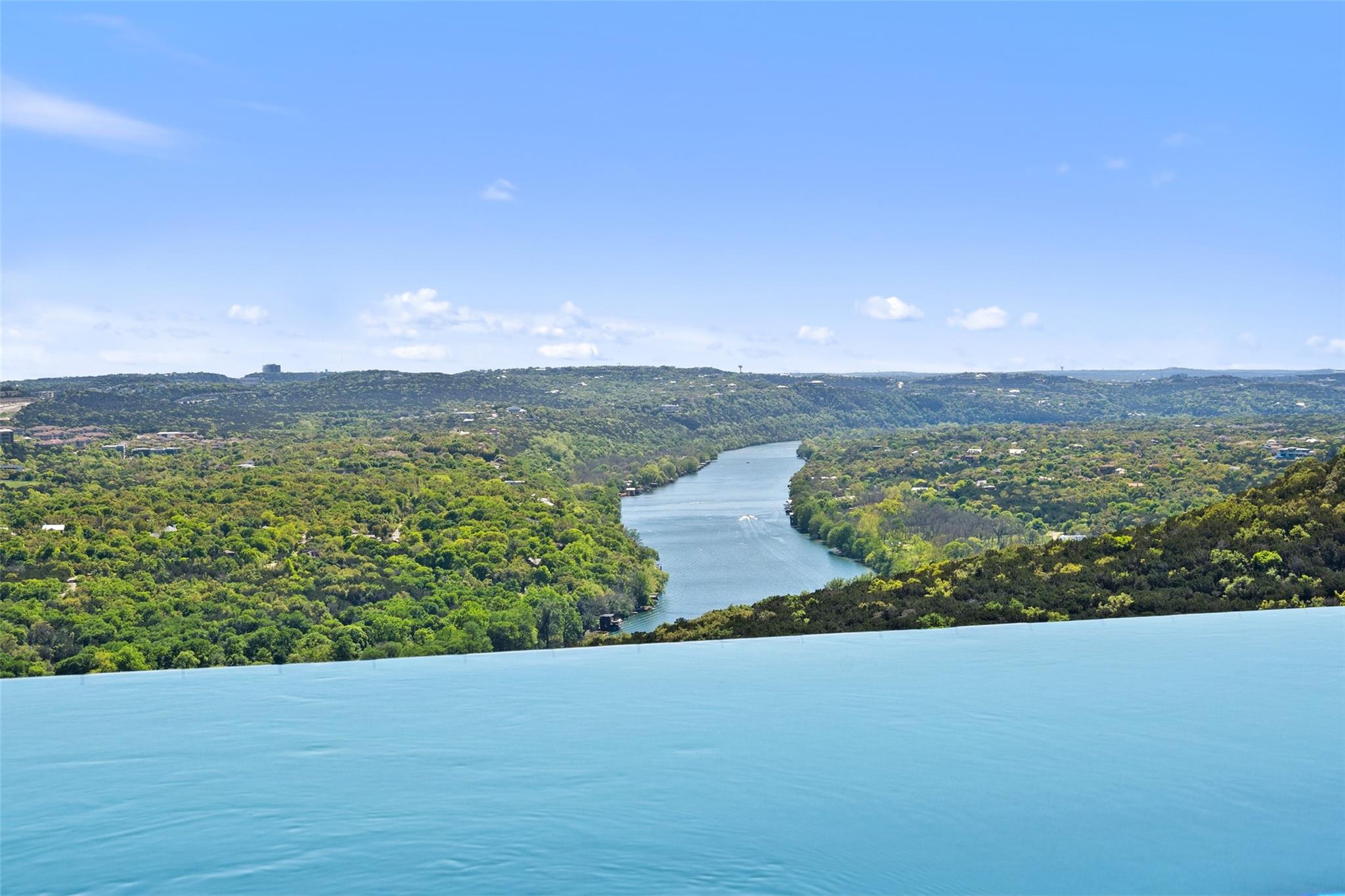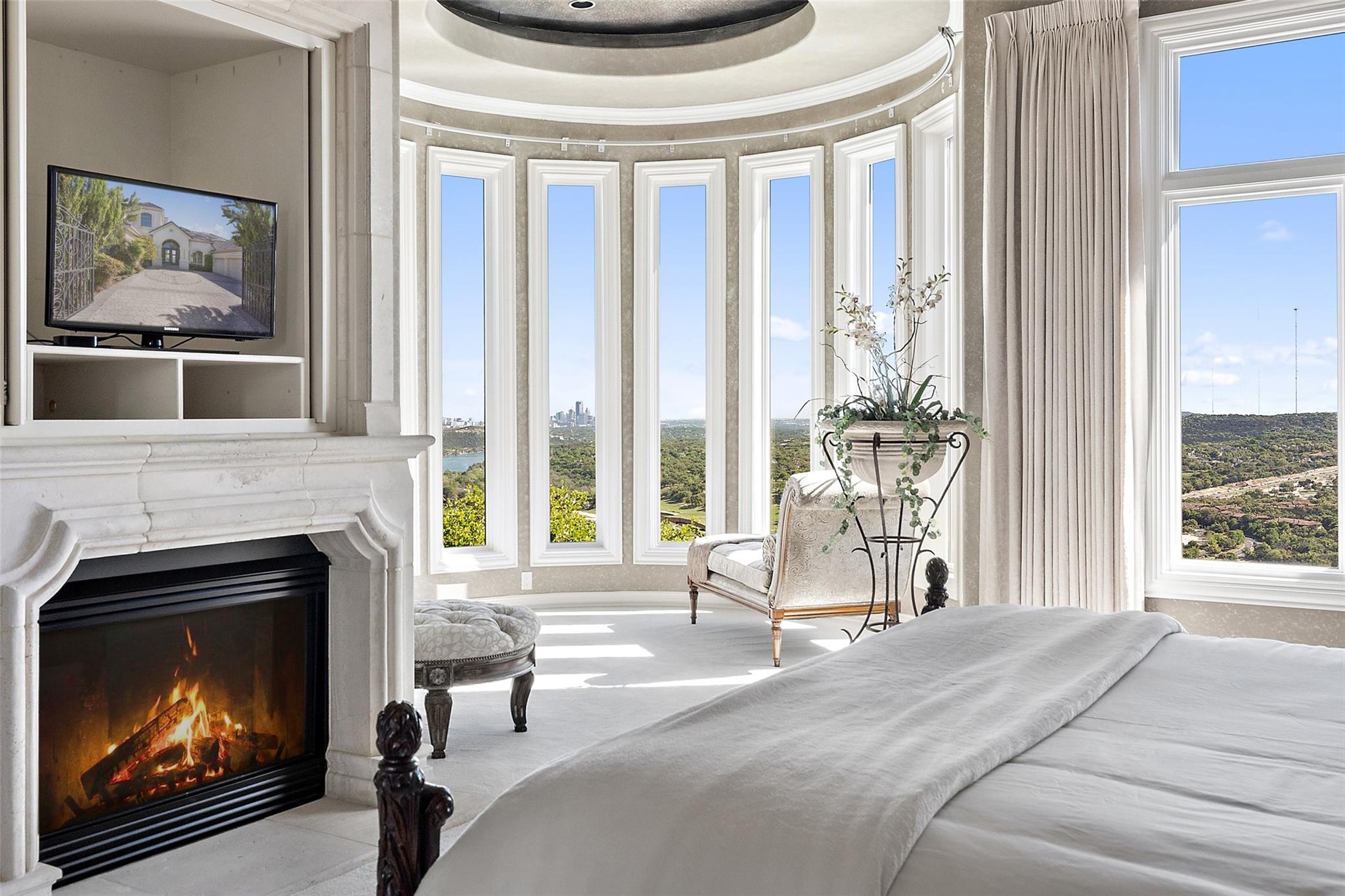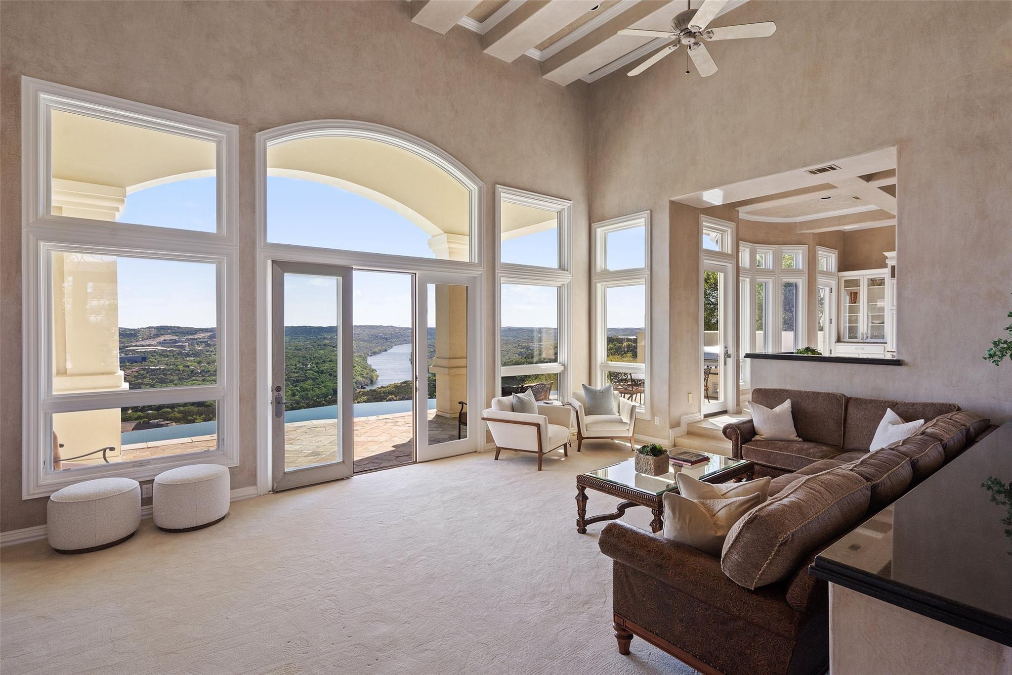Positioned at the top of Shepherd Mountain with astonishing unobstructed views of Lake Austin, downtown Austin and the surrounding landscape, this Mediterranean-style home is a one-of-a-kind setting for a luxurious, romantic lifestyle. Impeccably maintained by the original owner, the home features refined finishes and custom touches throughout. As you drive through the gates and step inside, you’ll discover three ensuite bedrooms and soaring 20-foot-plus ceilings on the first floor, providing ample space for gracious living. Abundant windows offer natural light and showstopping views, with a main living area that opens up to the patio for seamless indoor-outdoor entertaining. From the patio and infinity pool, take in 180-degree panoramic vistas of Lake Austin, the Pennybacker Bridge and the lush Austin Country Club golf course, with the city just beyond. The main level also features a gourmet kitchen with ample storage, coffee bar and large walk-in pantry, a dining room with sunlit ambience, and a traditional study with rich wood trim and large windows to look out over the scenery. Ascend the elegant spiral staircase to the second level, where the primary suite offers 900-plus square feet of luxury. The primary suite has been designed to prioritize the far-reaching views, and includes a fireplace and sitting area, two large walk-in closets, a coffee bar with refrigerator, and a primary bathroom clad in hand-cut Italian tile. This exceptional residence offers an enticing alternative to the forthcoming Four Seasons on Lake Austin, presenting unparalleled views without the wait. With easy access to Loop 360, adventure through Austin is just moments away. Don’t miss this opportunity to embrace a truly extraordinary lifestyle in one of Austin’s most iconic locations.