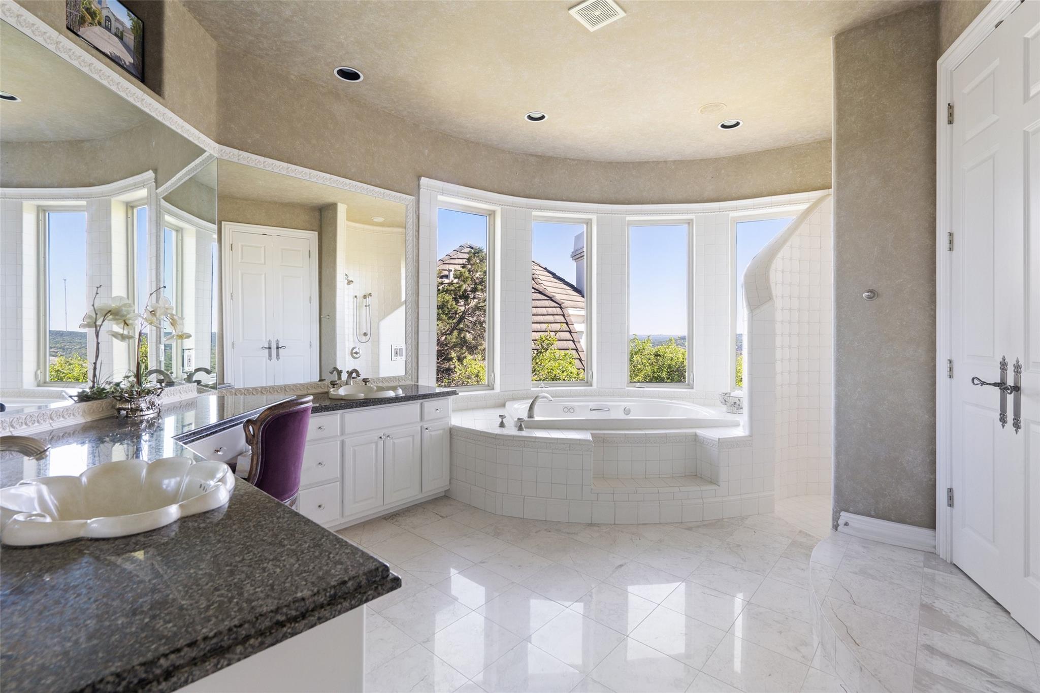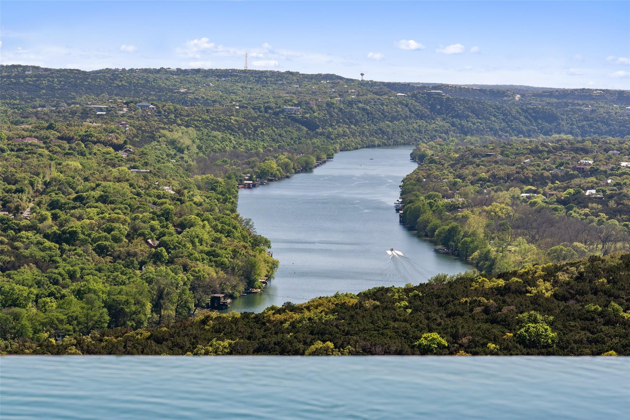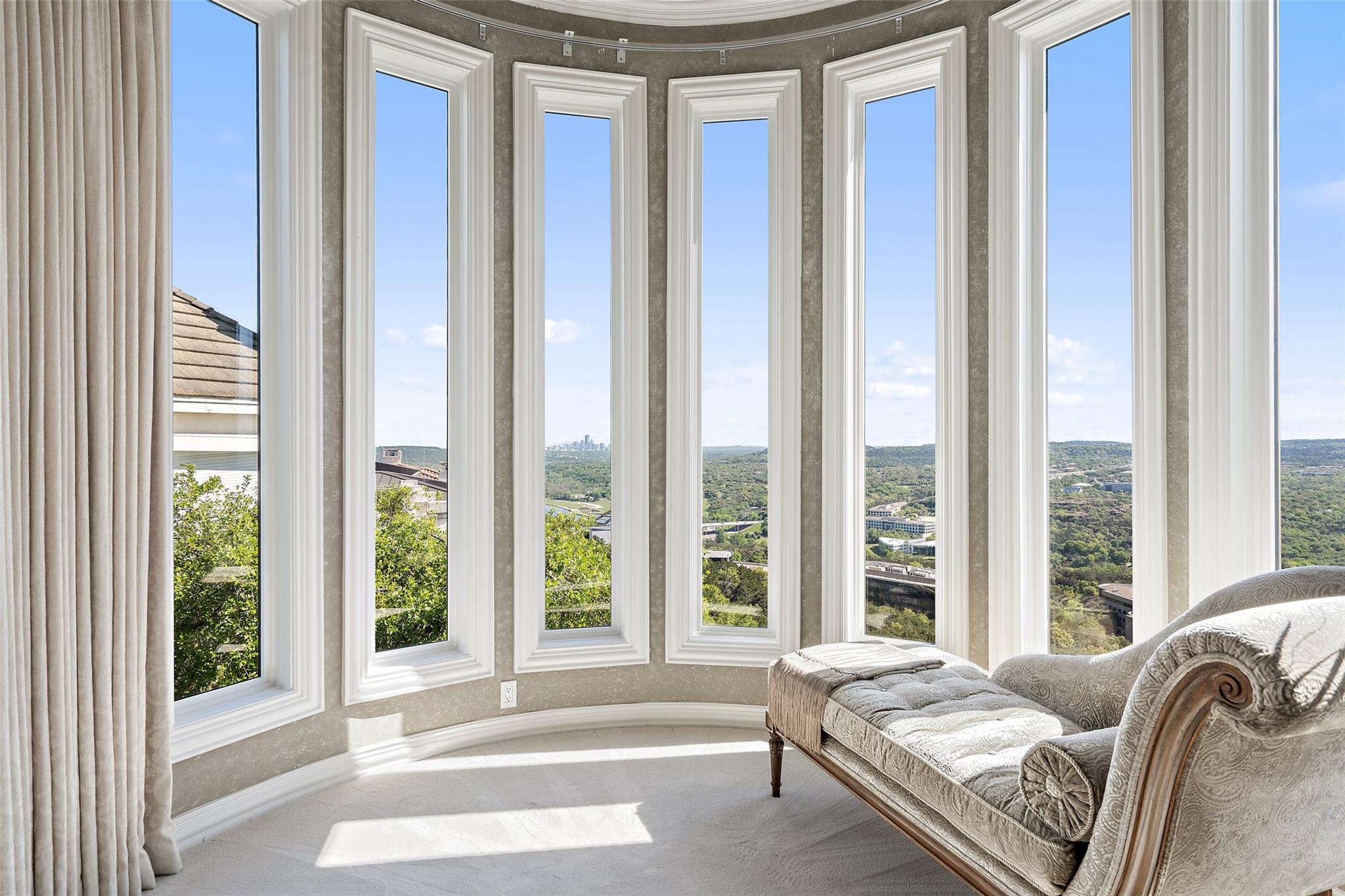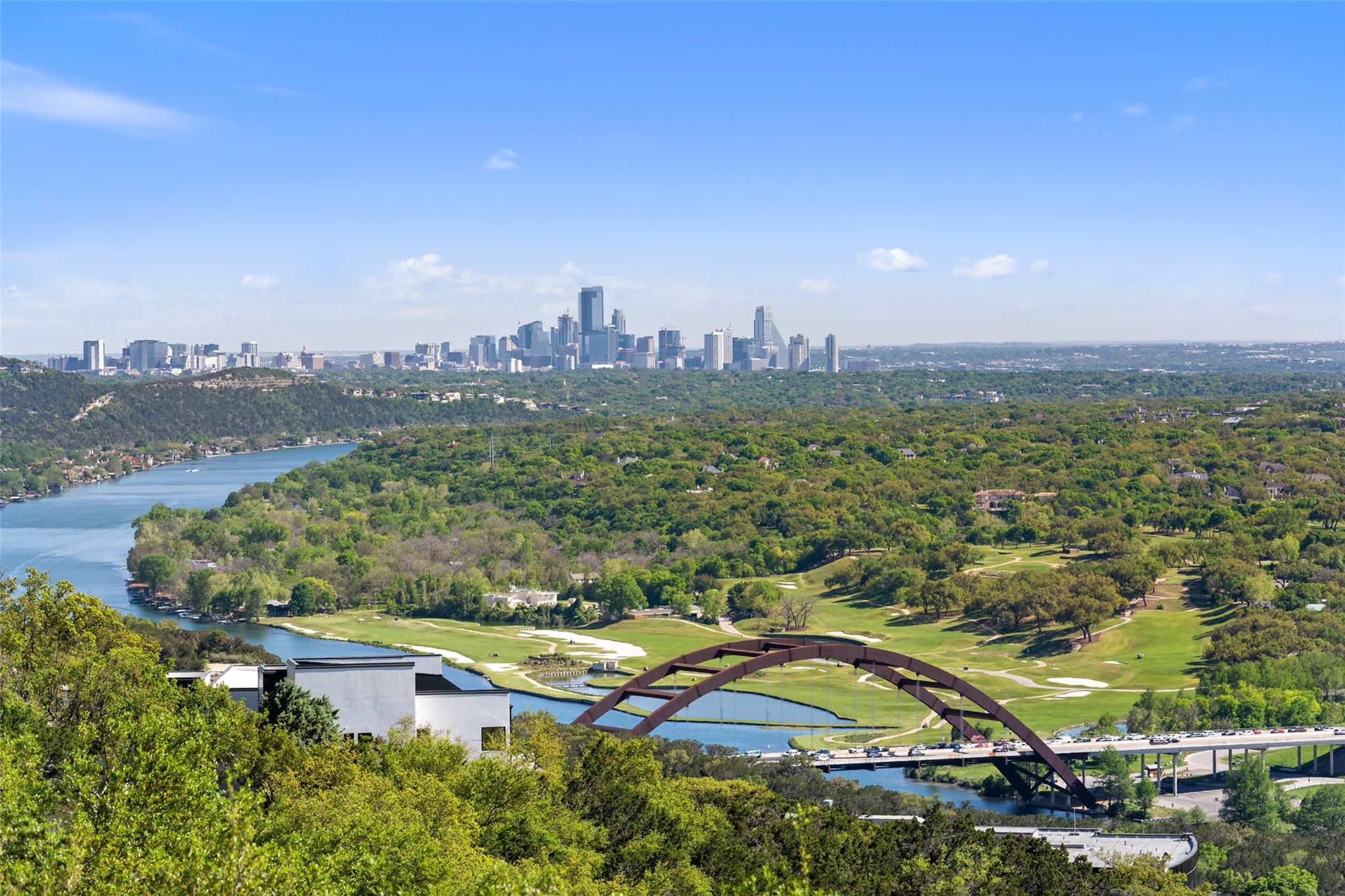 Positioned at the top of Shepherd Mountain with astonishing unobstructed views of Lake Austin, downtown Austin and the surrounding landscape, this Mediterranean-style home is a one-of-a-kind setting for a luxurious, romantic lifestyle. Impeccably maintained by the original owner, the home features refined finishes and custom touches throughout. As you drive through the gates and step inside, you’ll discover three ensuite bedrooms and soaring 20-foot-plus ceilings on the first floor, providing ample space for gracious living. Abundant windows offer natural light and showstopping views, with a main living area that opens up to the patio for seamless indoor-outdoor entertaining. From the patio and infinity pool, take in 180-degree panoramic vistas of Lake Austin, the Pennybacker Bridge and the lush Austin Country Club golf course, with the city just beyond. The main level also features a gourmet kitchen with ample storage, coffee bar and large walk-in pantry, a dining room with sunlit ambience, and a traditional study with rich wood trim and large windows to look out over the scenery. Ascend the elegant spiral staircase to the second level, where the primary suite offers 900-plus square feet of luxury. The primary suite has been designed to prioritize the far-reaching views, and includes a fireplace and sitting area, two large walk-in closets, a coffee bar with refrigerator, and a primary bathroom clad in hand-cut Italian tile. This exceptional residence offers an enticing alternative to the forthcoming Four Seasons on Lake Austin, presenting unparalleled views without the wait. With easy access to Loop 360, adventure through Austin is just moments away. Don’t miss this opportunity to embrace a truly extraordinary lifestyle in one of Austin’s most iconic locations.