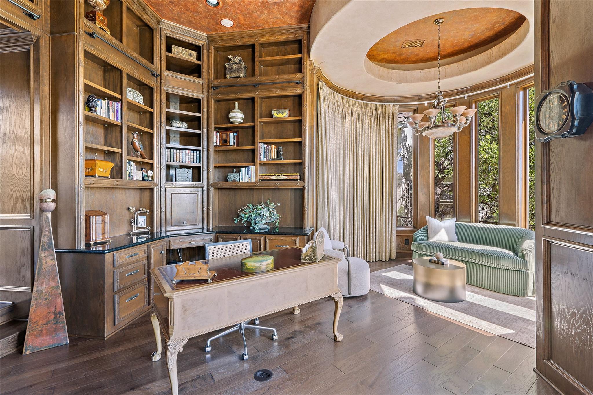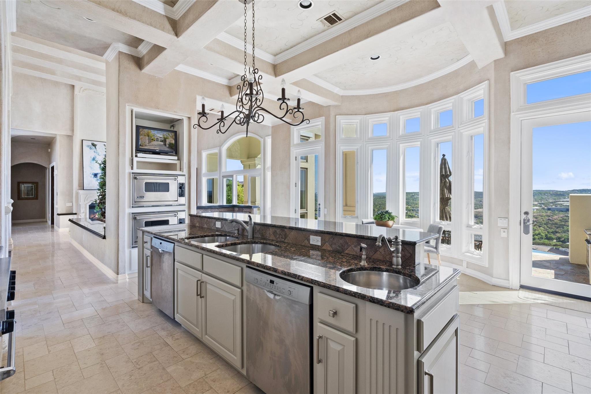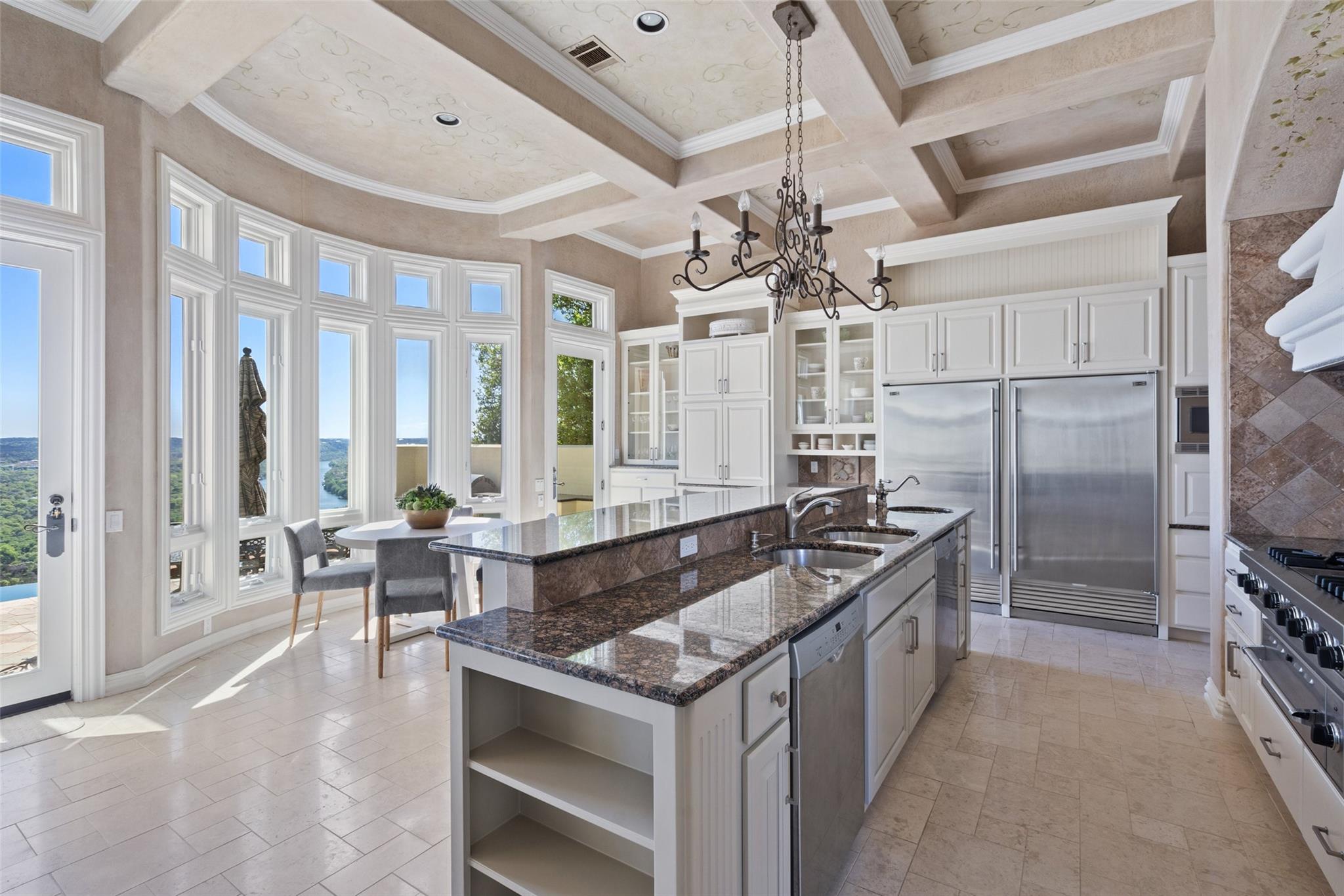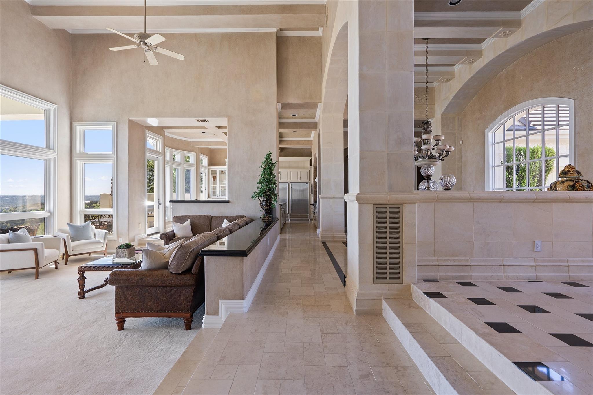 Positioned at the top of Shepherd Mountain with astonishing unobstructed views of Lake Austin, downtown Austin and the surrounding landscape, this Mediterranean-style home is a one-of-a-kind setting for a luxurious, romantic lifestyle. Impeccably maintained by the original owner, the home features refined finishes and custom touches throughout. As you drive through the gates and step inside, you’ll discover three ensuite bedrooms and soaring 20-foot-plus ceilings on the first floor, providing ample space for gracious living. Abundant windows offer natural light and showstopping views, with a main living area that opens up to the patio for seamless indoor-outdoor entertaining. From the patio and infinity pool, take in 180-degree panoramic vistas of Lake Austin, the Pennybacker Bridge and the lush Austin Country Club golf course, with the city just beyond. The main level also features a gourmet kitchen with ample storage, coffee bar and large walk-in pantry, a dining room with sunlit ambience, and a traditional study with rich wood trim and large windows to look out over the scenery. Ascend the elegant spiral staircase to the second level, where the primary suite offers 900-plus square feet of luxury. The primary suite has been designed to prioritize the far-reaching views, and includes a fireplace and sitting area, two large walk-in closets, a coffee bar with refrigerator, and a primary bathroom clad in hand-cut Italian tile. This exceptional residence offers an enticing alternative to the forthcoming Four Seasons on Lake Austin, presenting unparalleled views without the wait. With easy access to Loop 360, adventure through Austin is just moments away. Don’t miss this opportunity to embrace a truly extraordinary lifestyle in one of Austin’s most iconic locations.