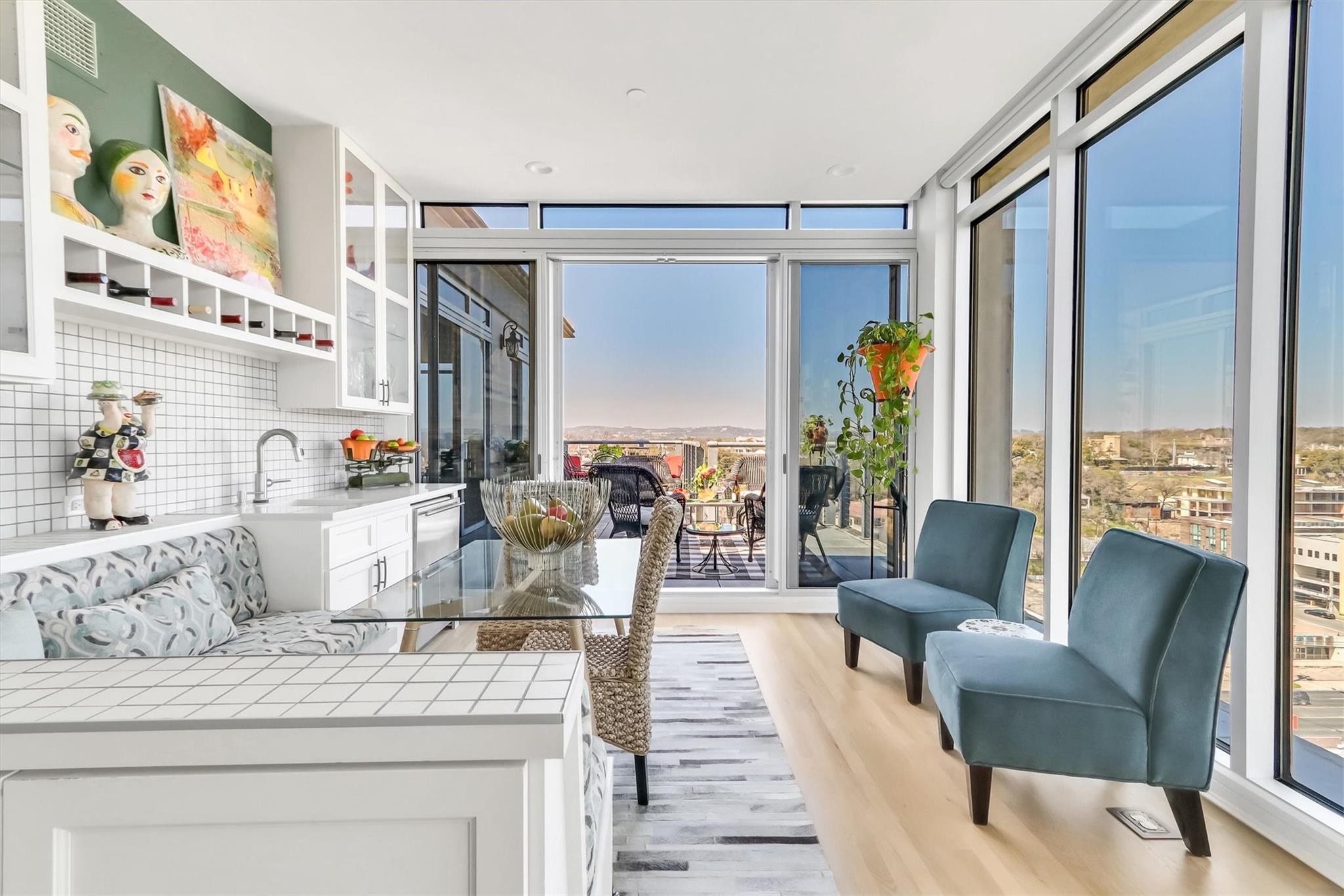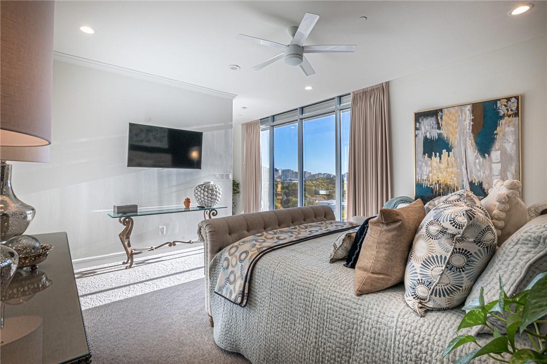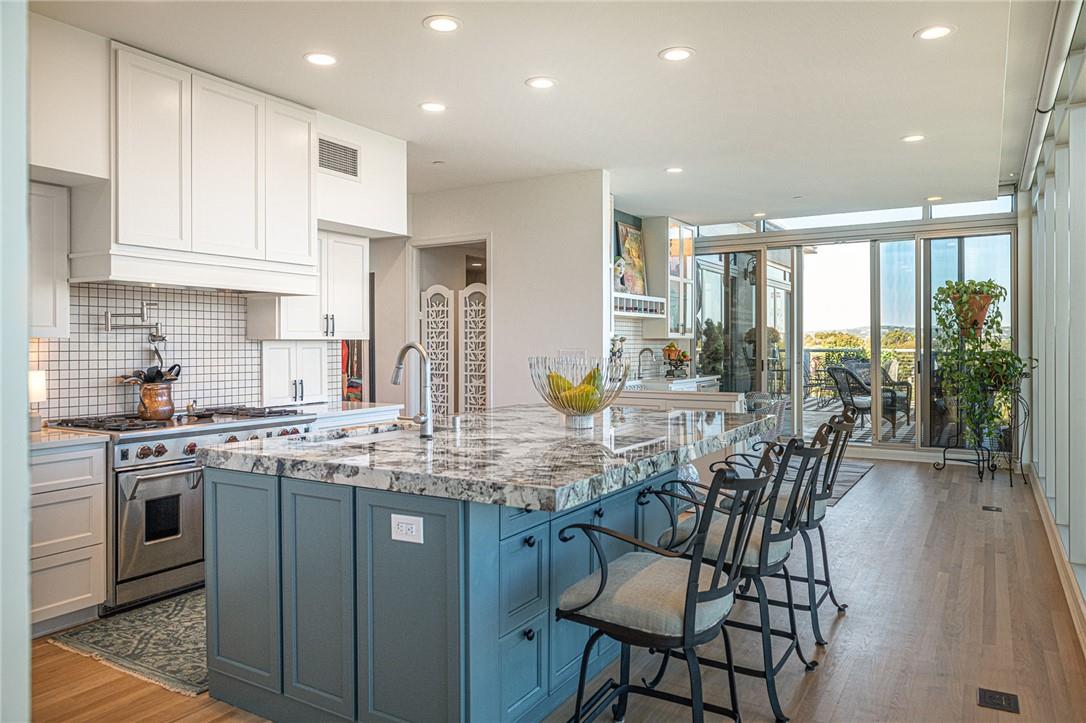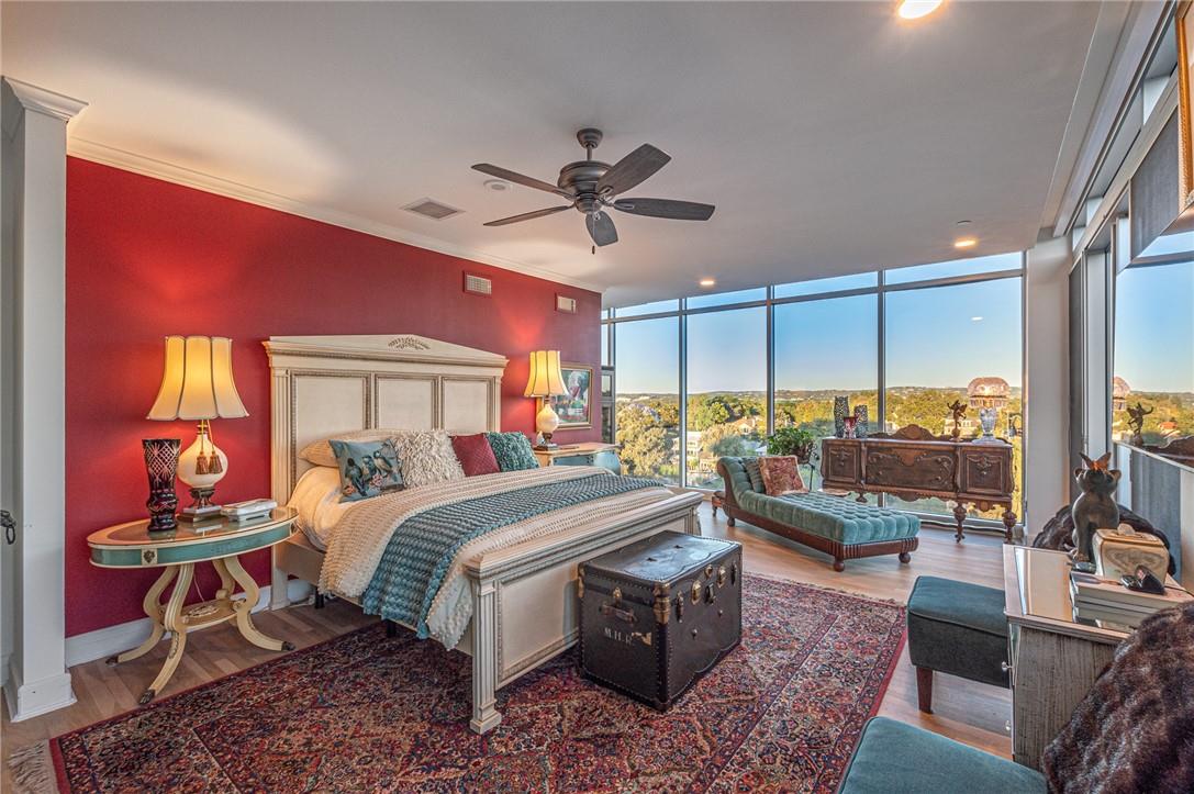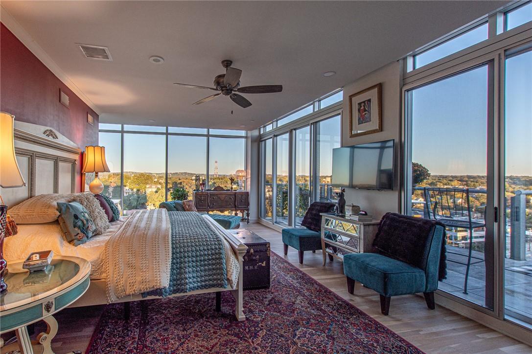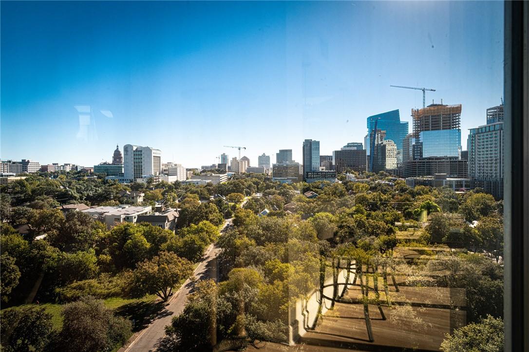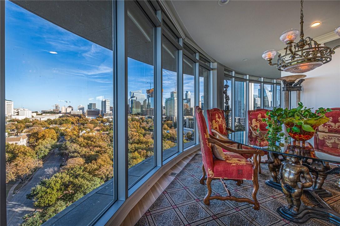 Stunning renovation capturing both glittering City views and peaceful hill country. Nothing like this one on the market with a fresh new look. High ceilings from Penthouse level plus gas fireplace and NO circular pillars to deal with in living spaces. Serenity abounds overlooking peaceful Duncan park, unique circular floor to ceiling windows offer 180 degree views, lovely white oak flooring and abundant storage. Only one other unit shares this floor offering privacy with permission only elevator access. Two street level parking spaces conveniently located just outside of elevator with electric charger and additional private storage area. Balcony plus huge second outdoor terrace (difficult to find) to connect with nature. Updated gourmet kitchen and breakfast area with two large pantry’s, automatic solar screens, customized floor plan may be converted to three bedrooms but offers two master suites with sitting areas & serene spacious baths. Walking distance to Whole Foods, dining, shopping, theatre district and all that the City offers yet away from the noise and chaos. Tranquil pool, exercise room, spa & conference room for private functions. Overlooking nature, a feeling of tranquility inspires you as the City dazzles with glittering lights and architecture, all within reach of this superb location.
