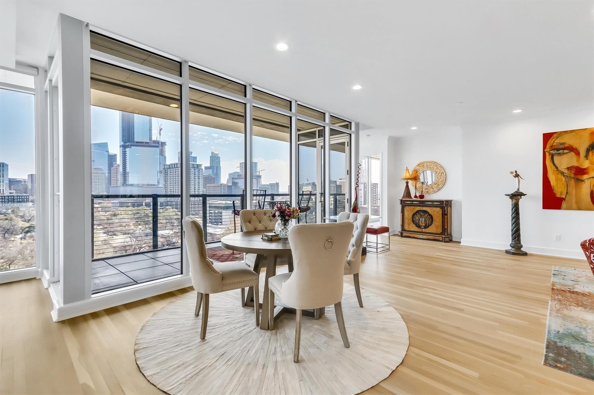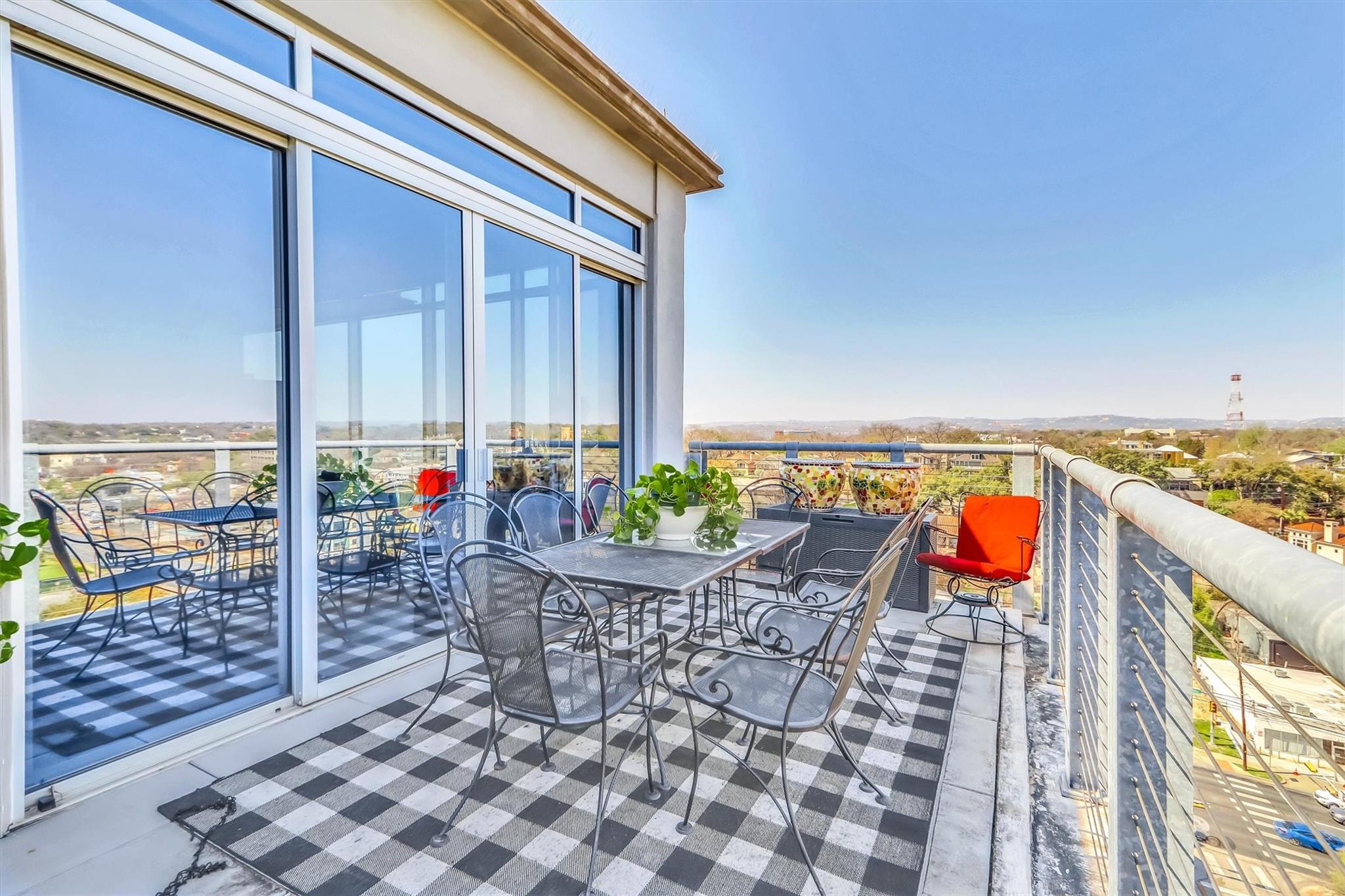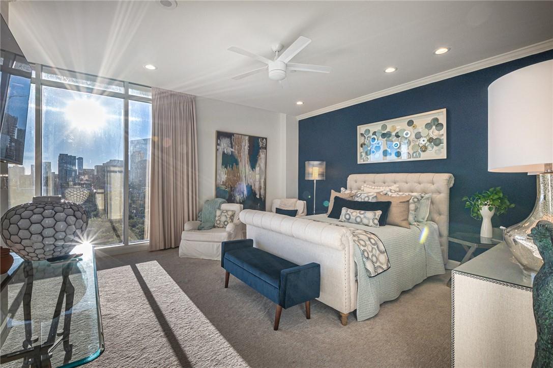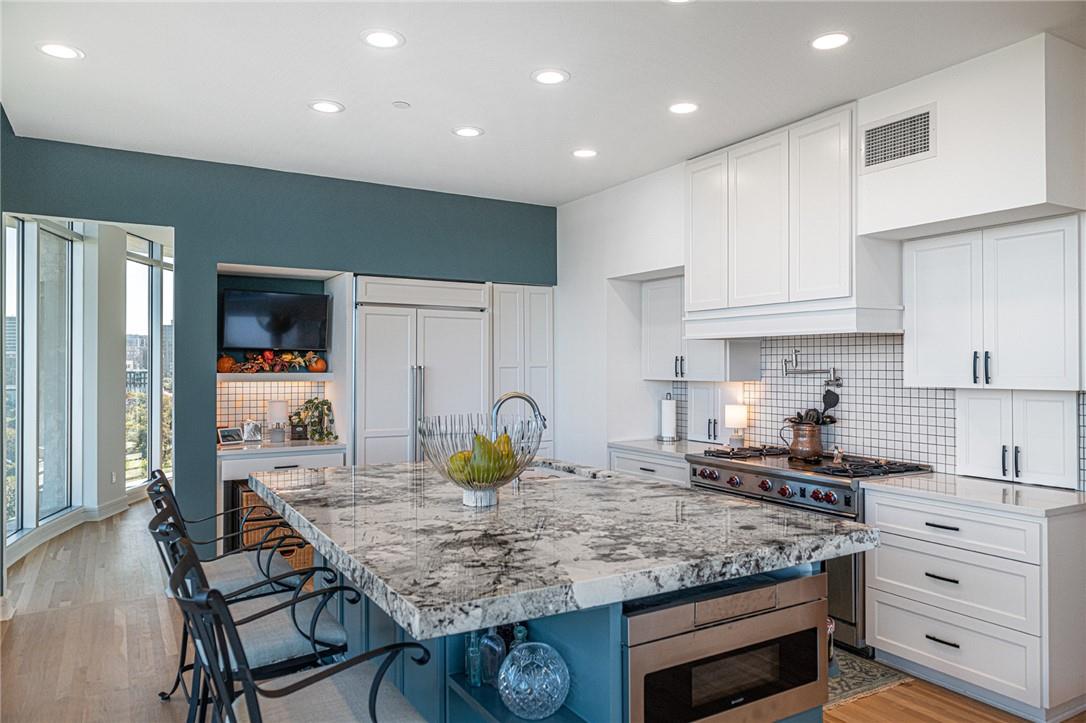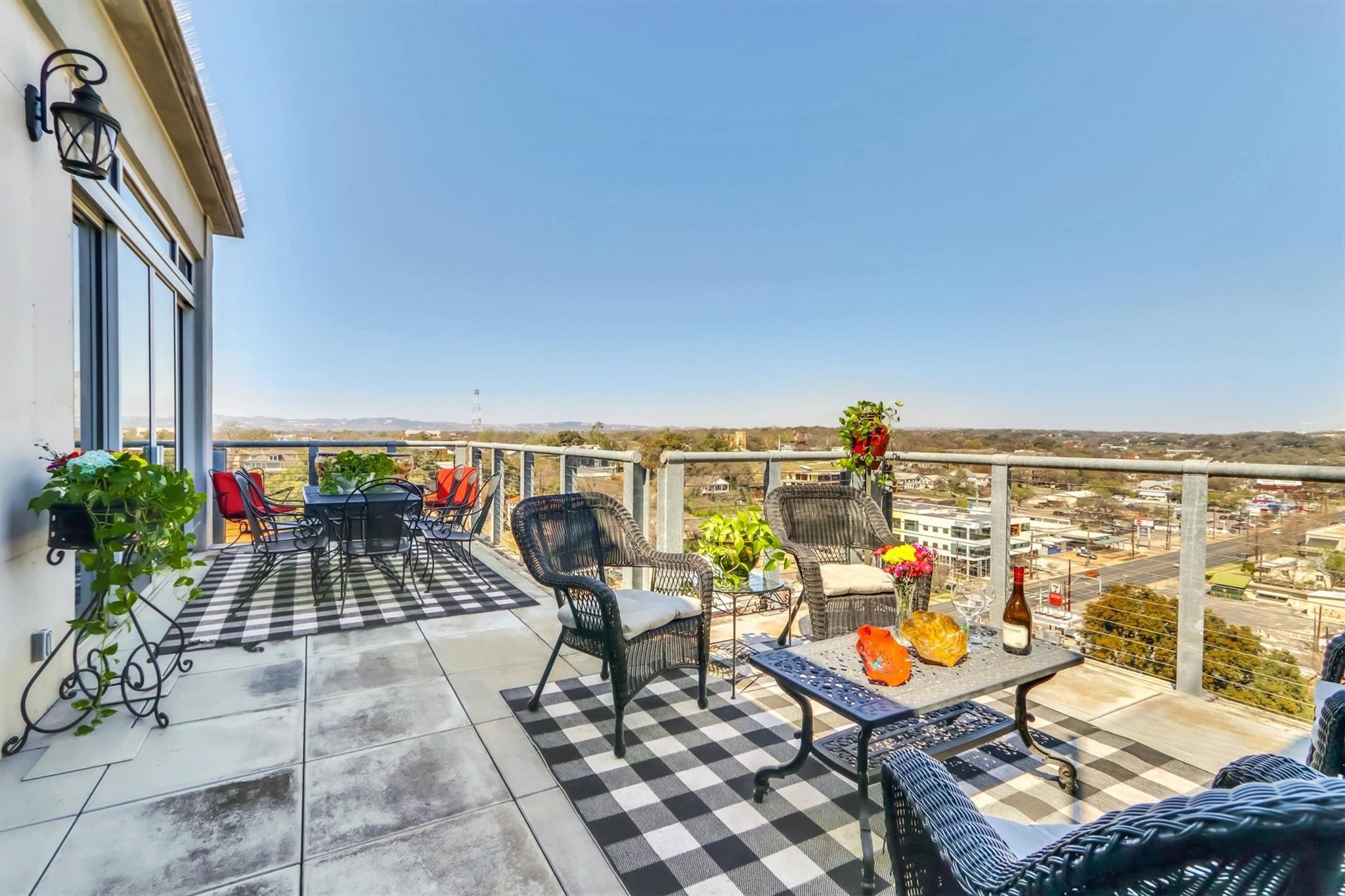 Stunning renovation capturing both glittering City views and peaceful hill country. Nothing like this one on the market with a fresh new look. High ceilings from Penthouse level plus gas fireplace and NO circular pillars to deal with in living spaces. Serenity abounds overlooking peaceful Duncan park, unique circular floor to ceiling windows offer 180 degree views, lovely white oak flooring and abundant storage. Only one other unit shares this floor offering privacy with permission only elevator access. Two street level parking spaces conveniently located just outside of elevator with electric charger and additional private storage area. Balcony plus huge second outdoor terrace (difficult to find) to connect with nature. Updated gourmet kitchen and breakfast area with two large pantry’s, automatic solar screens, customized floor plan may be converted to three bedrooms but offers two master suites with sitting areas & serene spacious baths. Walking distance to Whole Foods, dining, shopping, theatre district and all that the City offers yet away from the noise and chaos. Tranquil pool, exercise room, spa & conference room for private functions. Overlooking nature, a feeling of tranquility inspires you as the City dazzles with glittering lights and architecture, all within reach of this superb location.